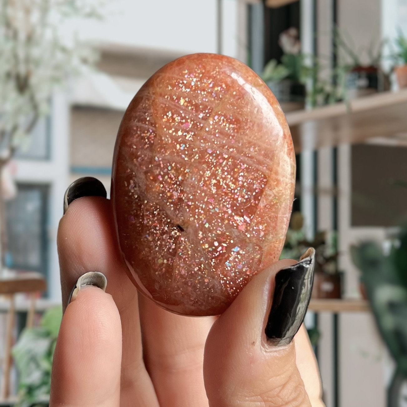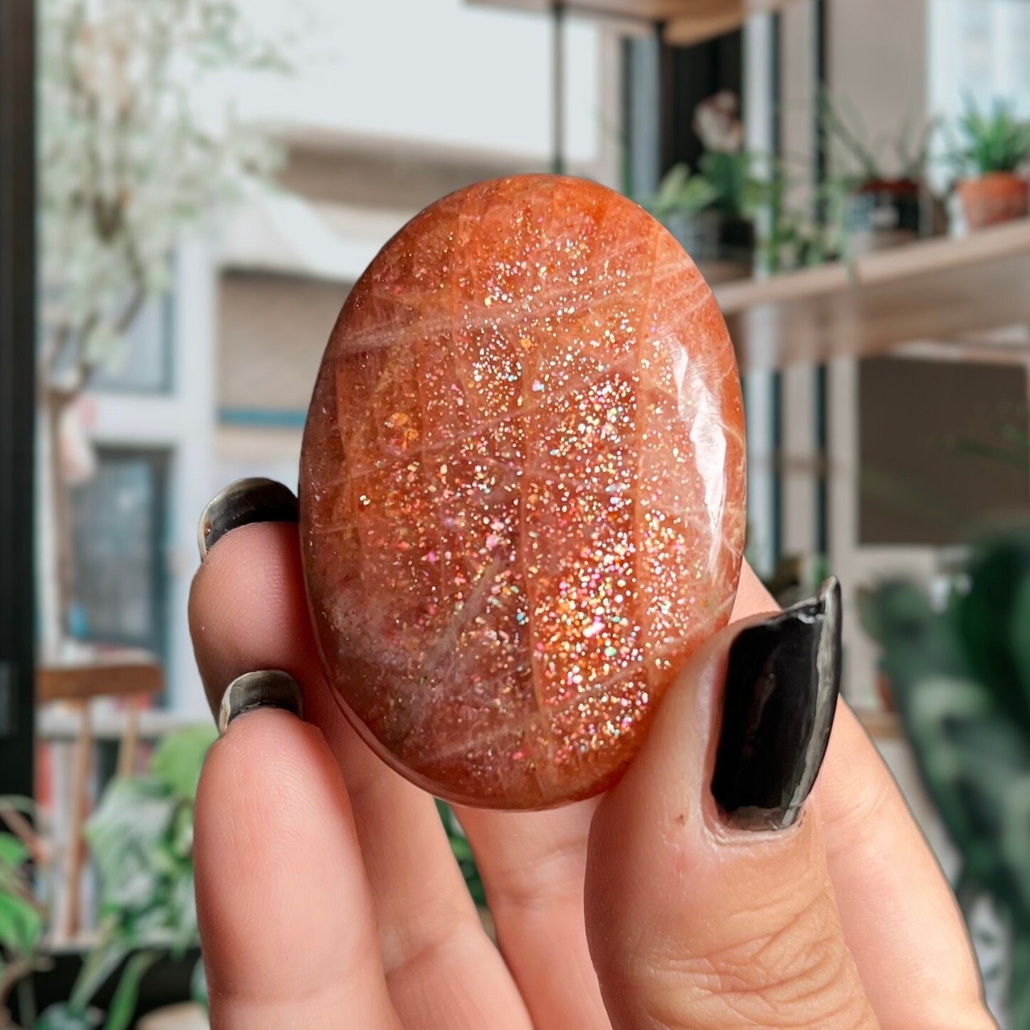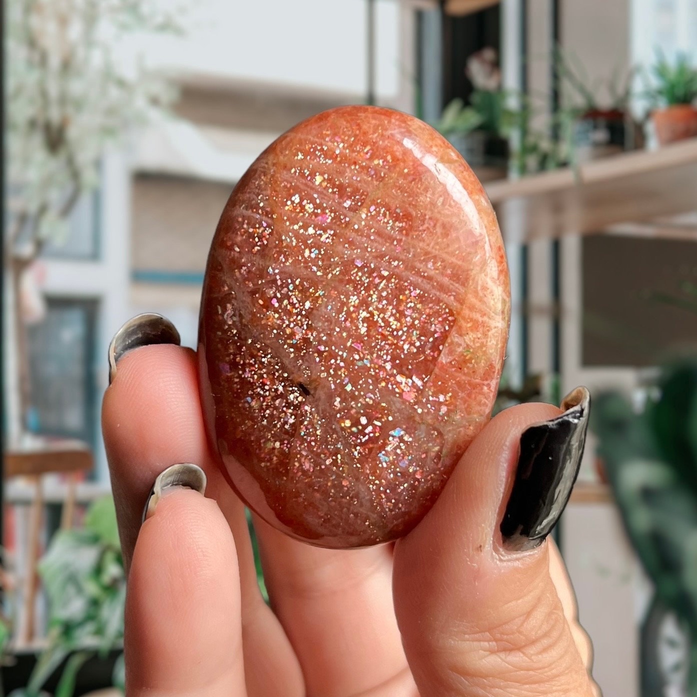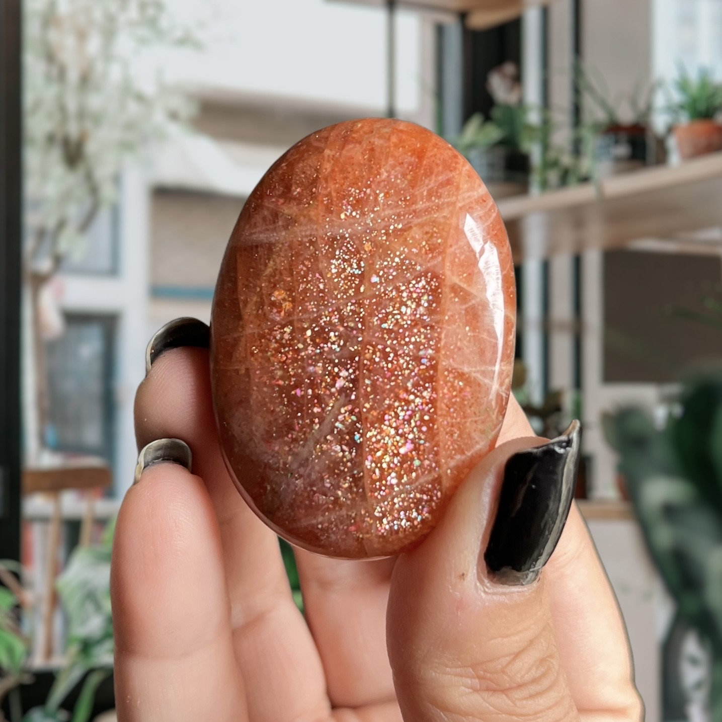 This exquisite, high grade Arusha sunstone gem palmstone is magic in tangible form. Moving in waves, brilliant rainbow confetti flash illuminates this rare, natural golden sunstone from Tanzania with minor moonstone flash and asterism.