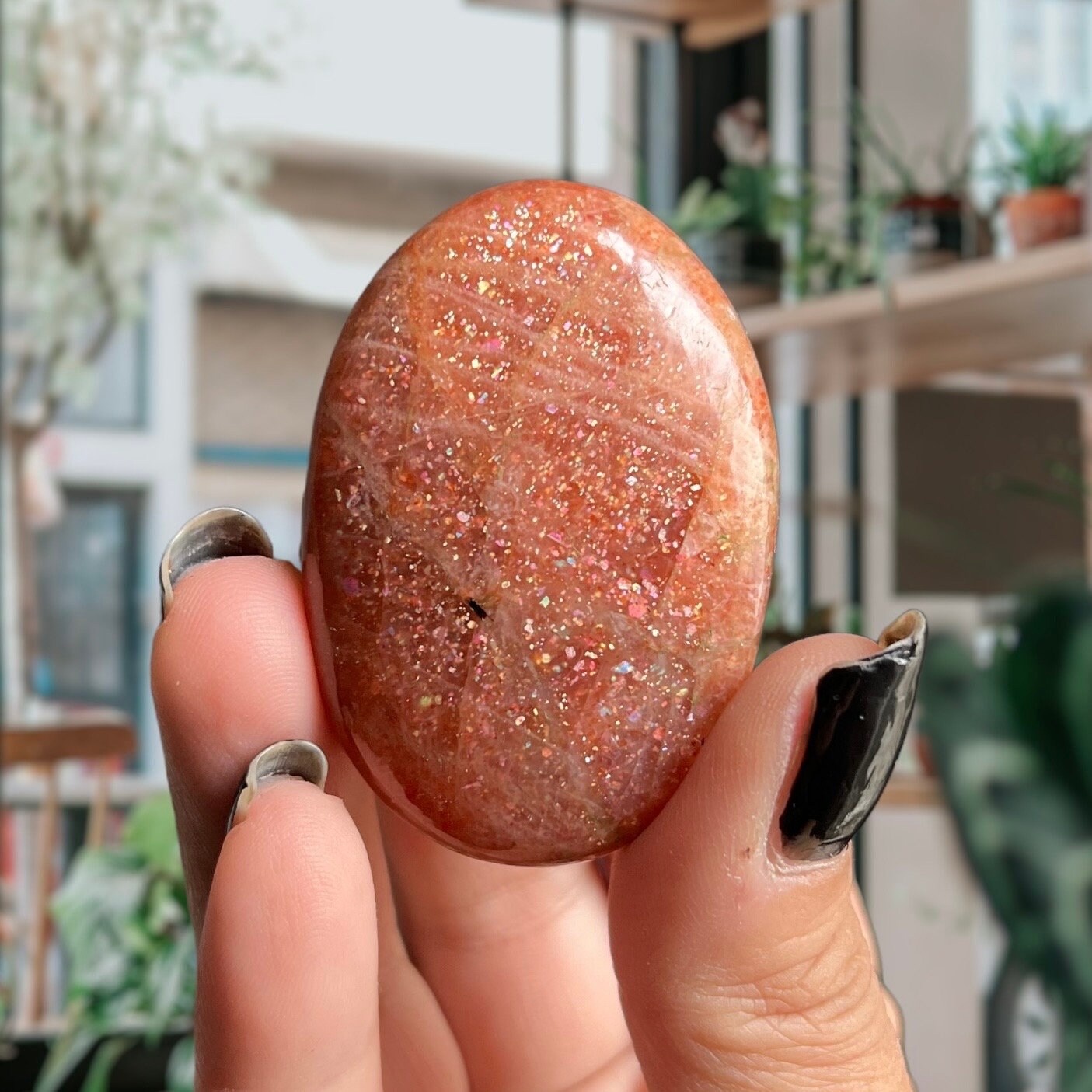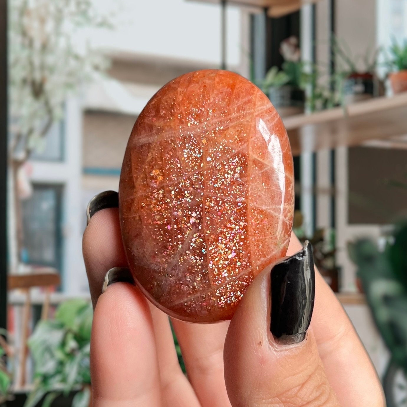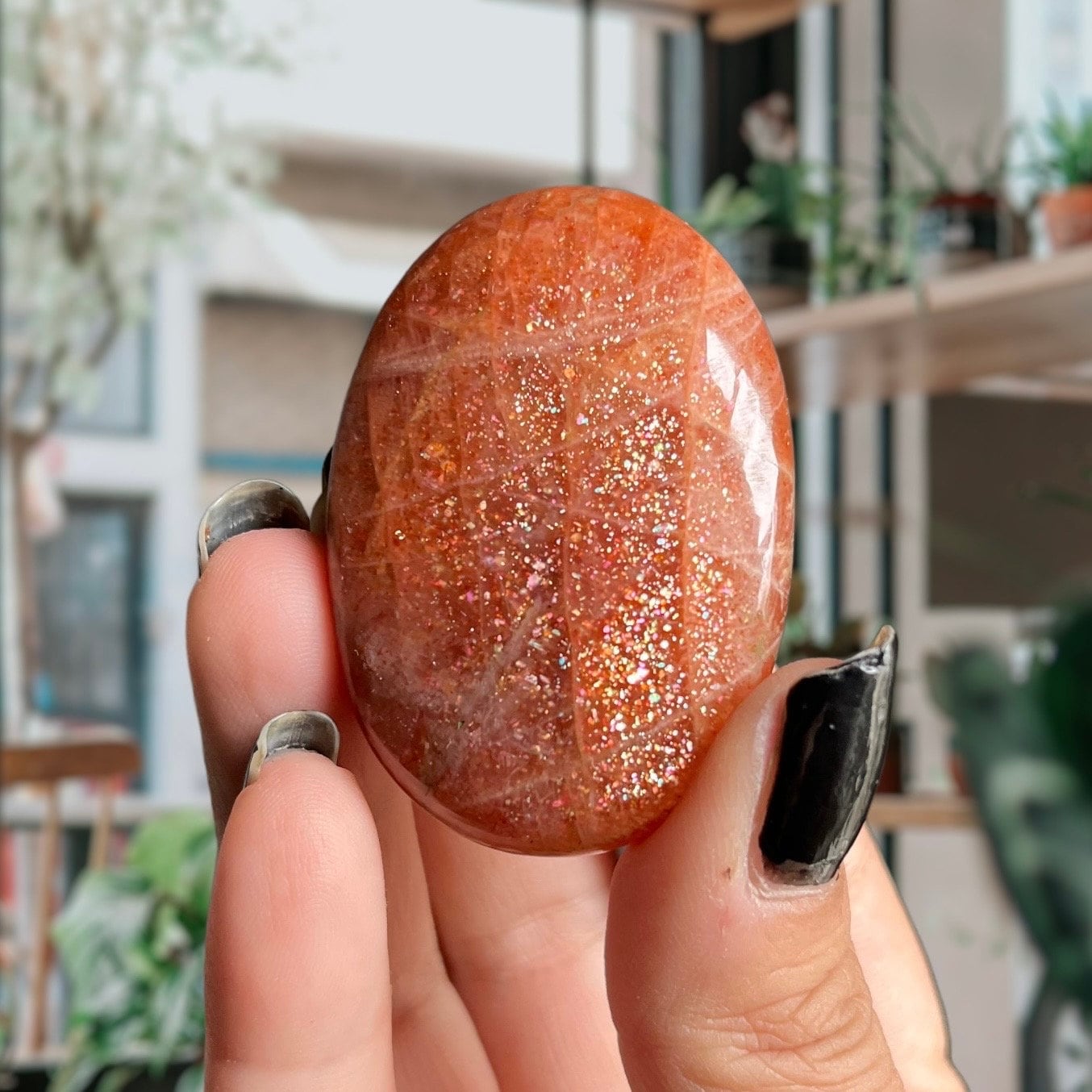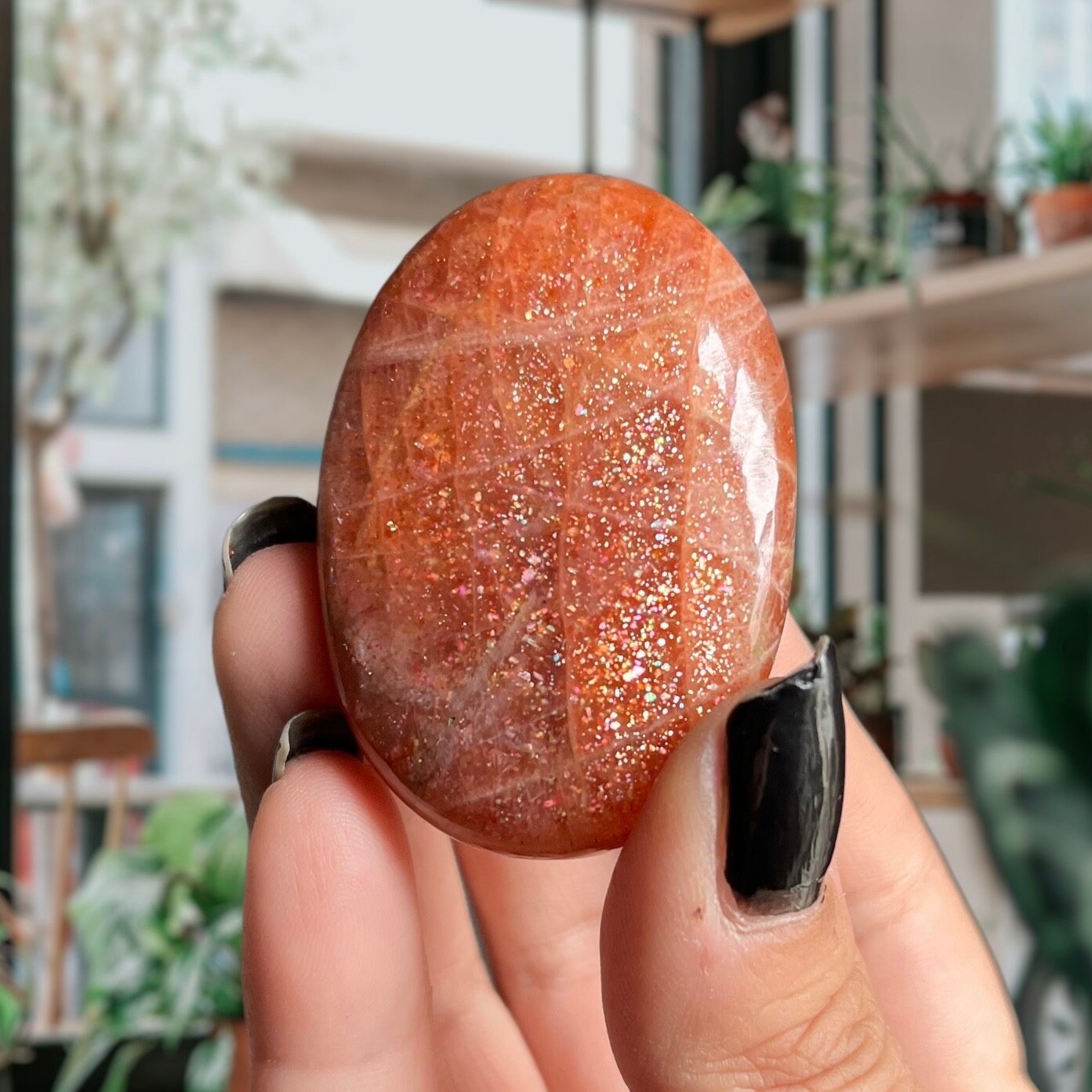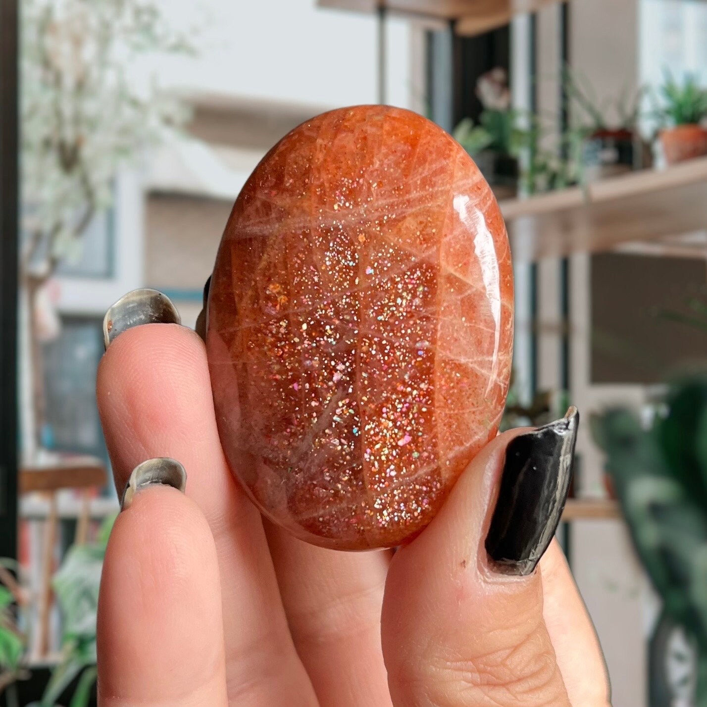 This exquisite, high grade Arusha sunstone gem palmstone is magic in tangible form. Moving in waves, brilliant rainbow confetti flash illuminates this rare, natural golden sunstone from Tanzania with minor moonstone flash and asterism.