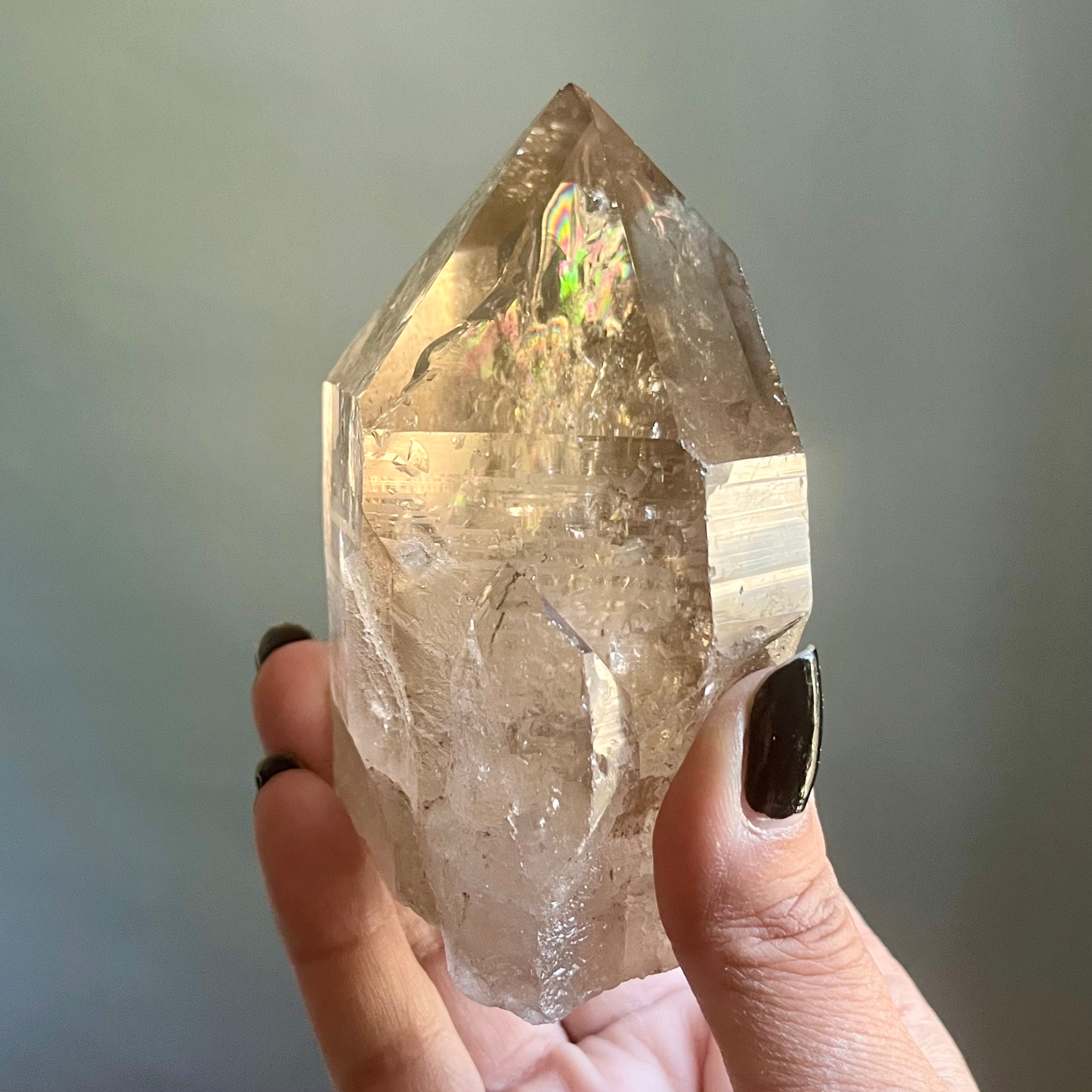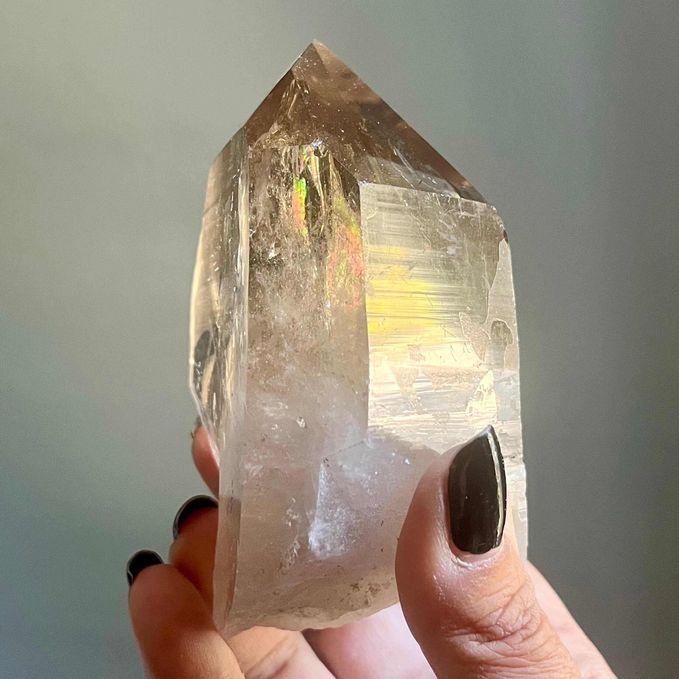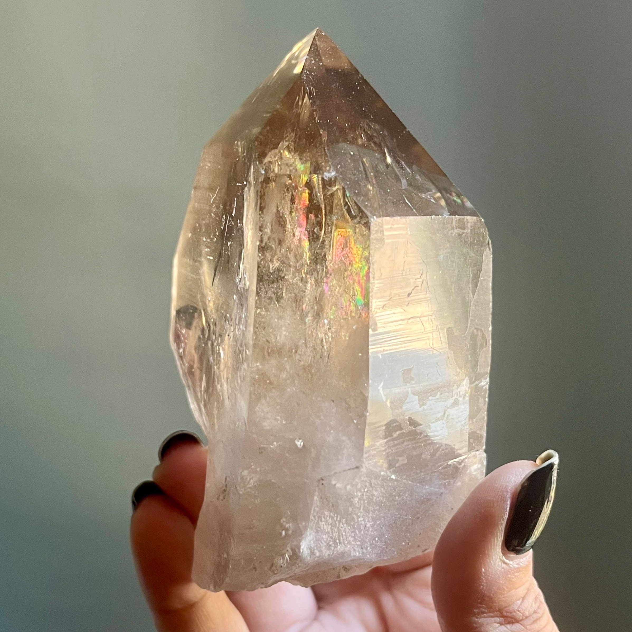 The slight polish on the termination highlights the silver hematite inclusions, the entire piece illuminated by exquisite rainbows which call in the full spectrum of prismatic light.