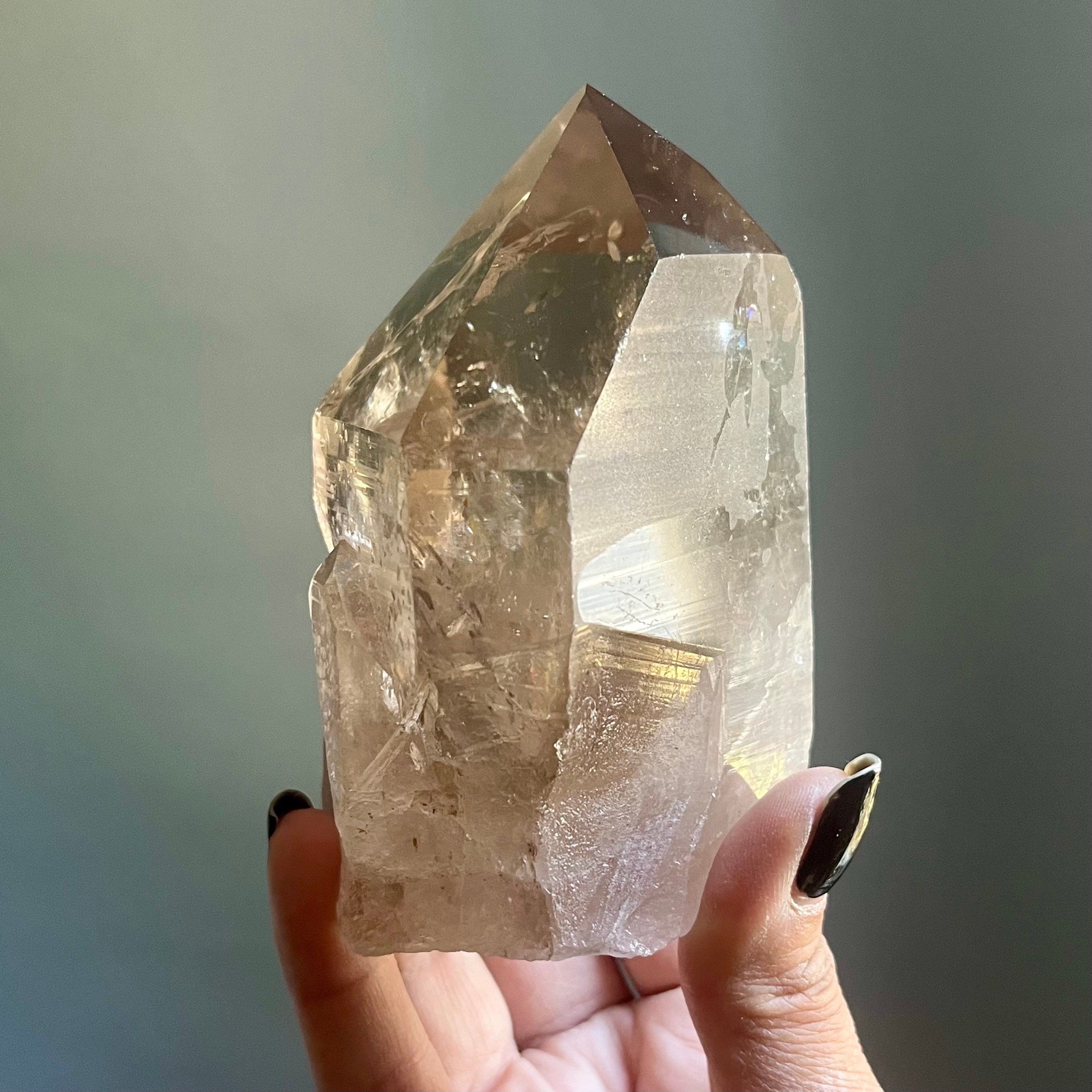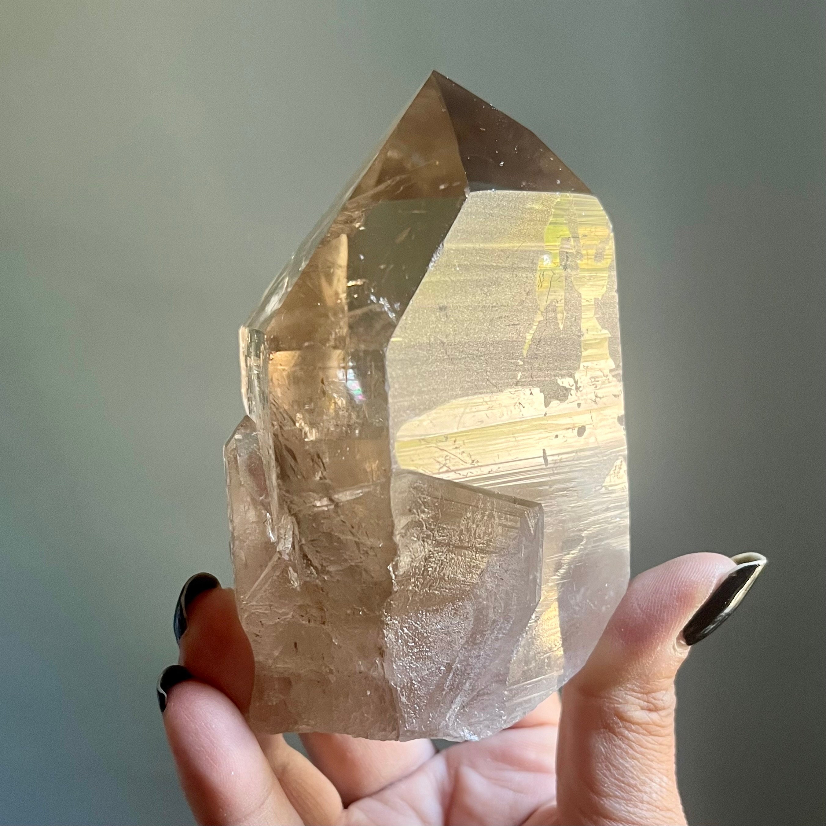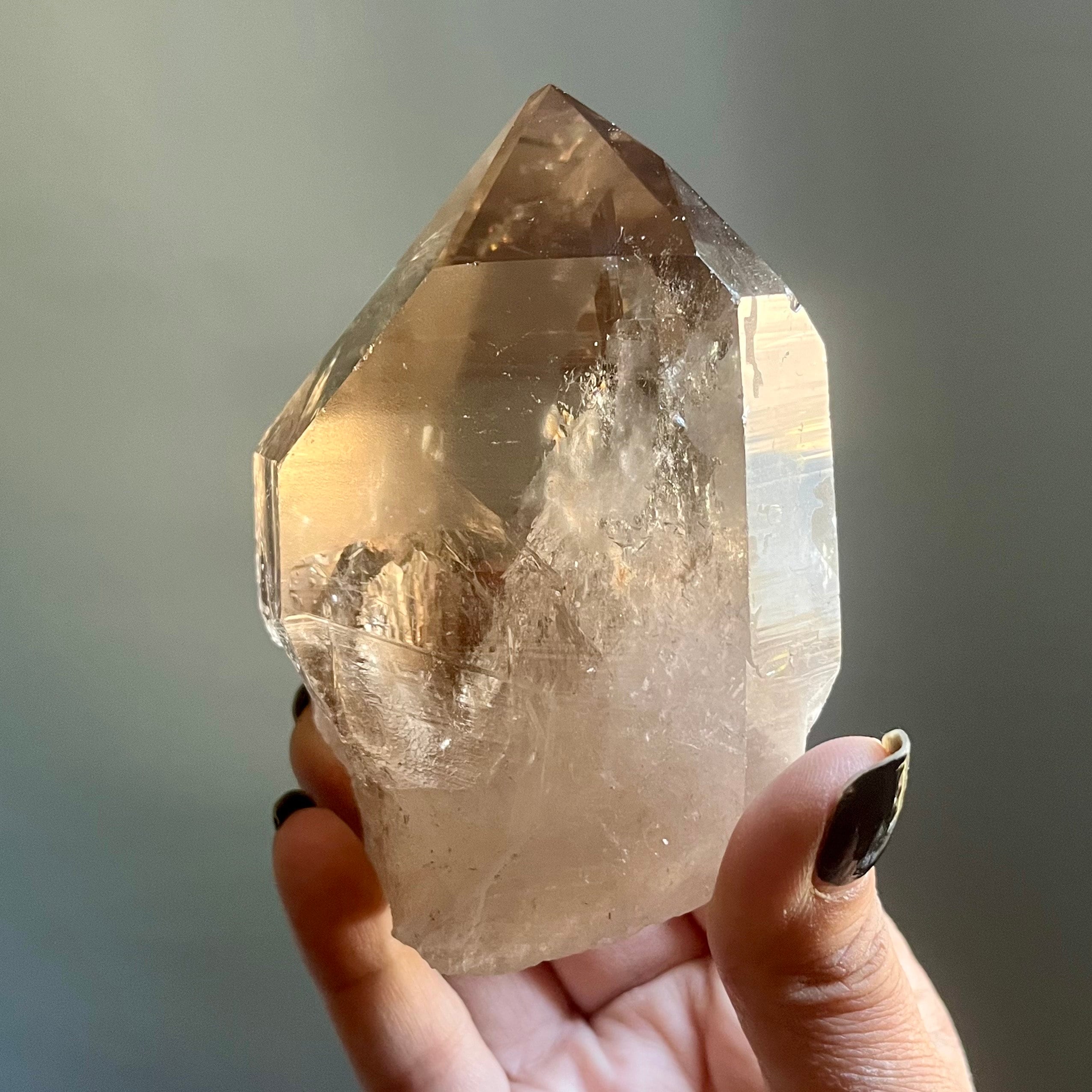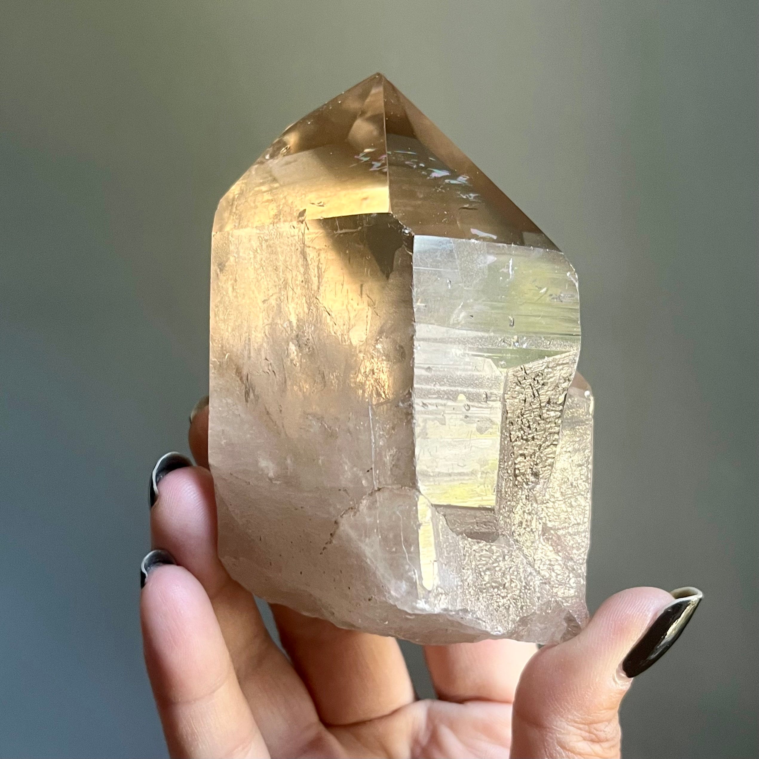 Weighing over a pound, this large natural citrine lemurian quartz crystal point manifests with brilliant citrine rainbows, starbrary quartz star markings and cathedral quartz formations.
