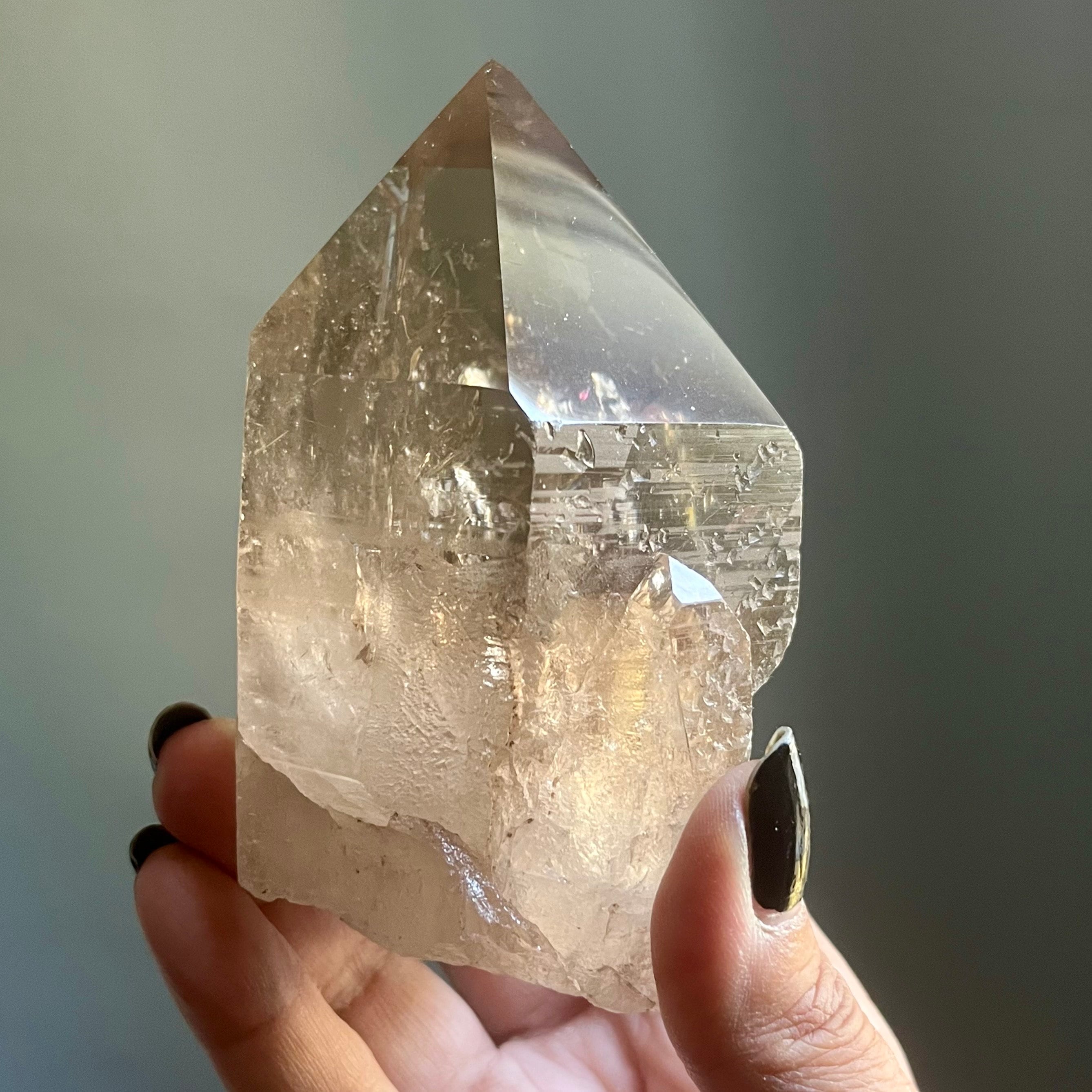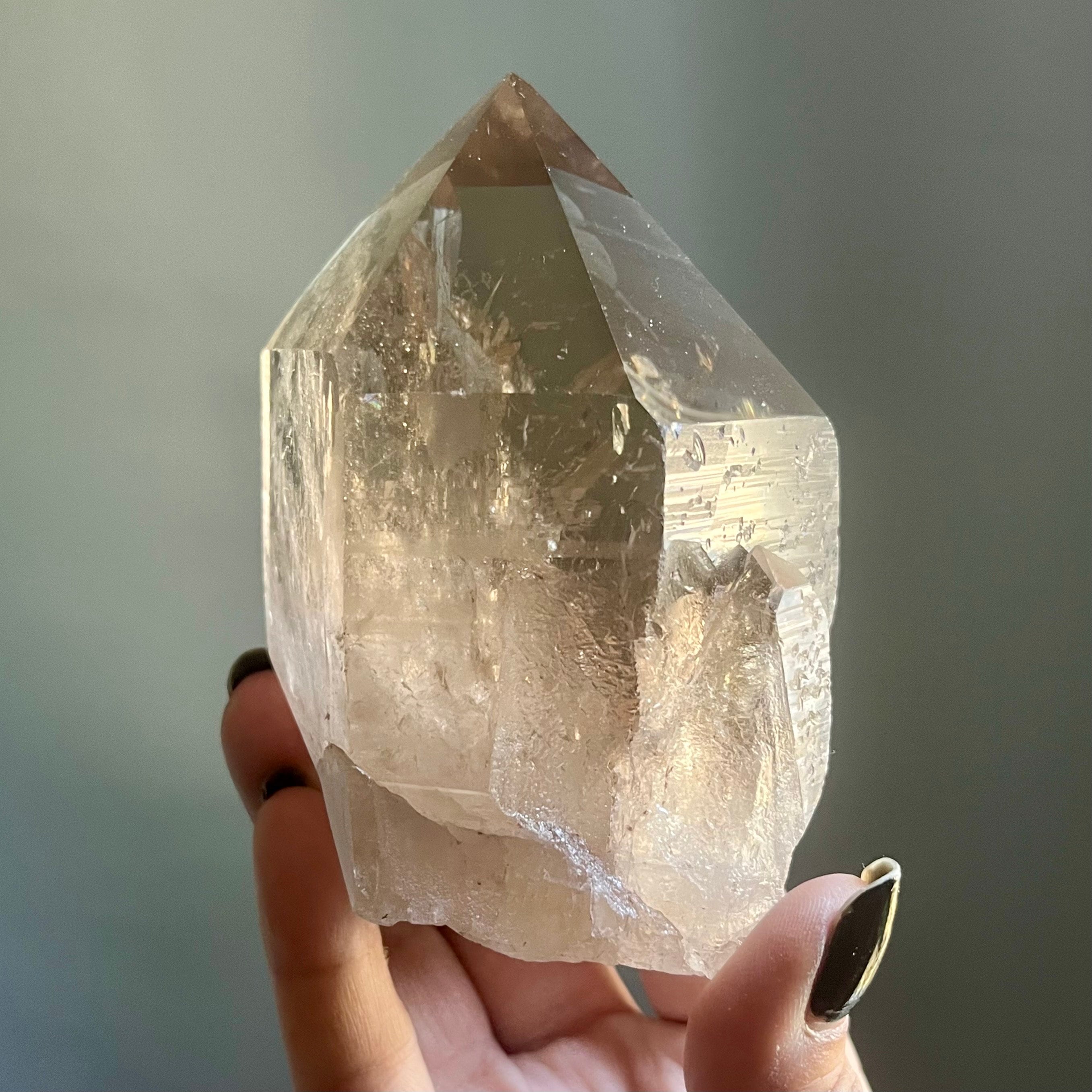 Both tangible and infinite, this large crystal being is held effortlessly, filling the palm of the hand, and also naturally self stands, capable of supporting an altar or other sacred or healing space.