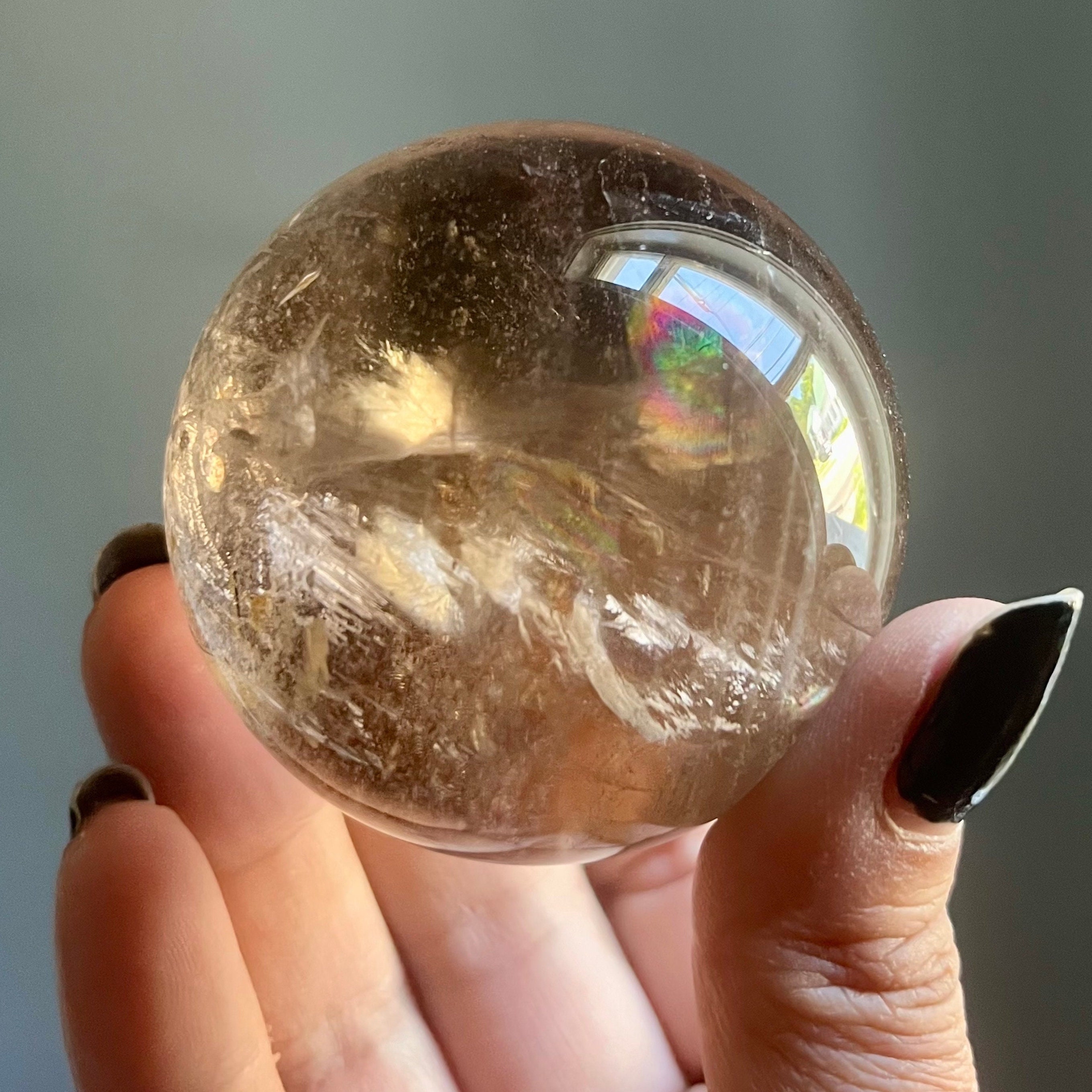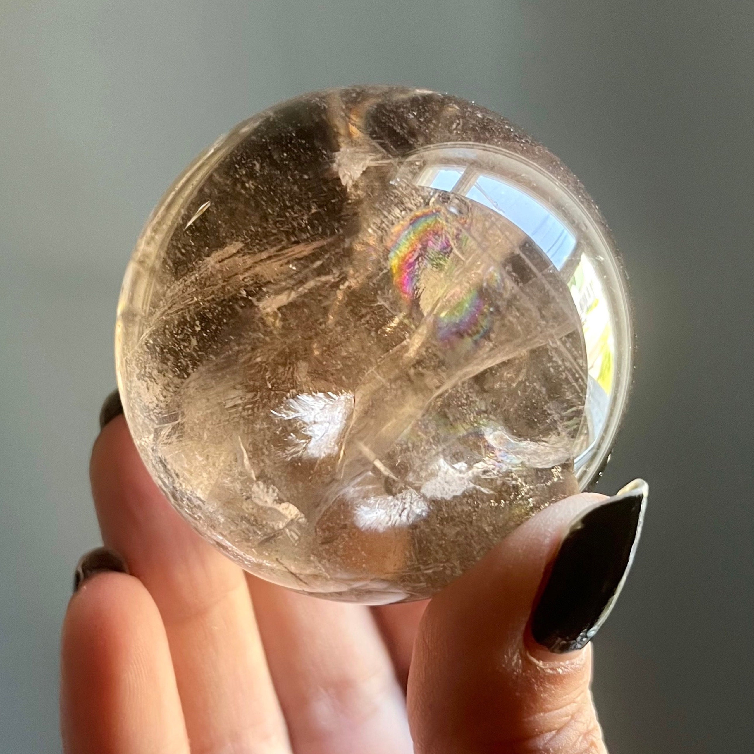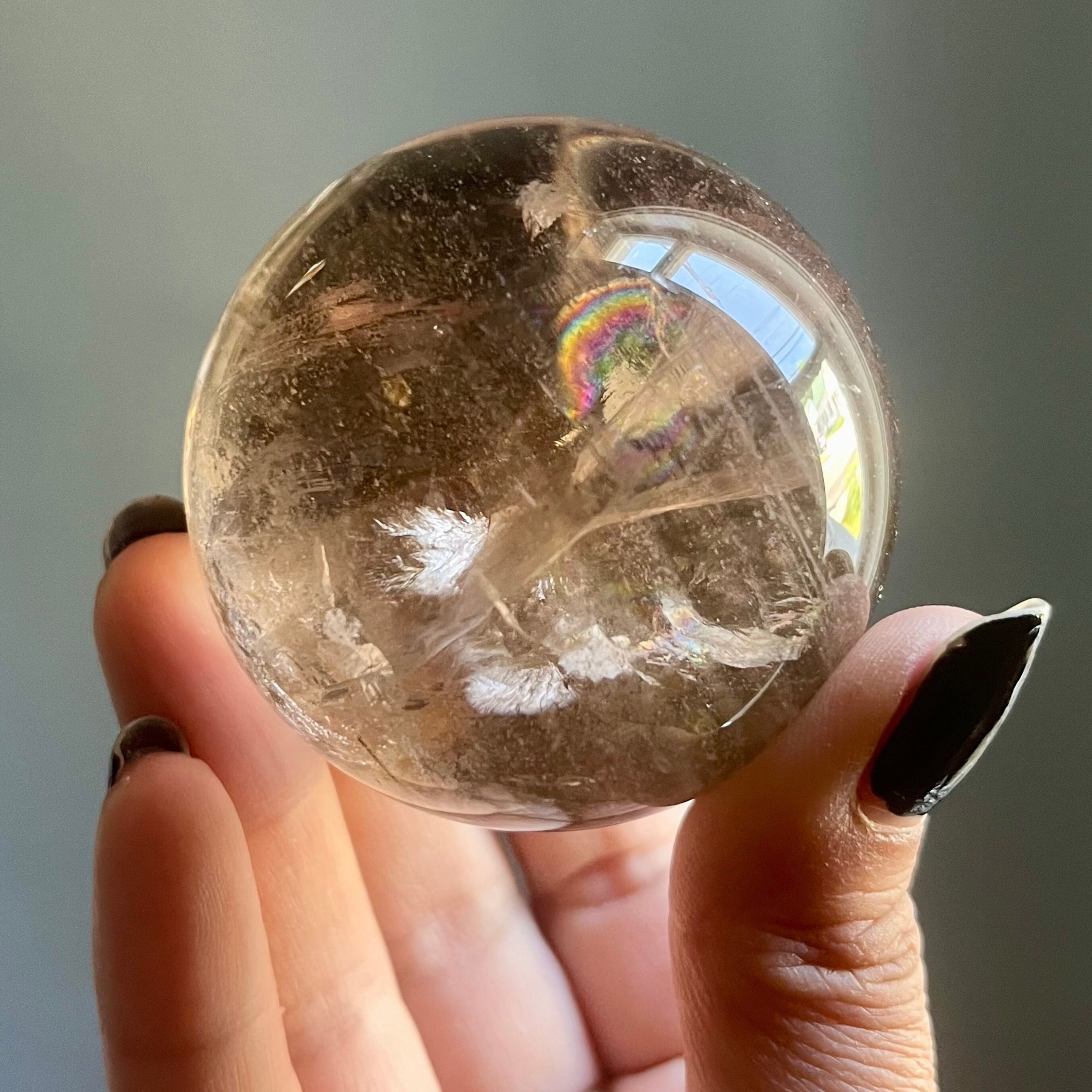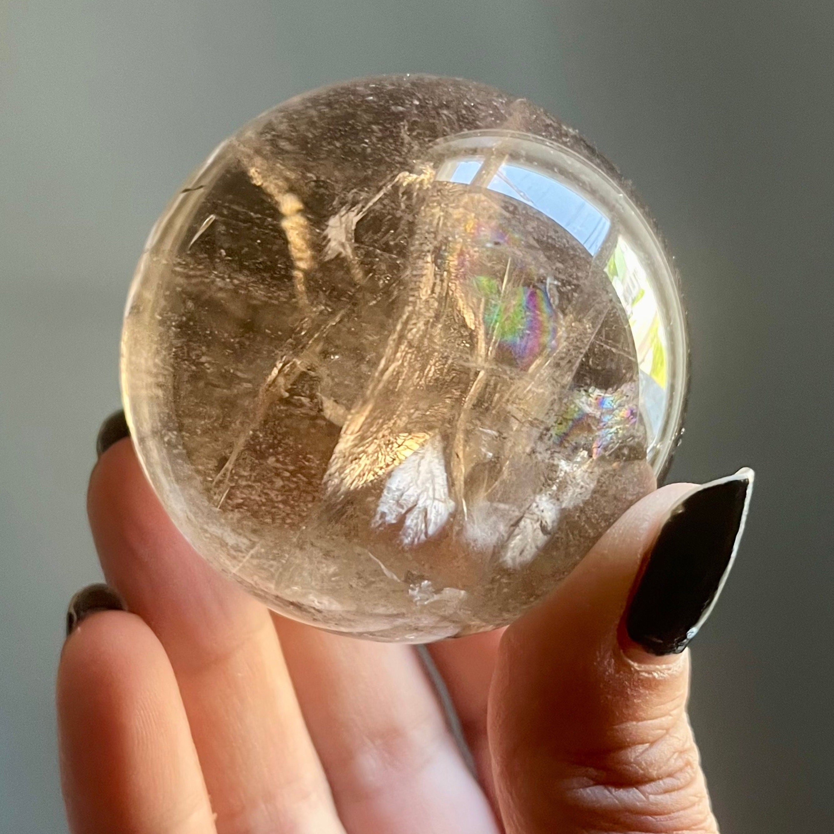Resonating though the clarity of the stone the light brings this sphere to life, illuminating the piece with a shimmering golden glow and transforming silver hematite into vibrant full spectrum rainbows.