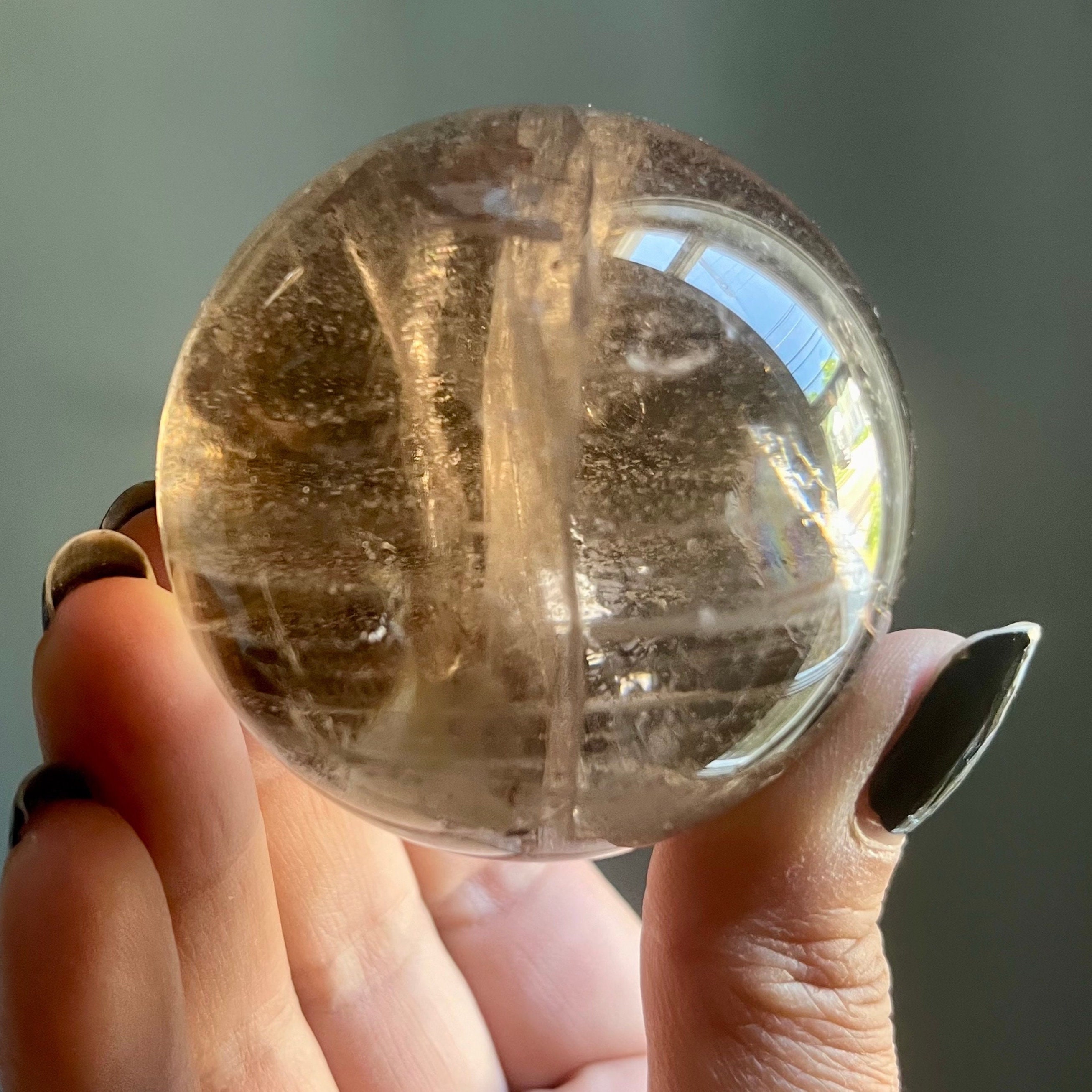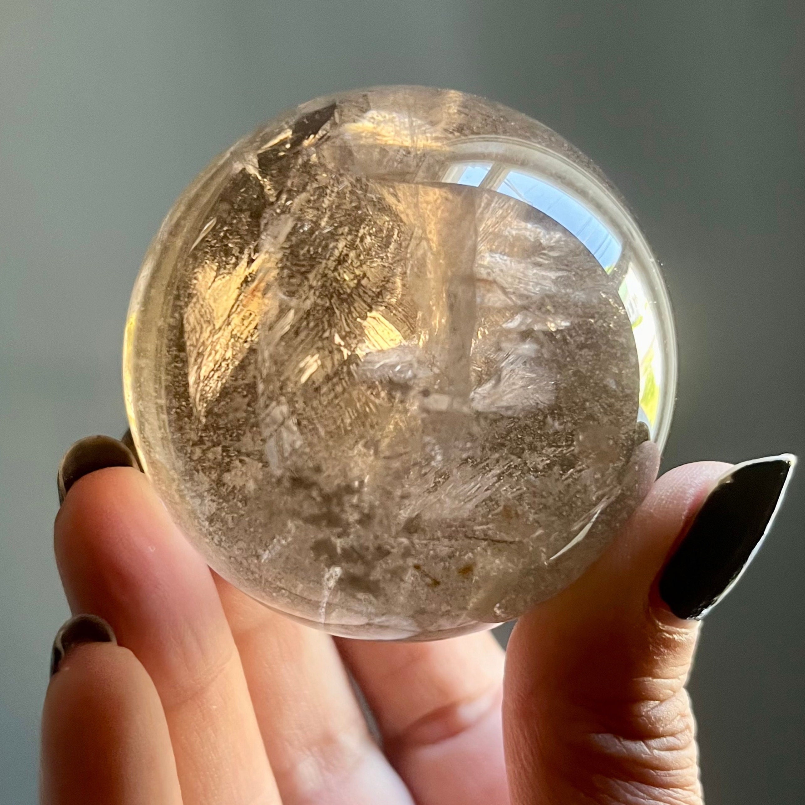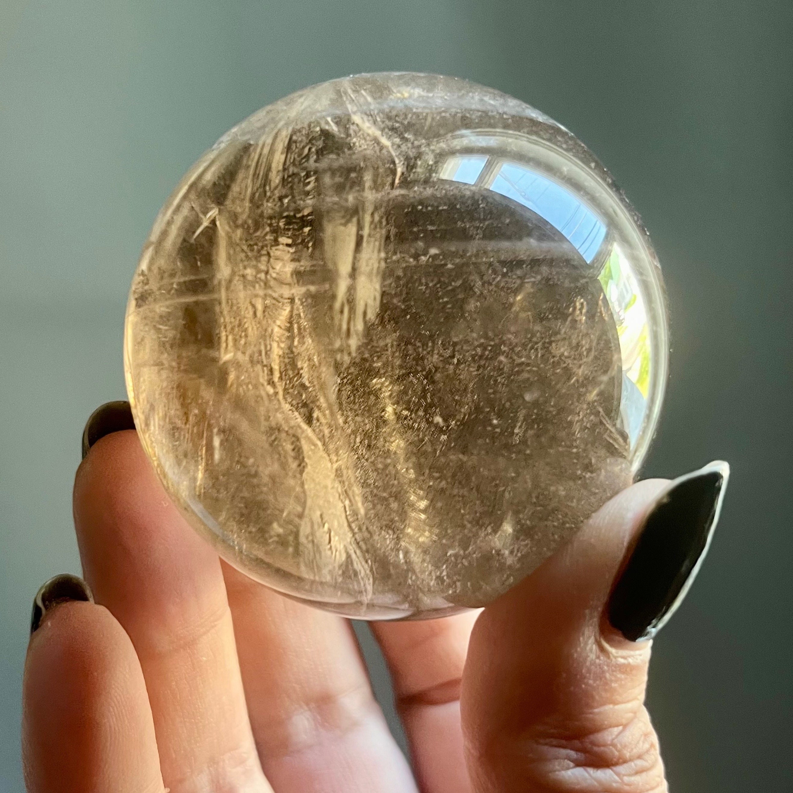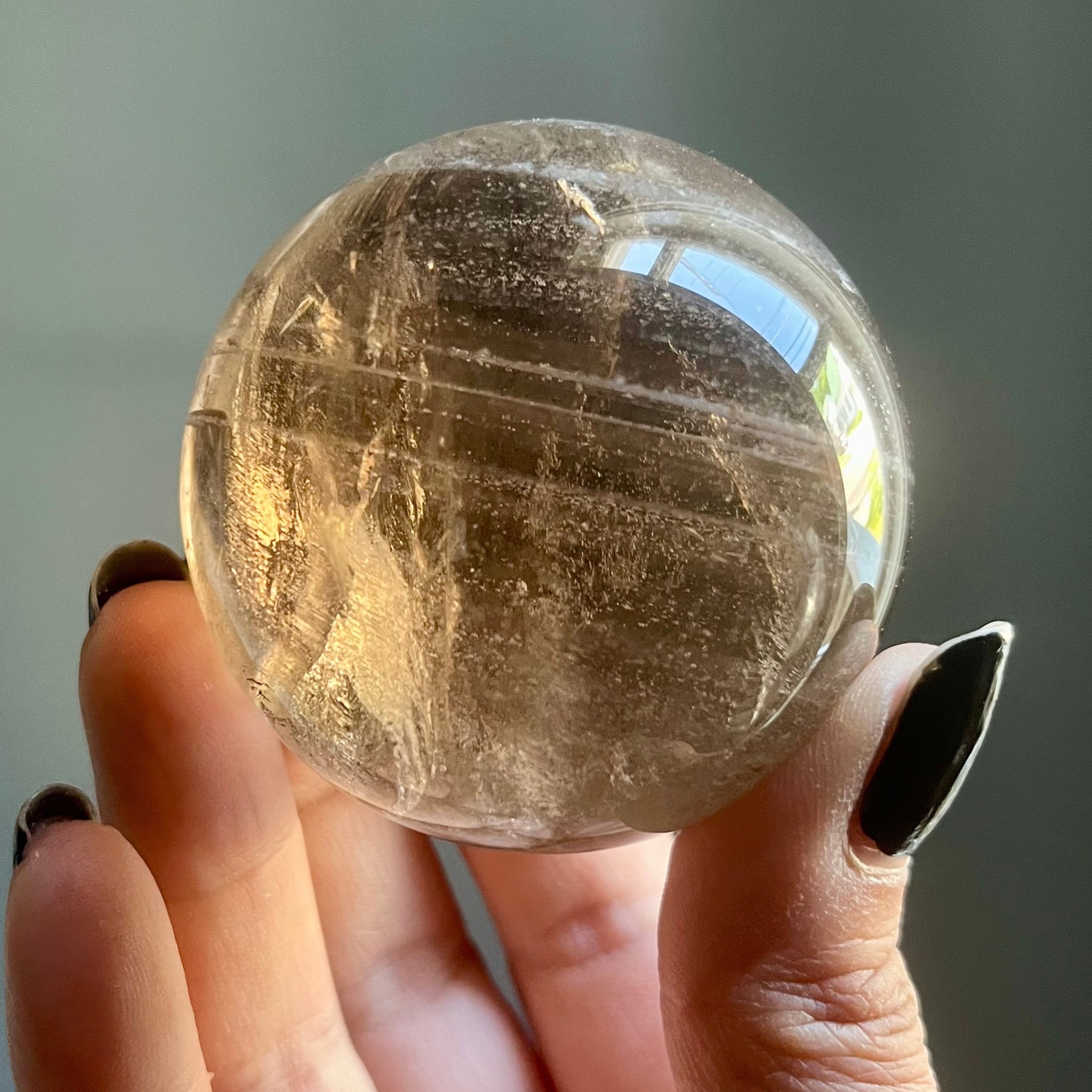 This hand polished citrine crystal sphere was crafted by an artisan lapidary in Brazil. Photos are taken in indirect natural sunlight to highlight the intricate internal landscape and the spirit of the stone.