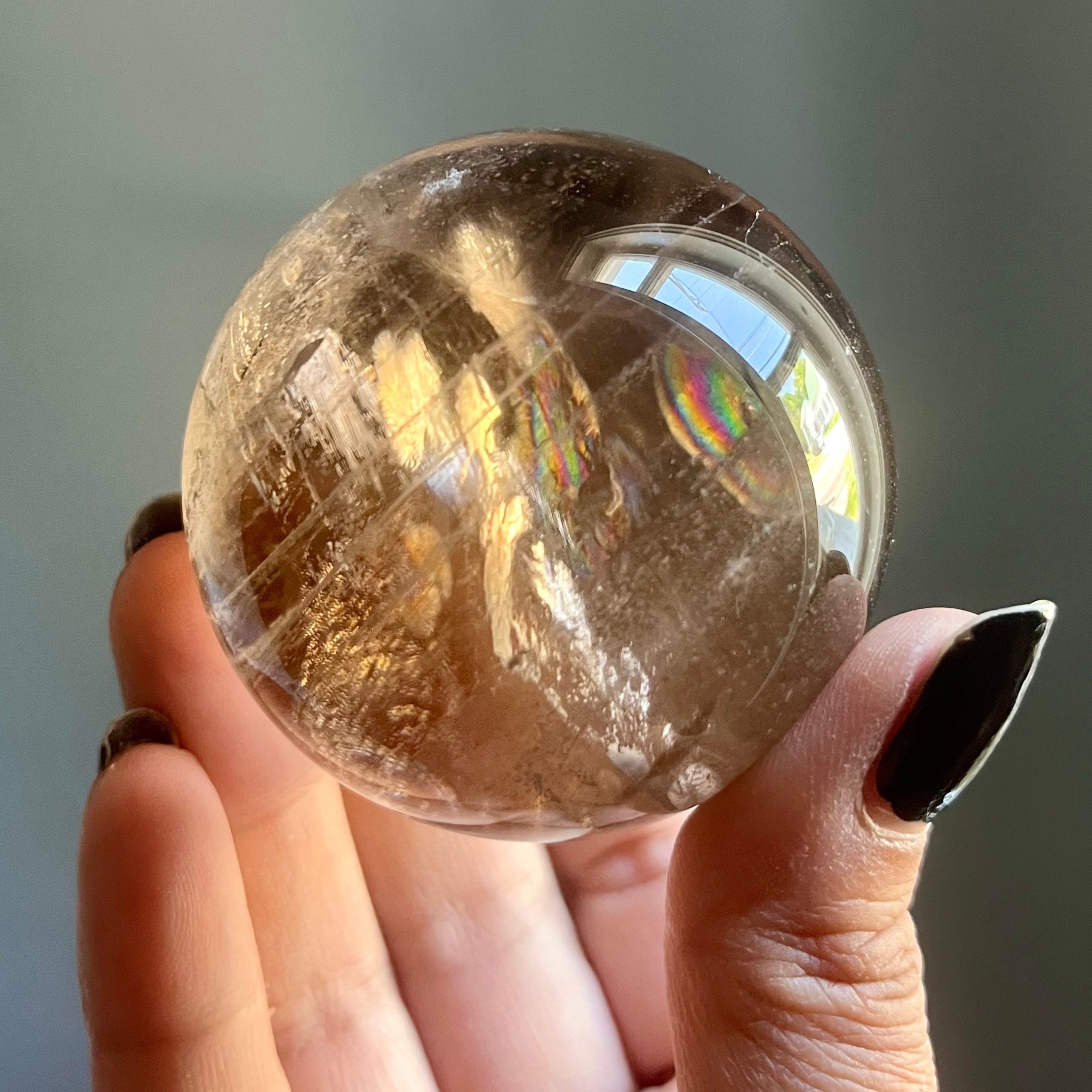 Saturated, high grade natural citrine quartz sphere radiates in warm golden hues. Untreated citrine from Brazil, rich like honey, this piece has a story to tell. Citrine phantoms speak of past lives and vibrant rainbows speak the language of light.