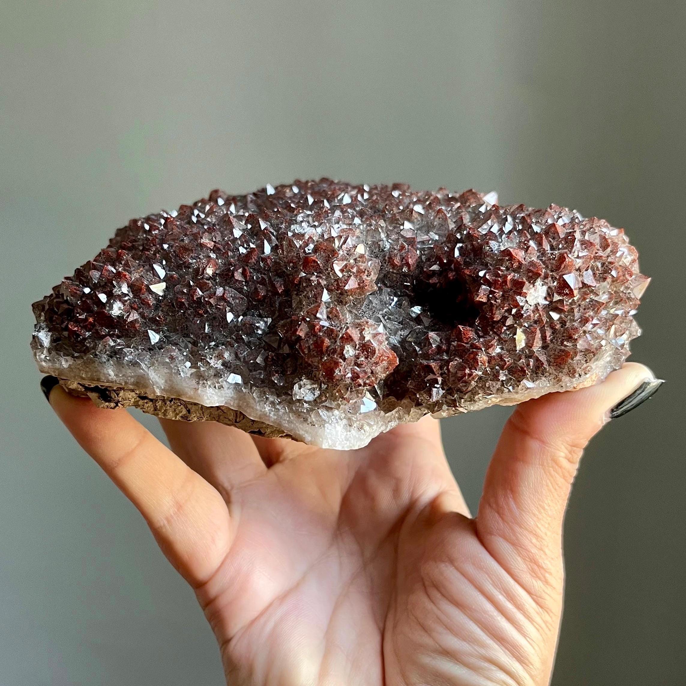 The light illuminates each glossy, impeccable termination, the piece itself shimmering with every shift of angle. Saturated red terminations transform, unveiling rich, smoky amethyst with distinct red rutile.