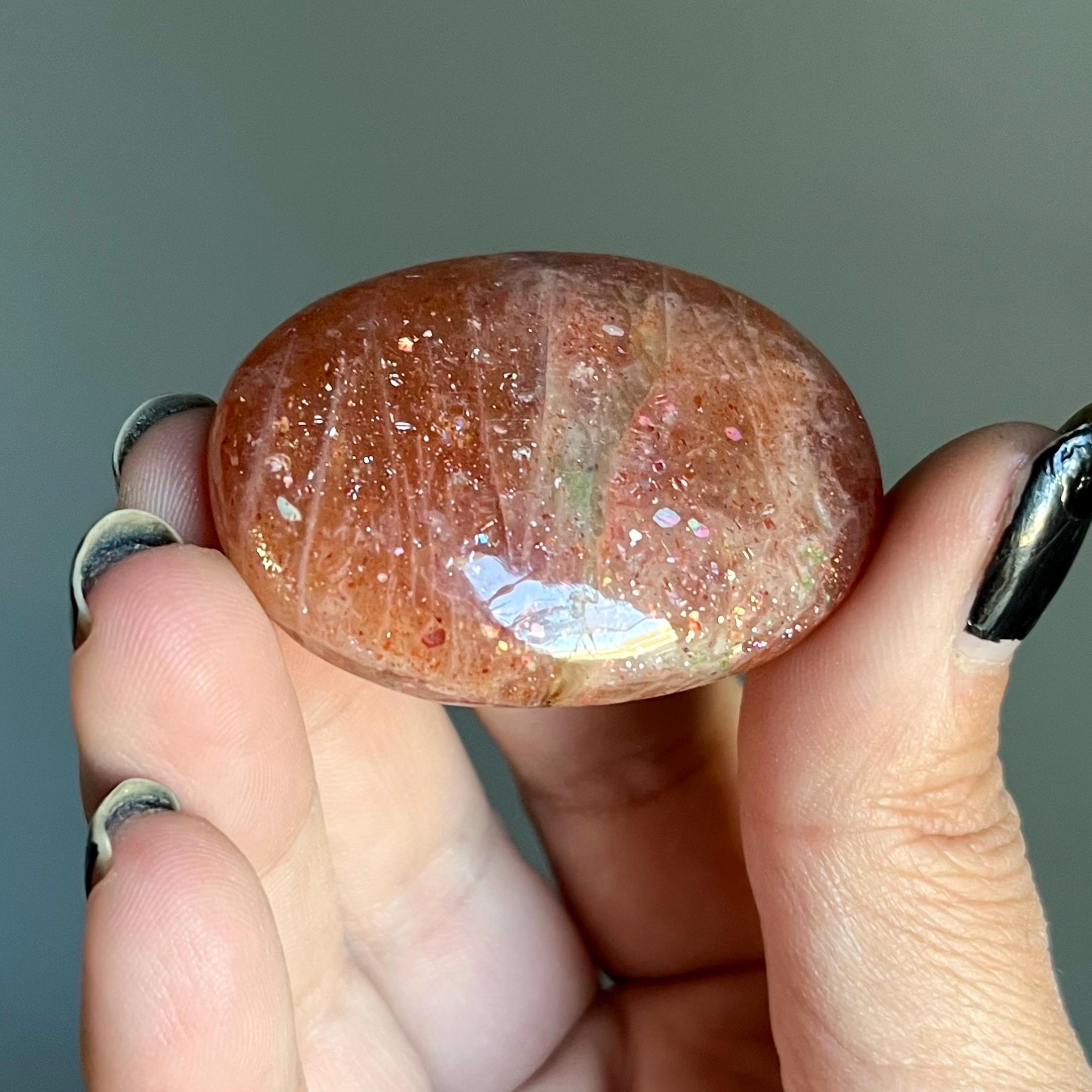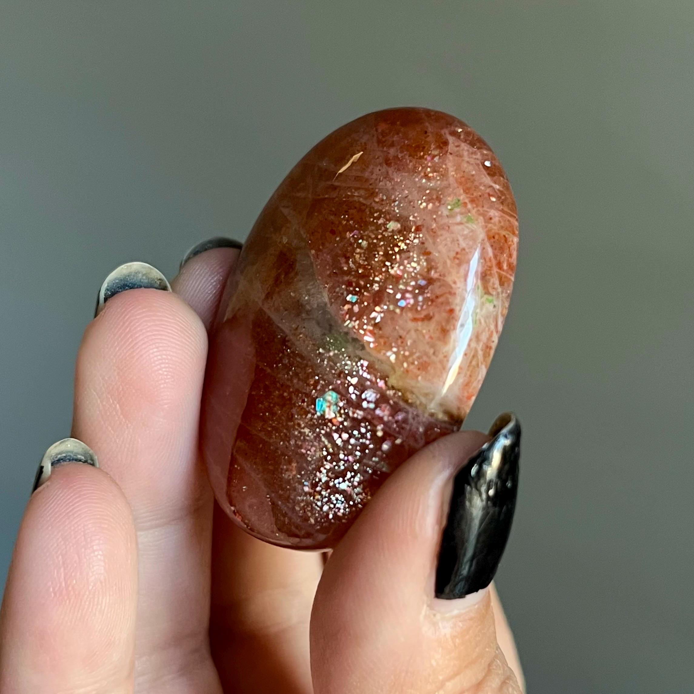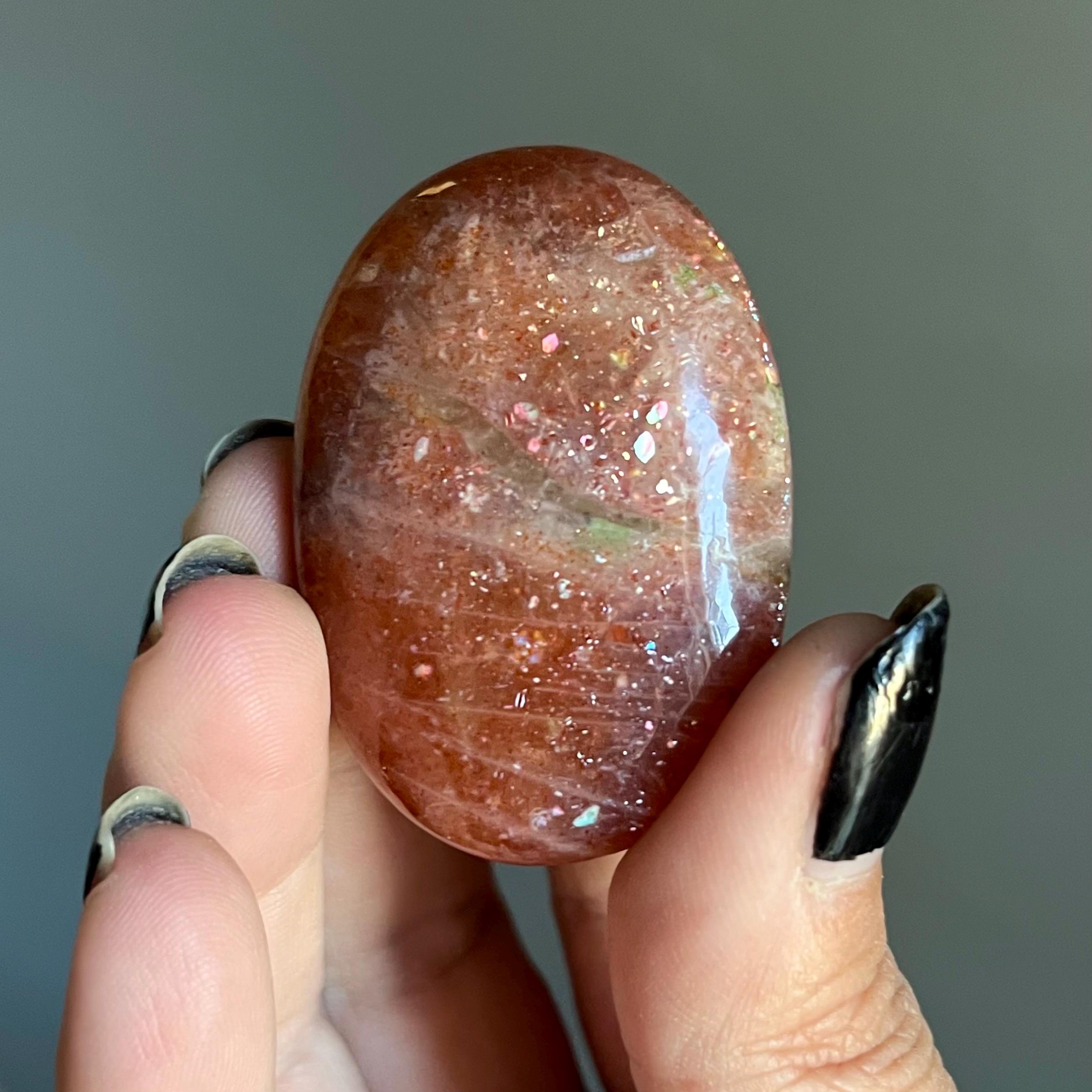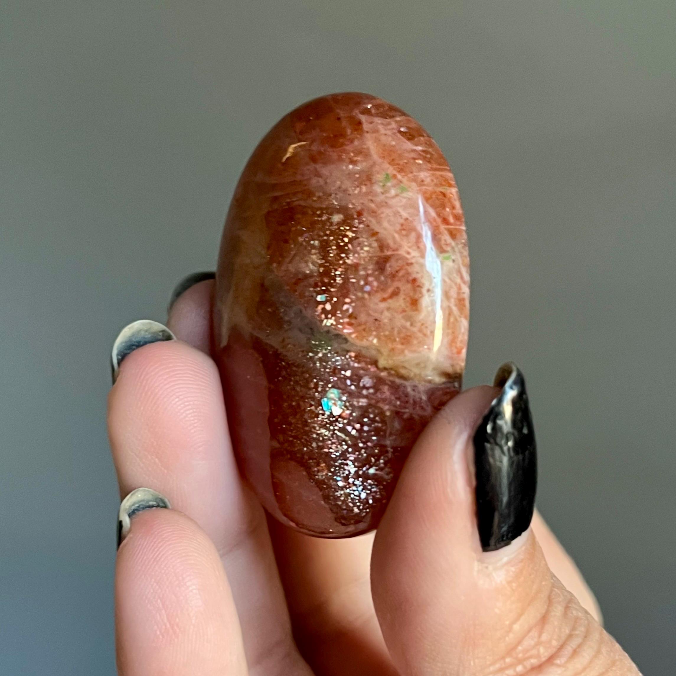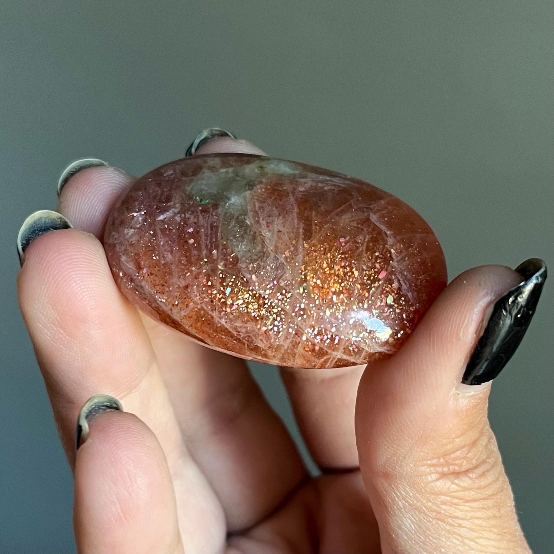 This exquisite, high grade Arusha sunstone palmstone moves in waves, brilliant rainbow sunstone flash and vivid confetti sunstone lattice illuminate this rare sunstone crystal from Tanzania, manifesting with silver and blue moonstone flash with asterism.