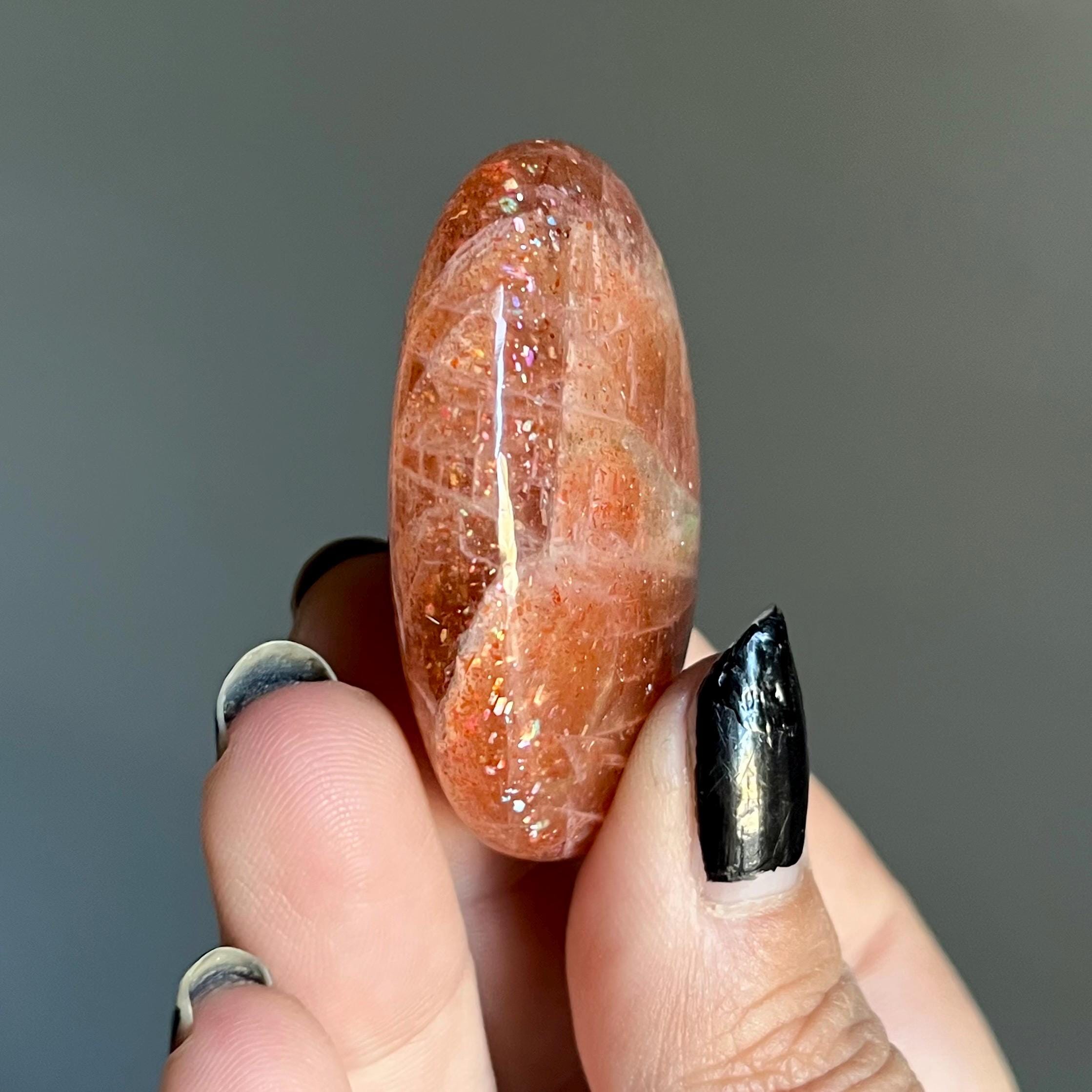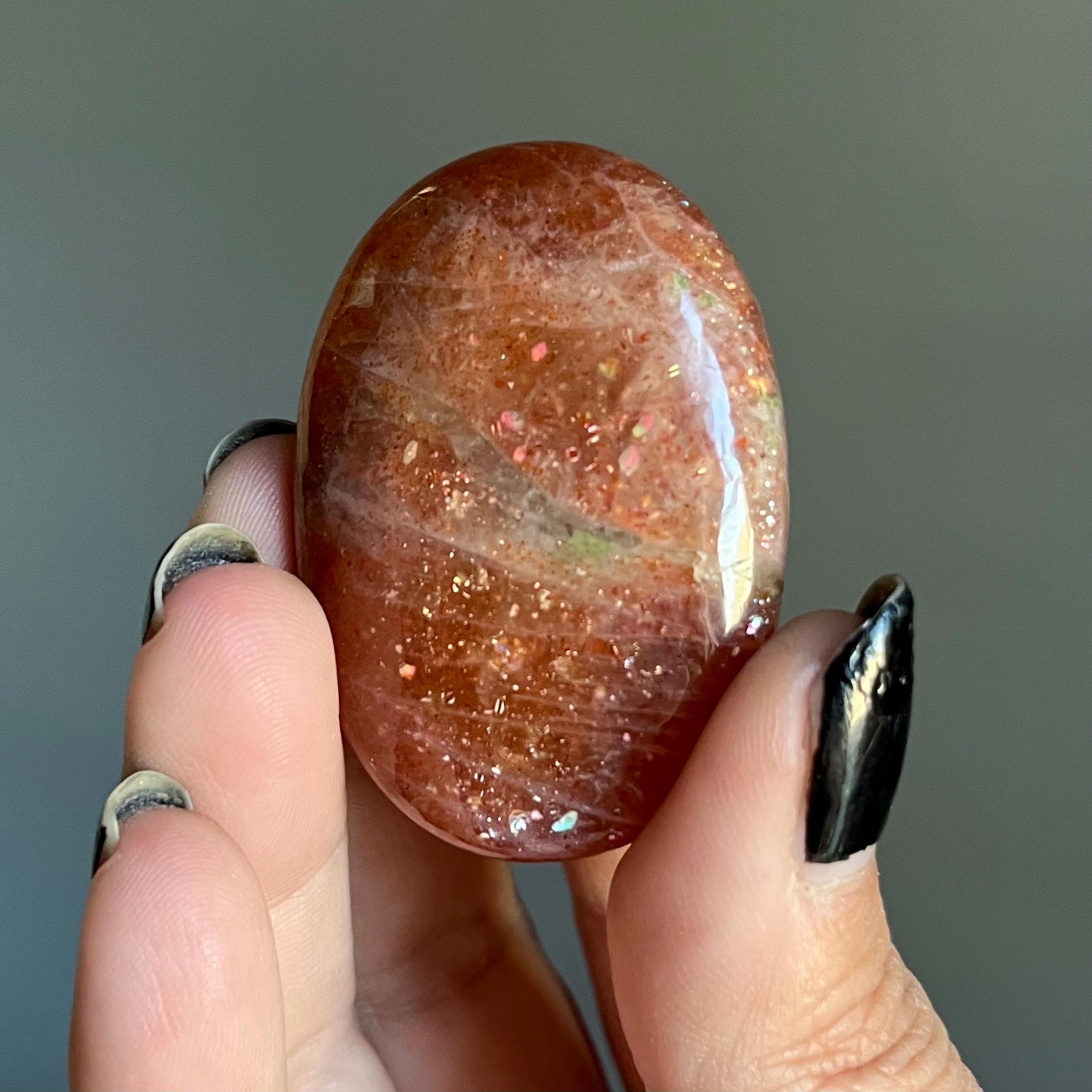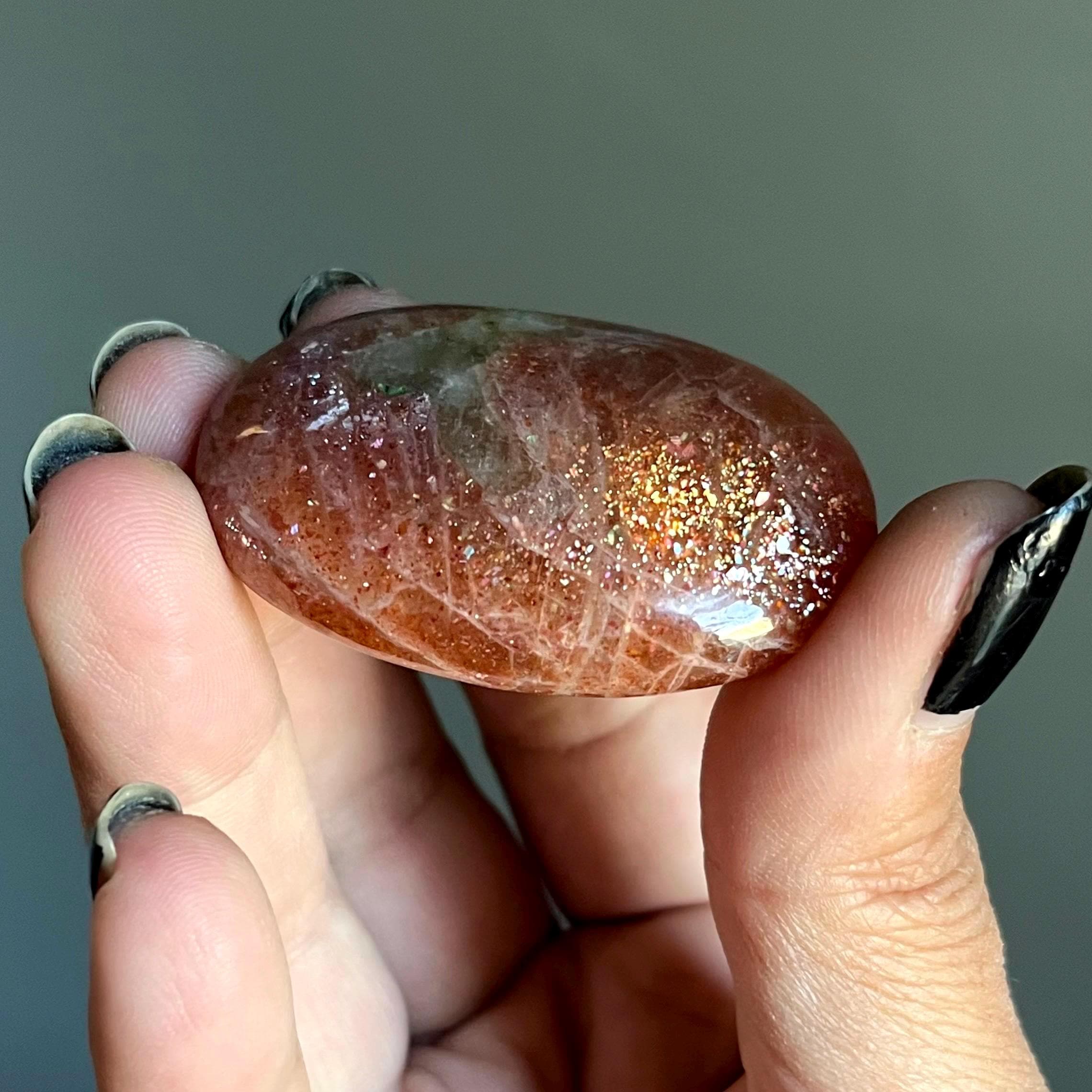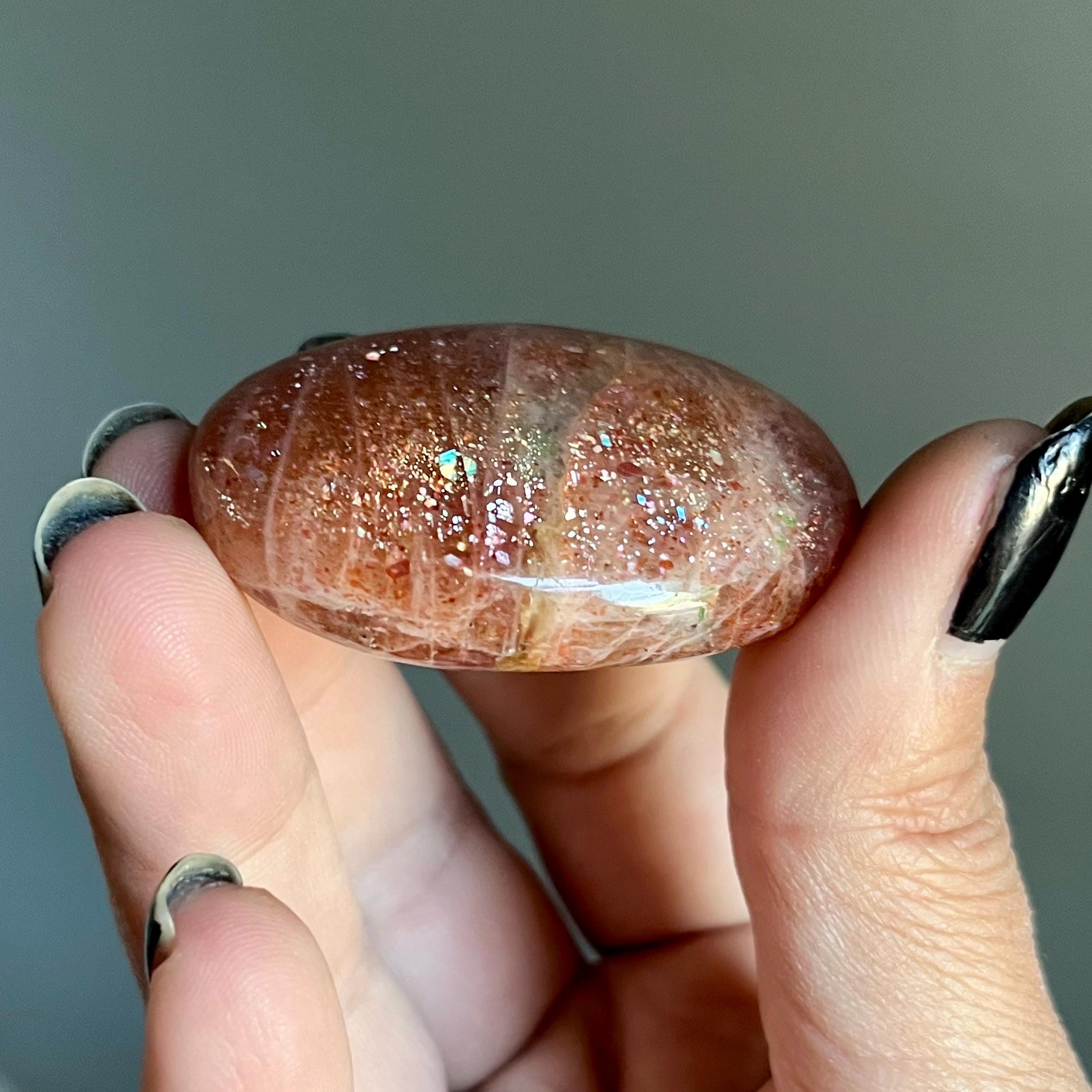 This exquisite, high grade Arusha sunstone palmstone moves in waves, brilliant rainbow sunstone flash and vivid confetti sunstone lattice illuminate this rare sunstone crystal from Tanzania, manifesting with silver and blue moonstone flash with asterism.