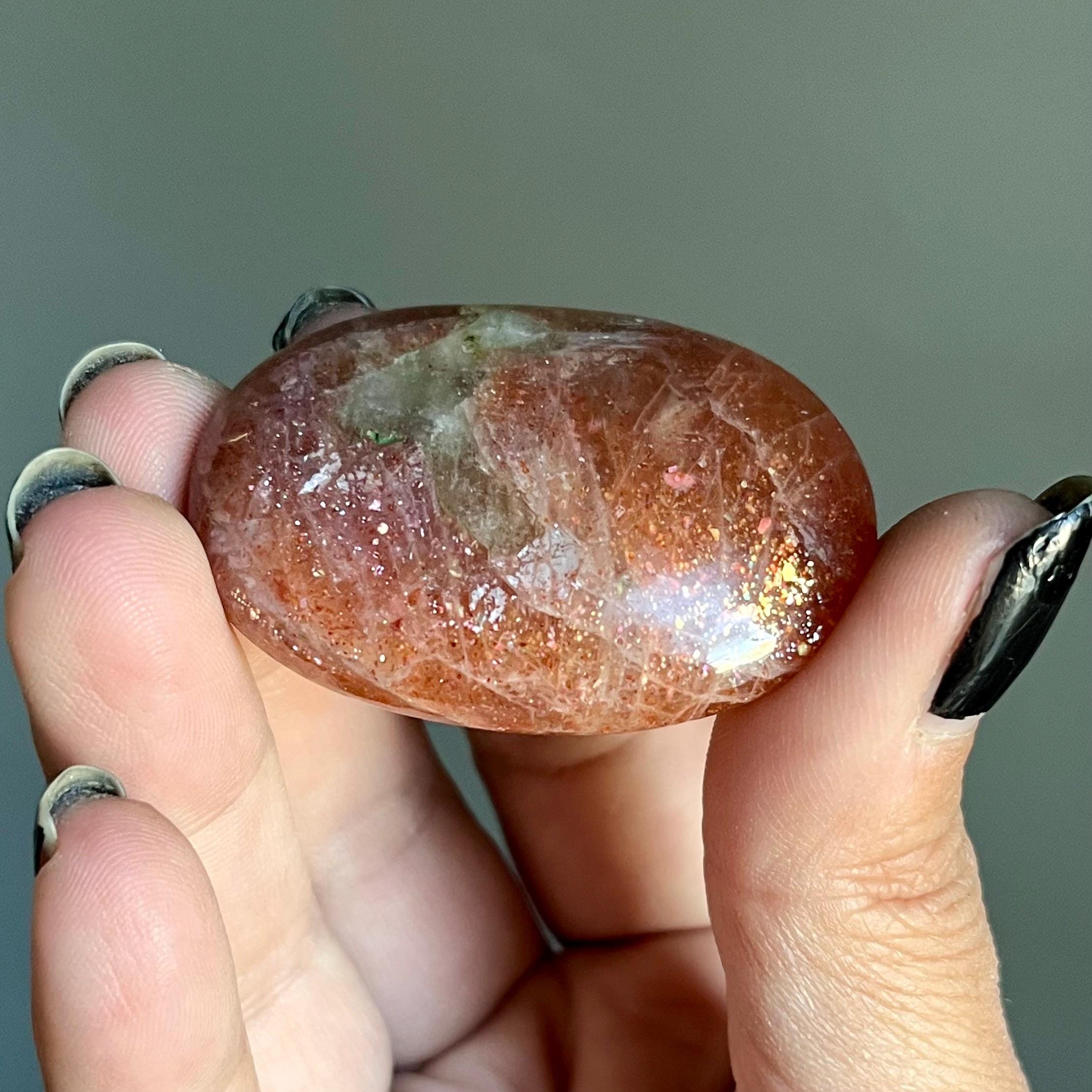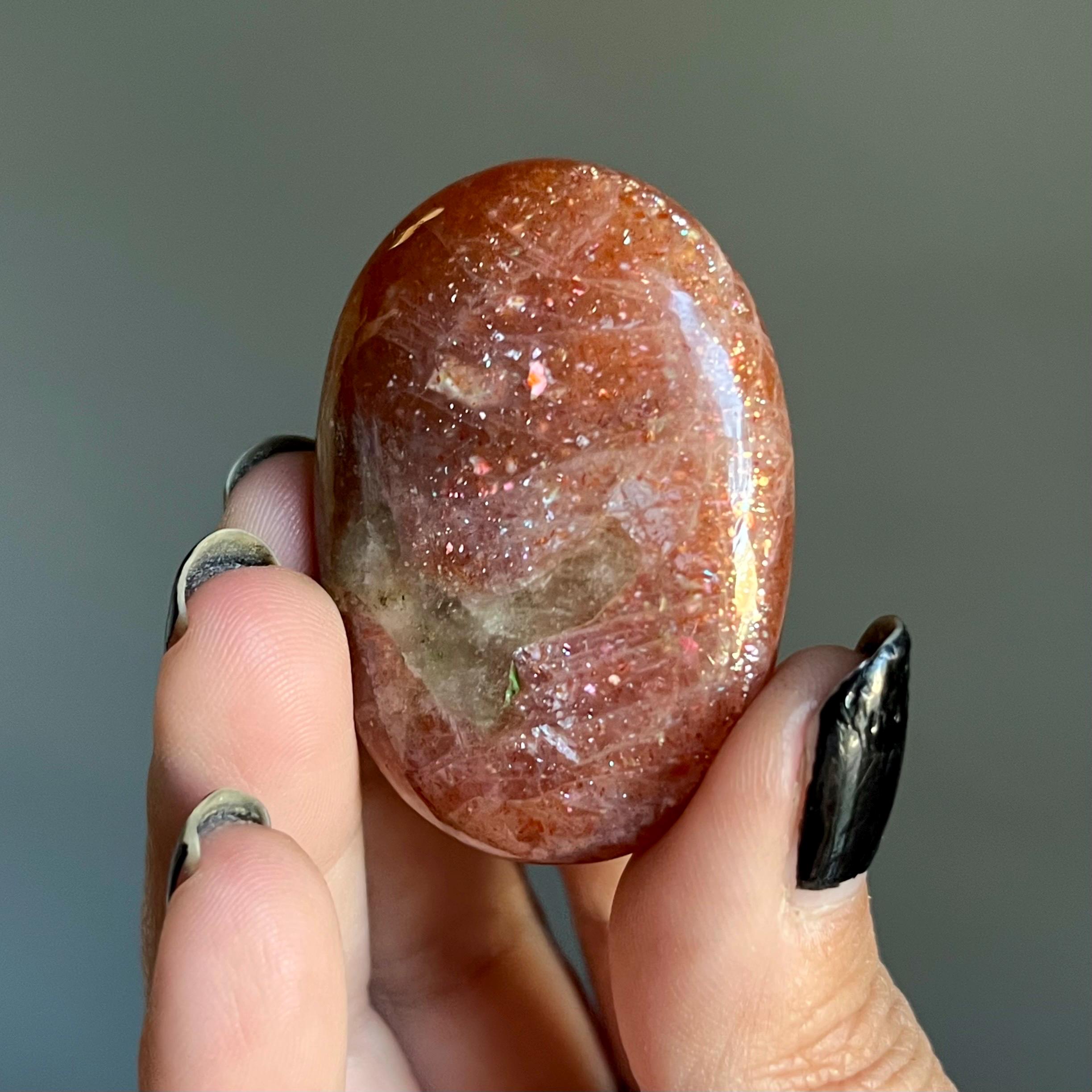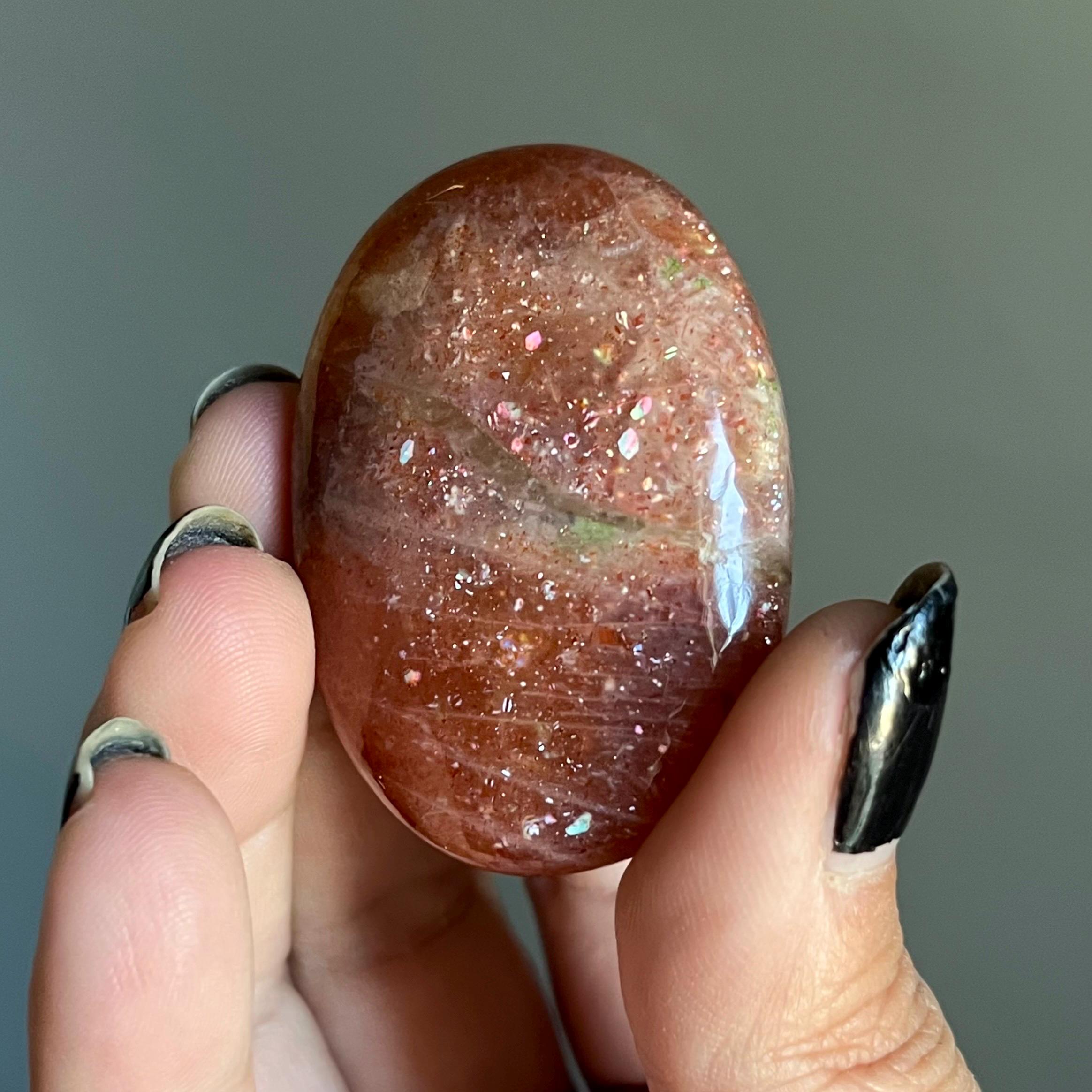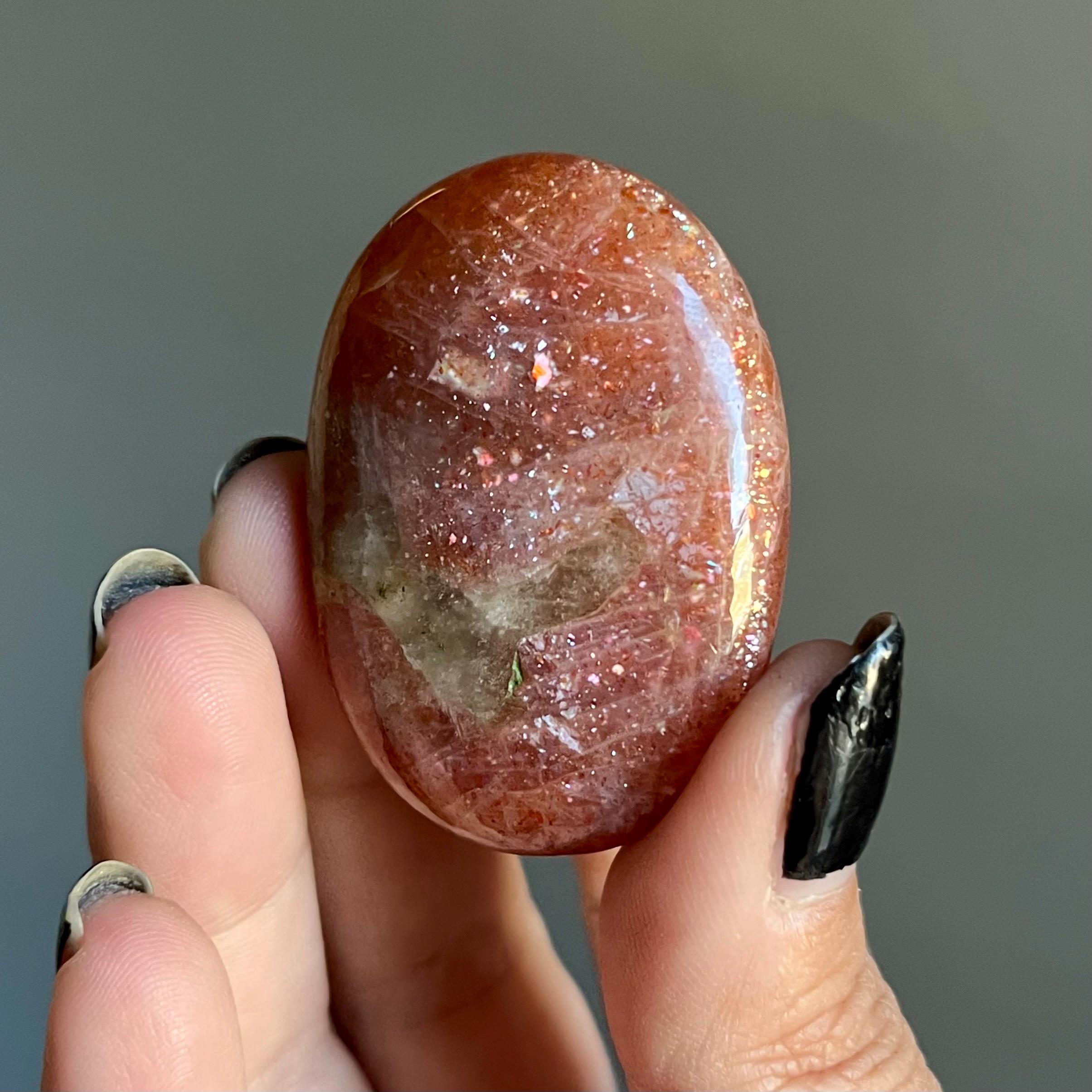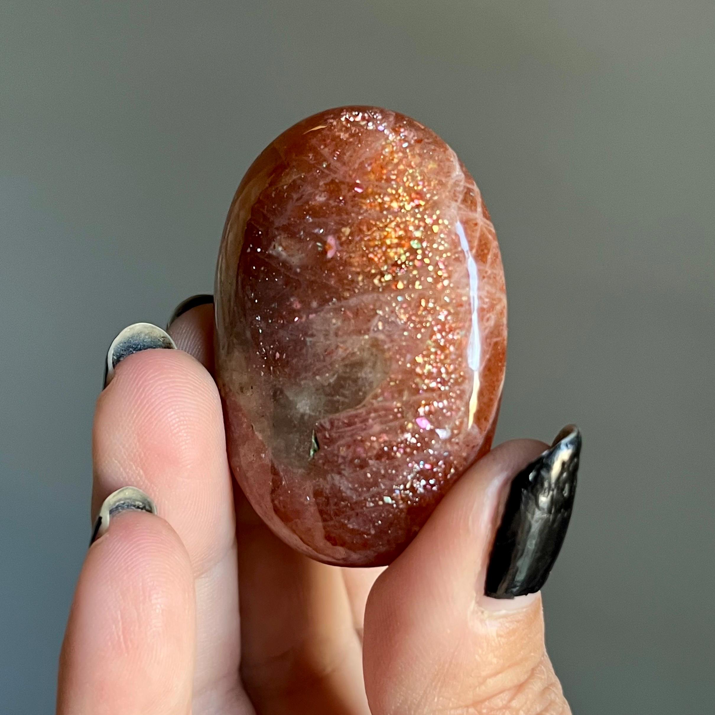 This exquisite, high grade Arusha sunstone palmstone moves in waves, brilliant rainbow sunstone flash and vivid confetti sunstone lattice illuminate this rare sunstone crystal from Tanzania, manifesting with silver and blue moonstone flash with asterism.