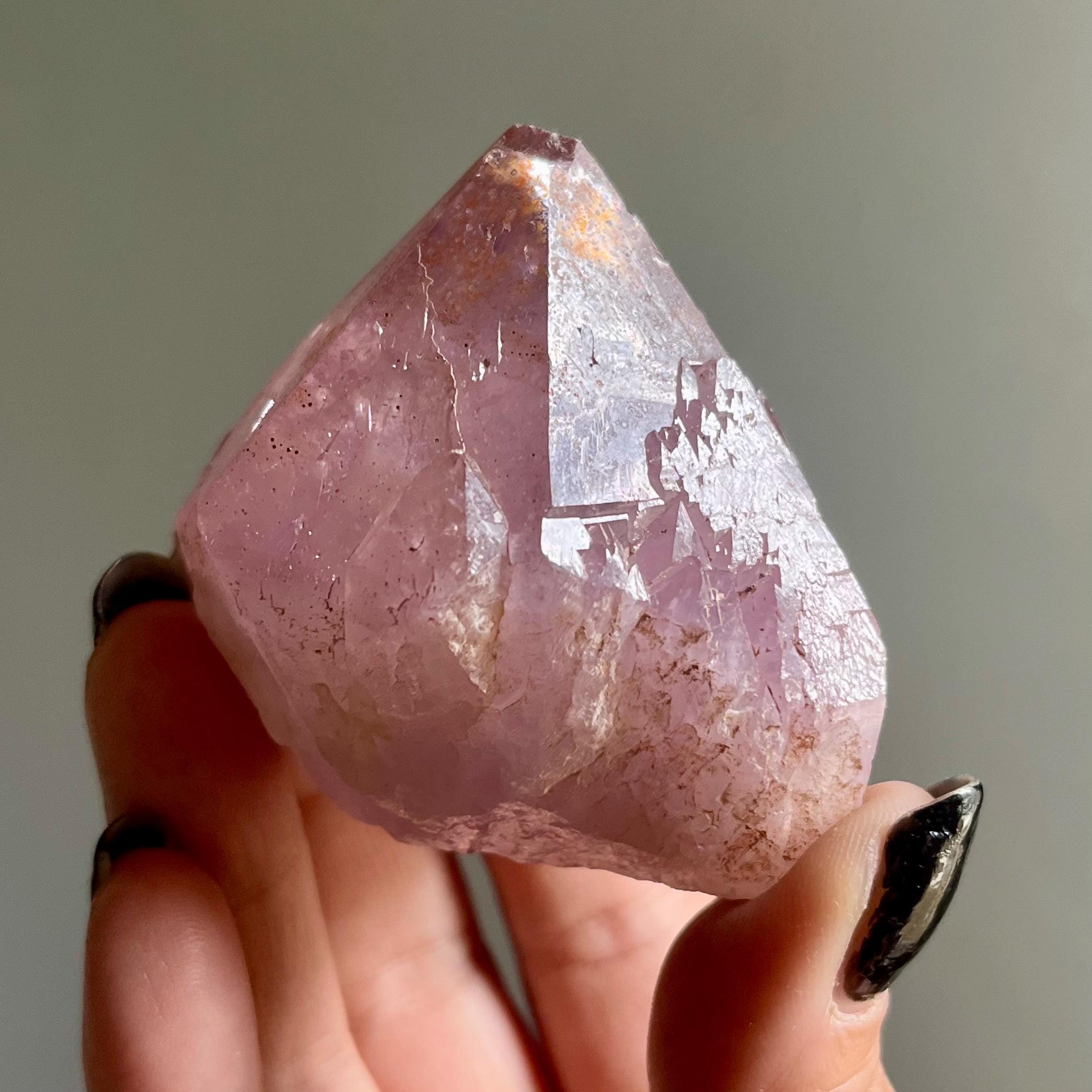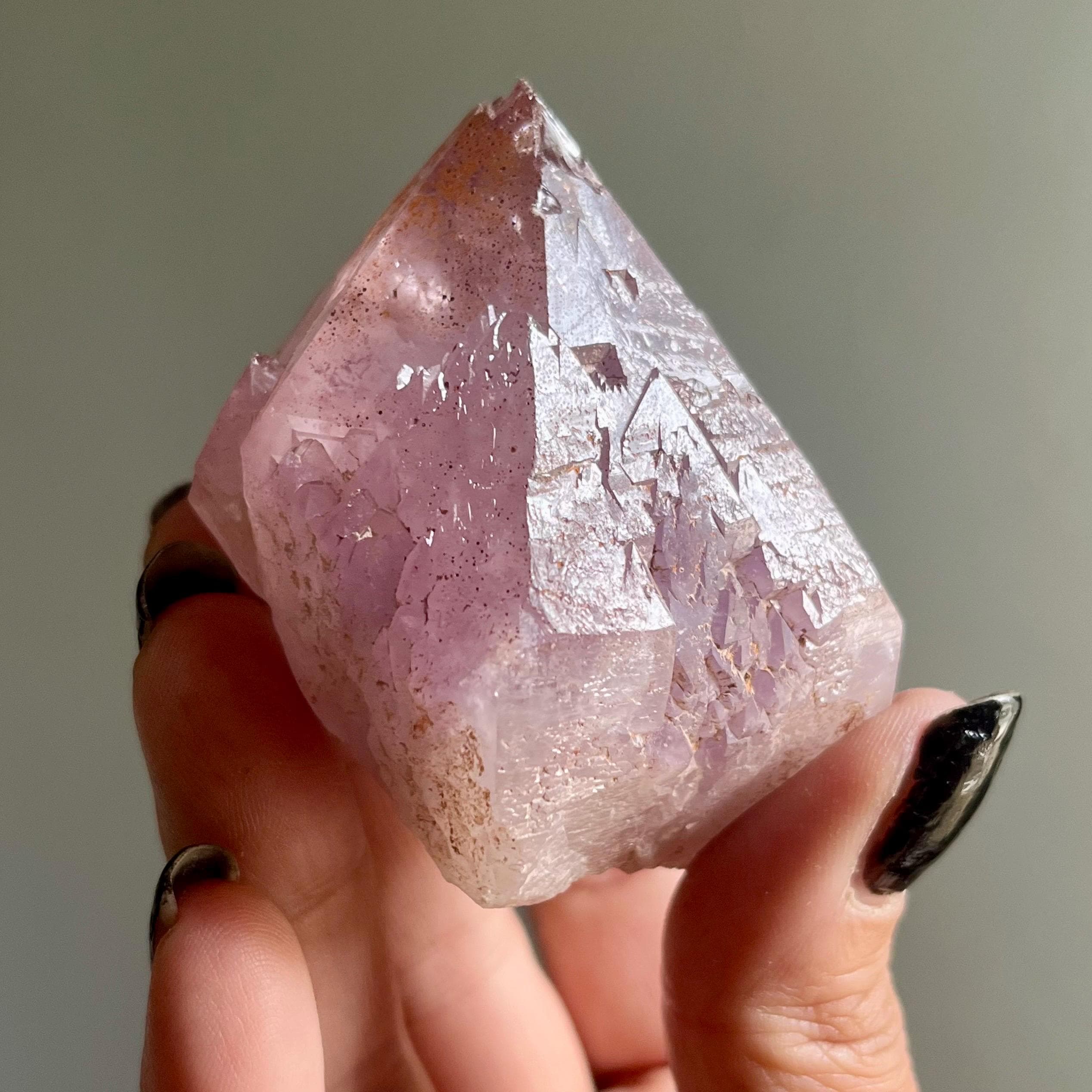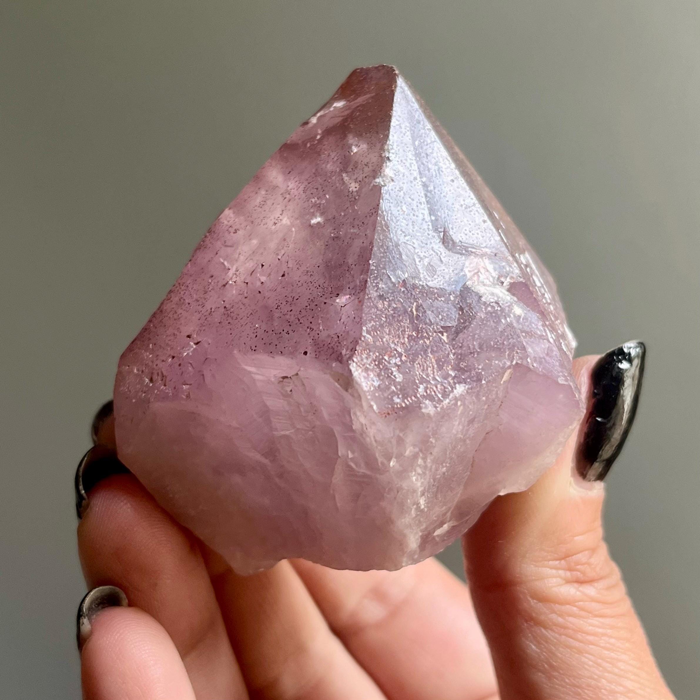 Natural imperfections are possible and probable. This raw auralite crystal is exceptionally well terminated for a wild stone, with impeccable elestial formations.