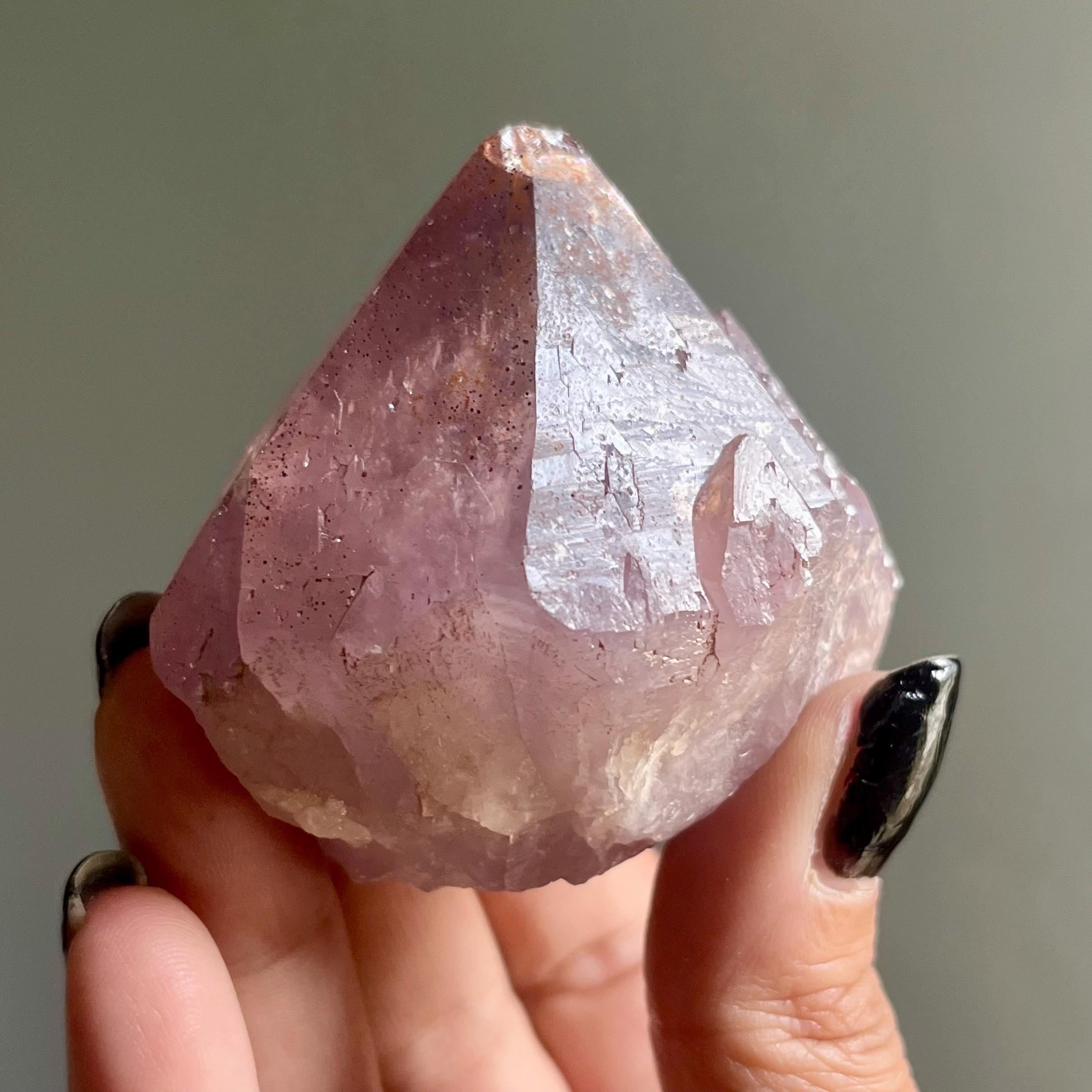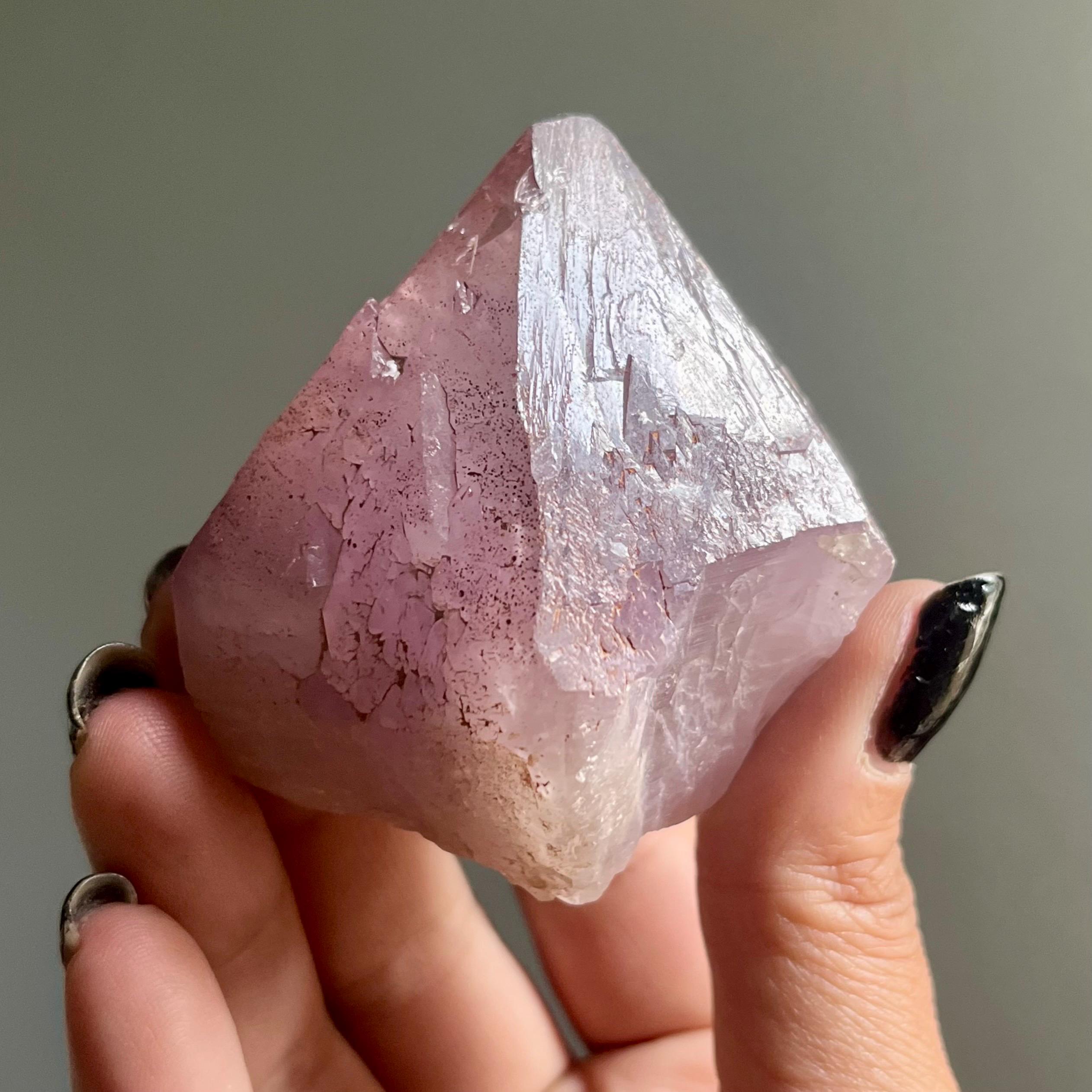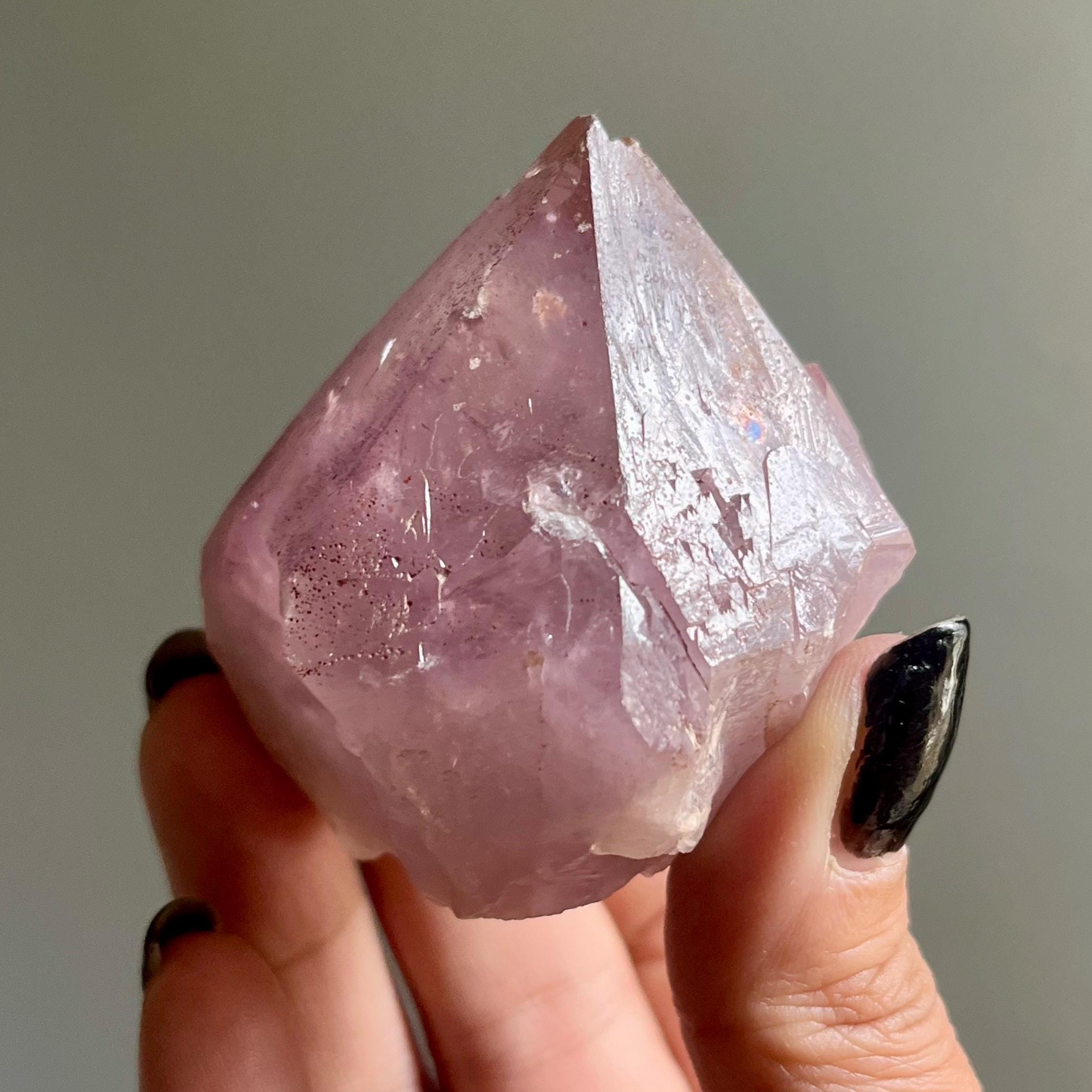 Natural imperfections are possible and probable. This raw auralite crystal is exceptionally well terminated for a wild stone, with impeccable elestial formations.