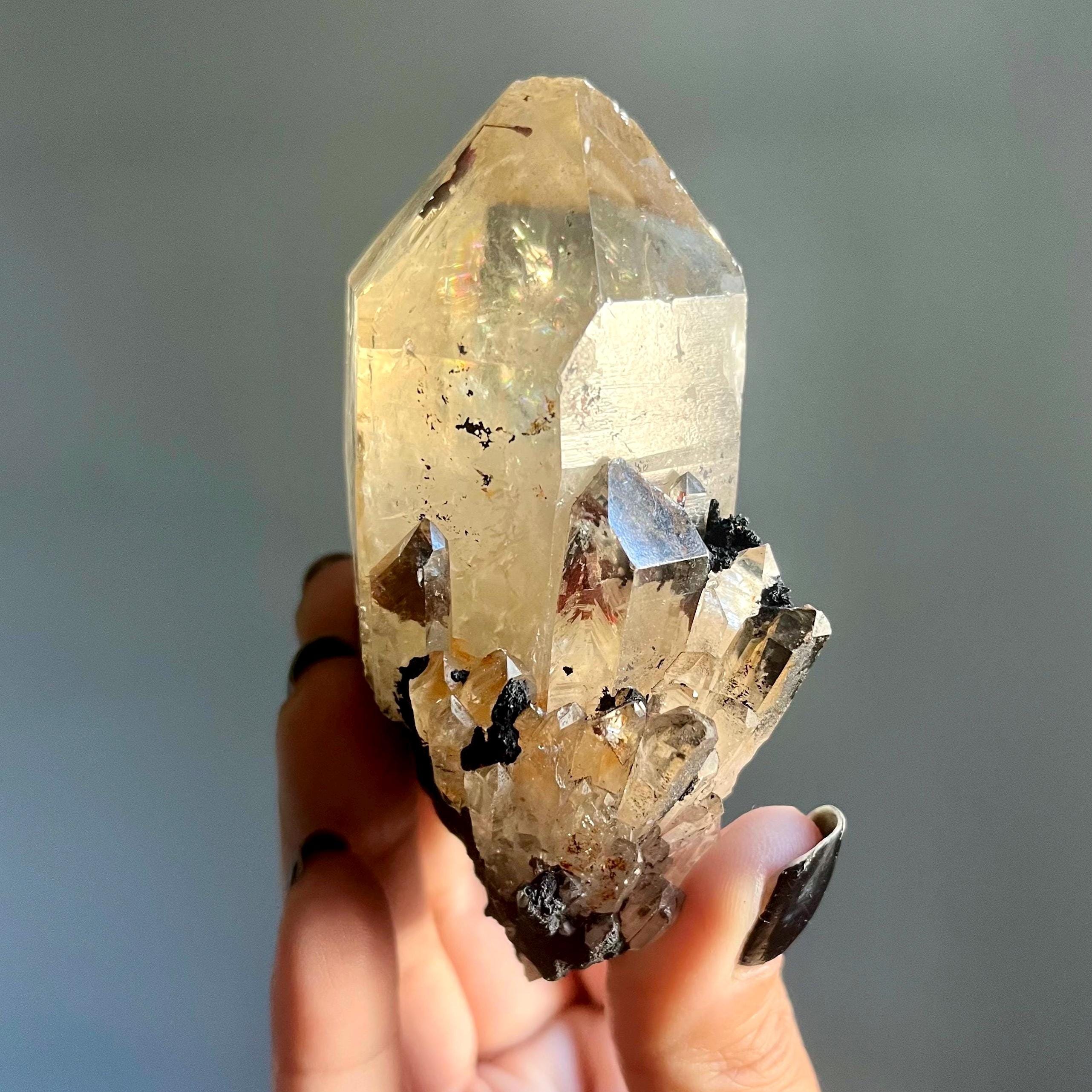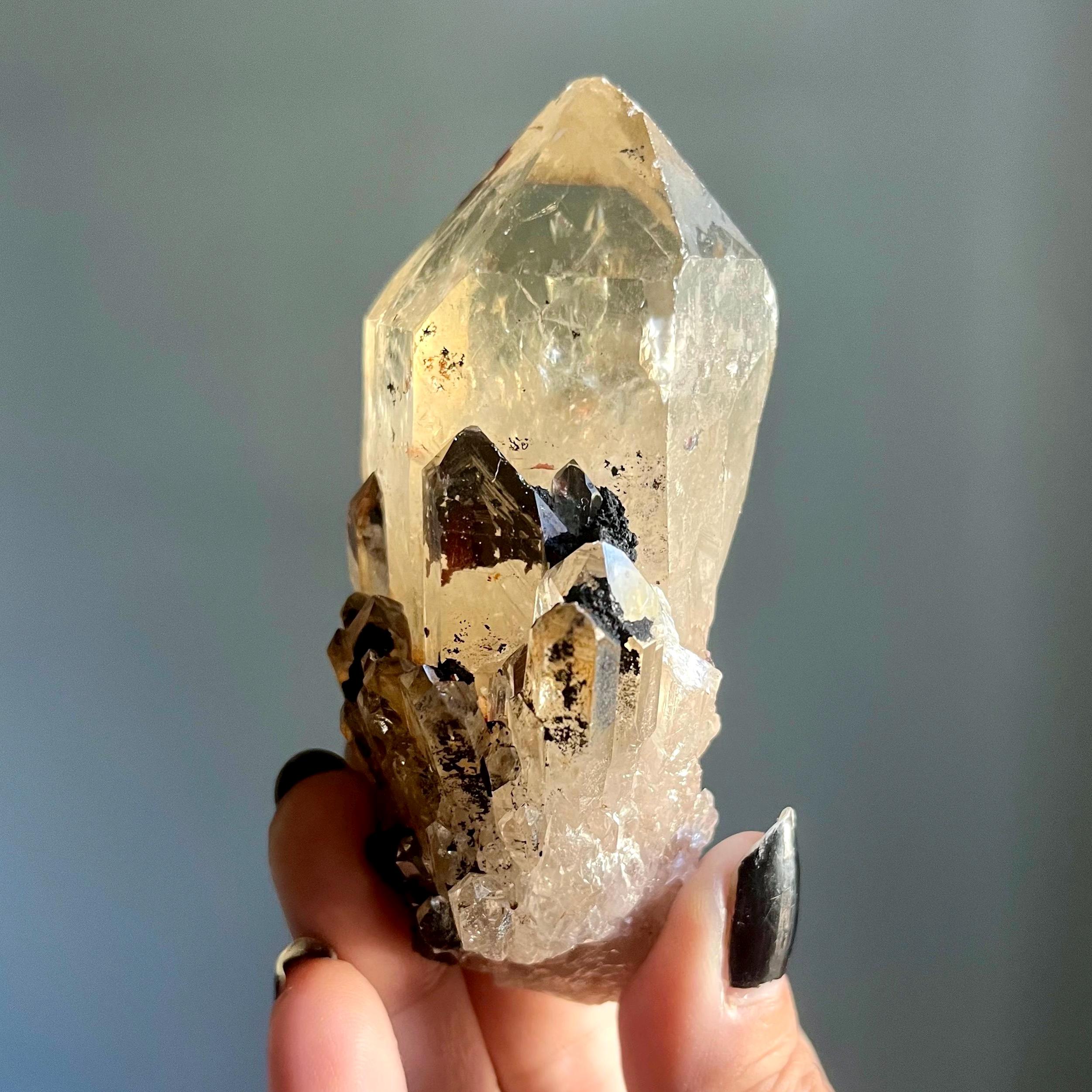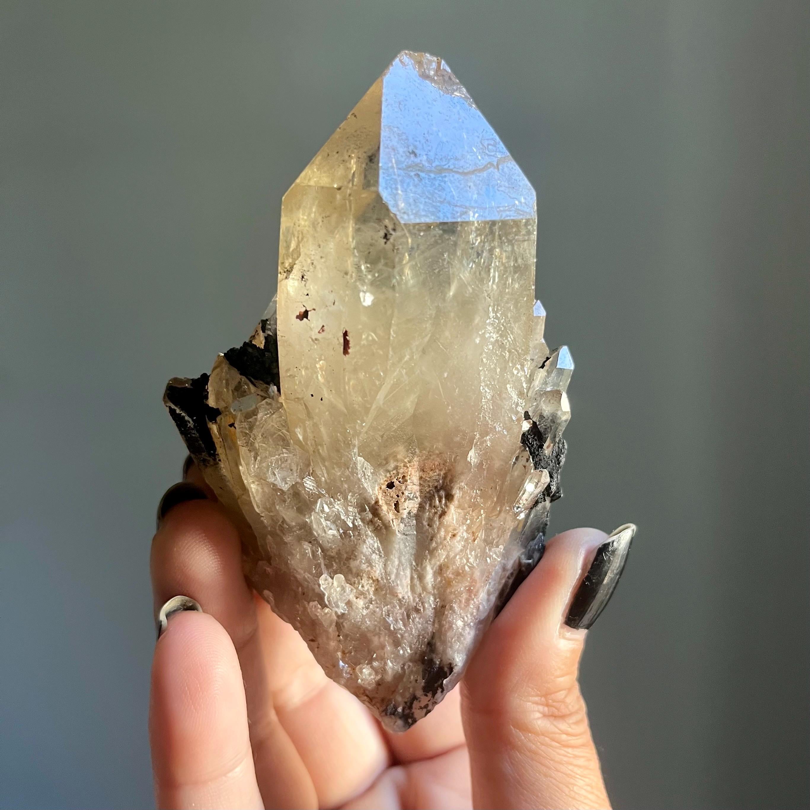 This piece is particularly large for a primarily singular kundalini quartz crystal. Feral, there are natural flaws in the termination, a reminder that this stone is wild and untouched.