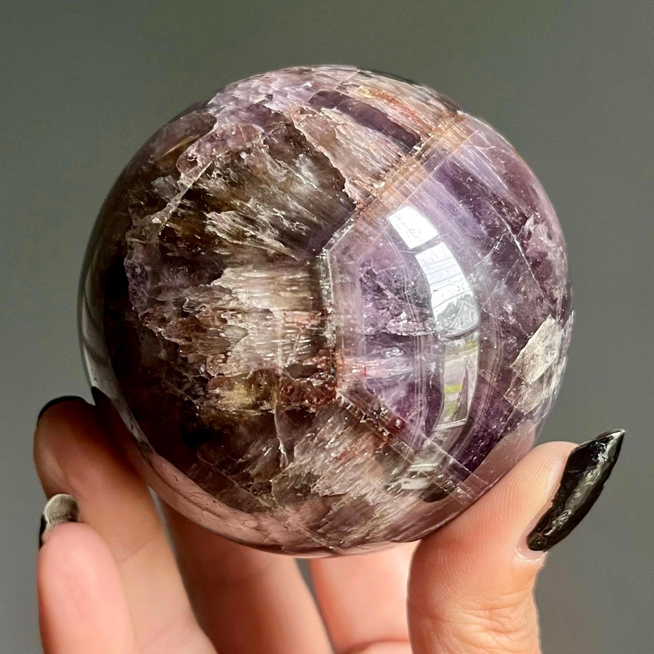 Layers of graduated hexagonal amethyst phantoms manifest with rich, visible cacoxenite and abundant red and lepidicrocite rutile. Vibrant rainbows radiate from deep within this sacred sphere.