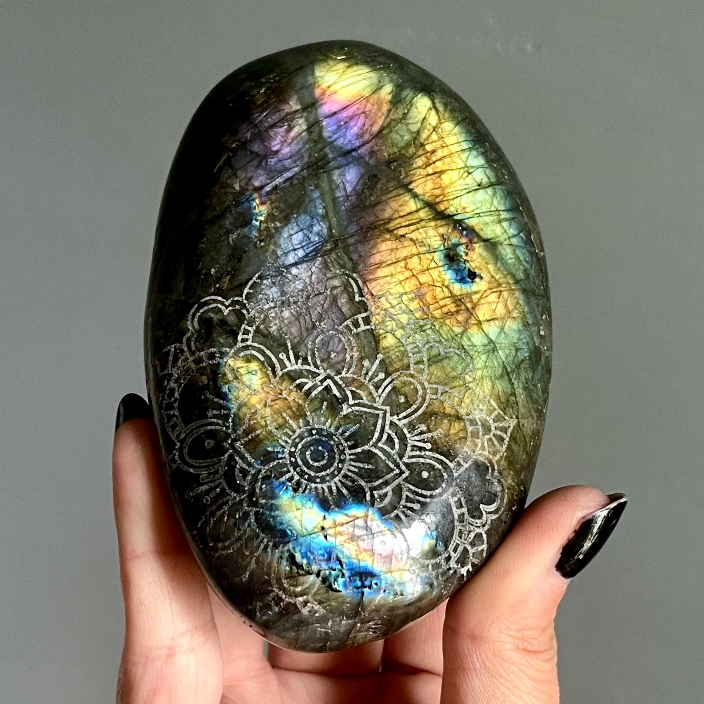 Uniquely one of a kind, the energy of labradorite and the ancient symbology of the sacred mandala are amplified by the resonance of the heart centered intention of the creation itself.