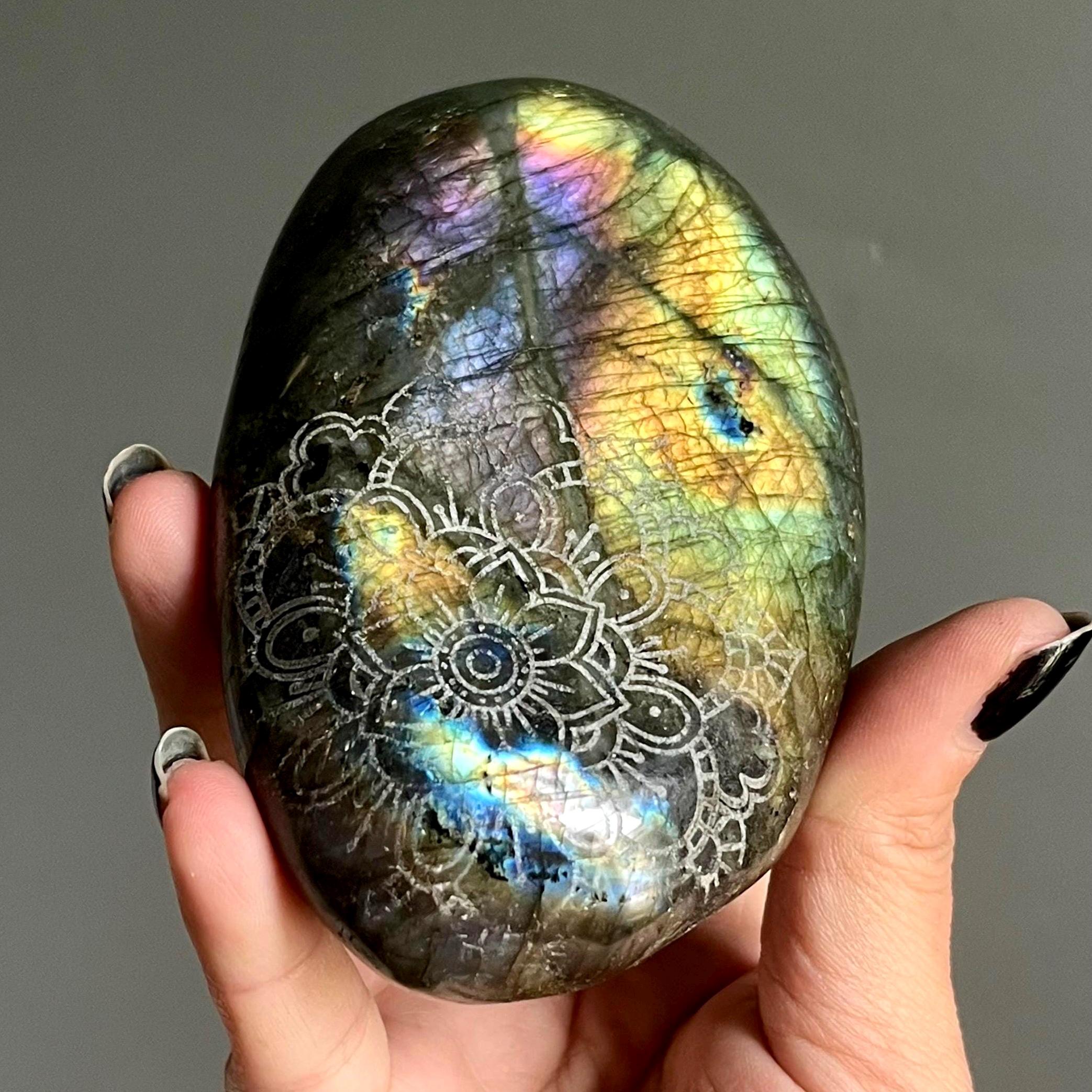 This crystal talisman alchemizes vibrational wisdom of the full spectrum of prismatic light with labradoriteβs mystical nature of transformation, moved through the lens the ancient archetype of the sacred mandala.