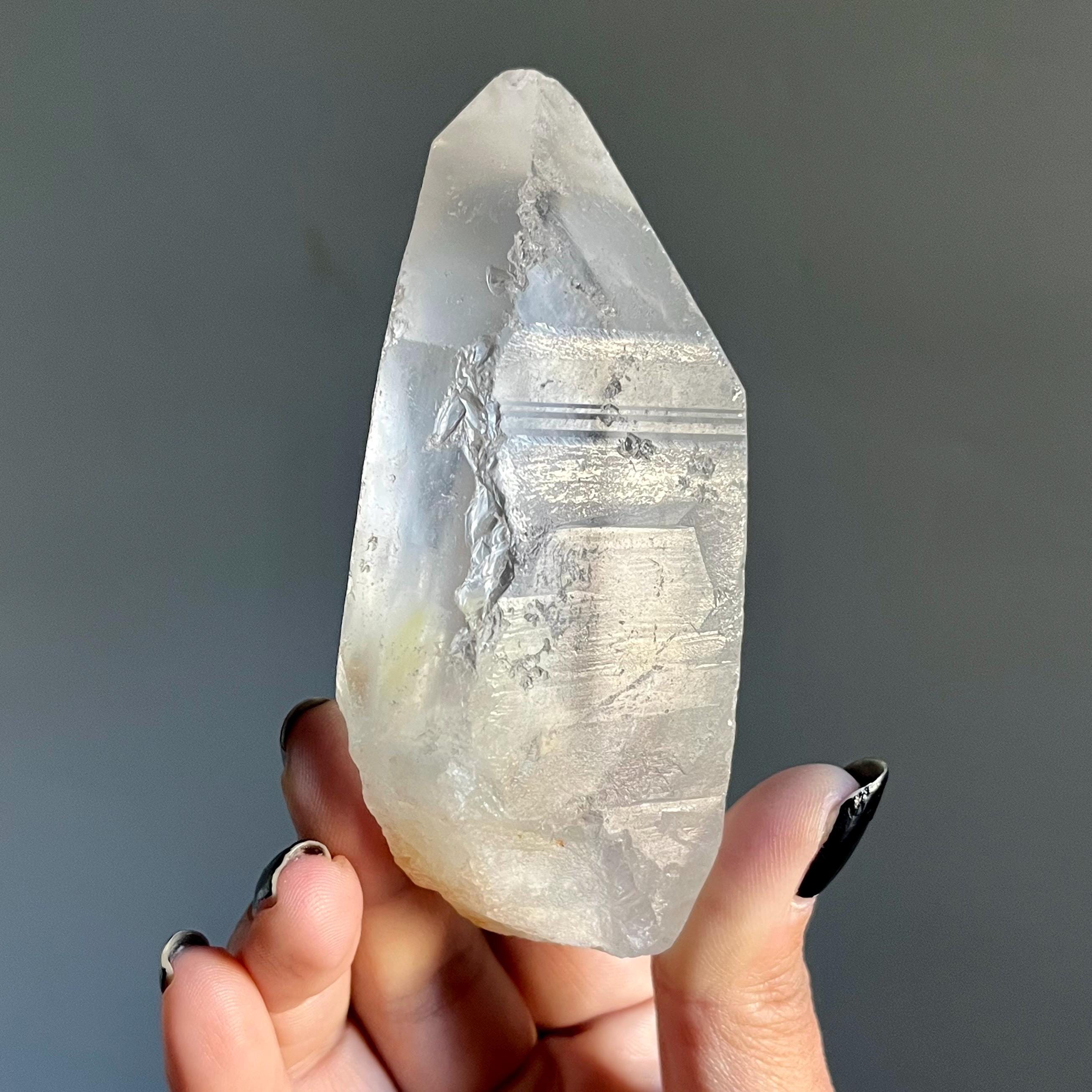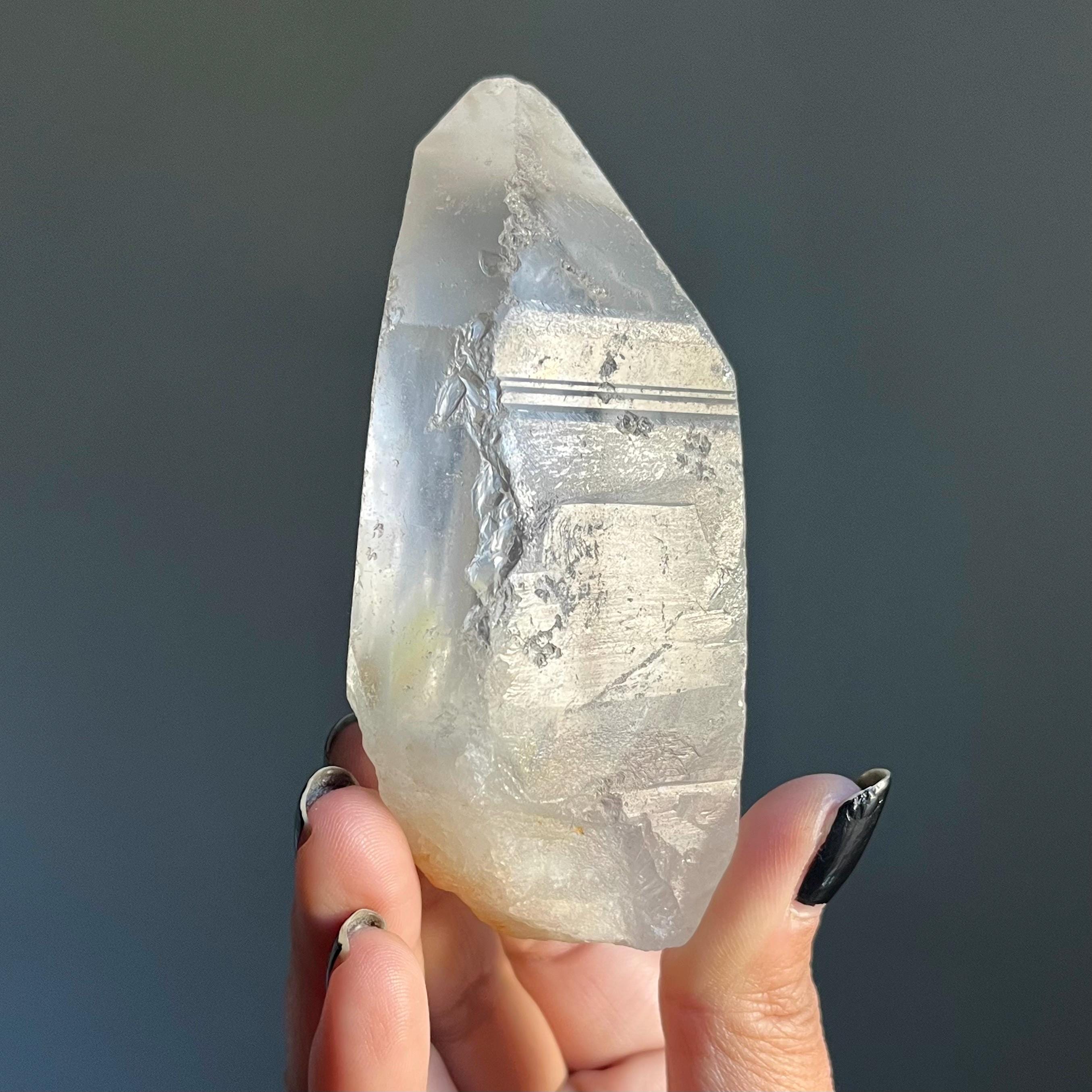 Lightning strike lemurian quartz manifests as an isis quartz crystal. Deep starbrary quartz star markings weave around sacred triangular record keeper etchings which present rarely on the body of this rare crystal point.