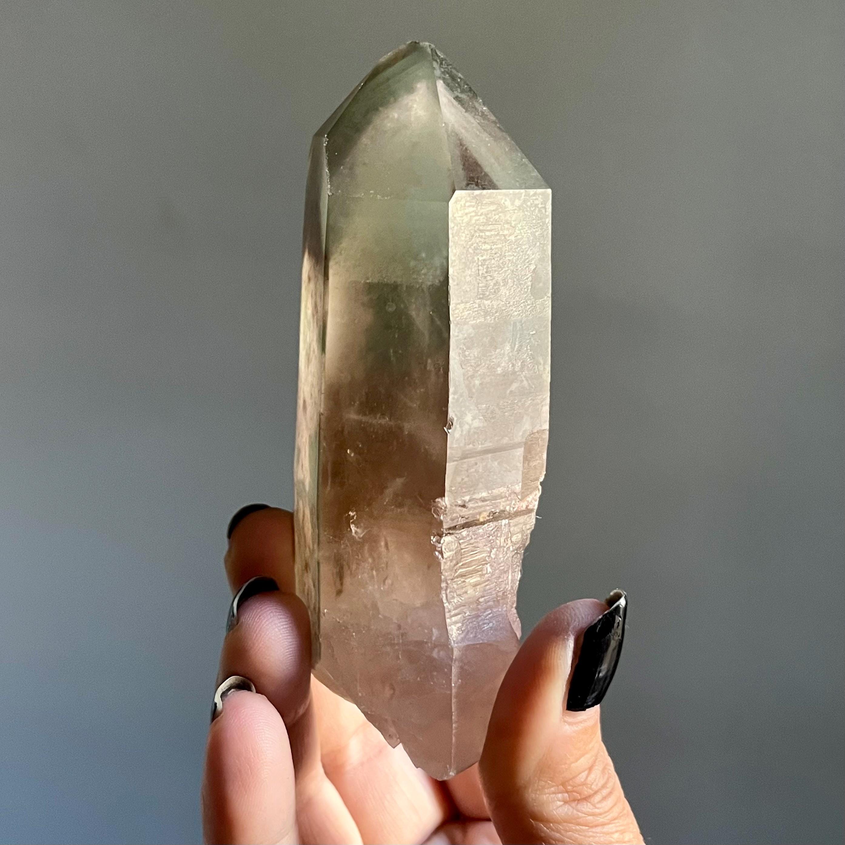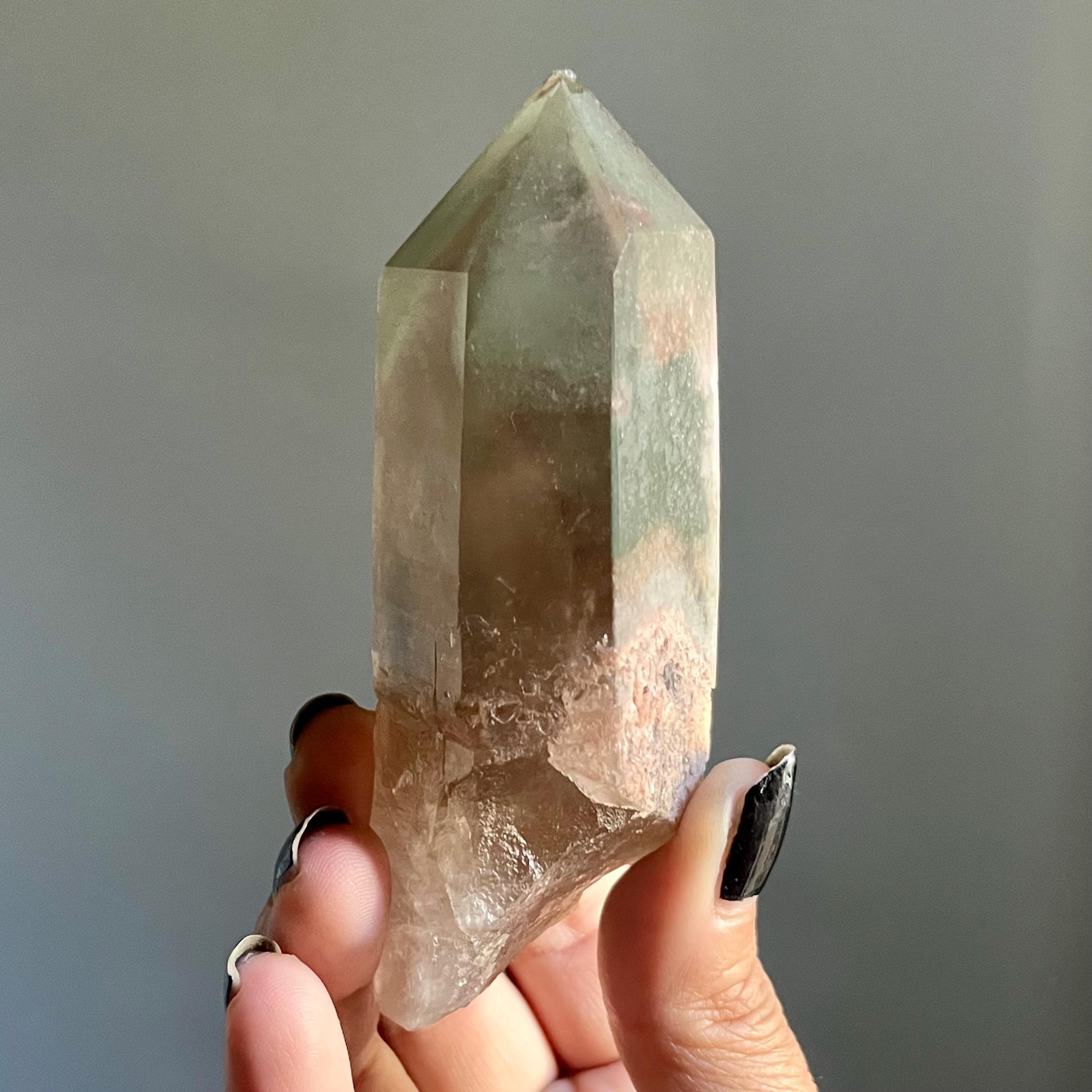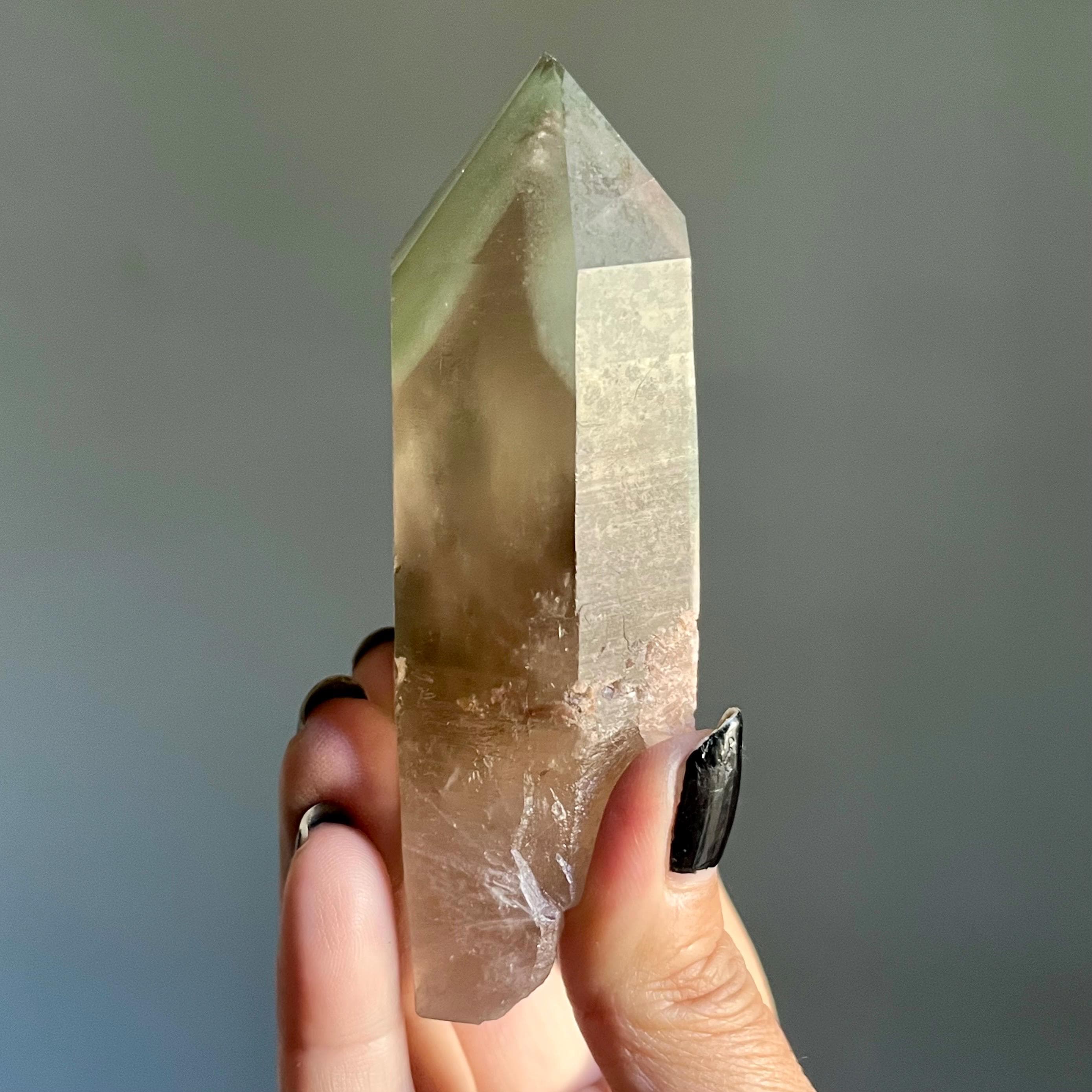 Green chlorite and bold pink lithium illuminate this rare, natural smoky citrine lemurian quartz crystal, the evolution of the piece told through genrayional layers of green and pink phantoms.