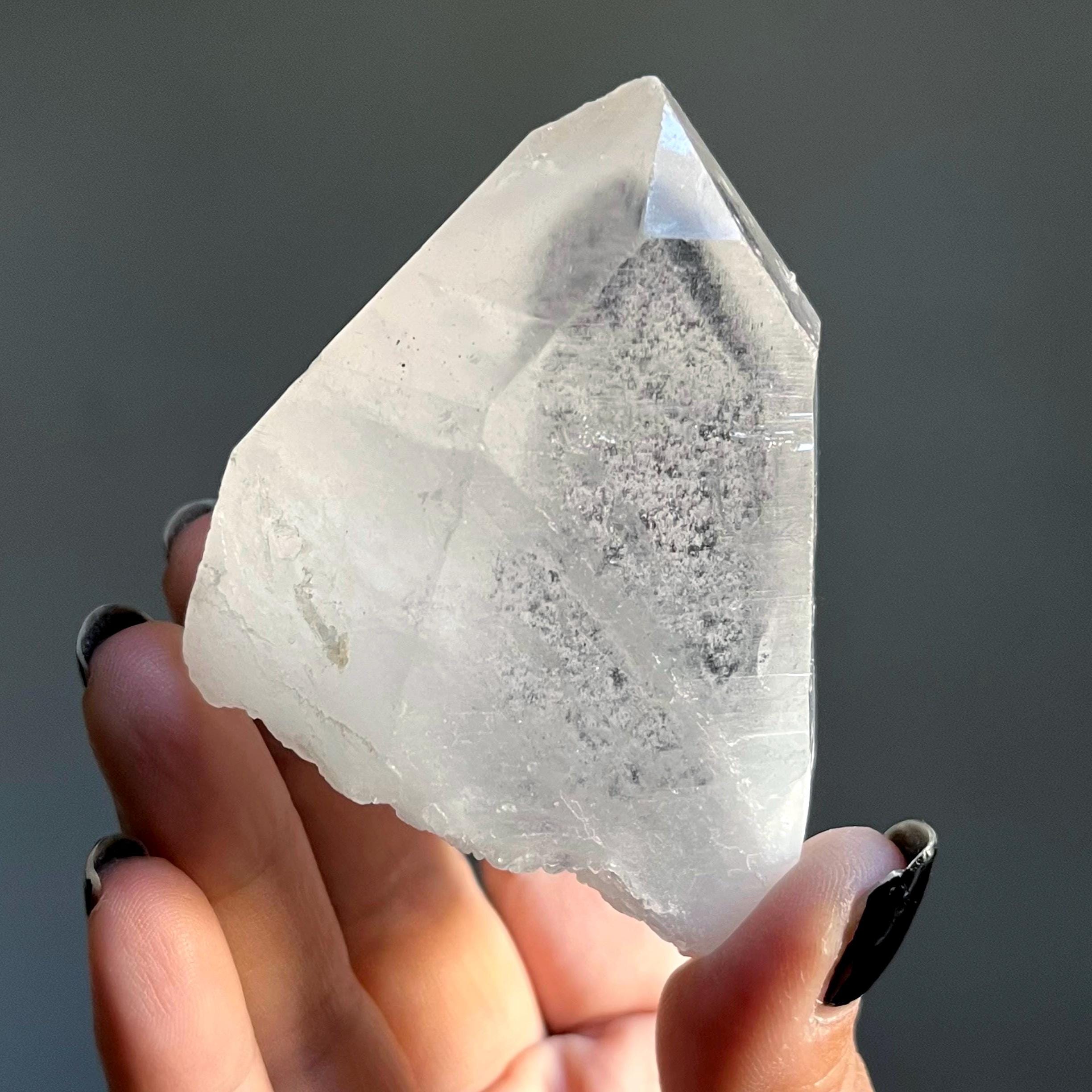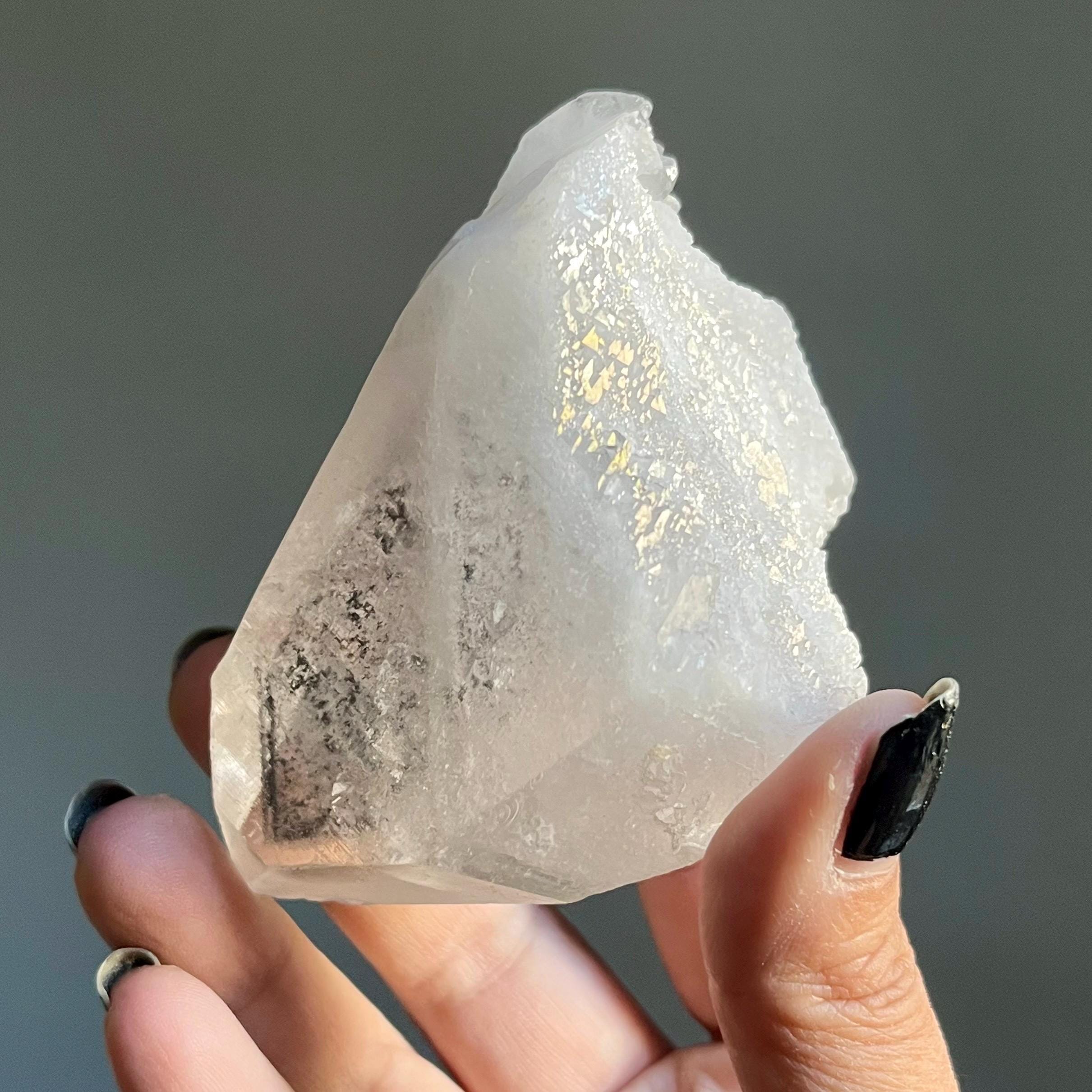 Silver heamtite foils weave throughout the phantom. When light and angle meet, they illuminate the termination in etheric blue hues.