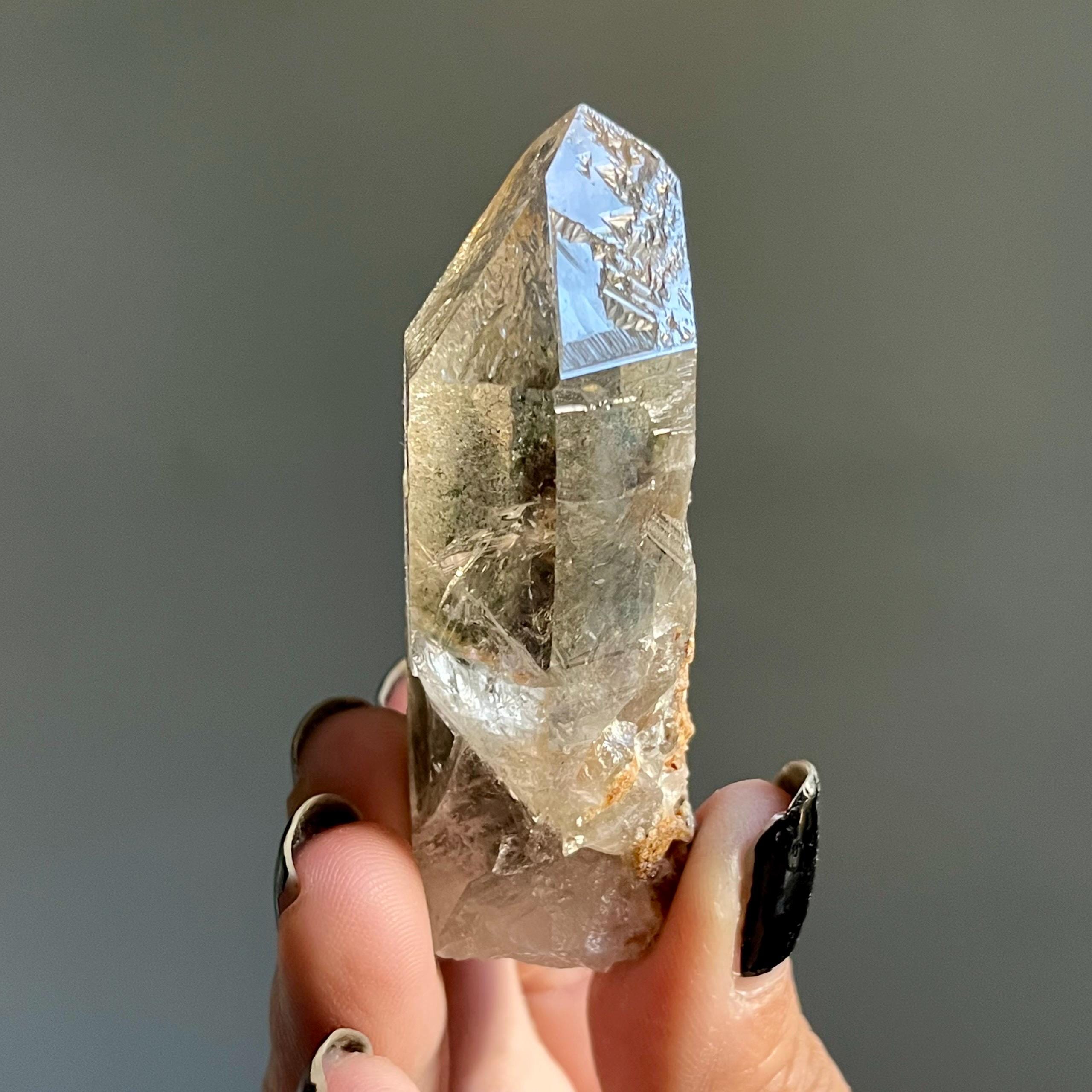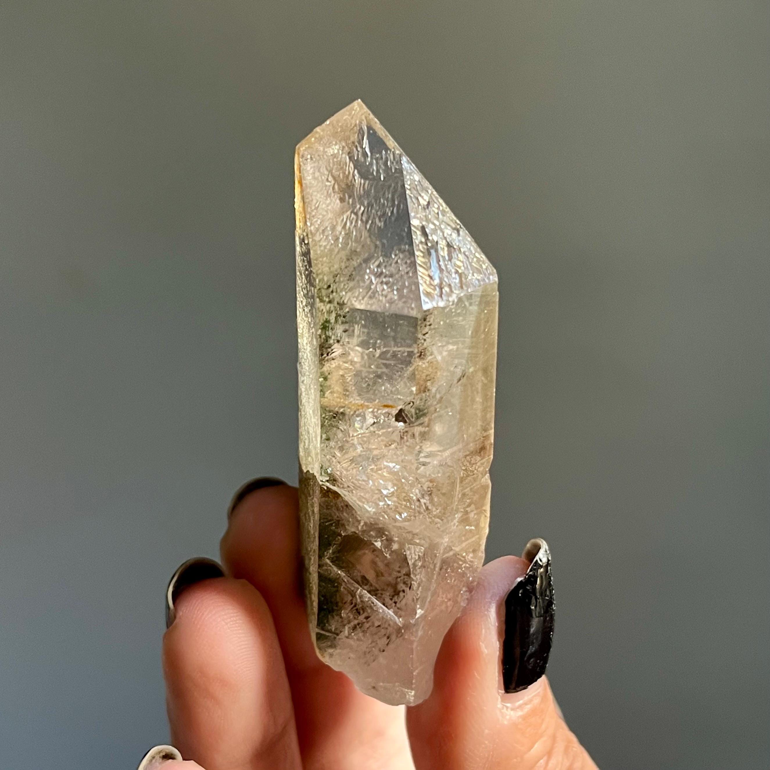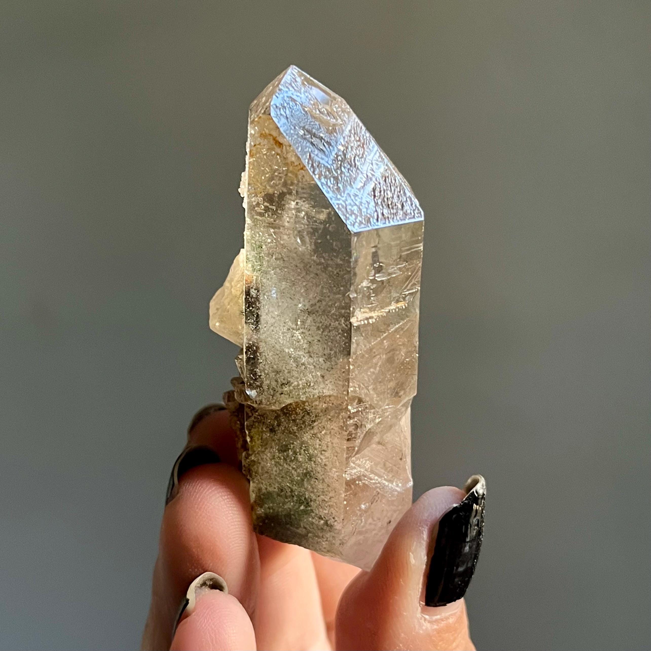 A master record keeper, this wild, natural citrine lemurian quartz crystal point manifests with a channeling quartz termination and shimmering green chlorite phantoms.