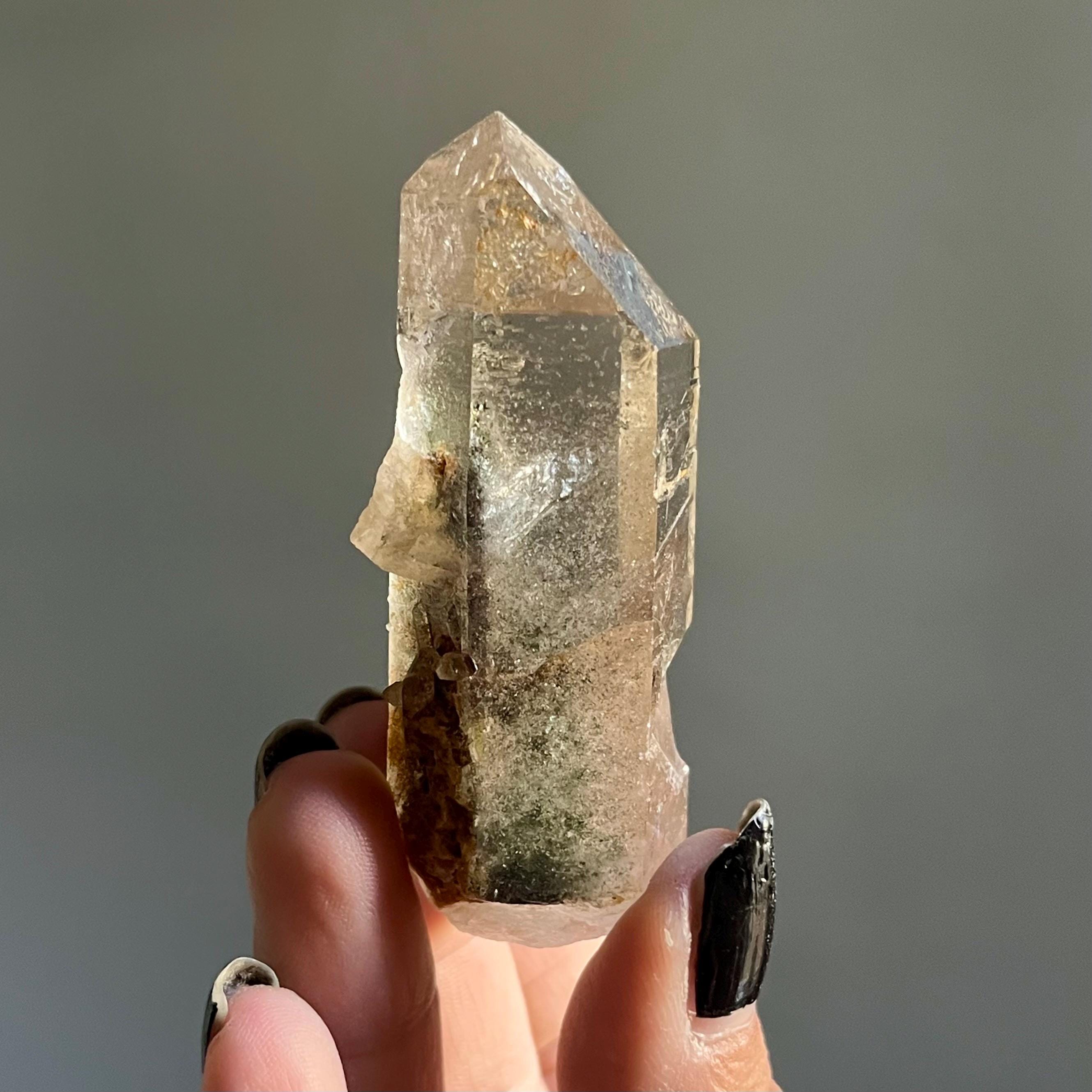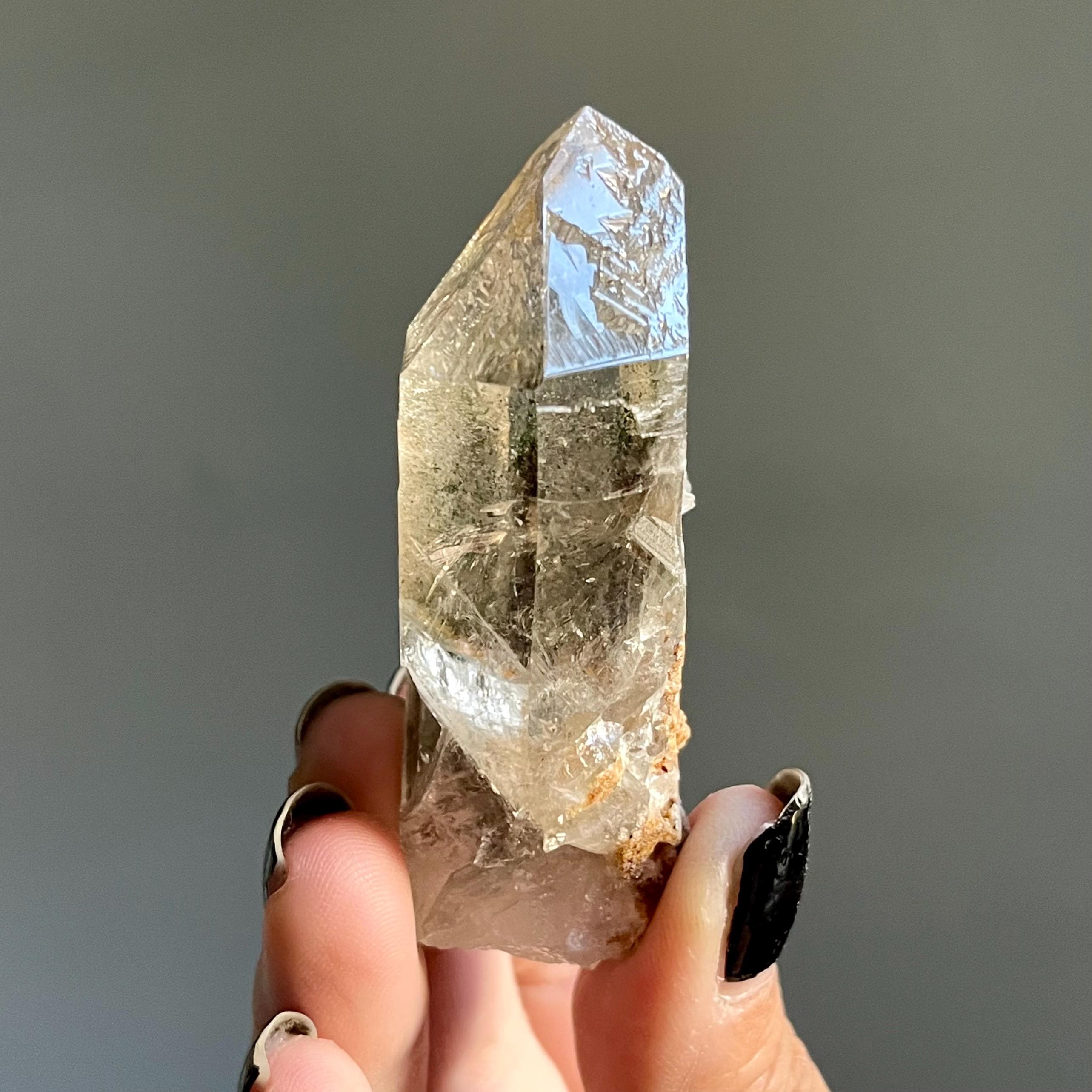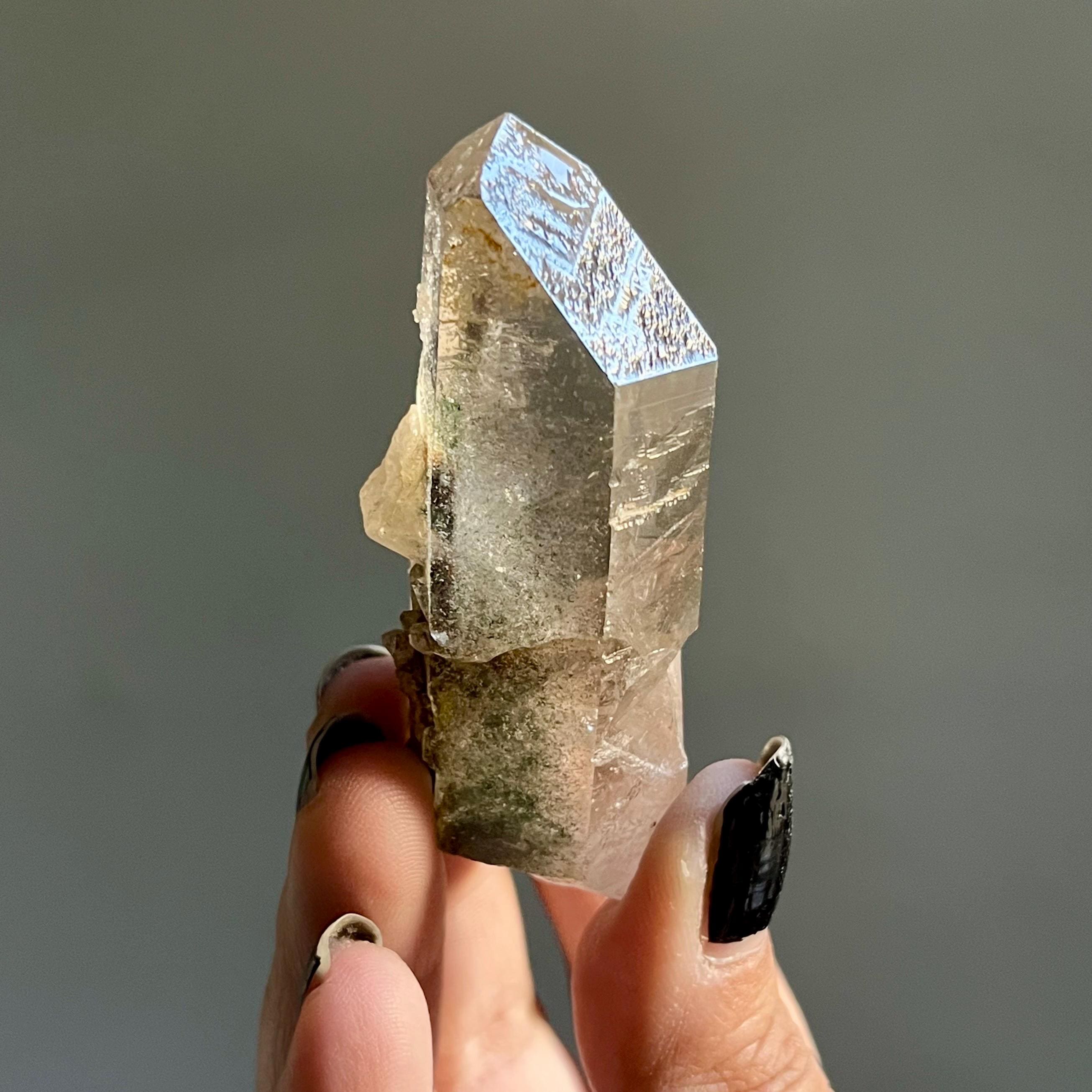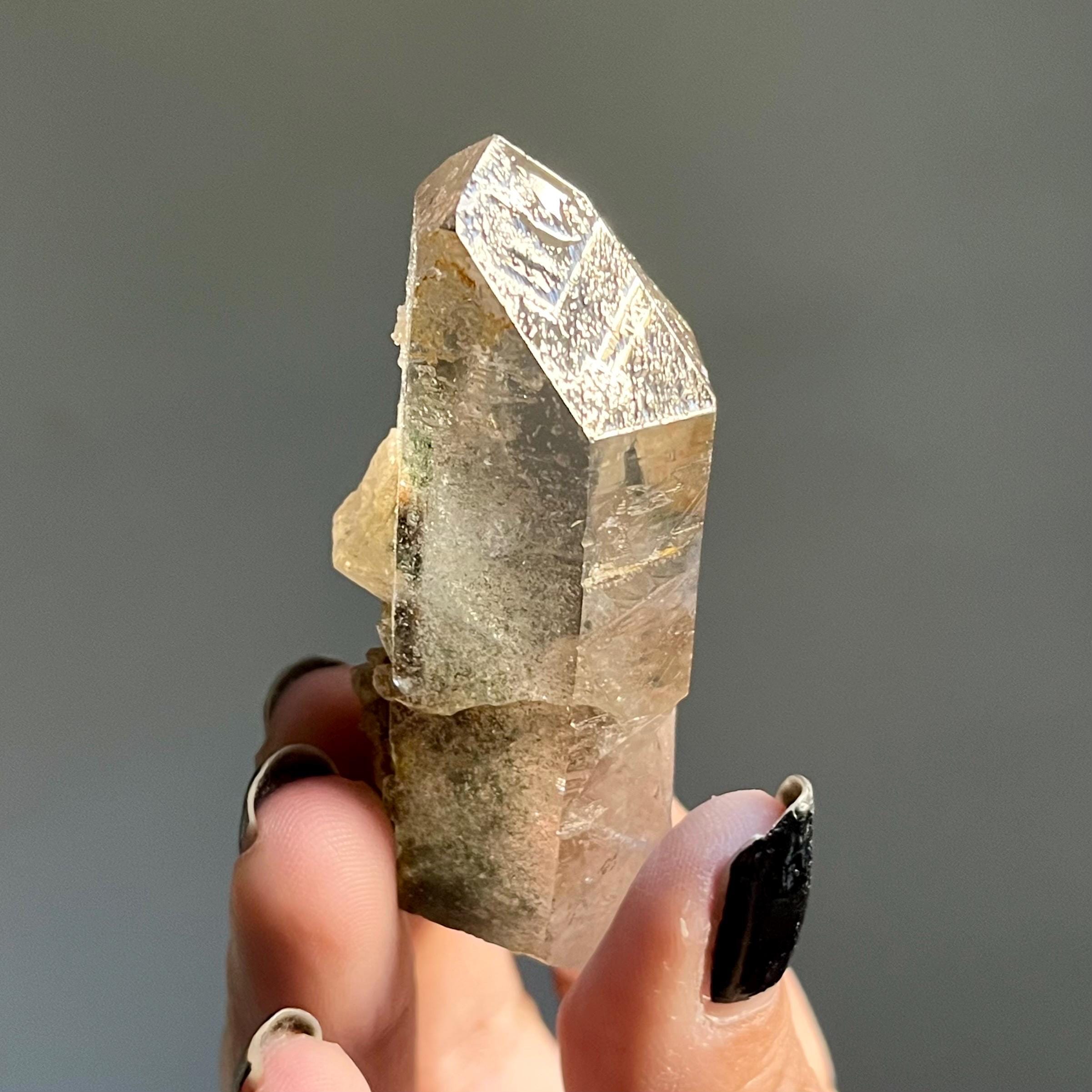 A master record keeper, this wild, natural citrine lemurian quartz crystal point manifests with a channeling quartz termination and shimmering green chlorite phantoms.
