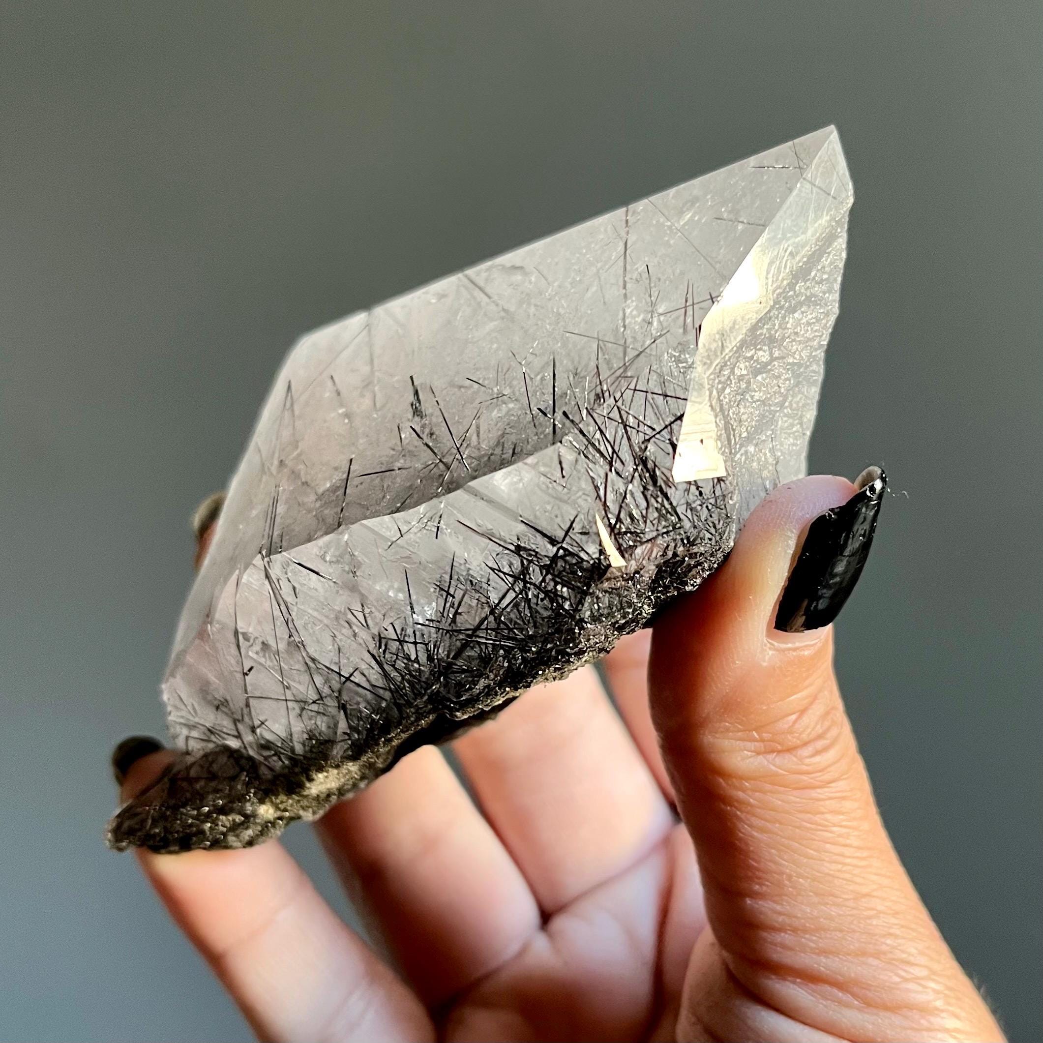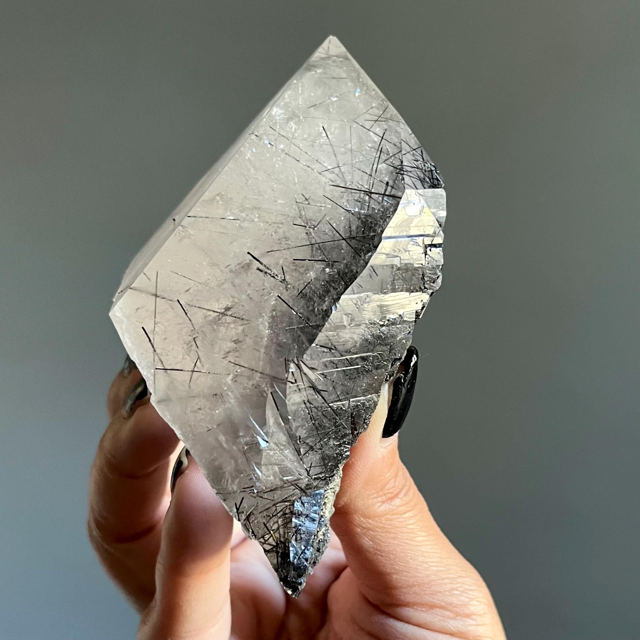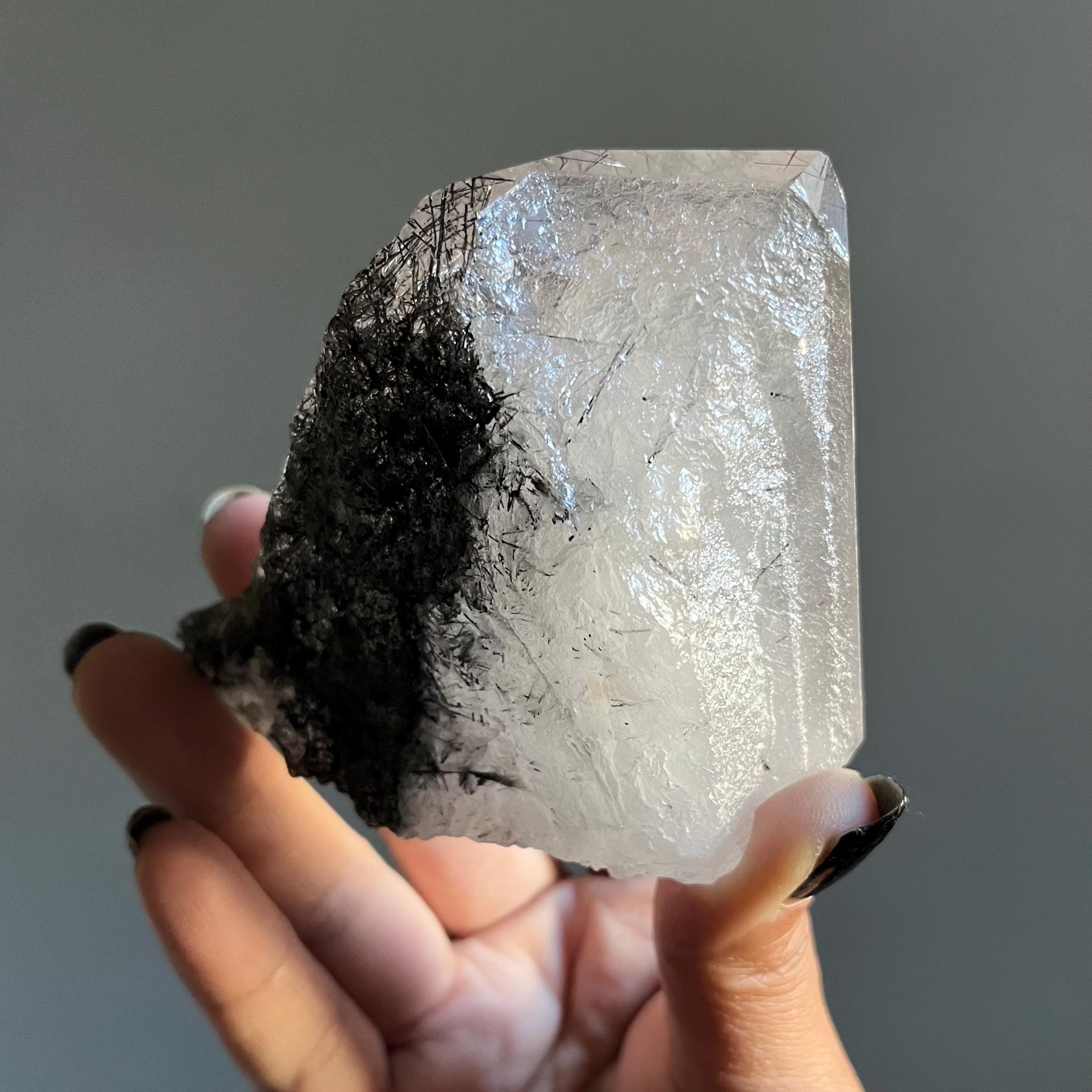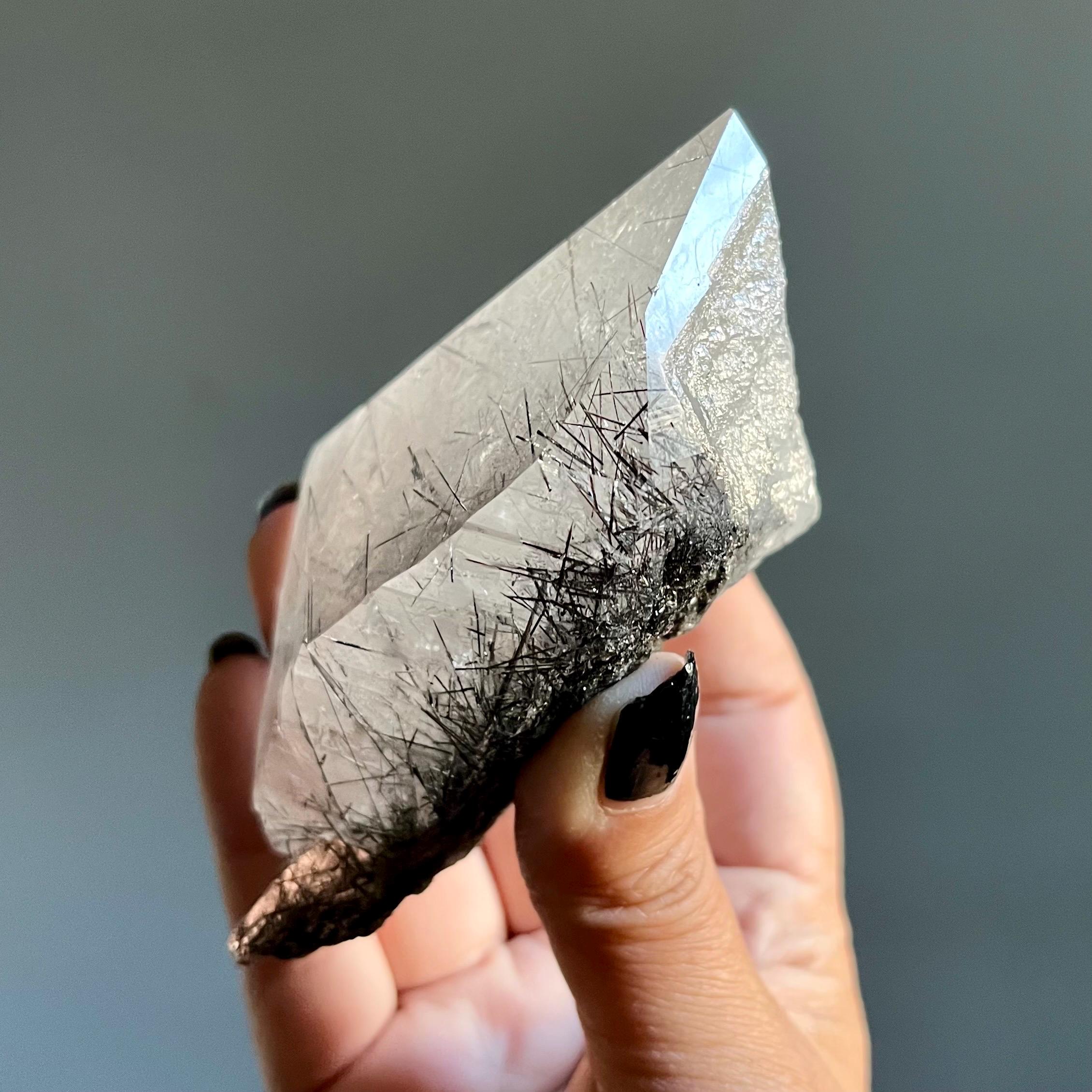 Wild and untouched, this extraordinary high grade black rutilated quartz crystal manifests in the spaces where black tourmaline and diamantina lemurian quartz meet.