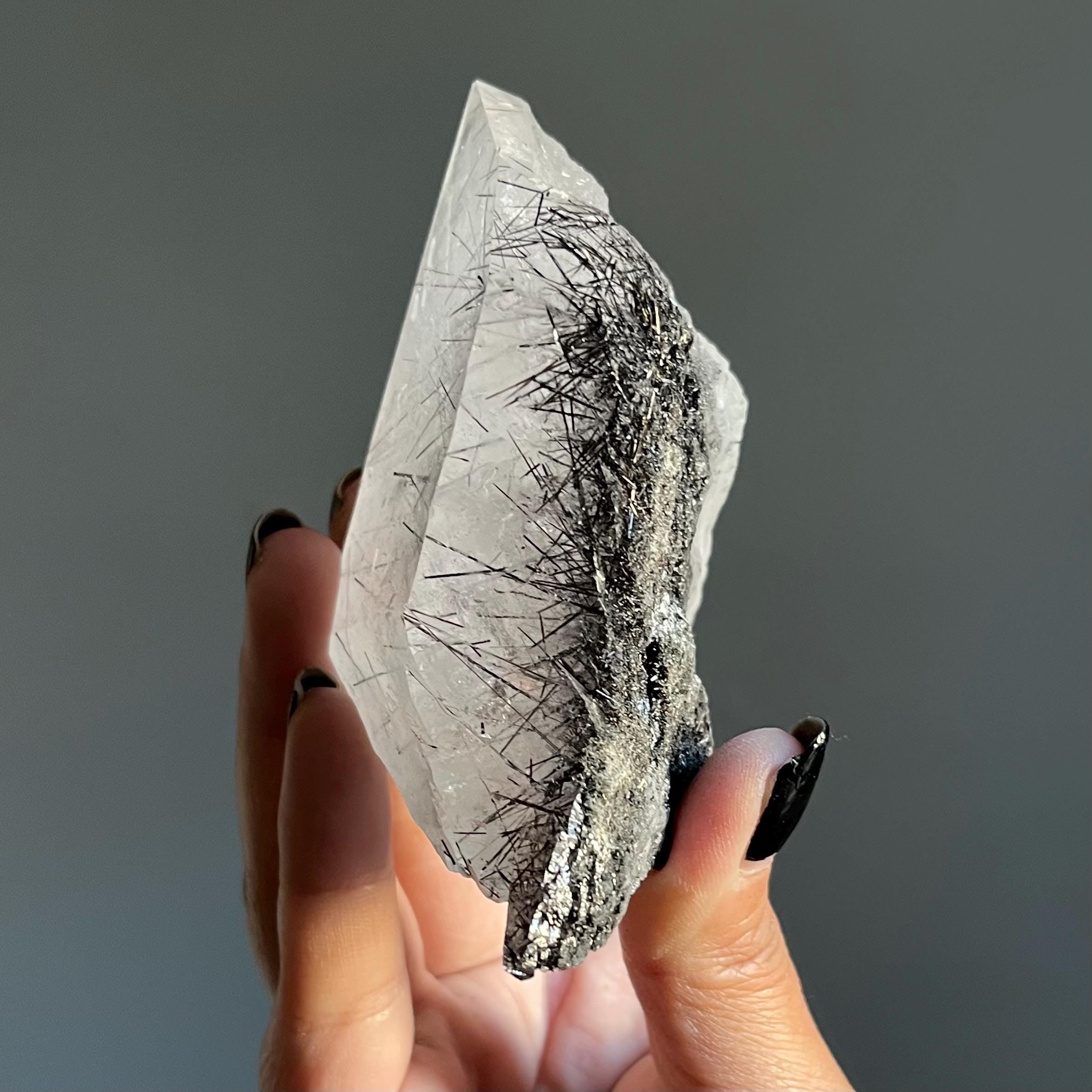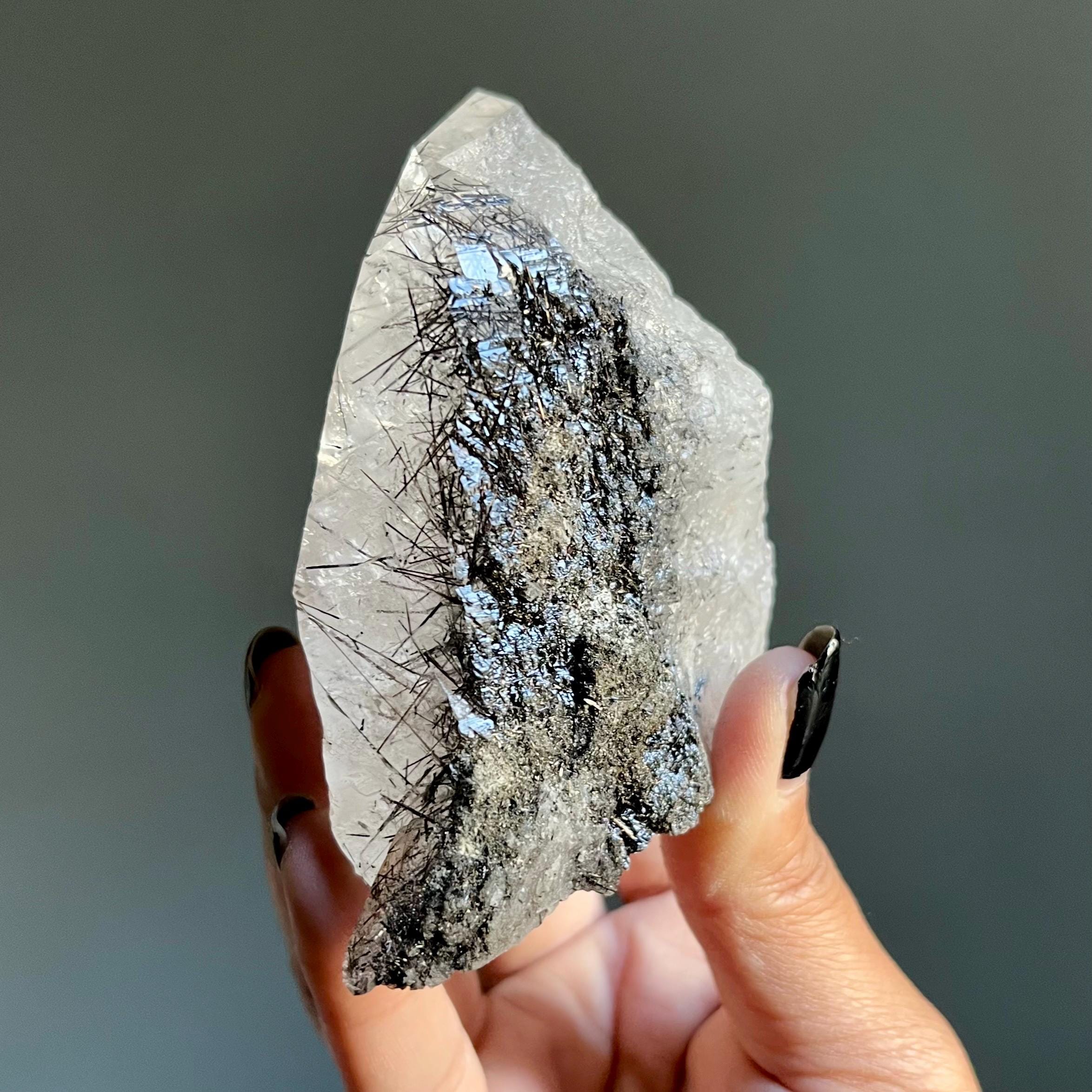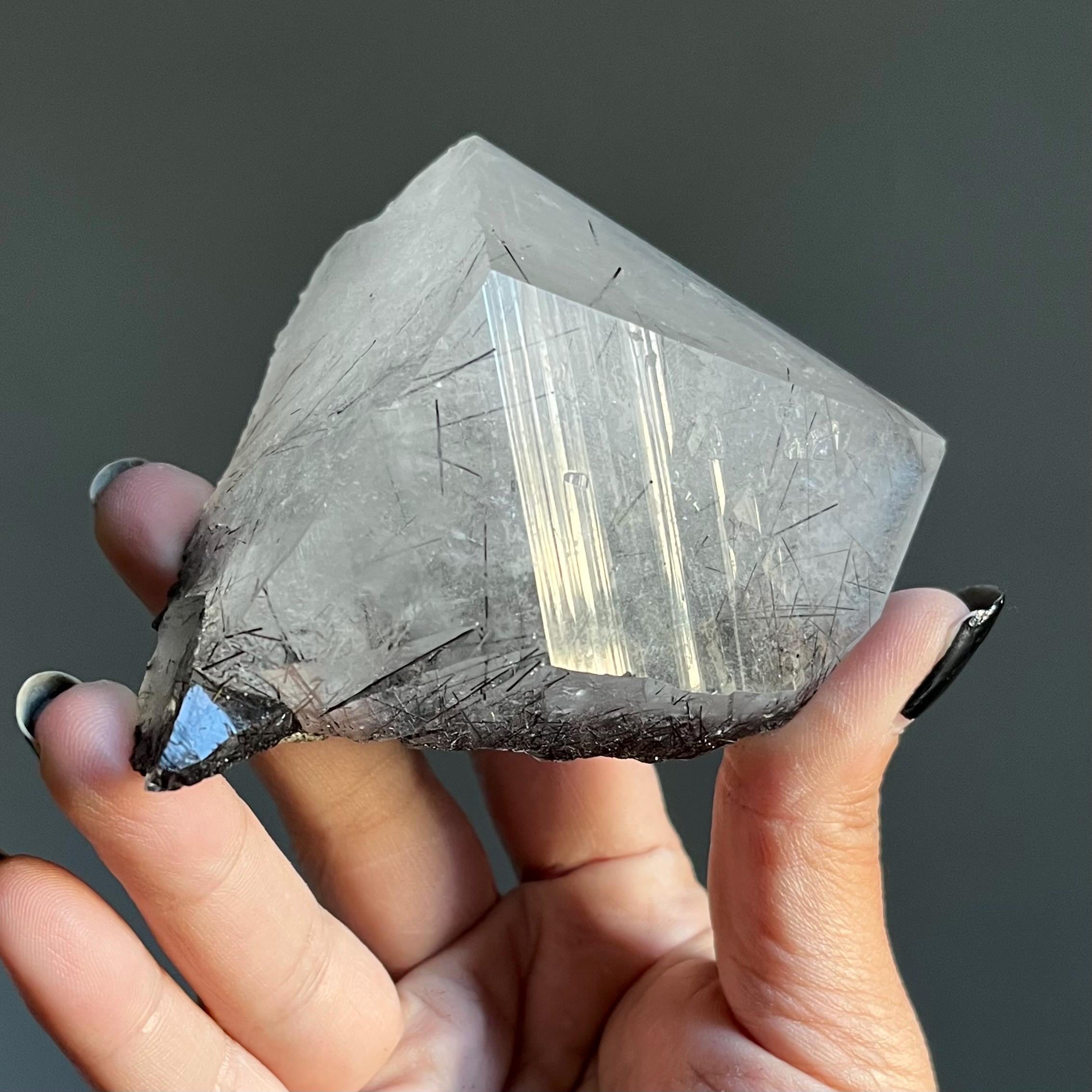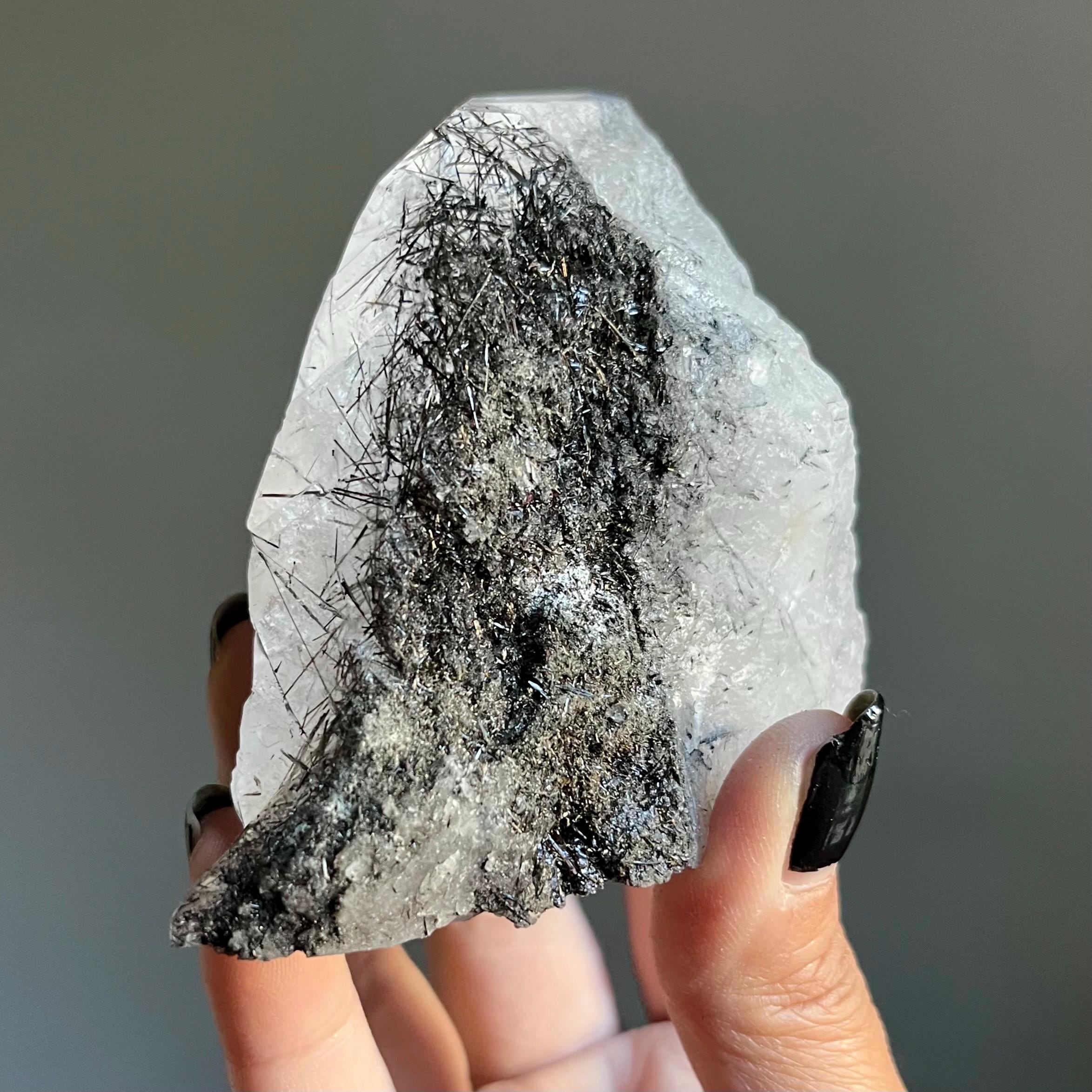 Wild and untouched, this extraordinary high grade black rutilated quartz crystal manifests in the spaces where black tourmaline and diamantina lemurian quartz meet.