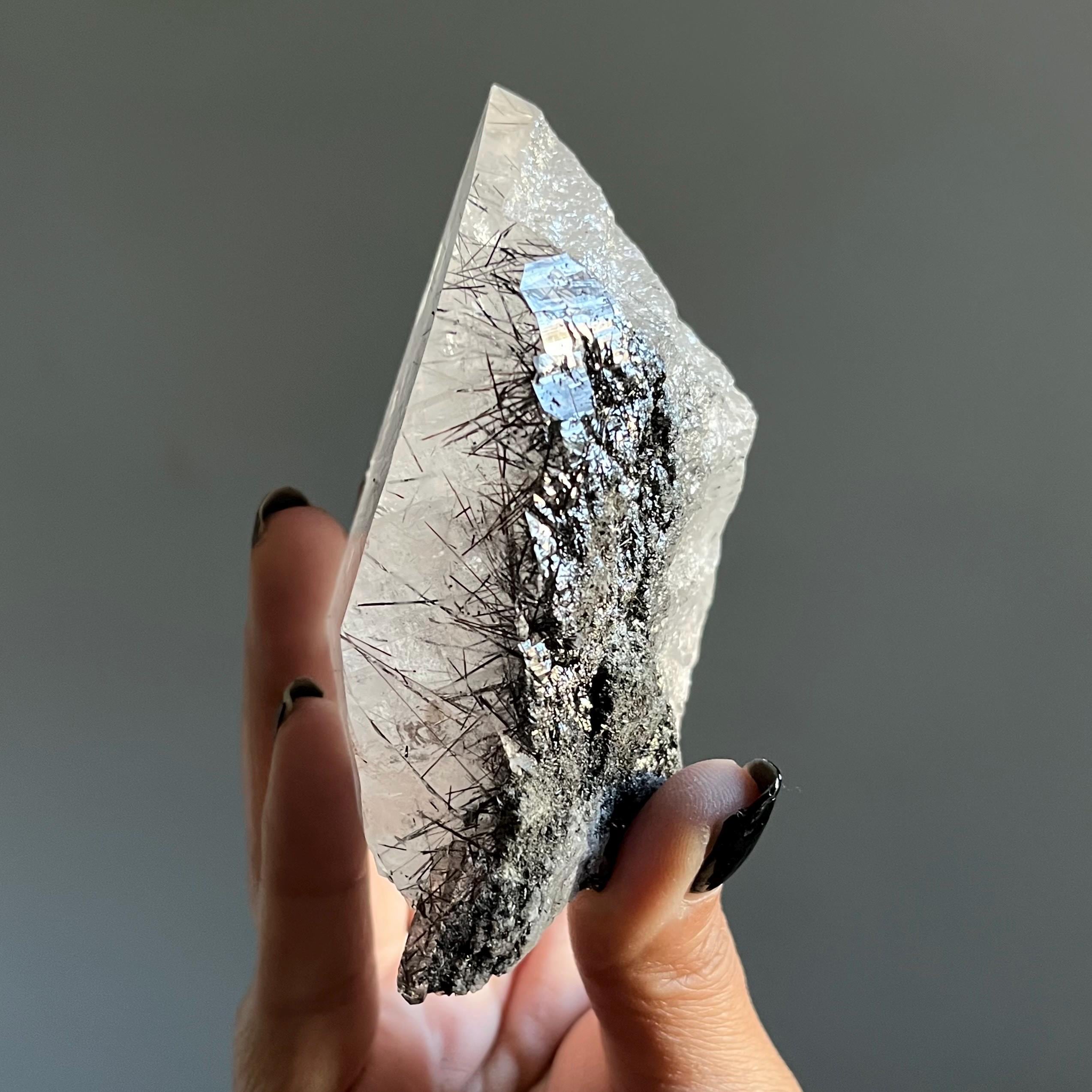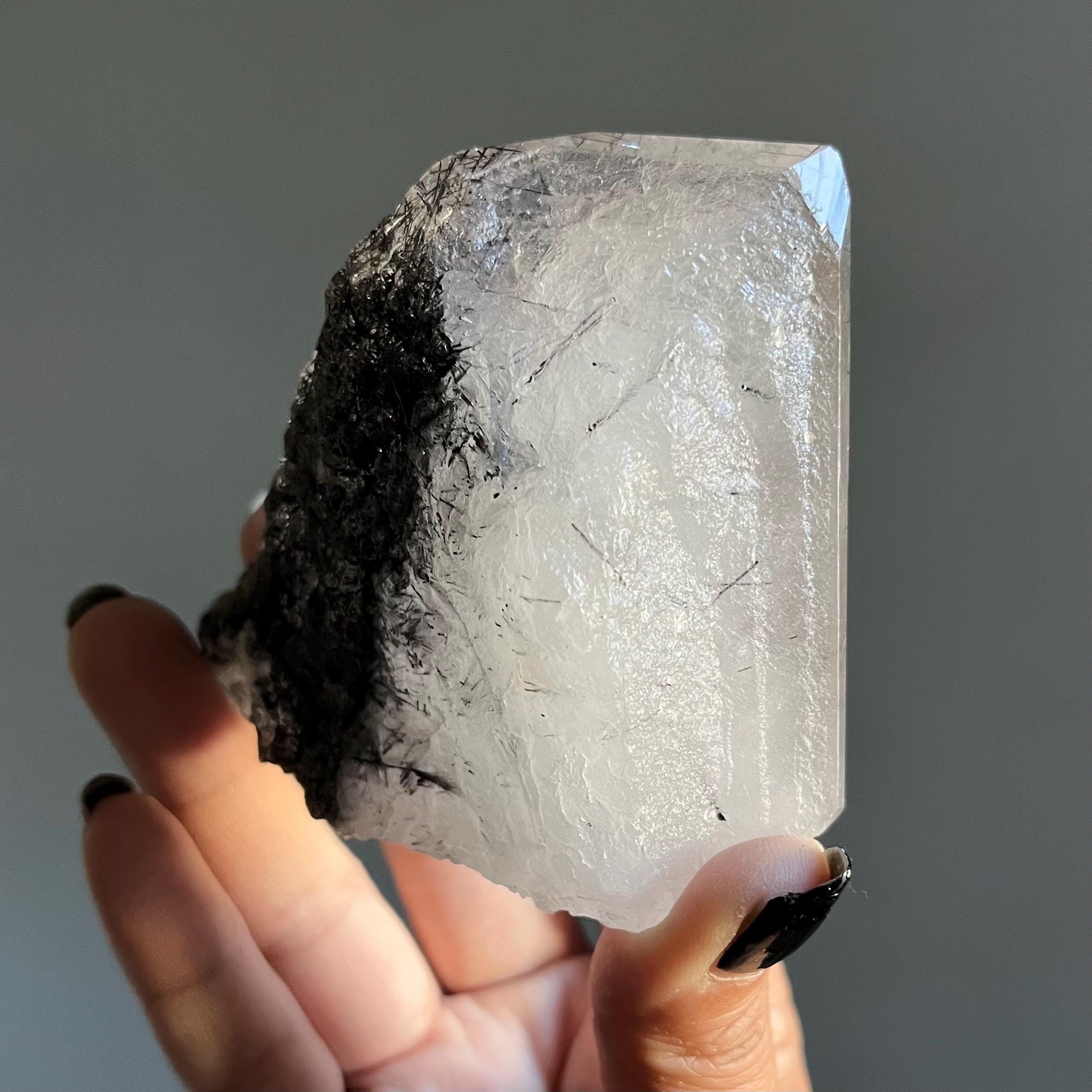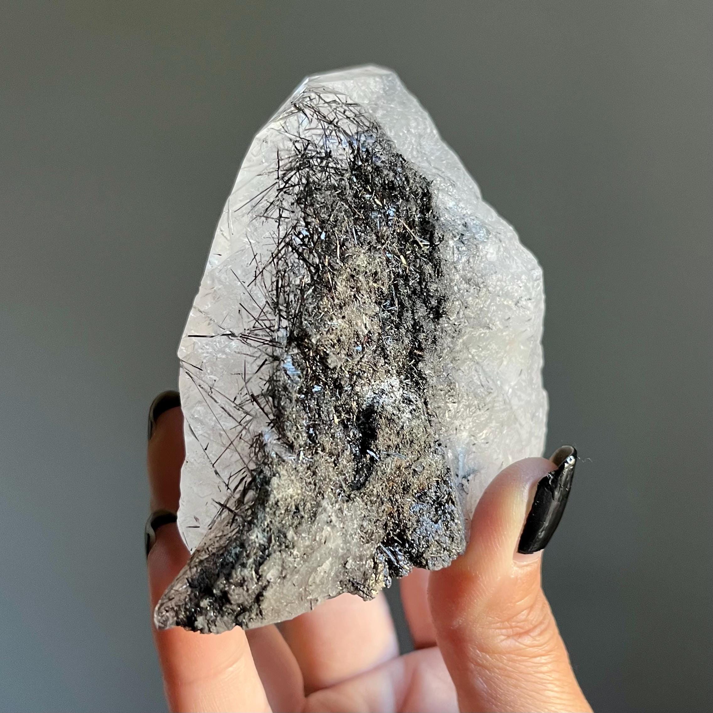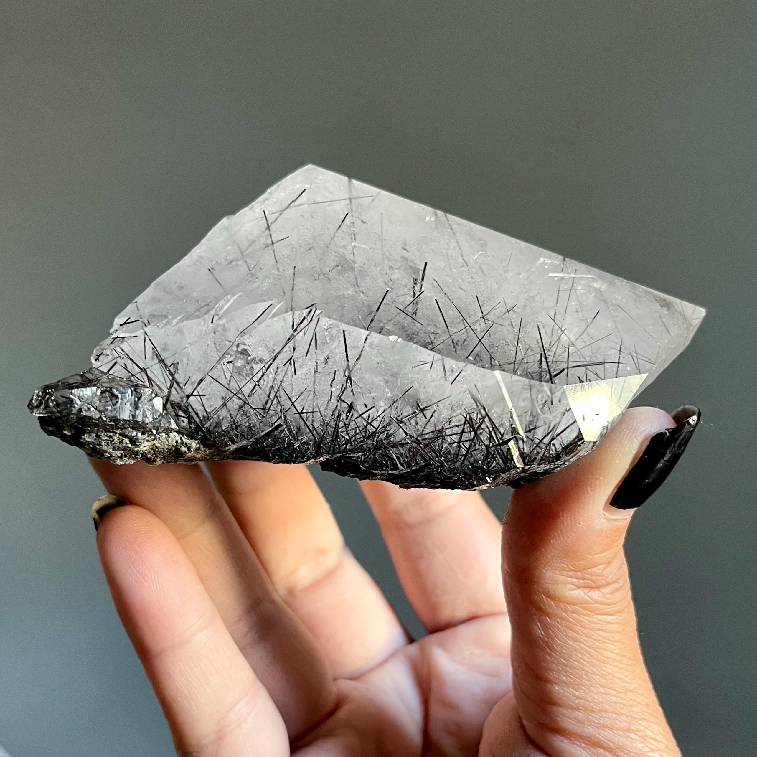 Wild and untouched, this extraordinary high grade black rutilated quartz crystal manifests in the spaces where black tourmaline and diamantina lemurian quartz meet.