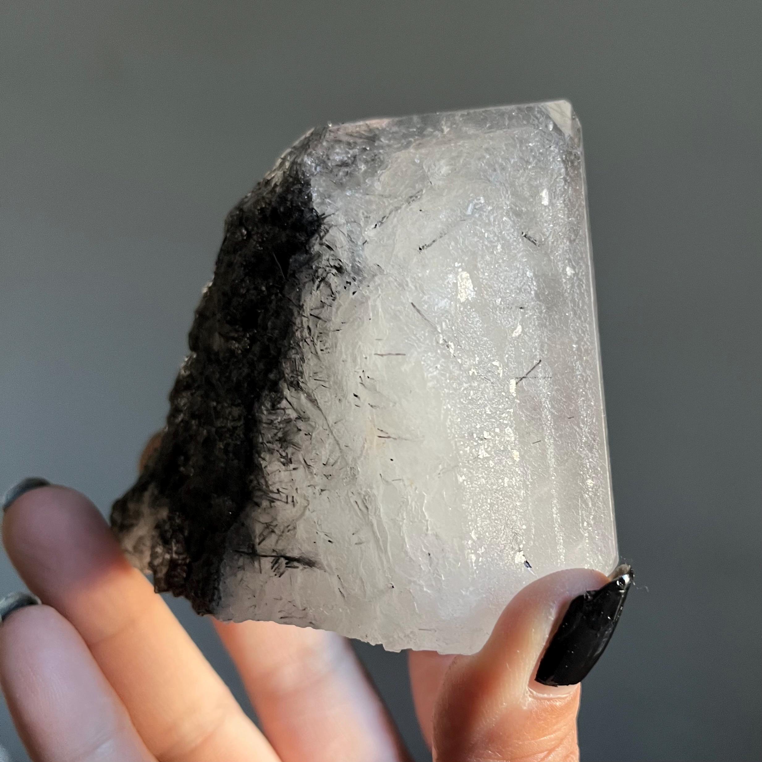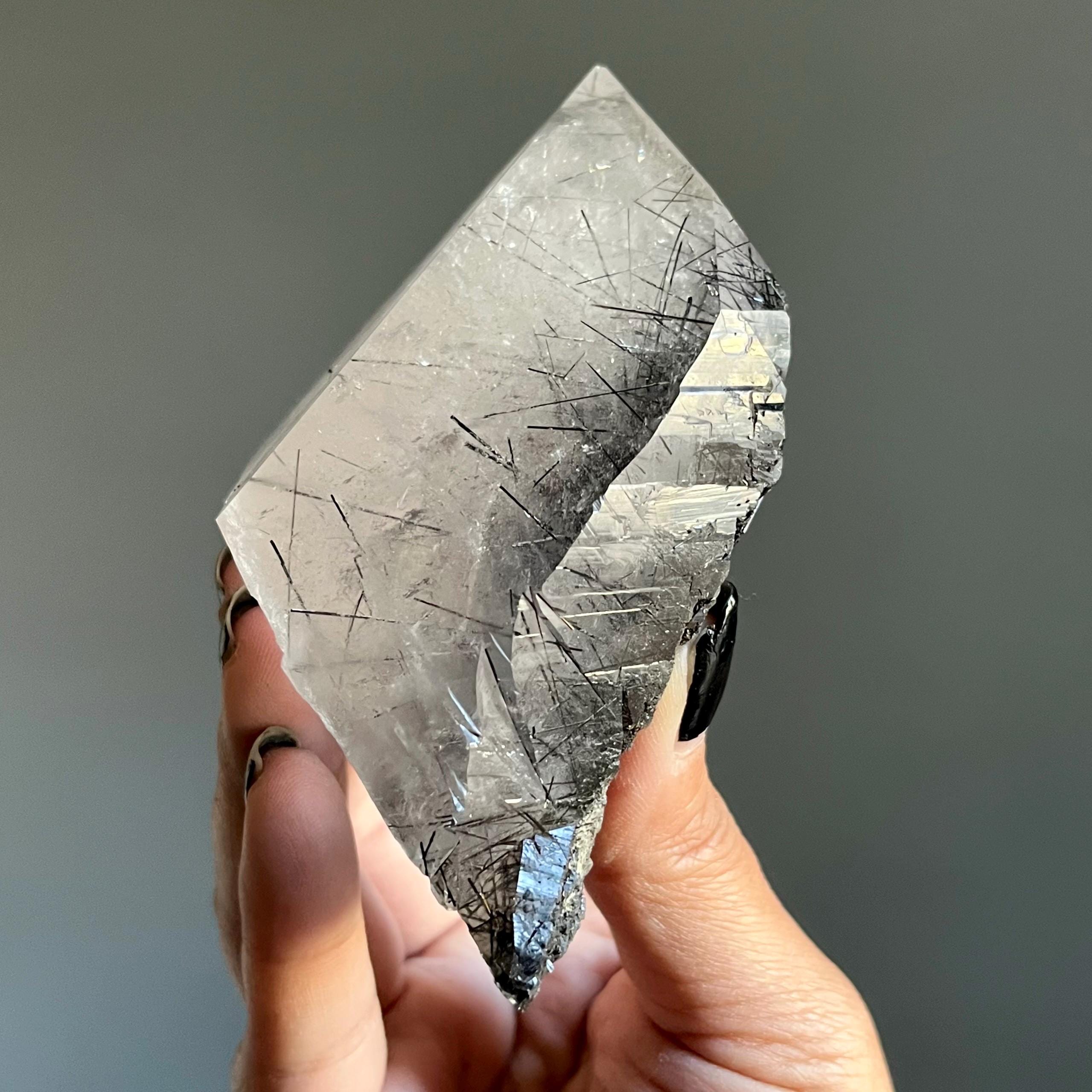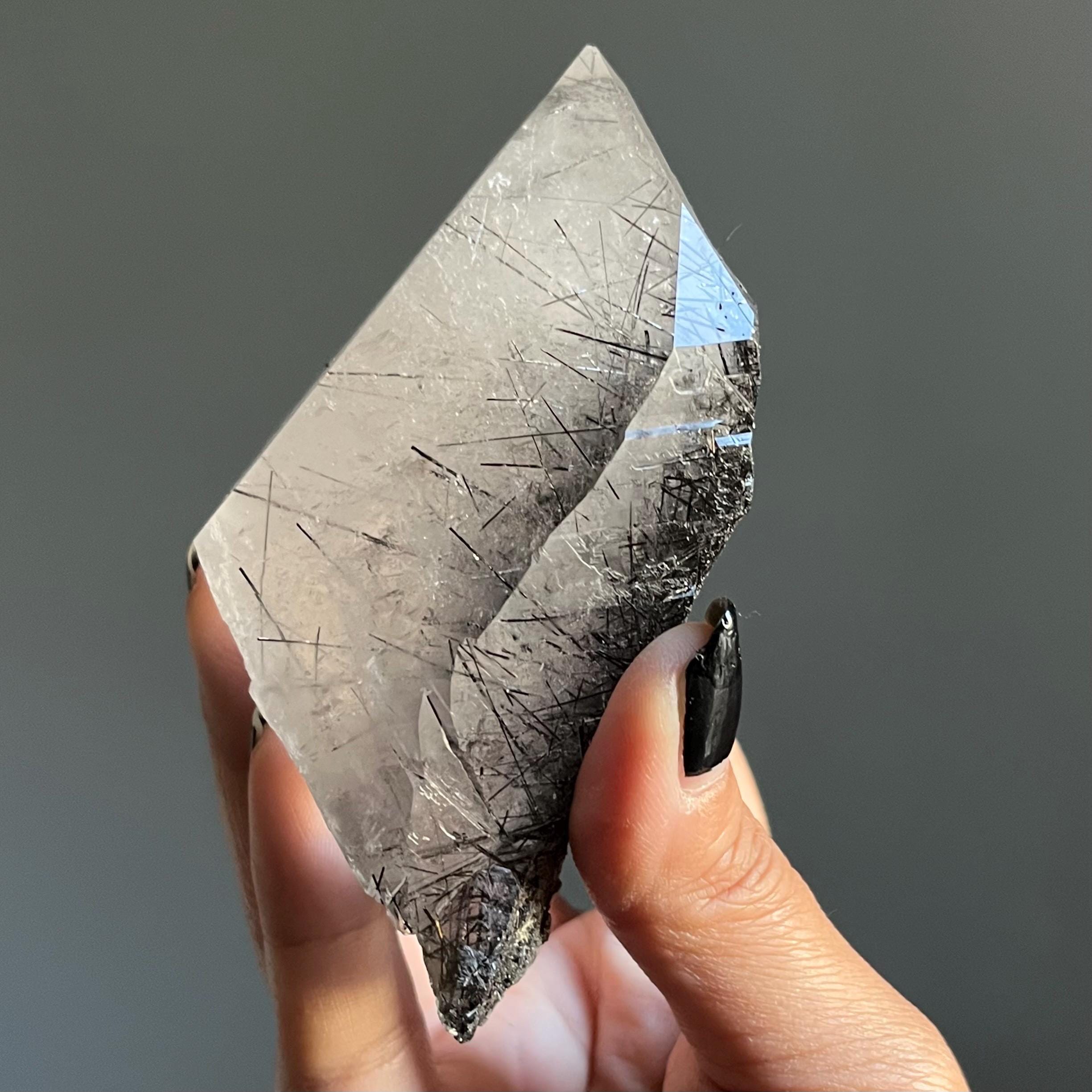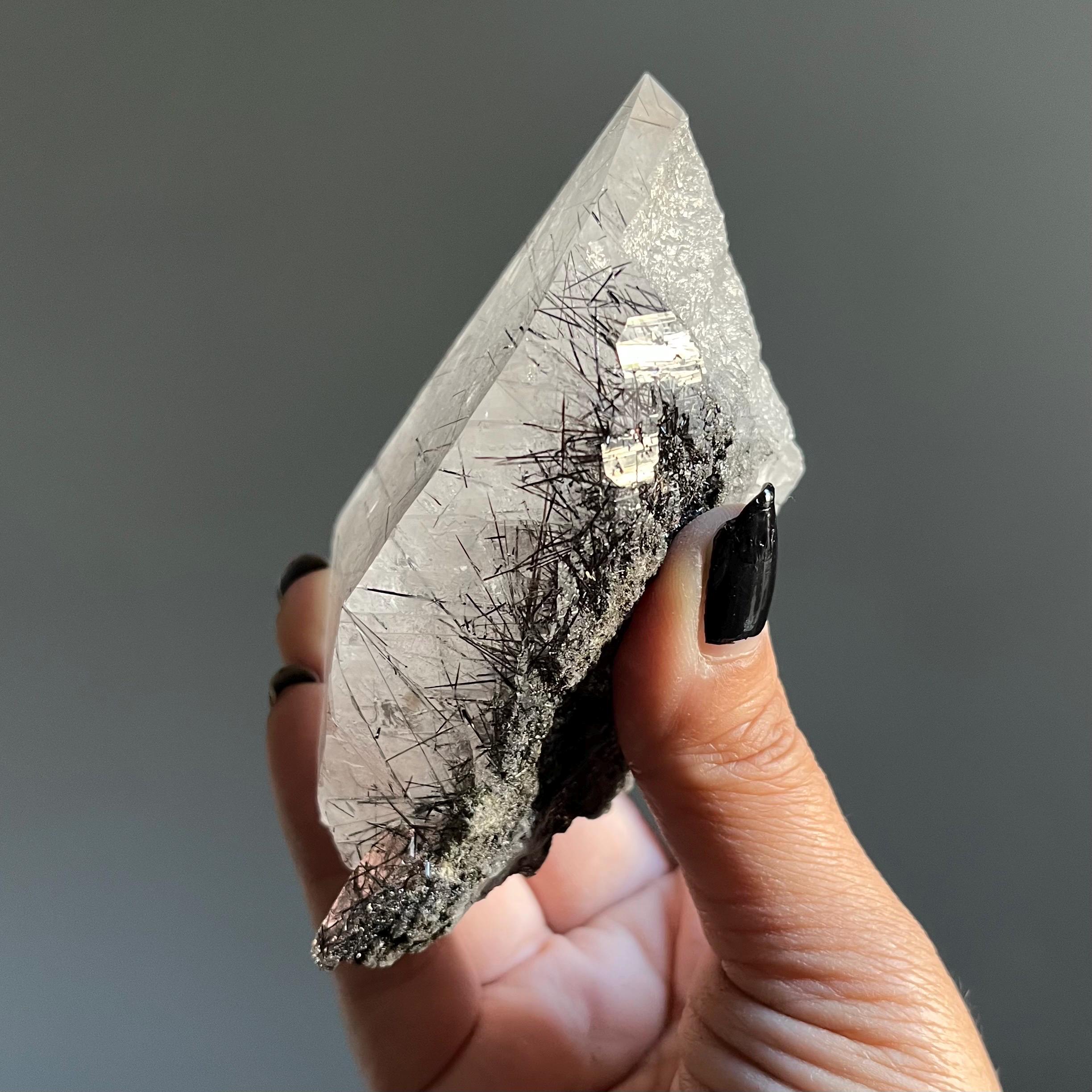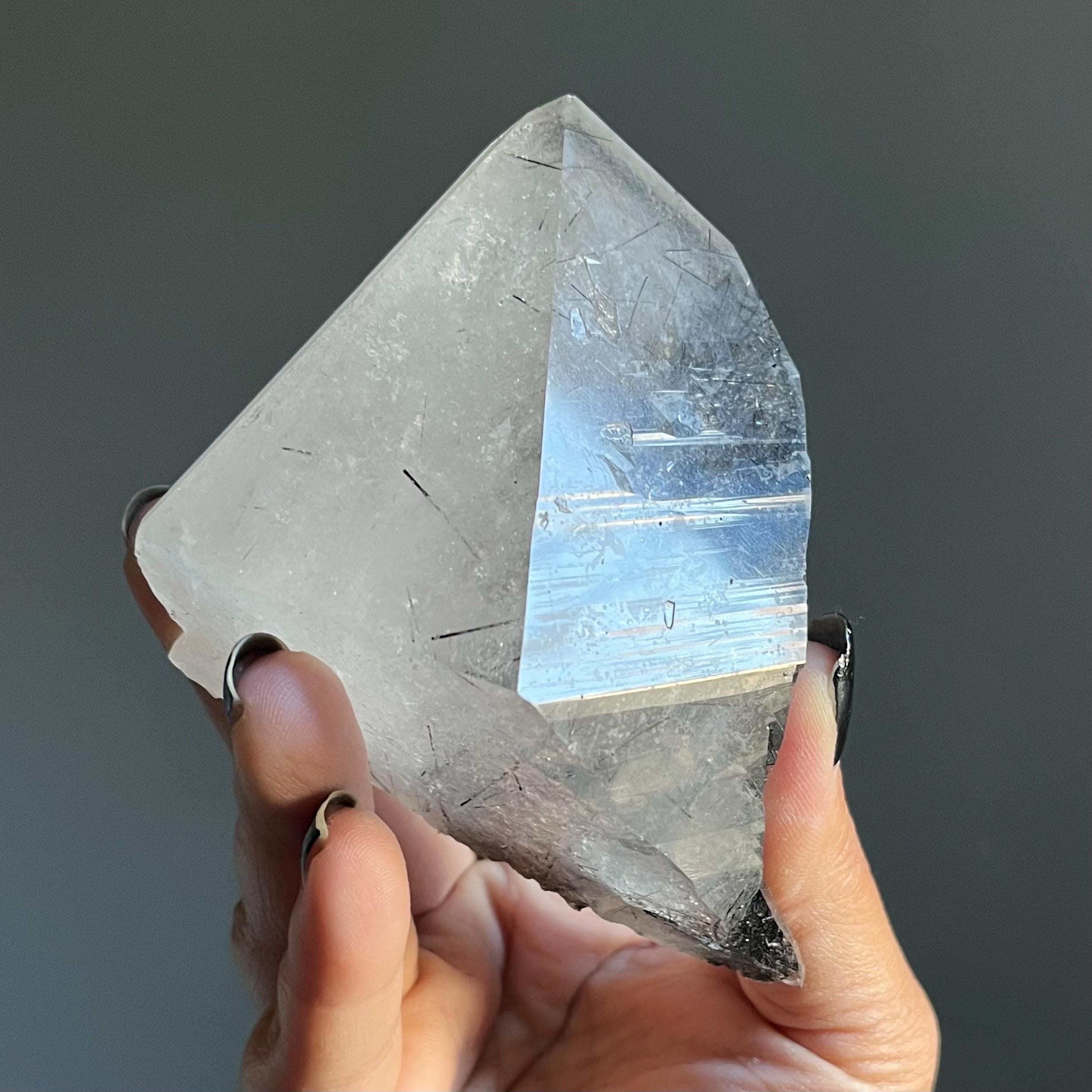 The echo of black tourmaline casts silhouettes through this lemurian, the inclusions shimmering like stars against a new moonβs night sky.
