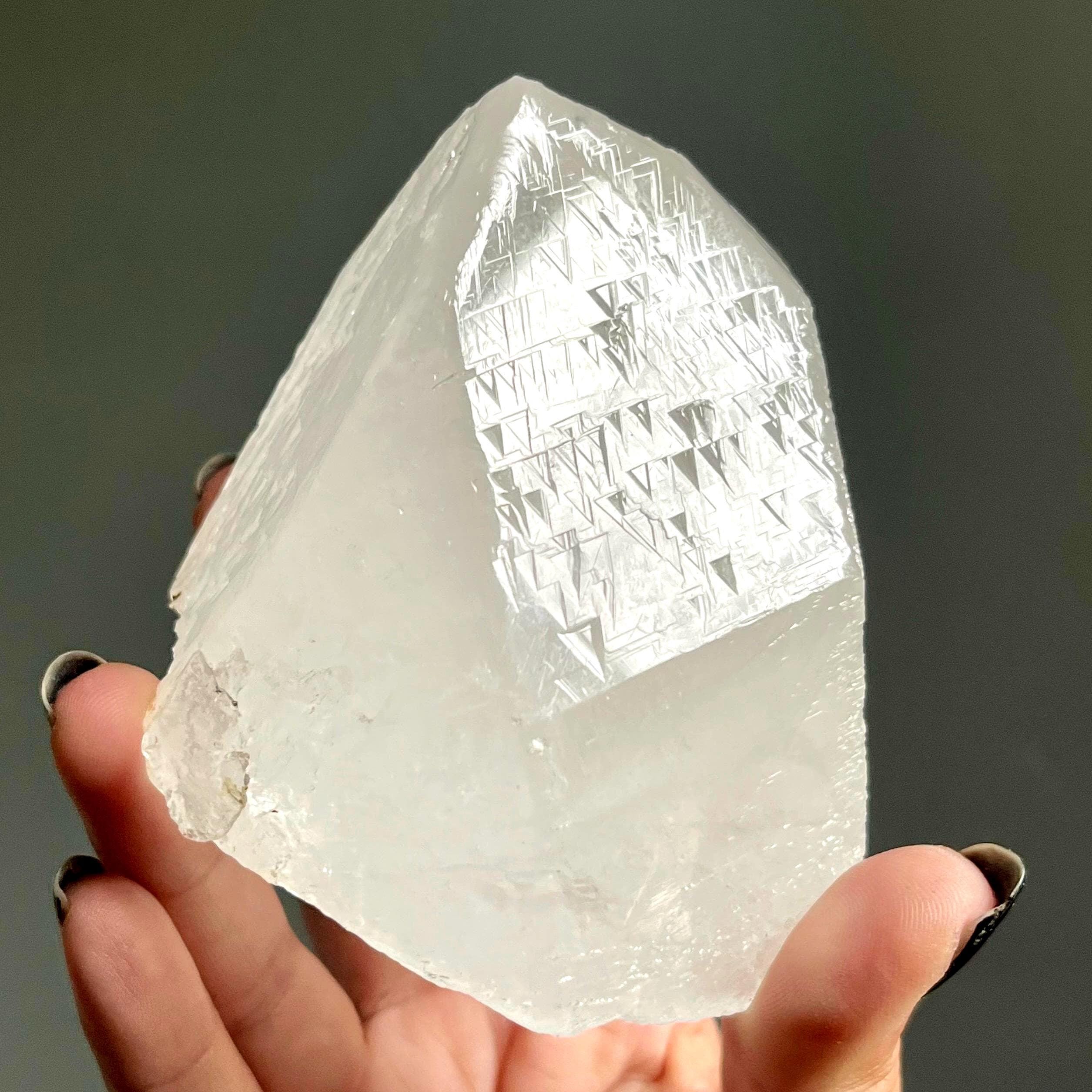 A master record keeper, this exquisite, large crystal point is absolutely saturated in layers of both raised triangular and rare trigonic quartz markings.