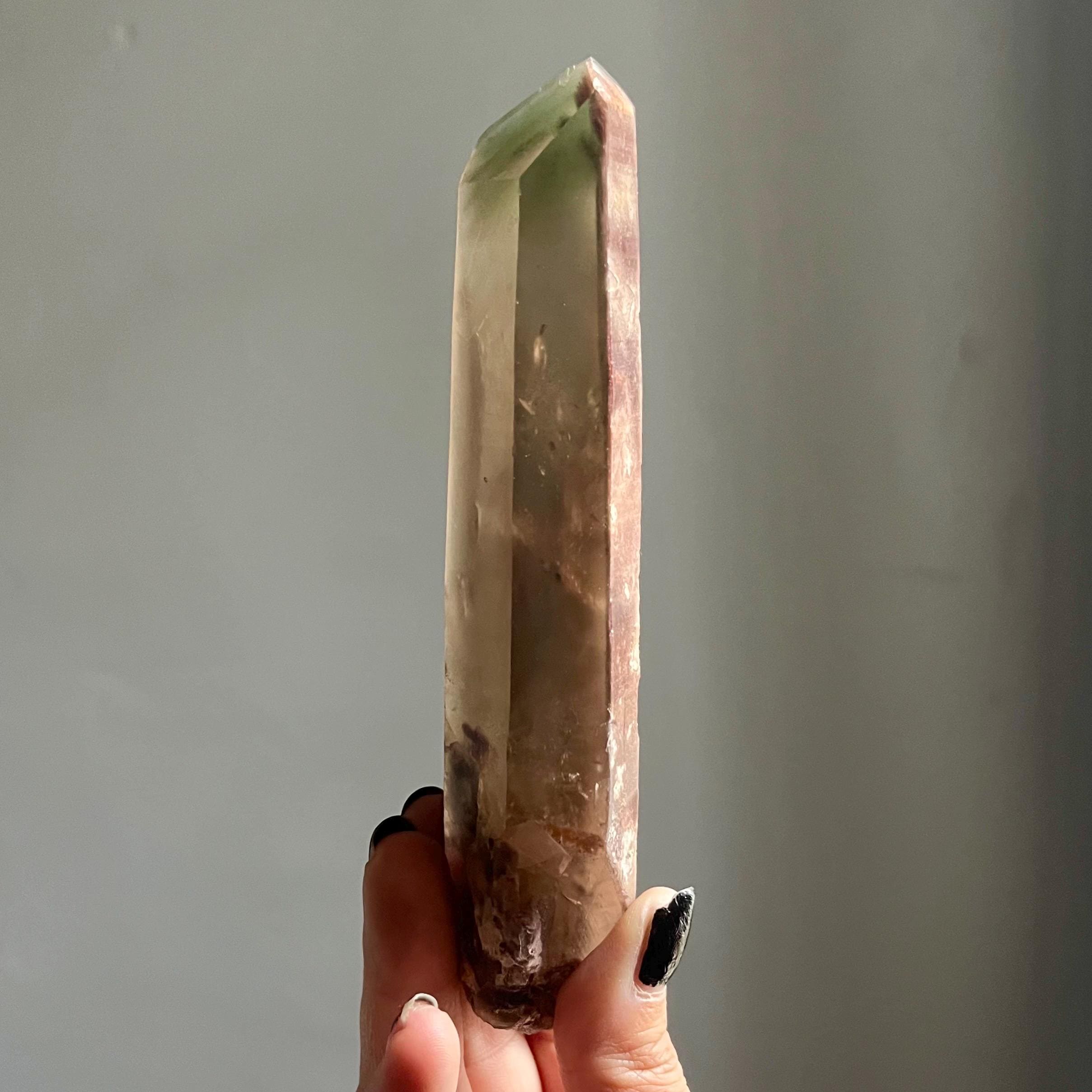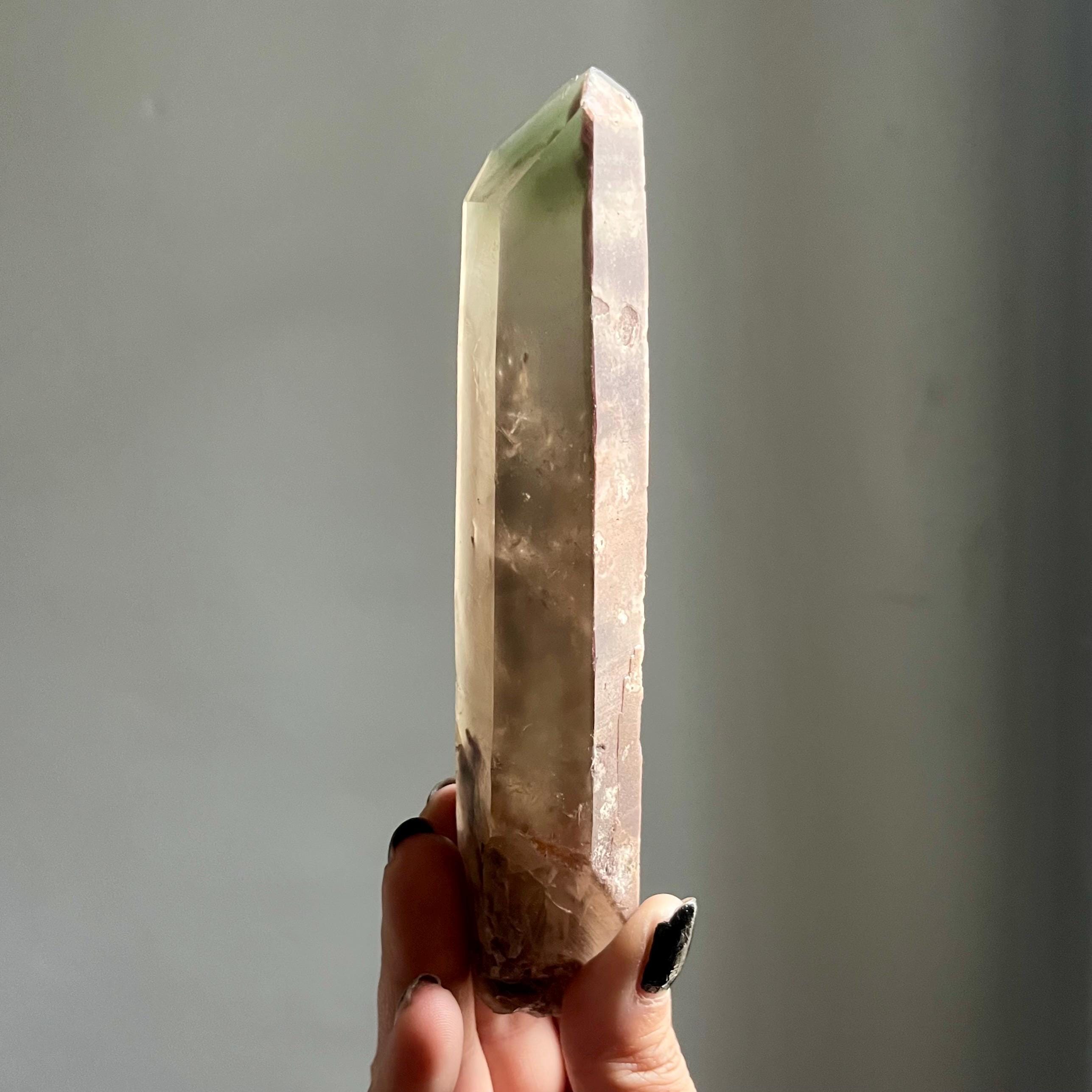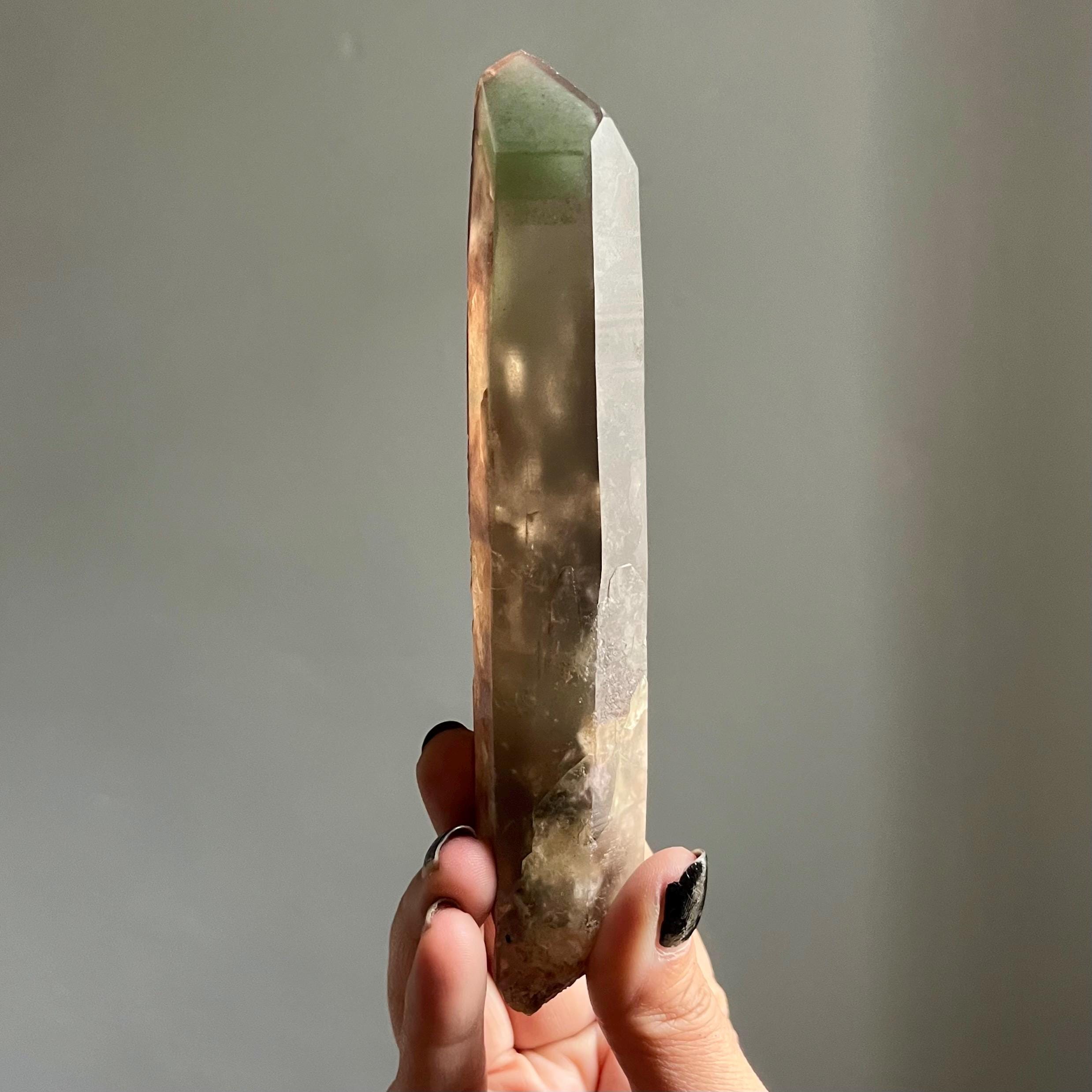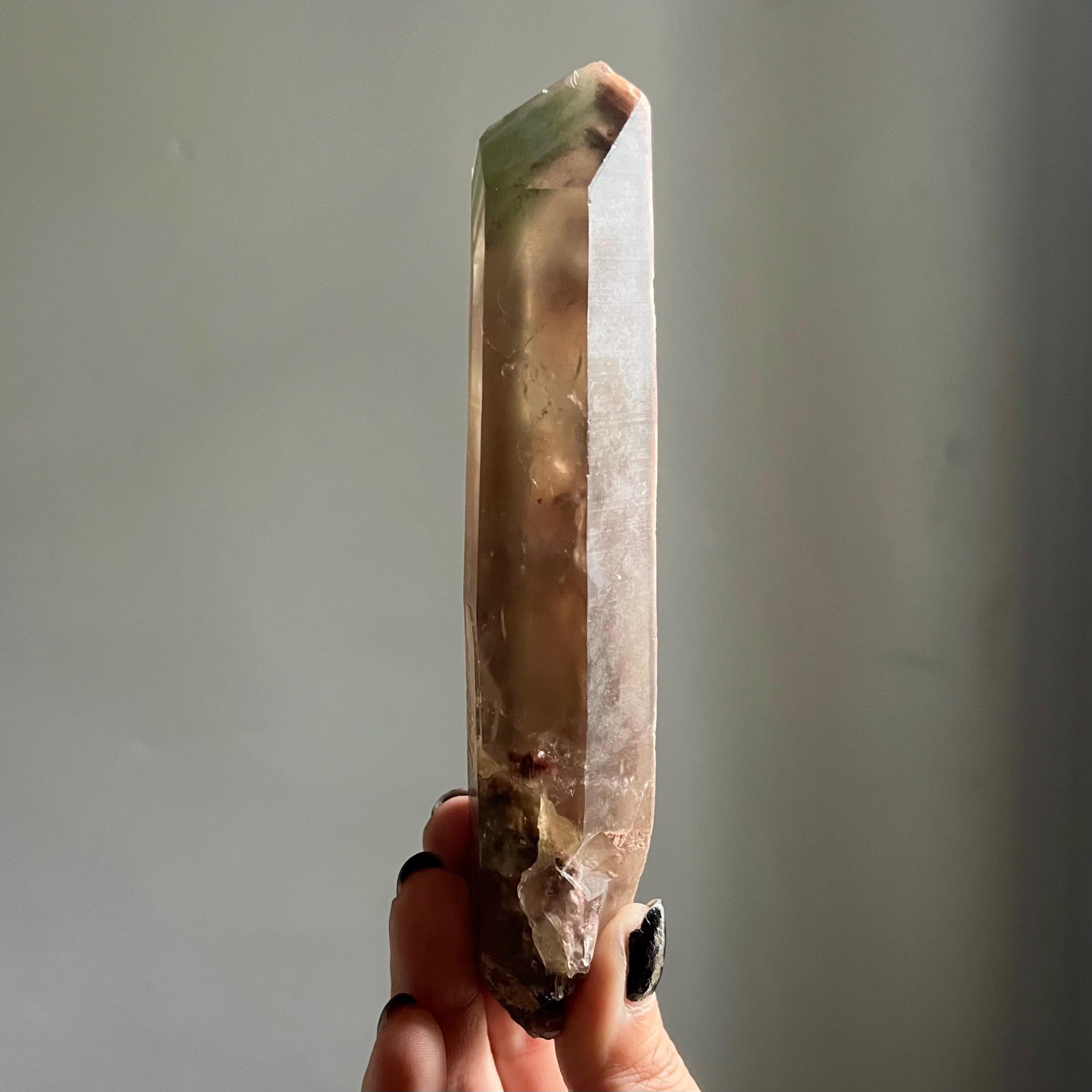 The inclusions transform the hues of the lemurian quartz itself into deep smoky shades of green and pink.