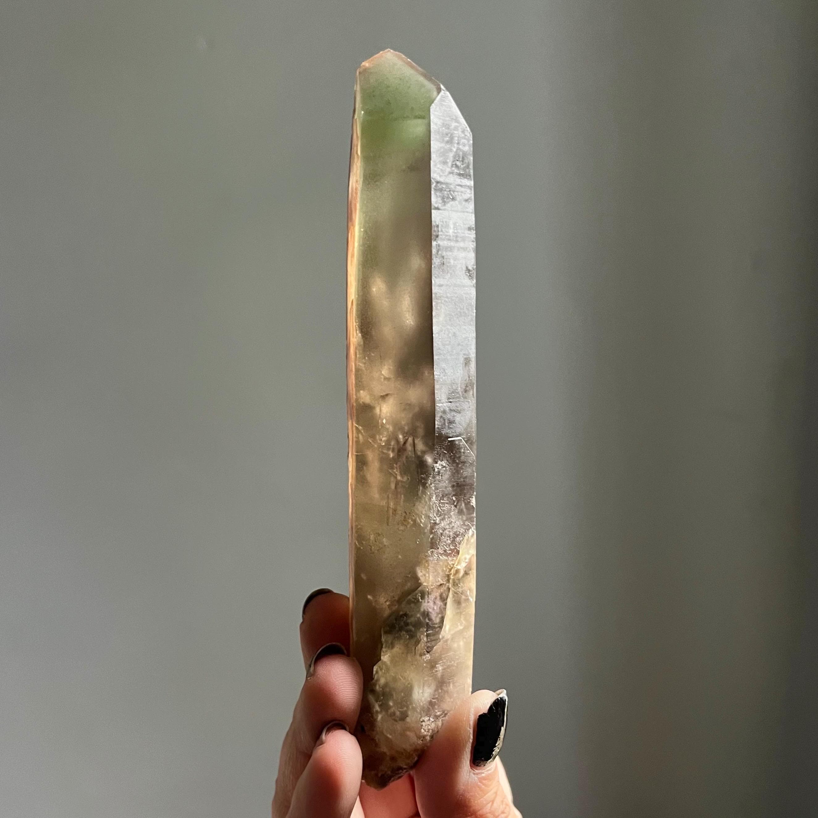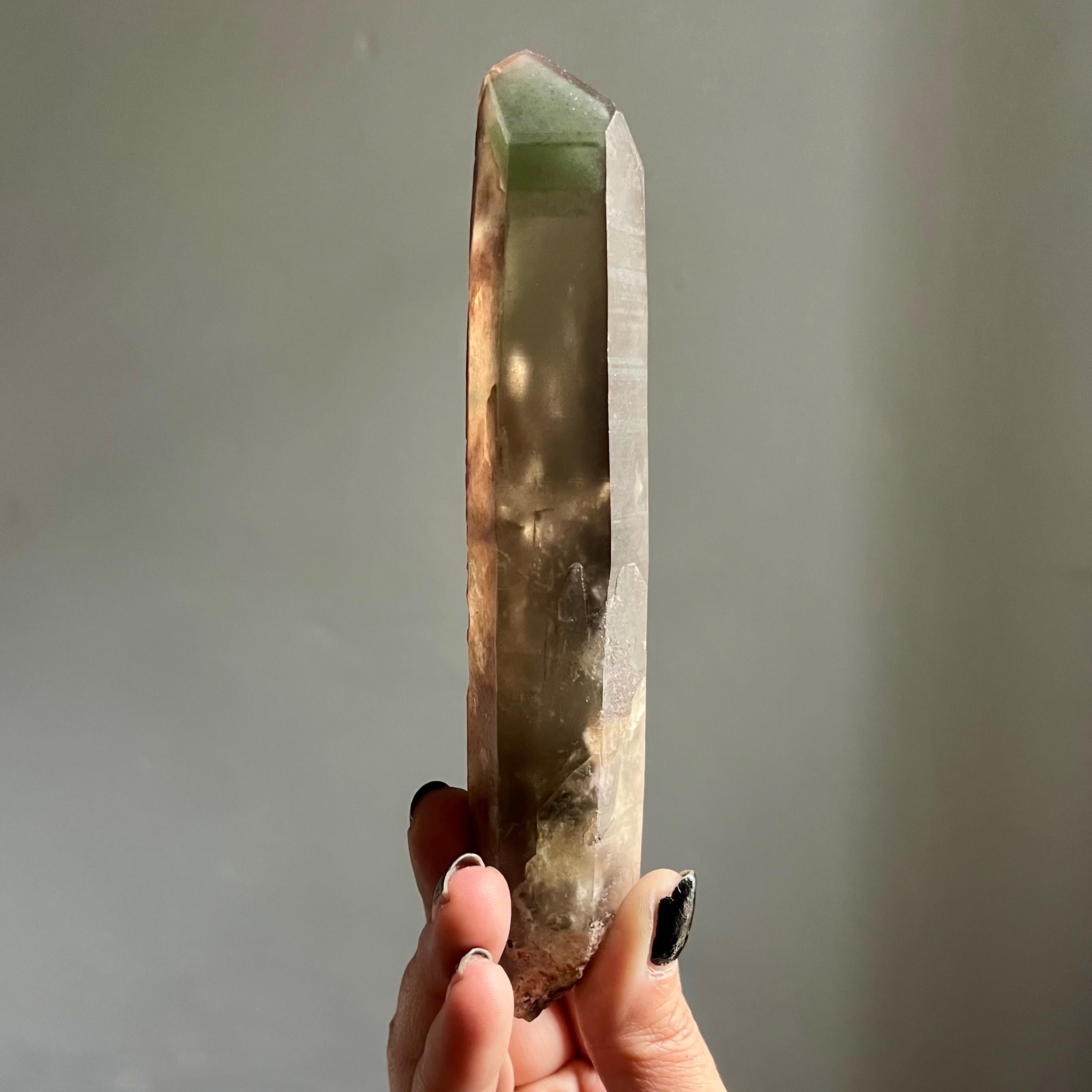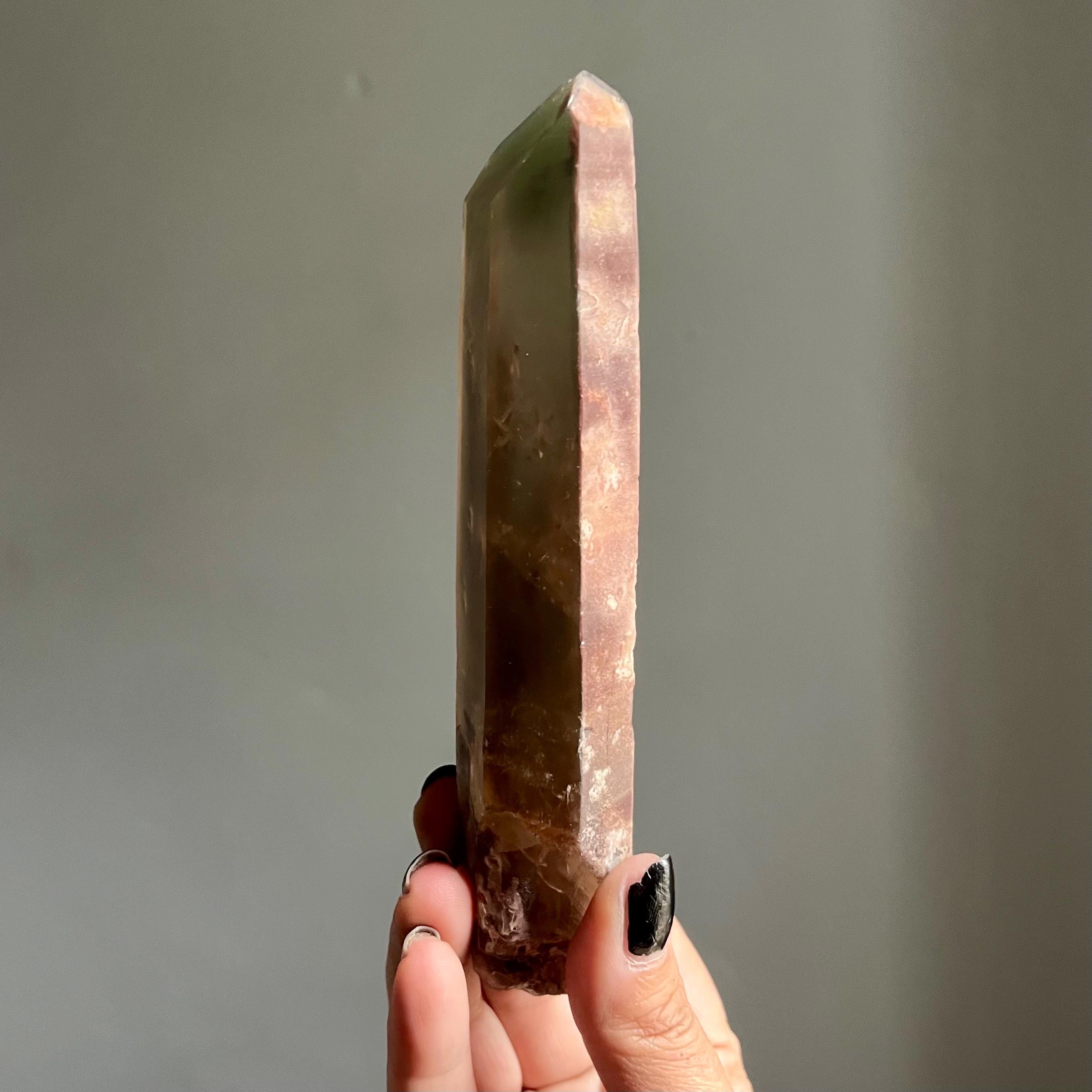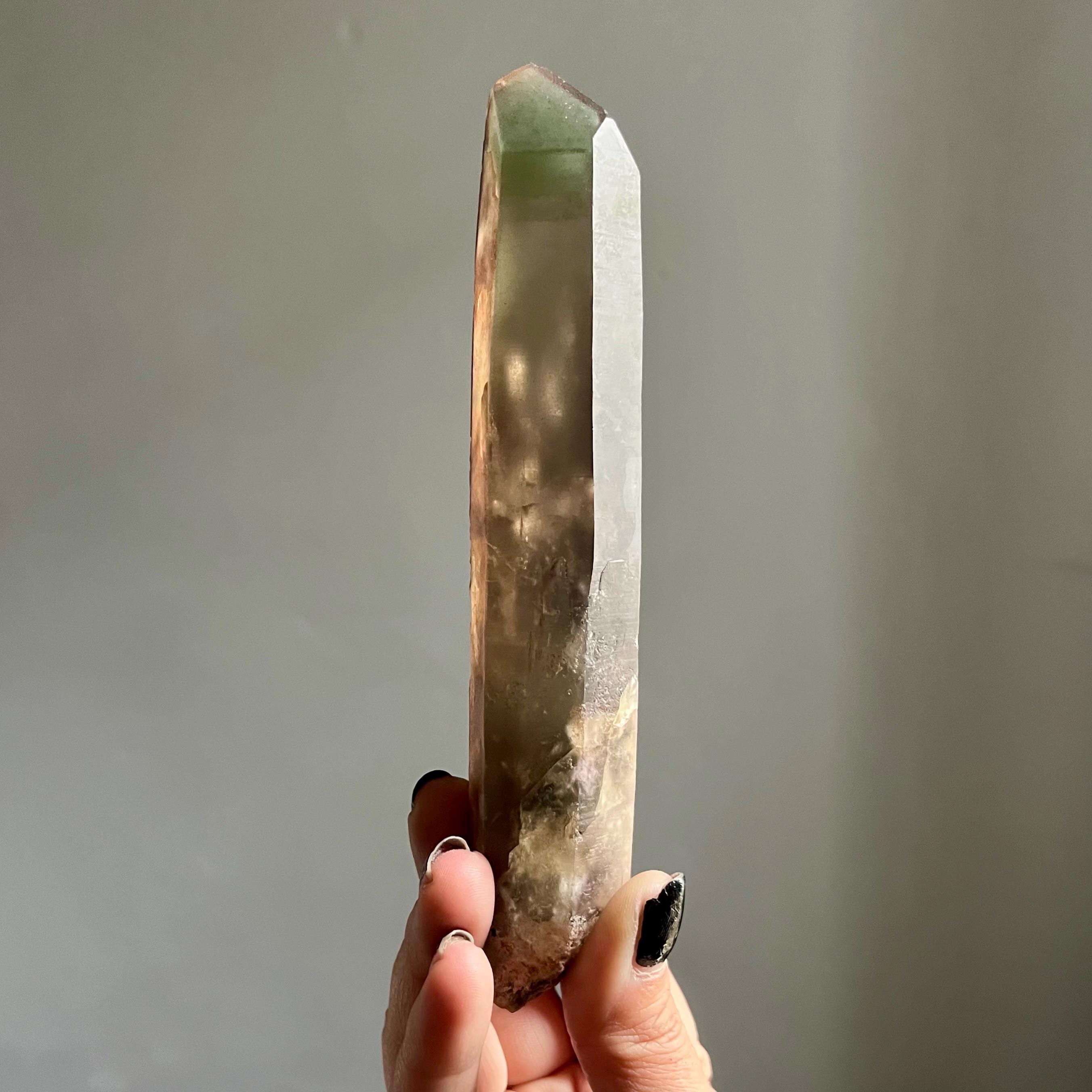 The inclusions transform the hues of the lemurian quartz itself into deep smoky shades of green and pink.