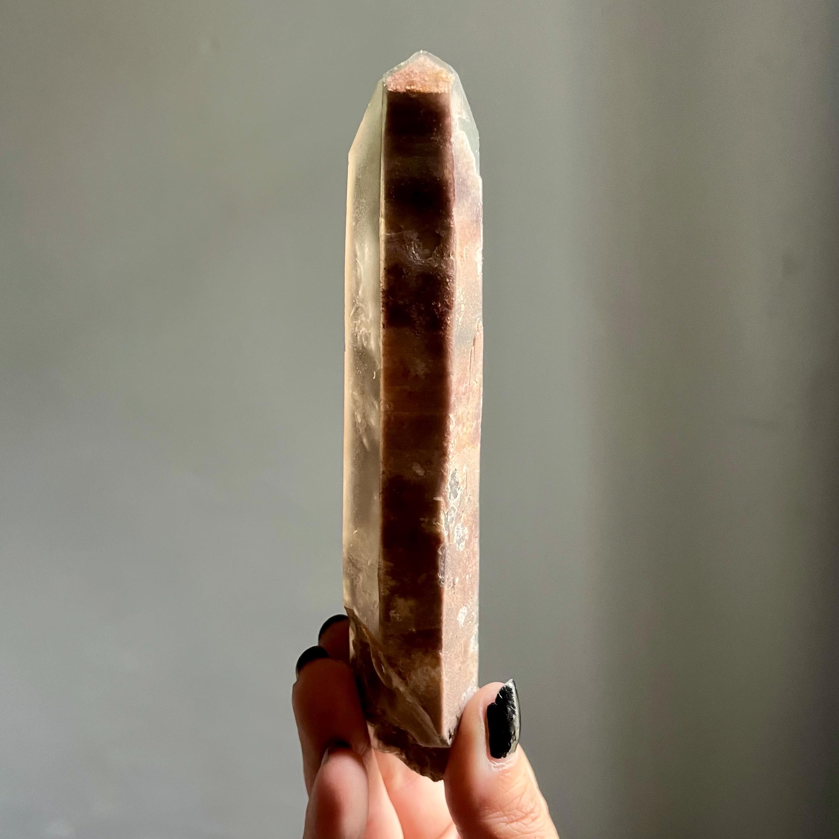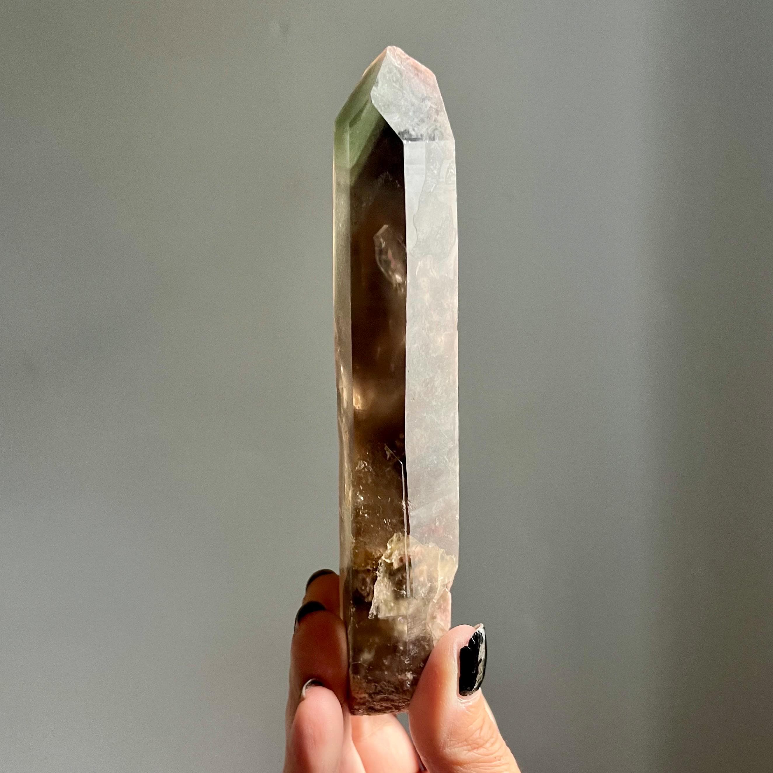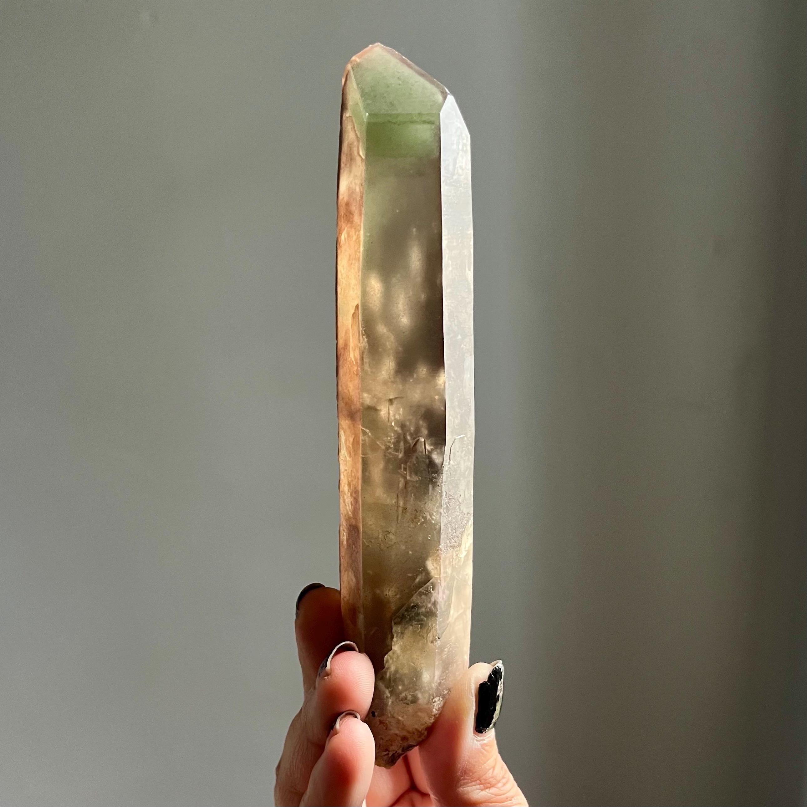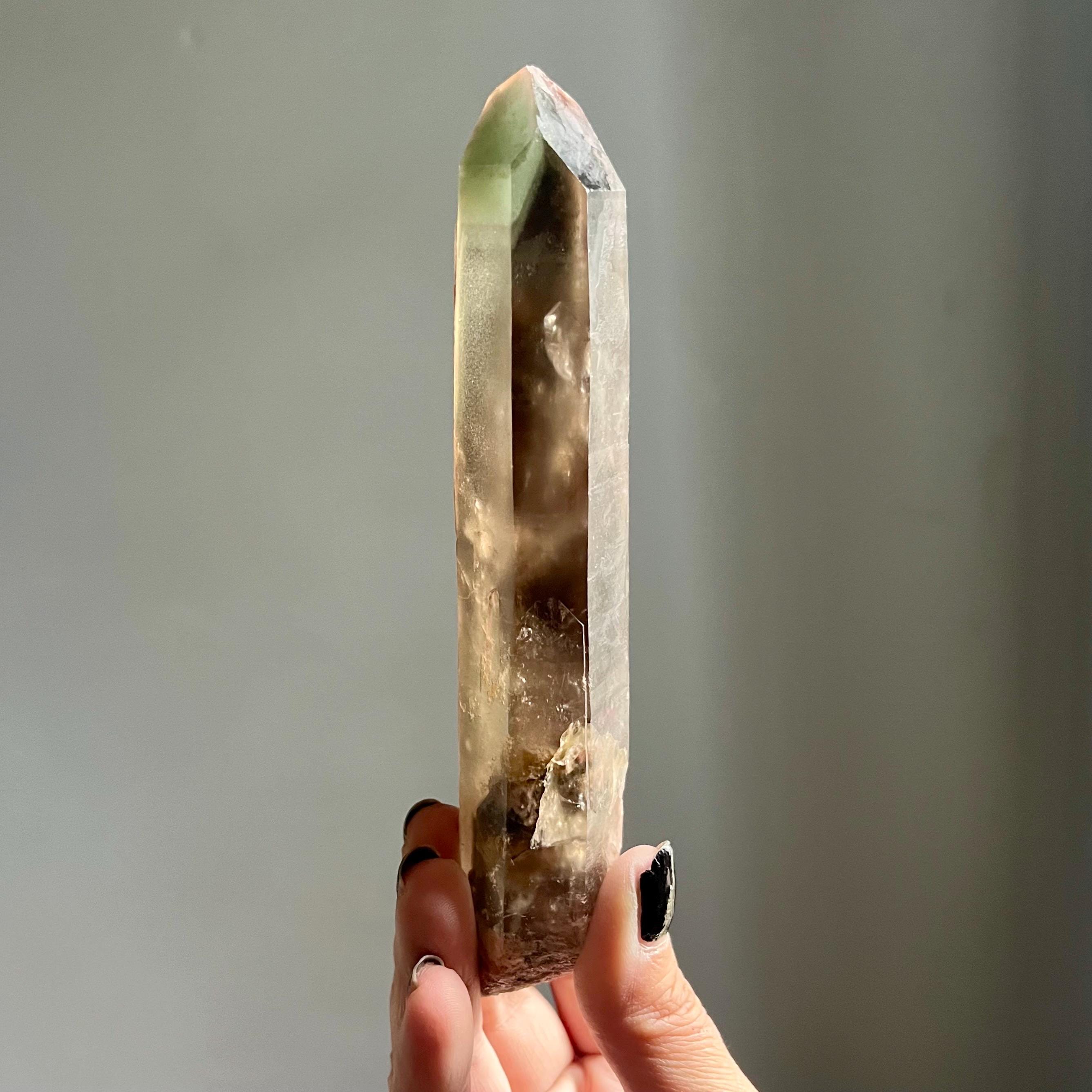The inclusions transform the hues of the lemurian quartz itself into deep smoky shades of green and pink.