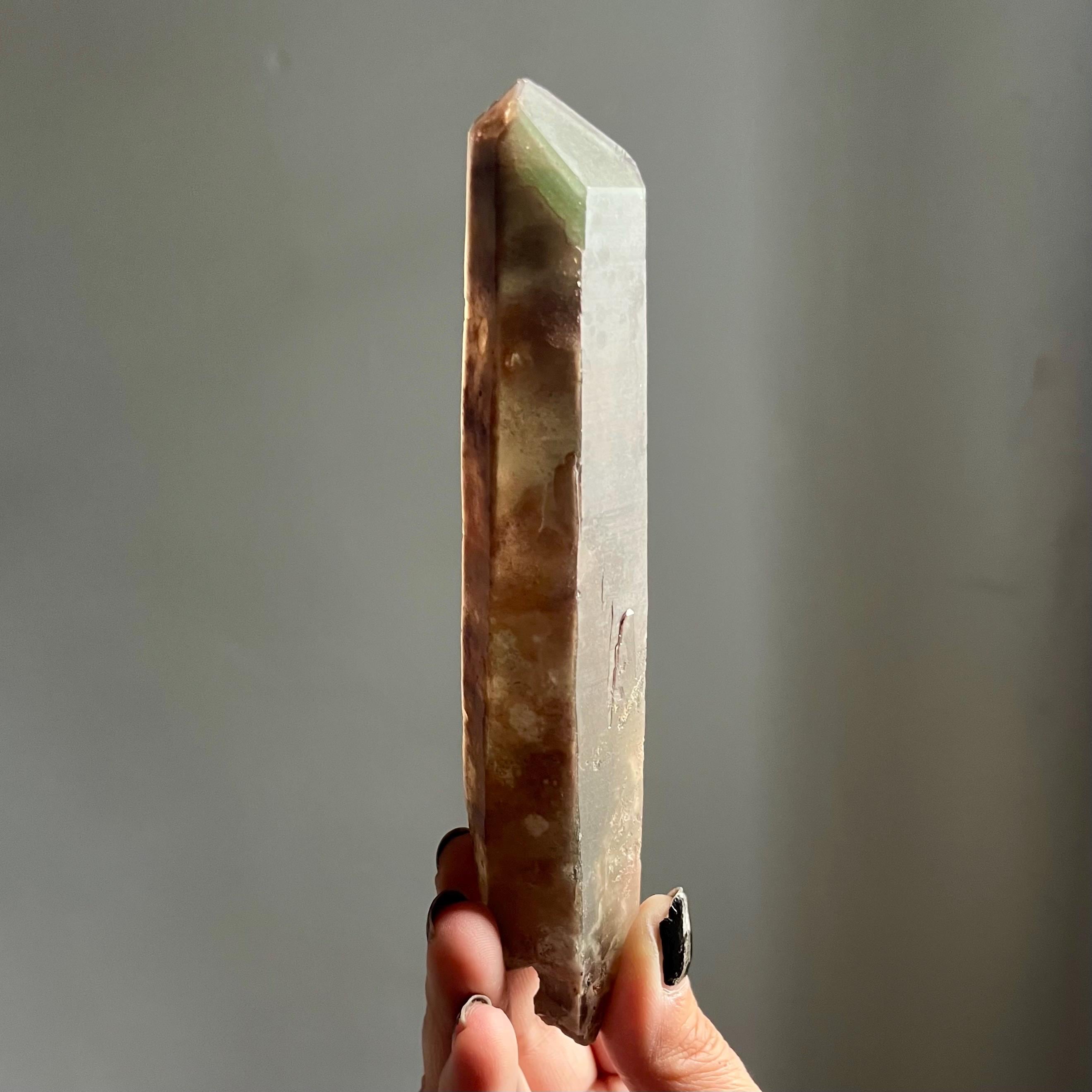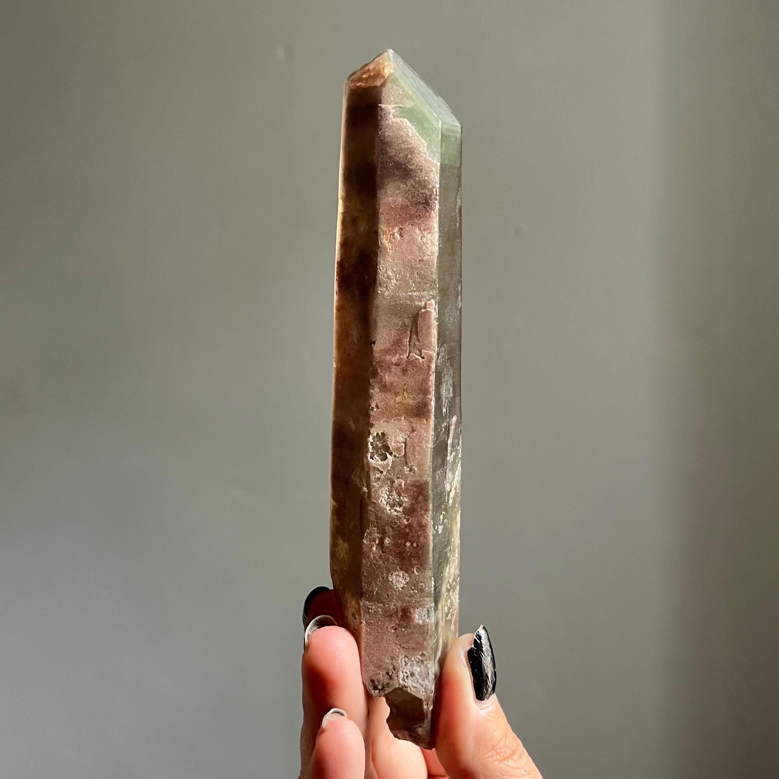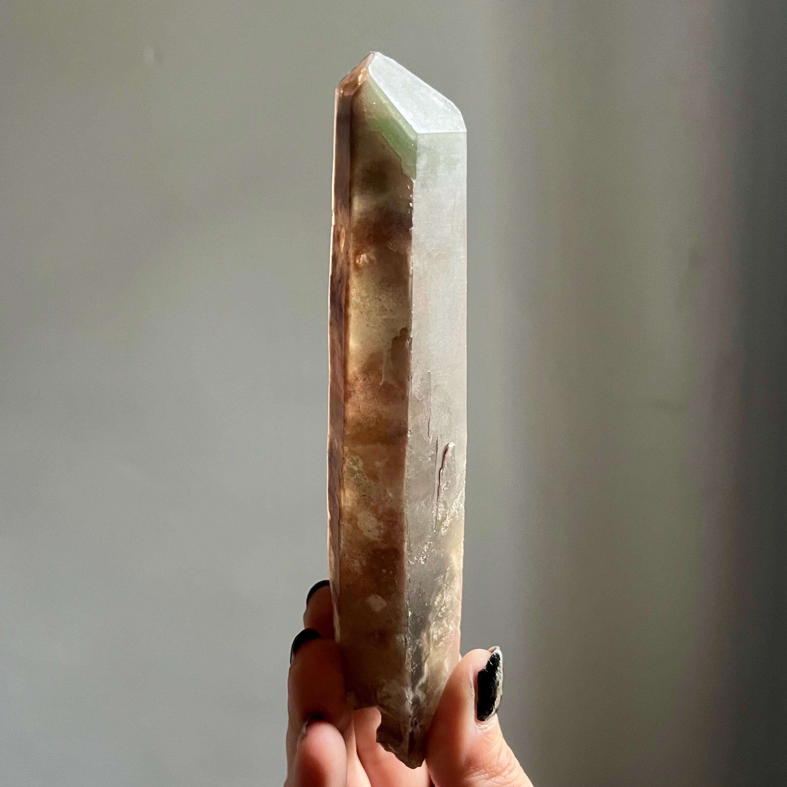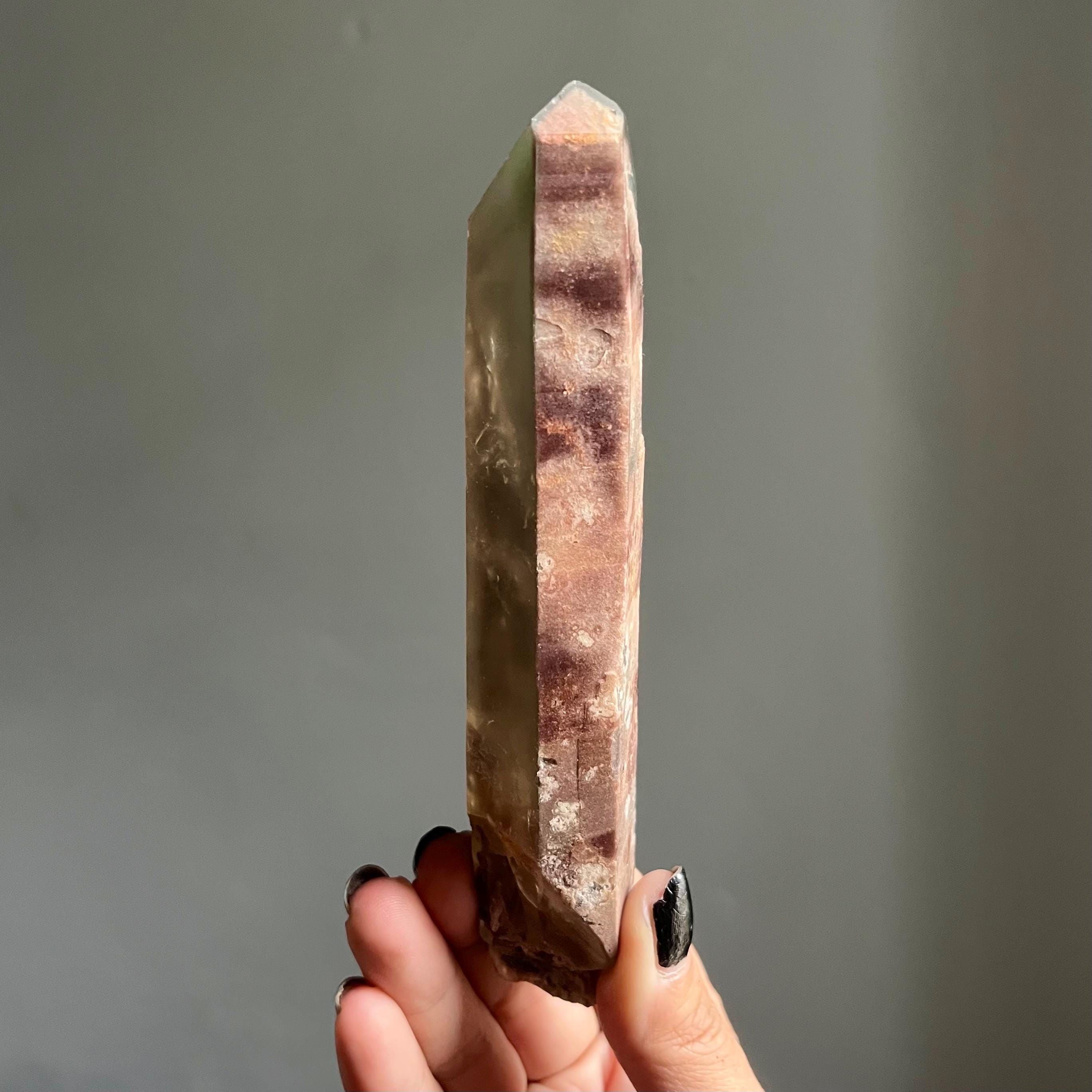 The inclusions transform the hues of the lemurian quartz itself into deep smoky shades of green and pink.