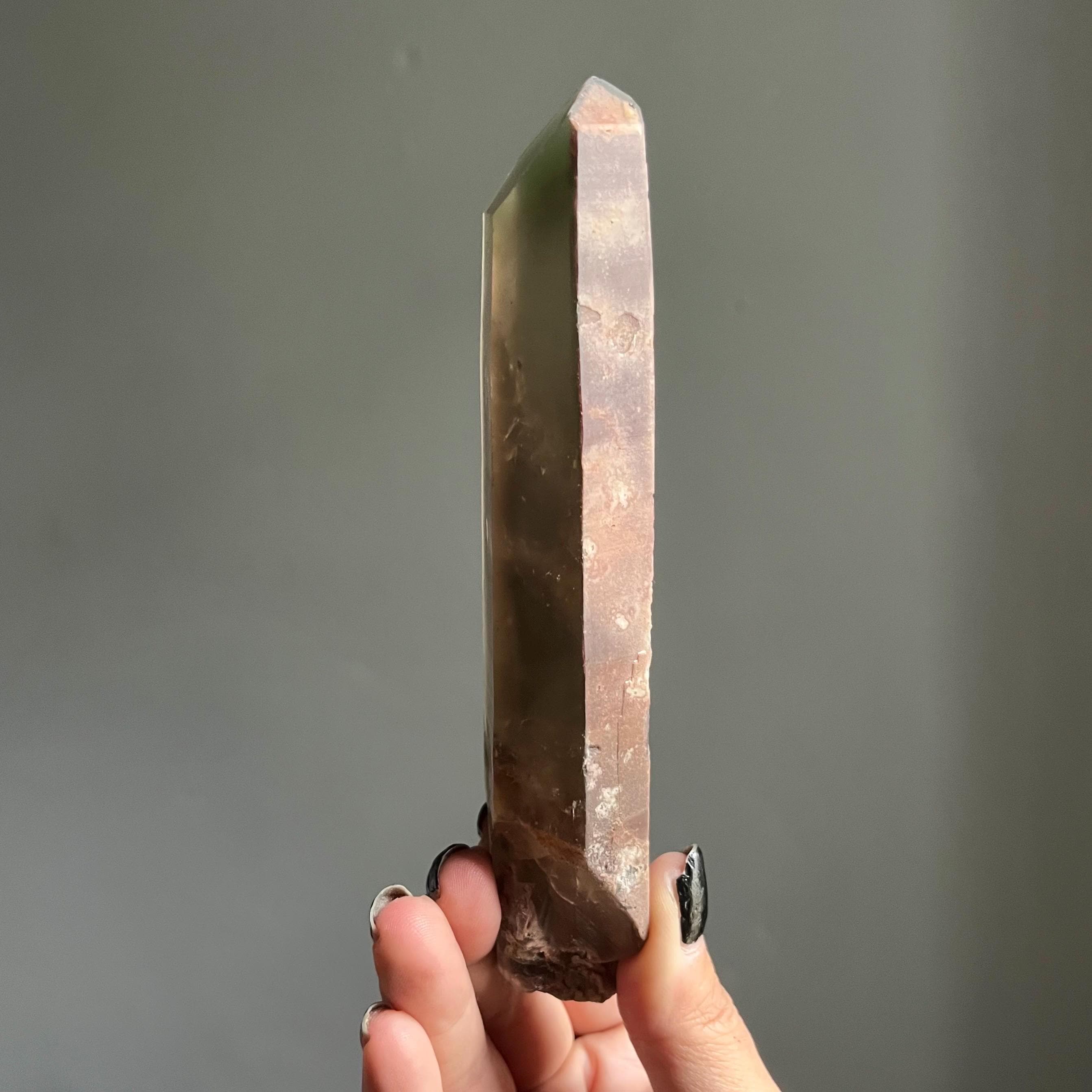 Over six inches long, this large crystal point is wild and untouched, manifesting with a rare, natural dow quartz termination.