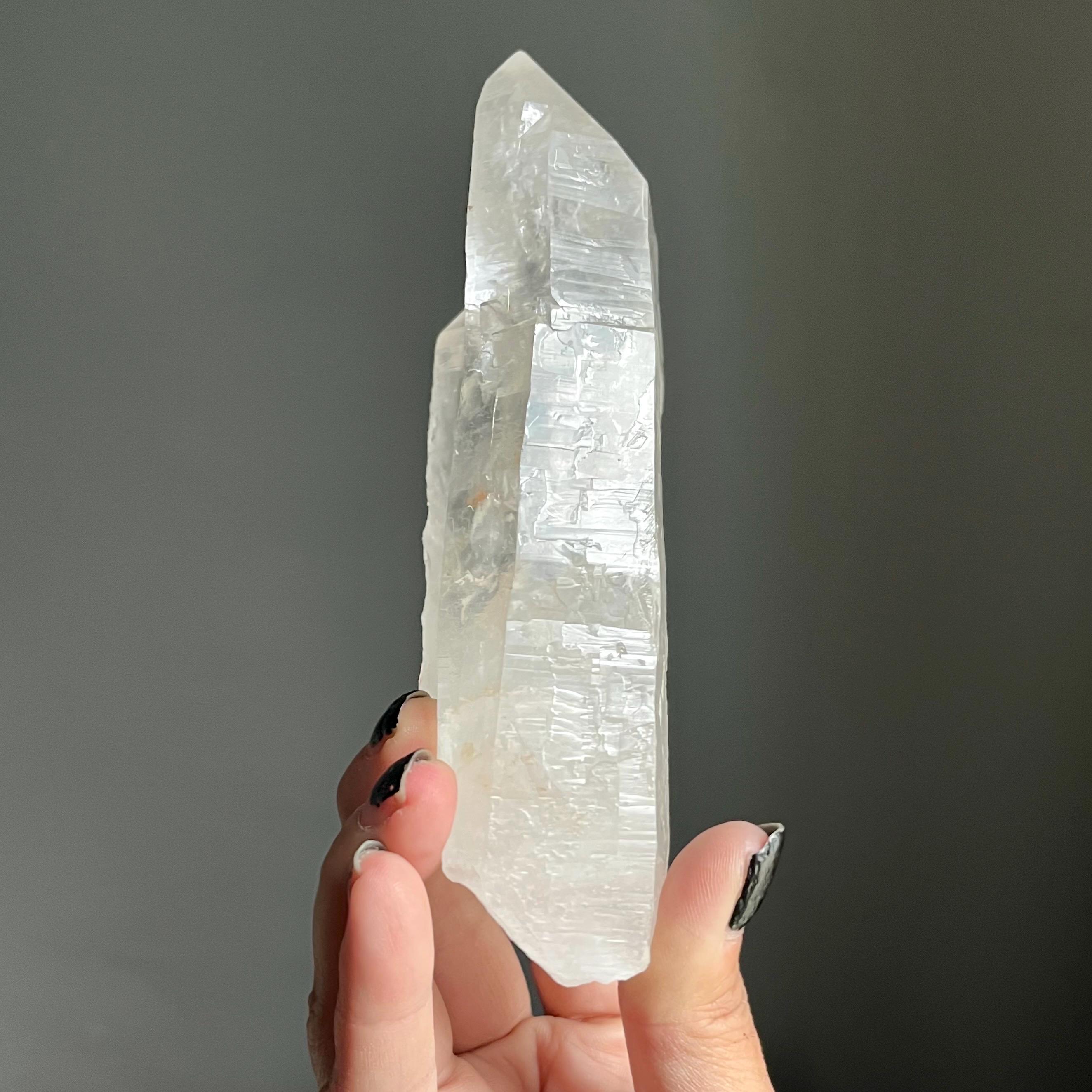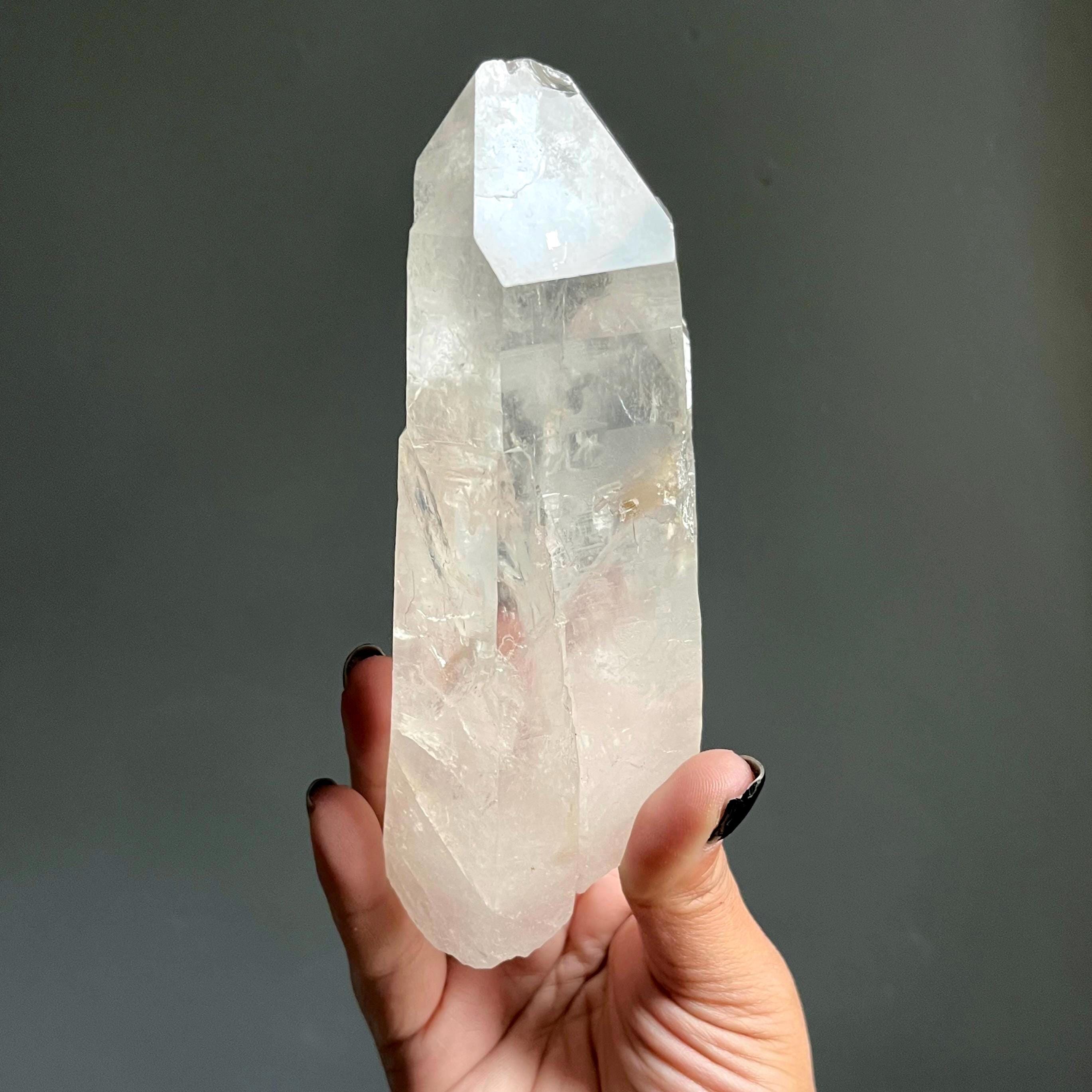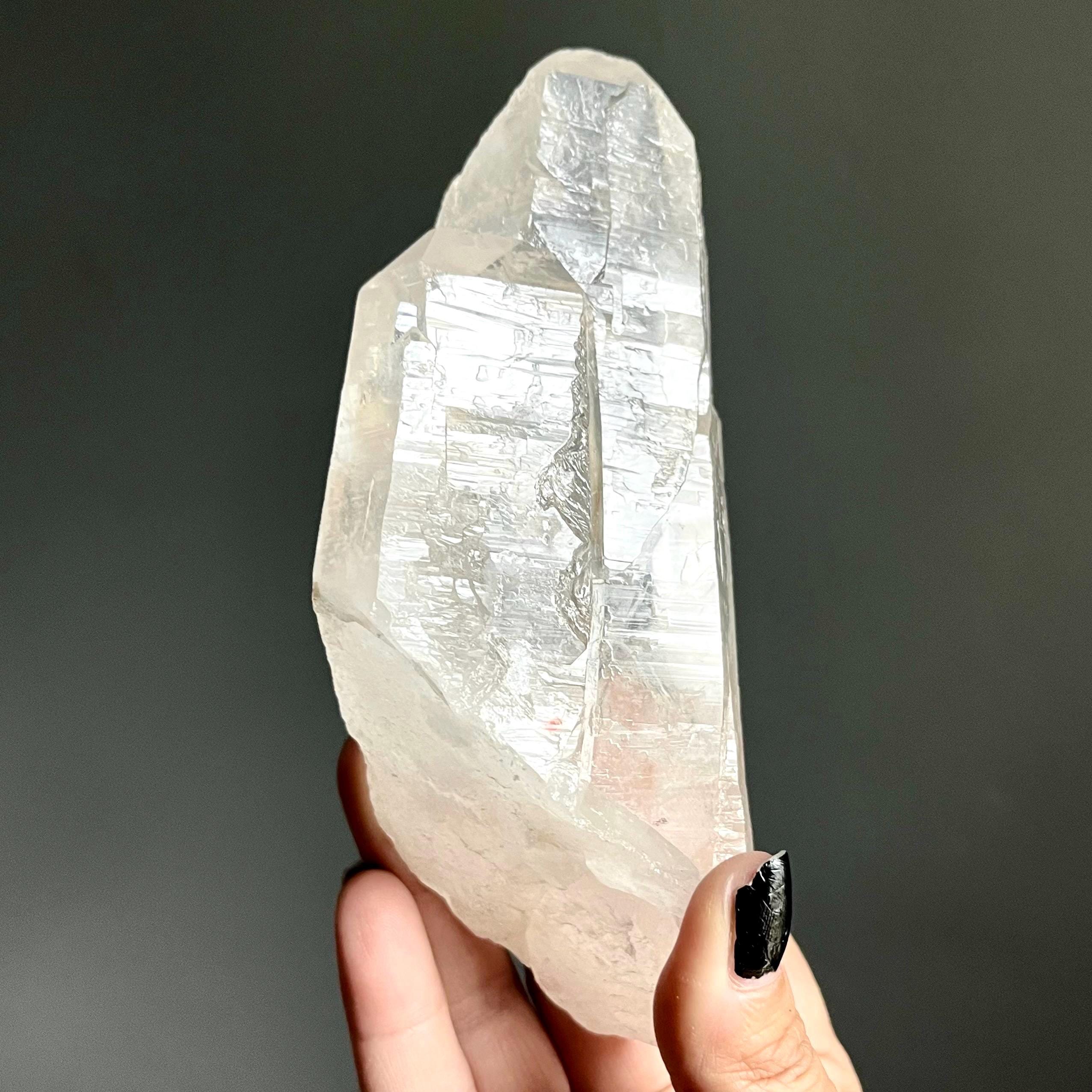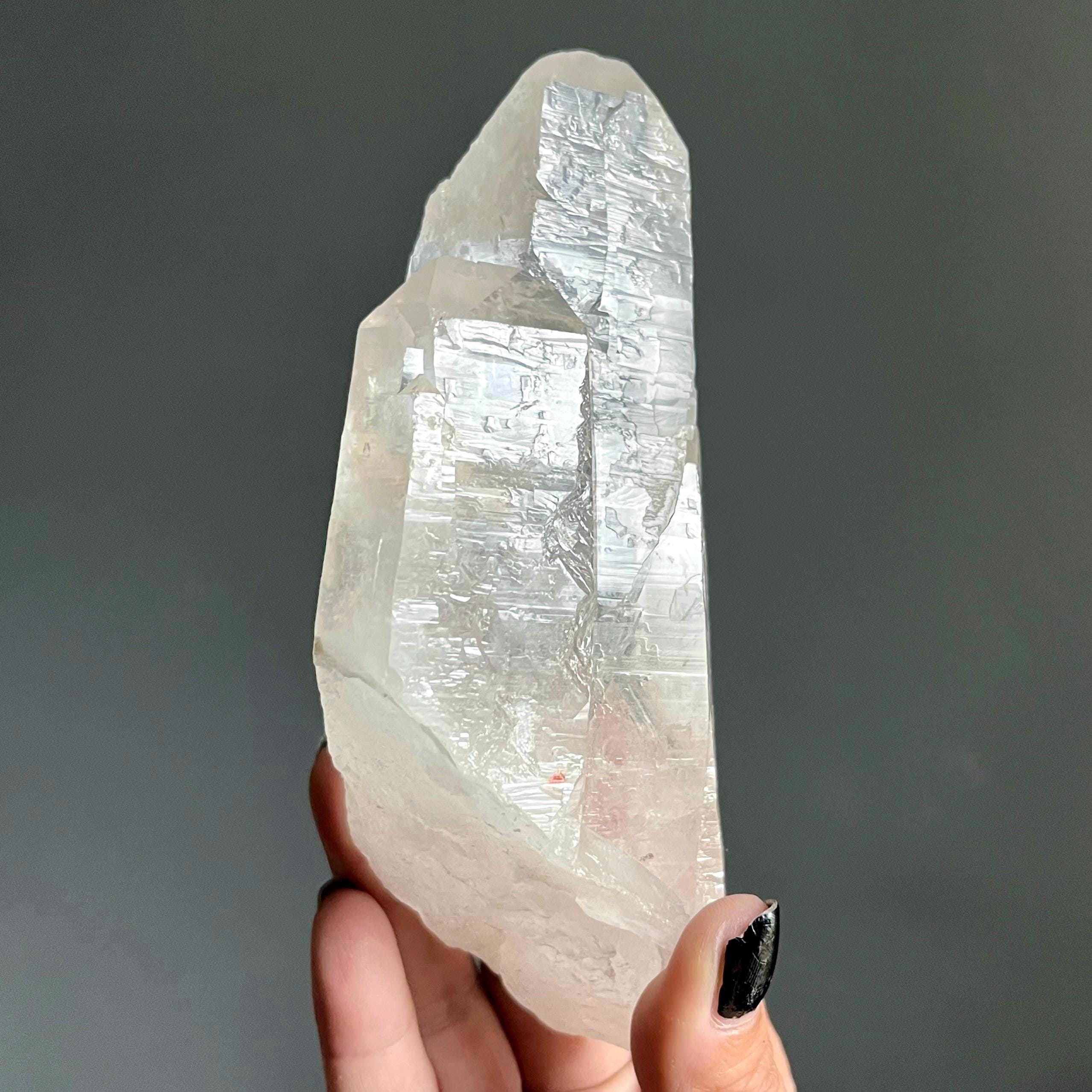 Weighing over a pound, this large crystal being is wild and untouched. Water clear, diamantina lemurian quartz beckons the light.