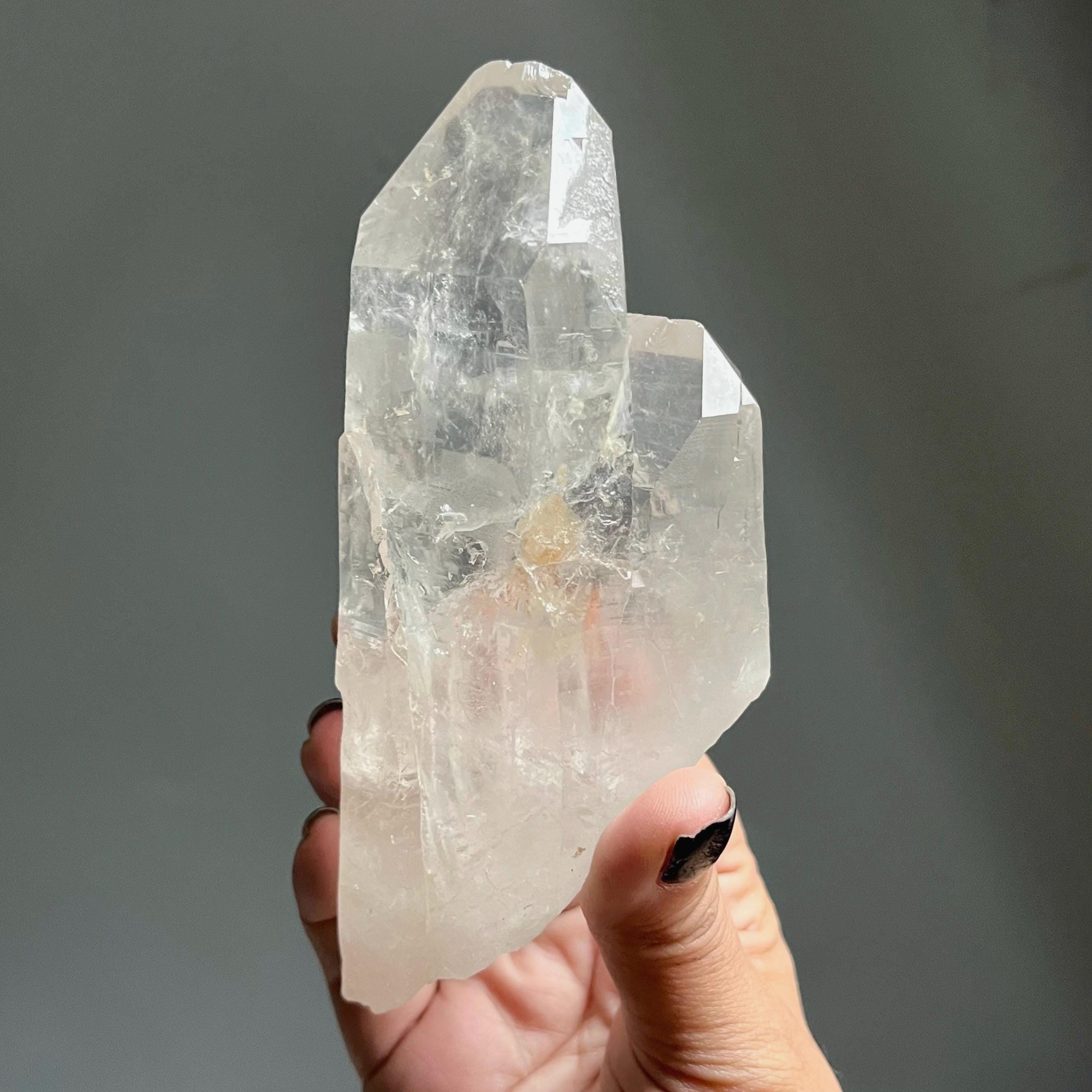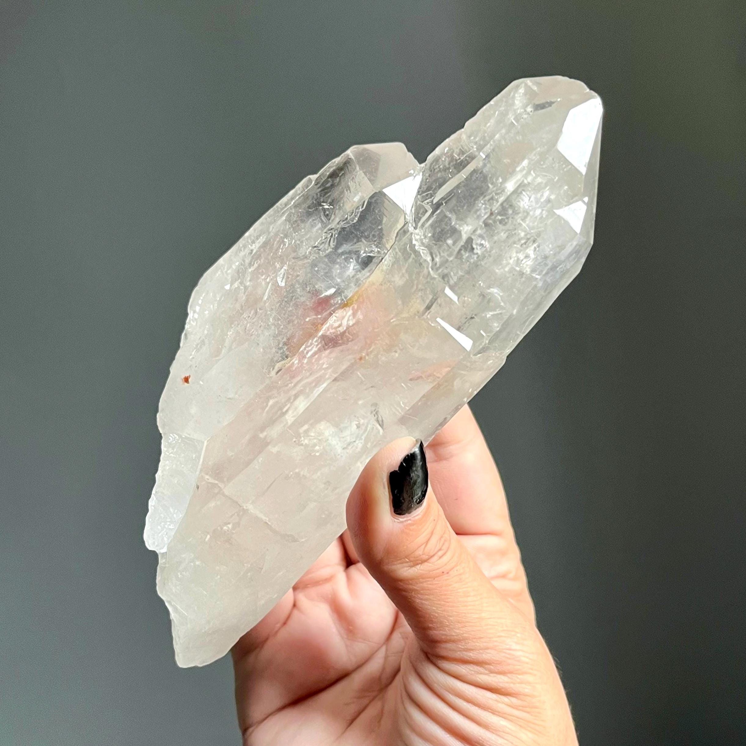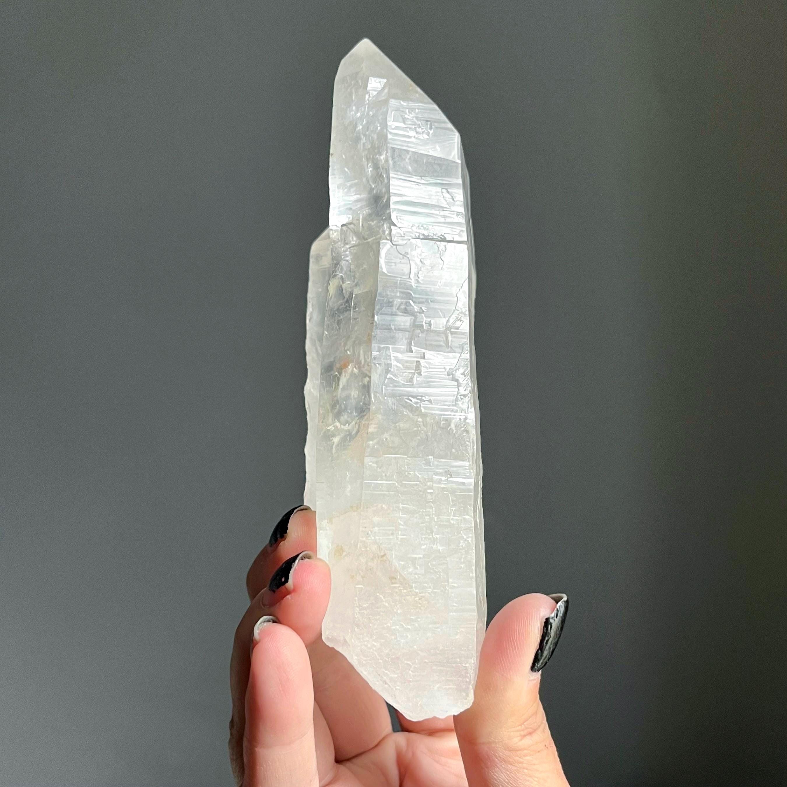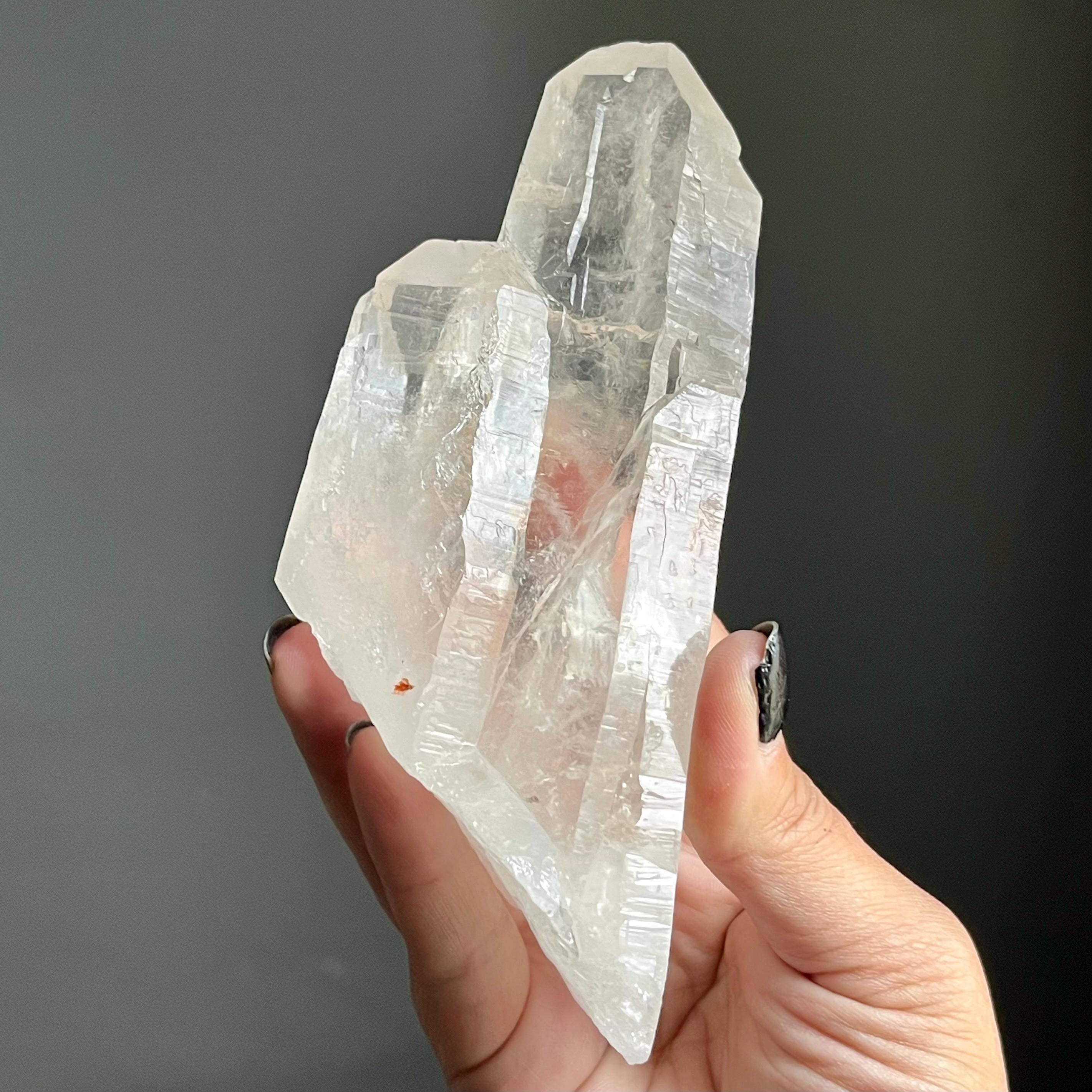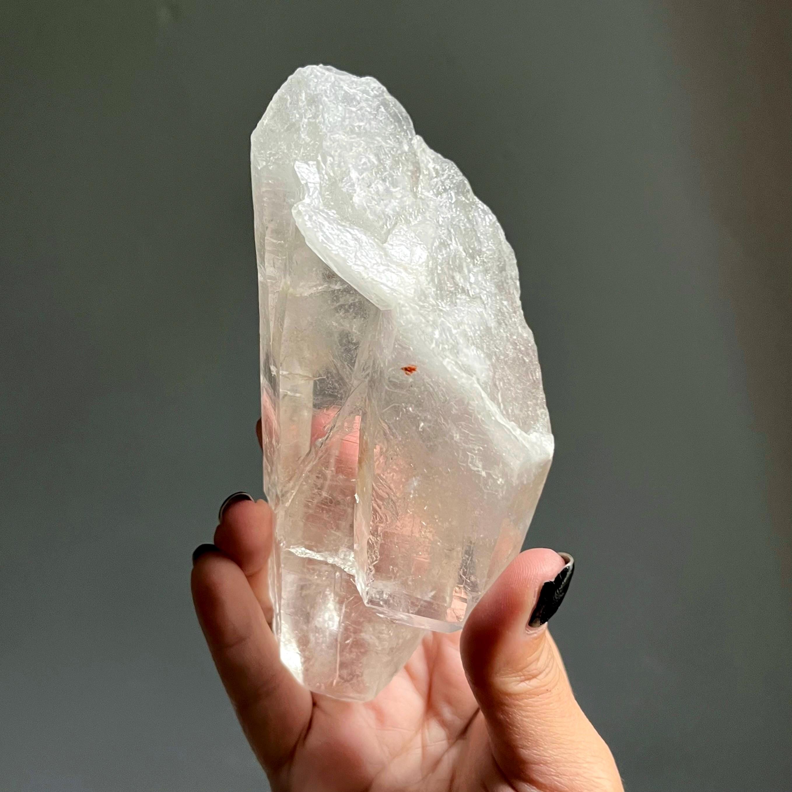 Weighing over a pound, this large crystal being is wild and untouched. Water clear, diamantina lemurian quartz beckons the light.