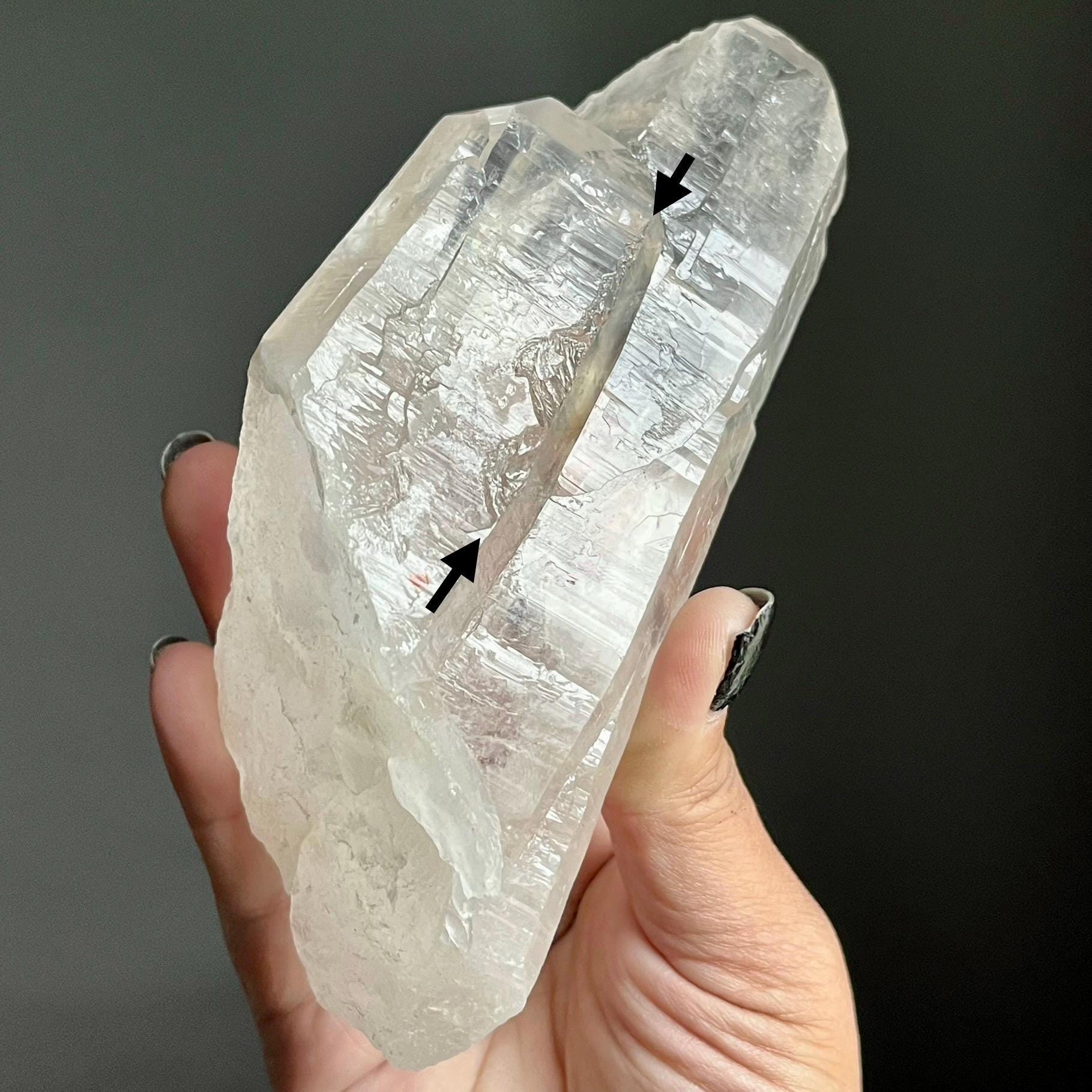 A deep, tell tale zig zag lightning strike mark runs up the left edge of the smaller twin crystal (photo #2). It rains over the edge, weaving through the liminal, where the smaller crystal meets its twin.