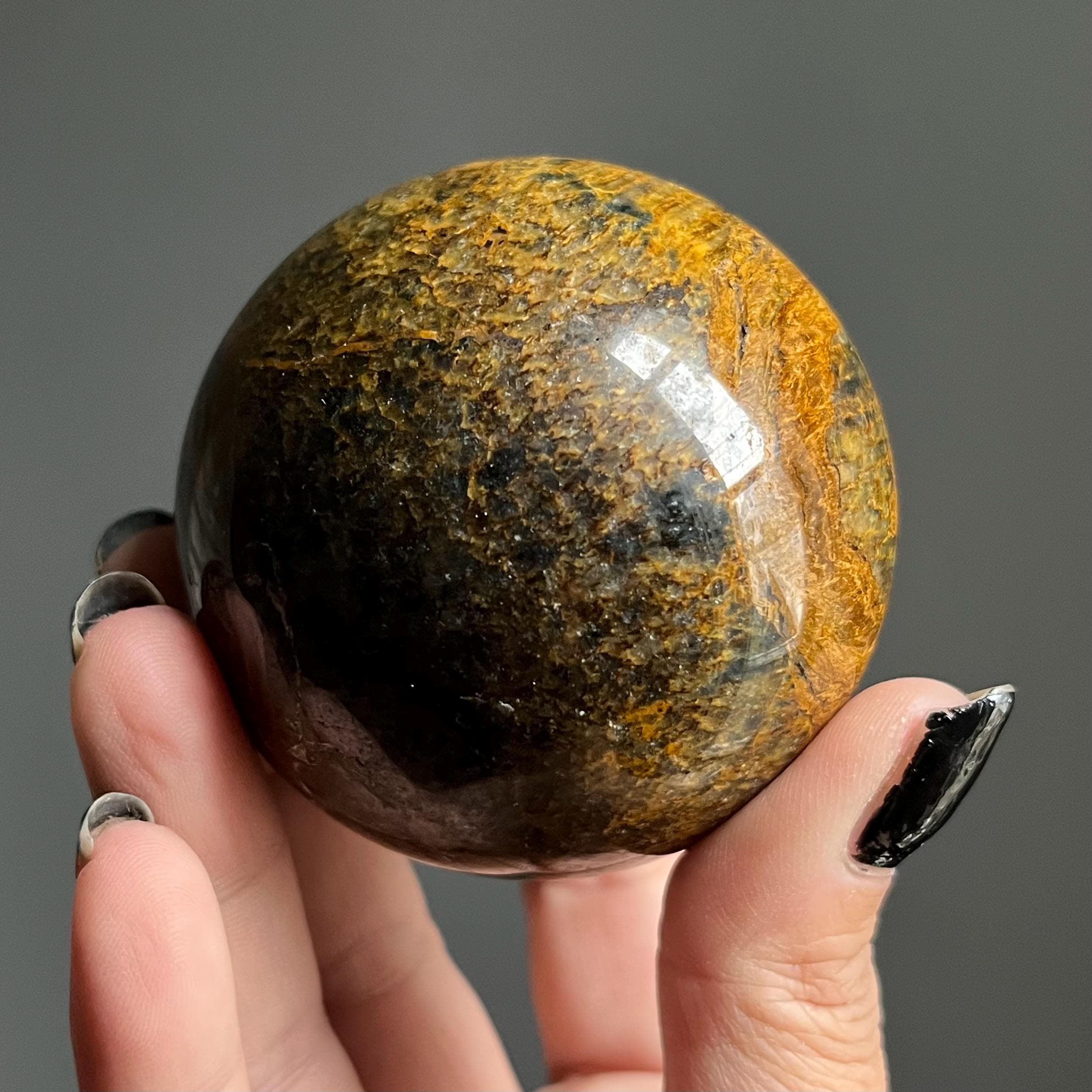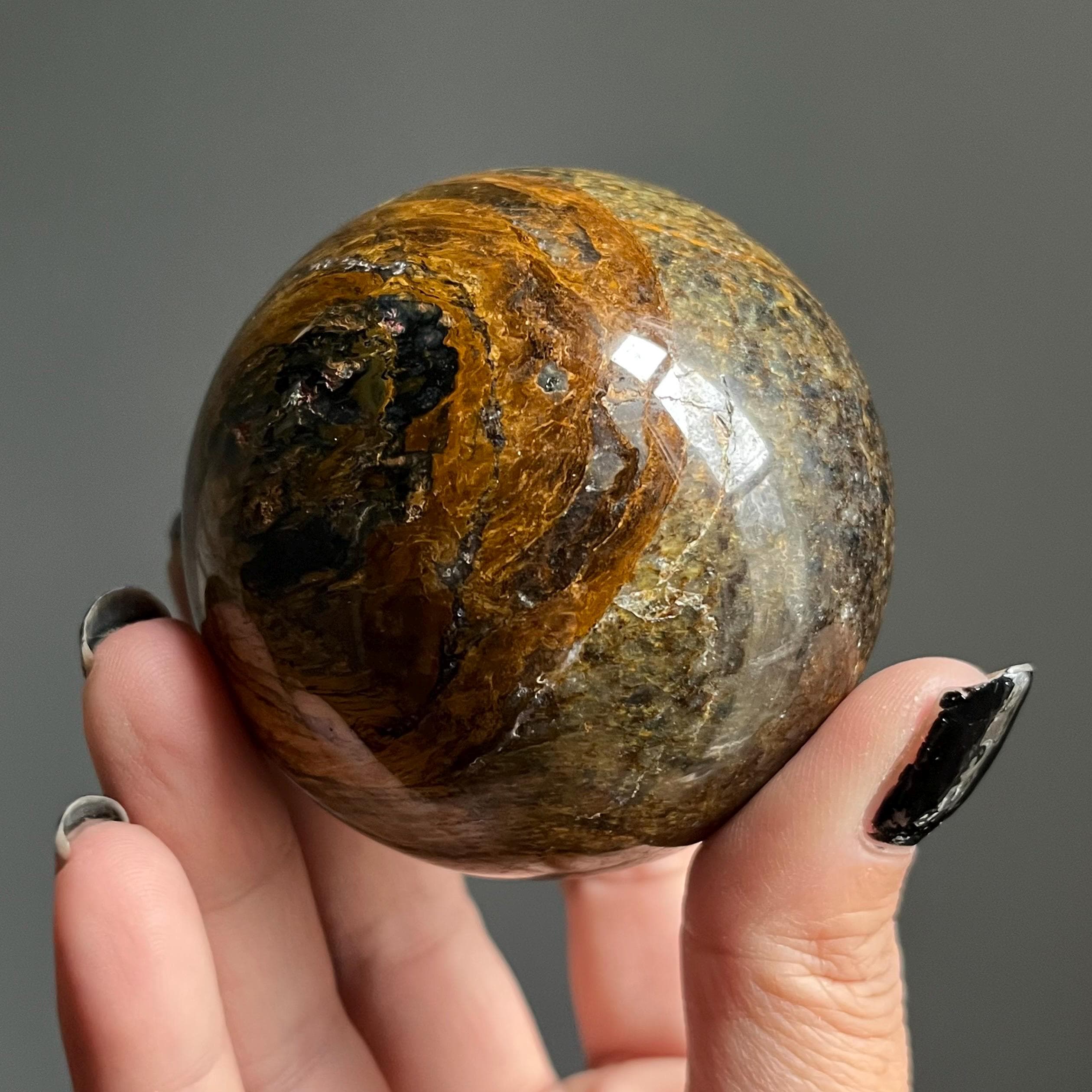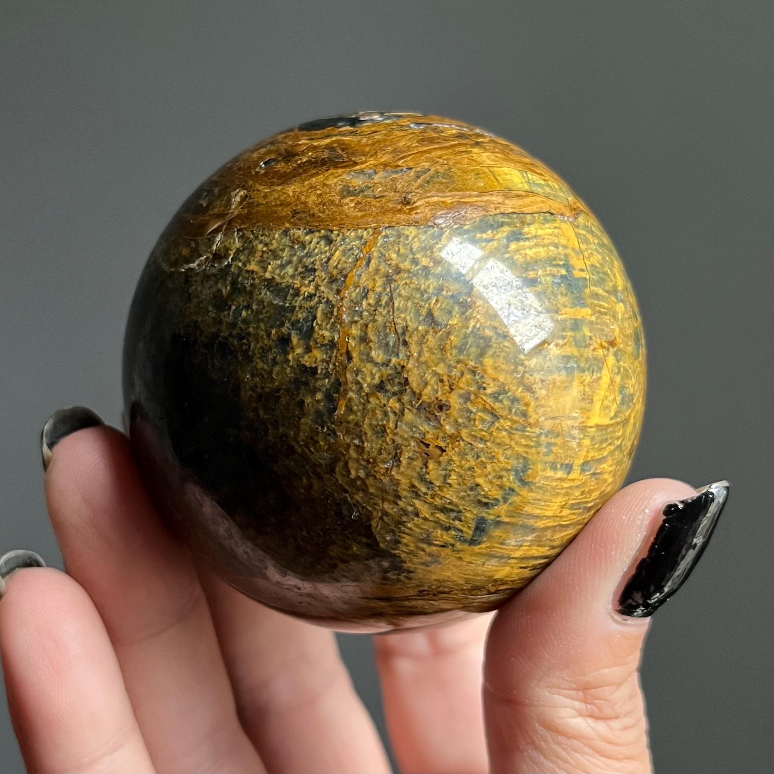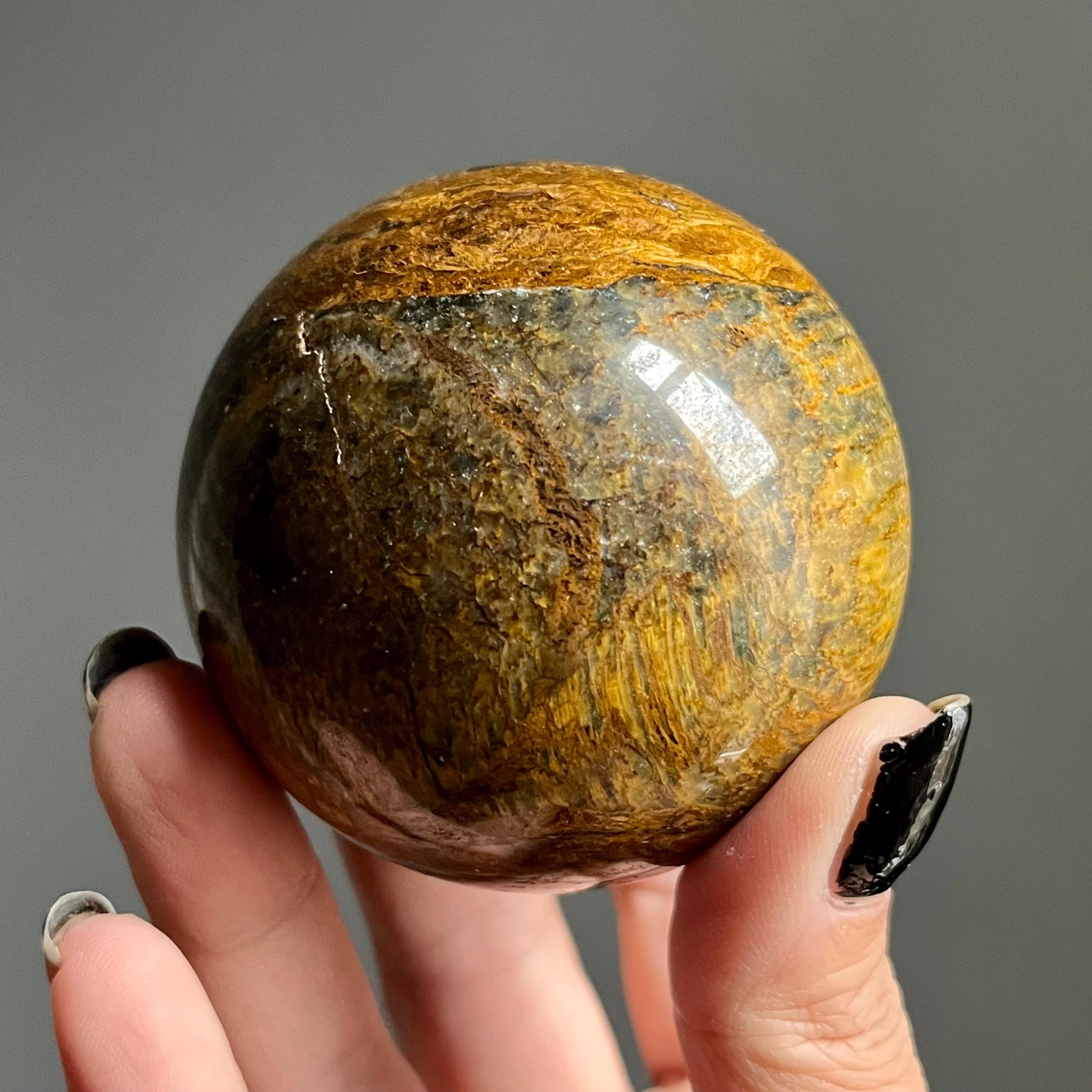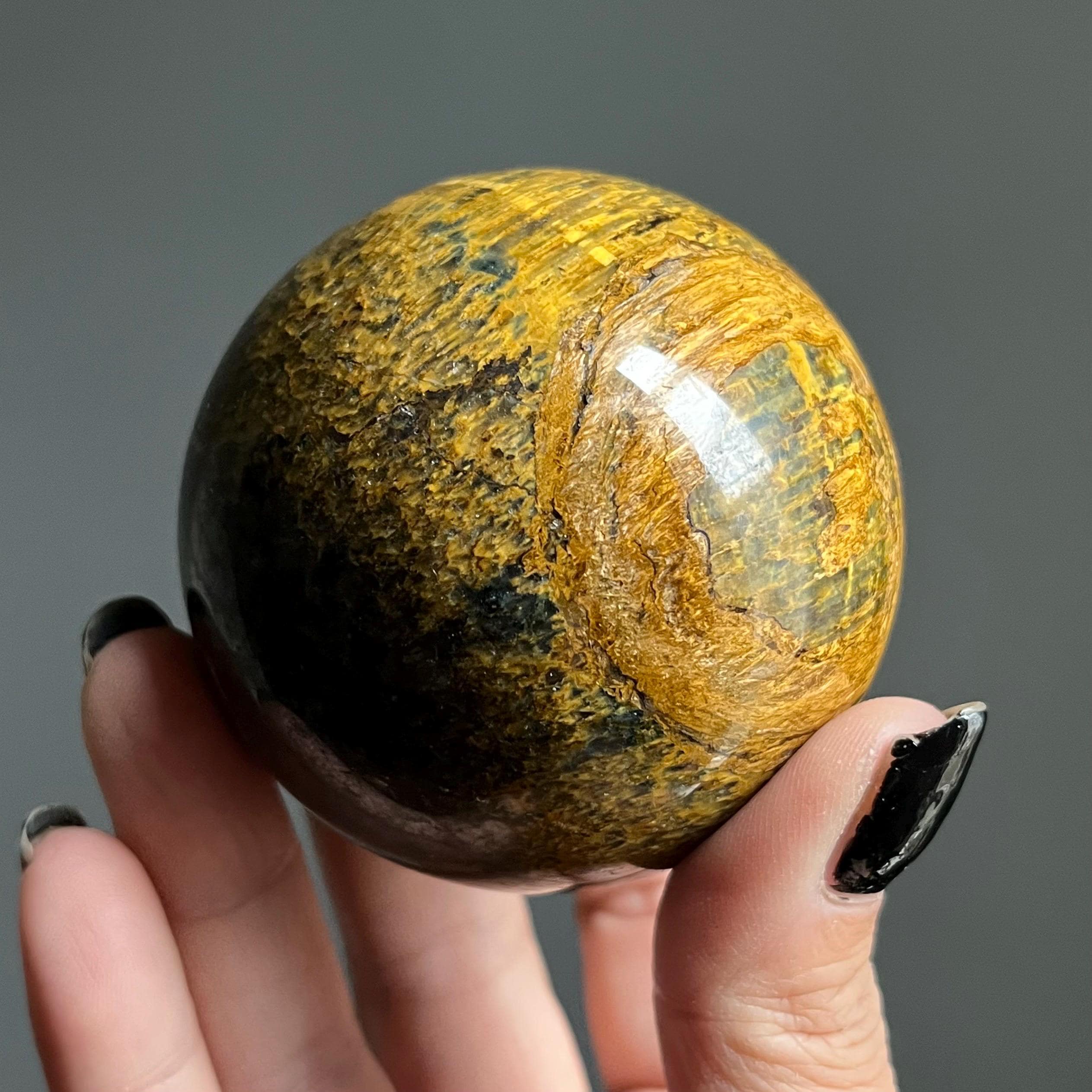 Weighing almost a pound, this large crystal sphere steps forward with brilliant chatoyant blue pietersite inclusions, the rarest manifestation of this extraordinary crystal being.