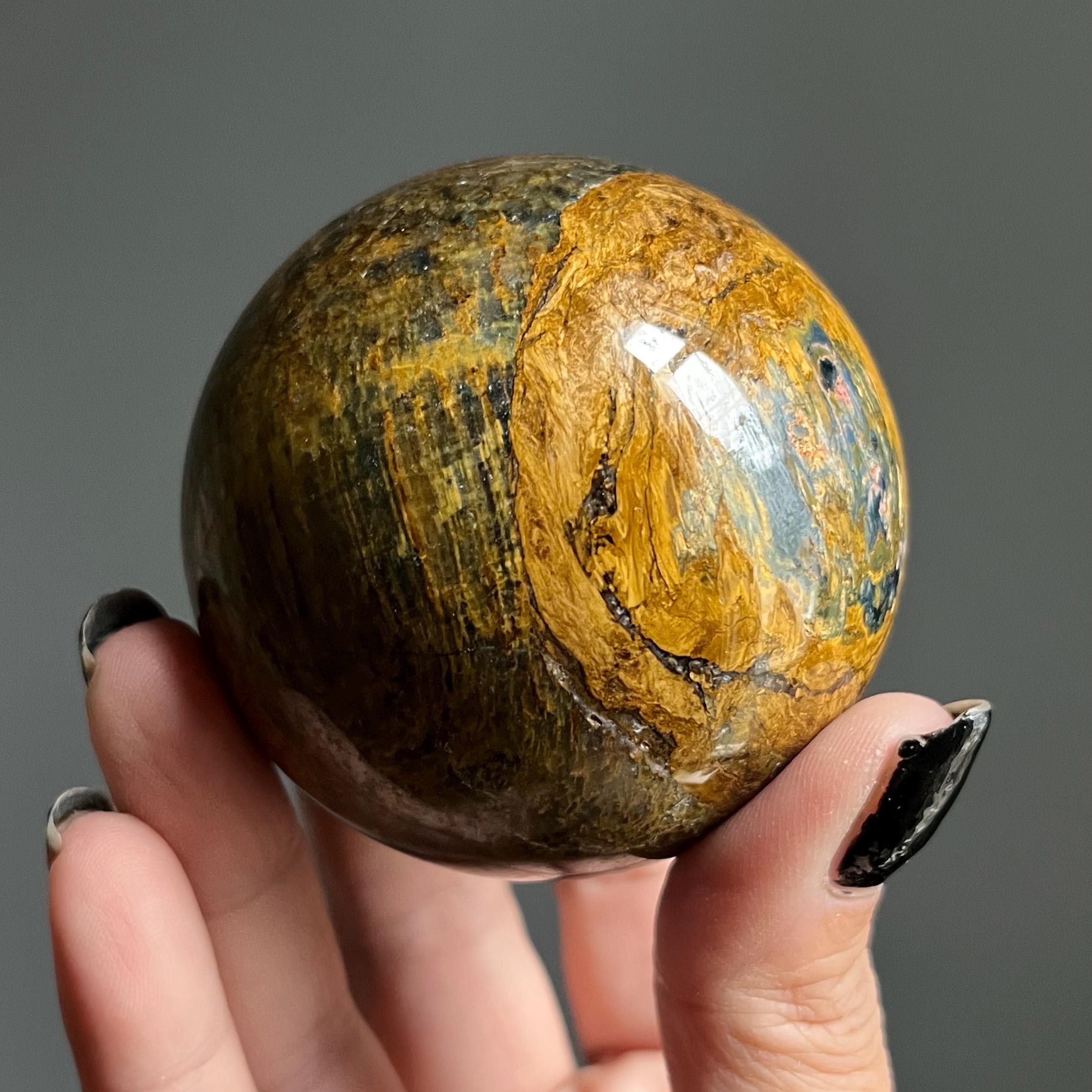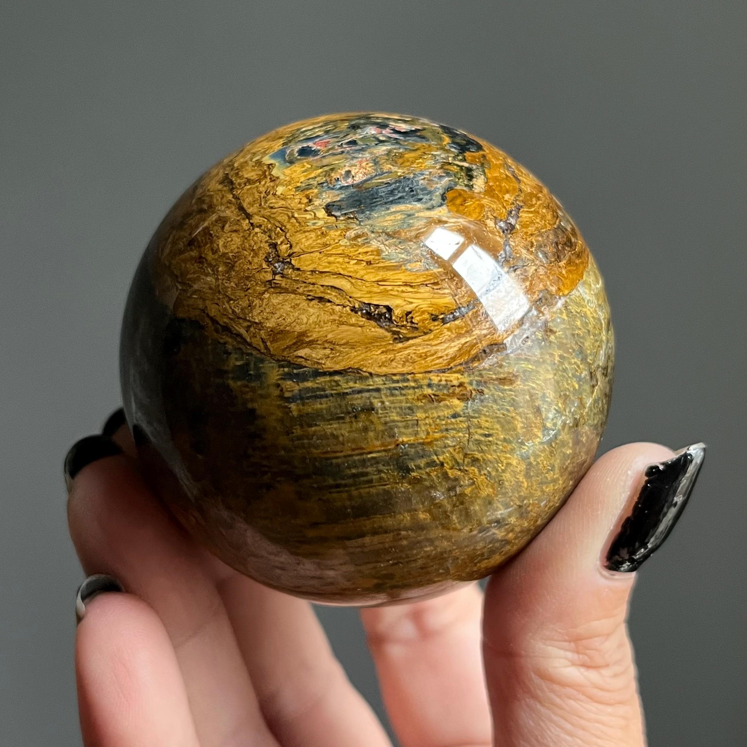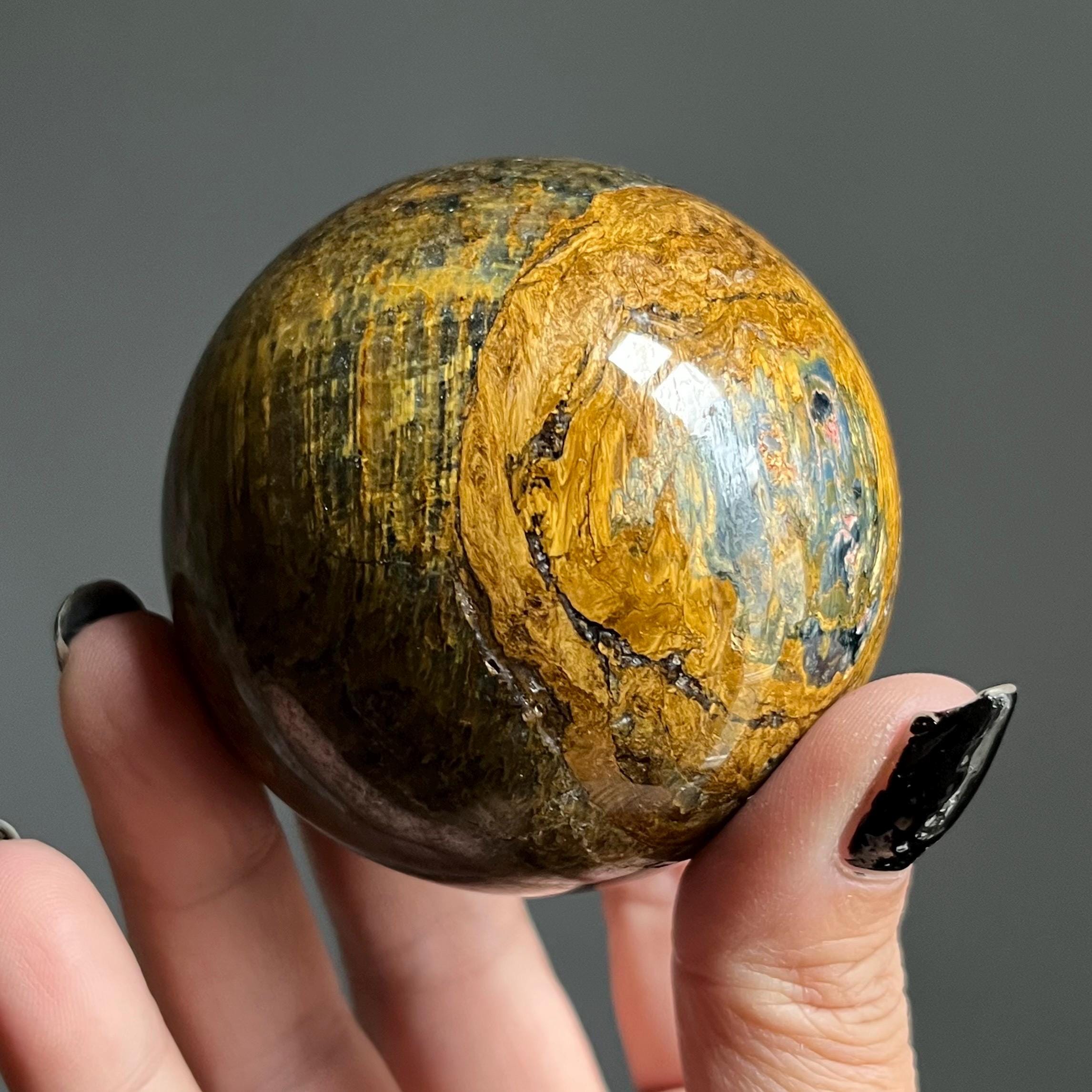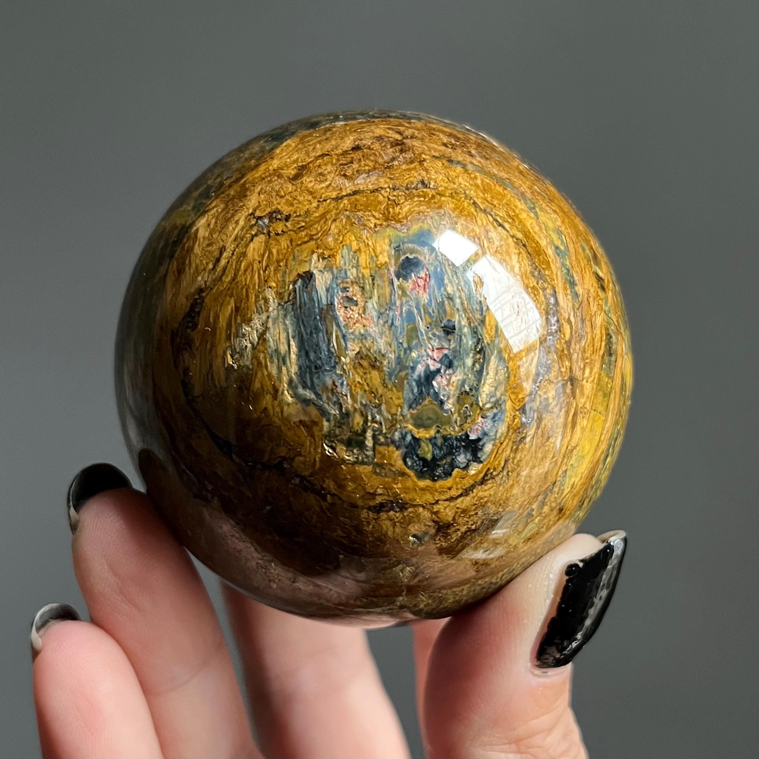 Weighing almost a pound, this large crystal sphere steps forward with brilliant chatoyant blue pietersite inclusions, the rarest manifestation of this extraordinary crystal being.