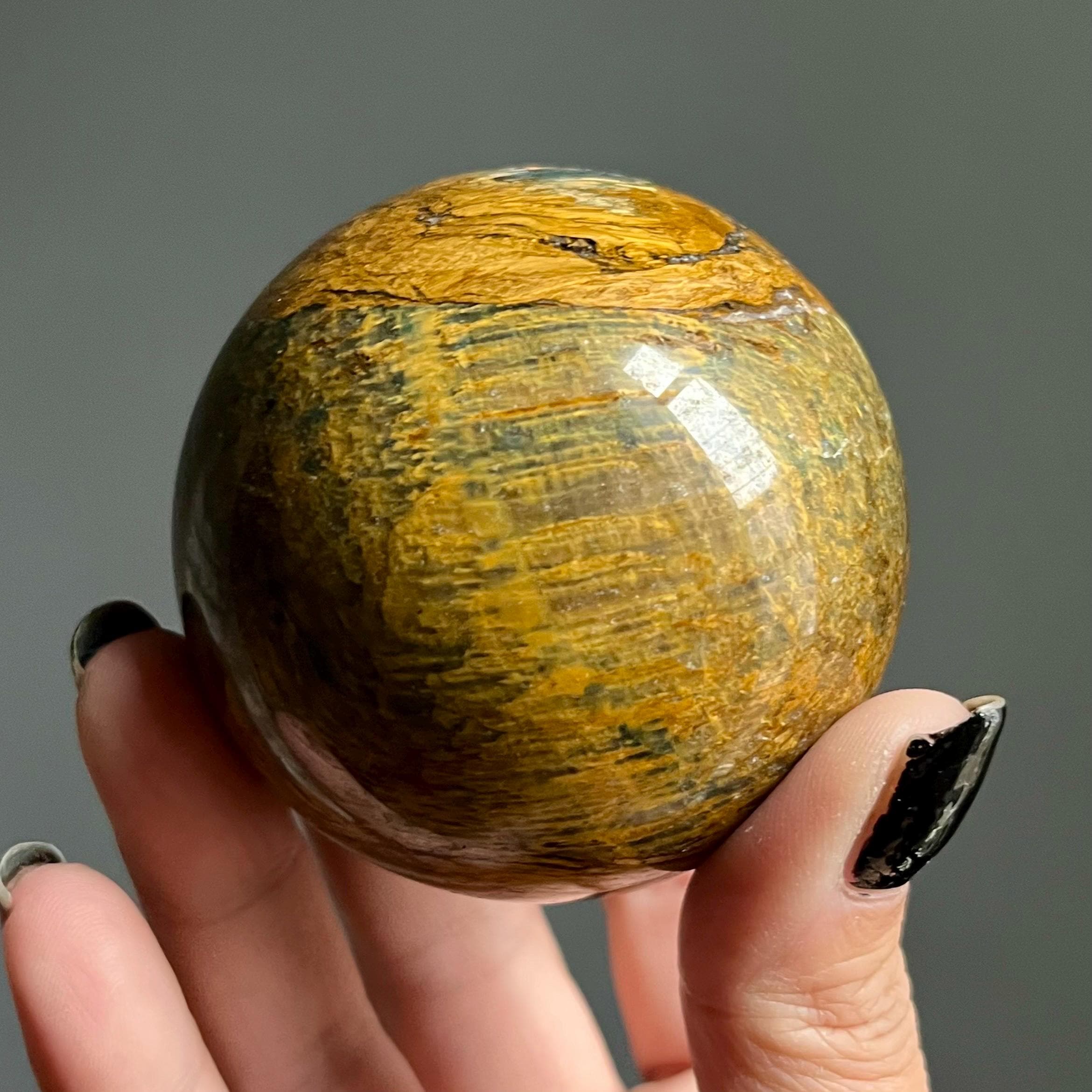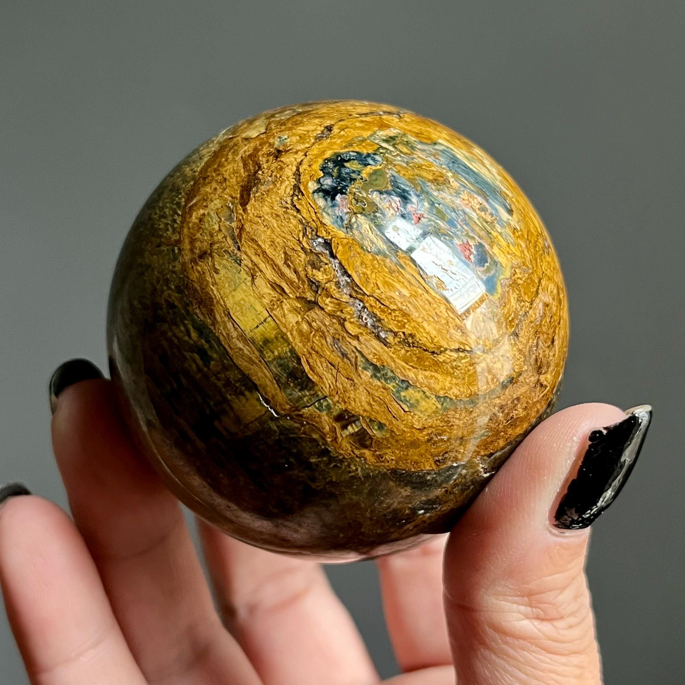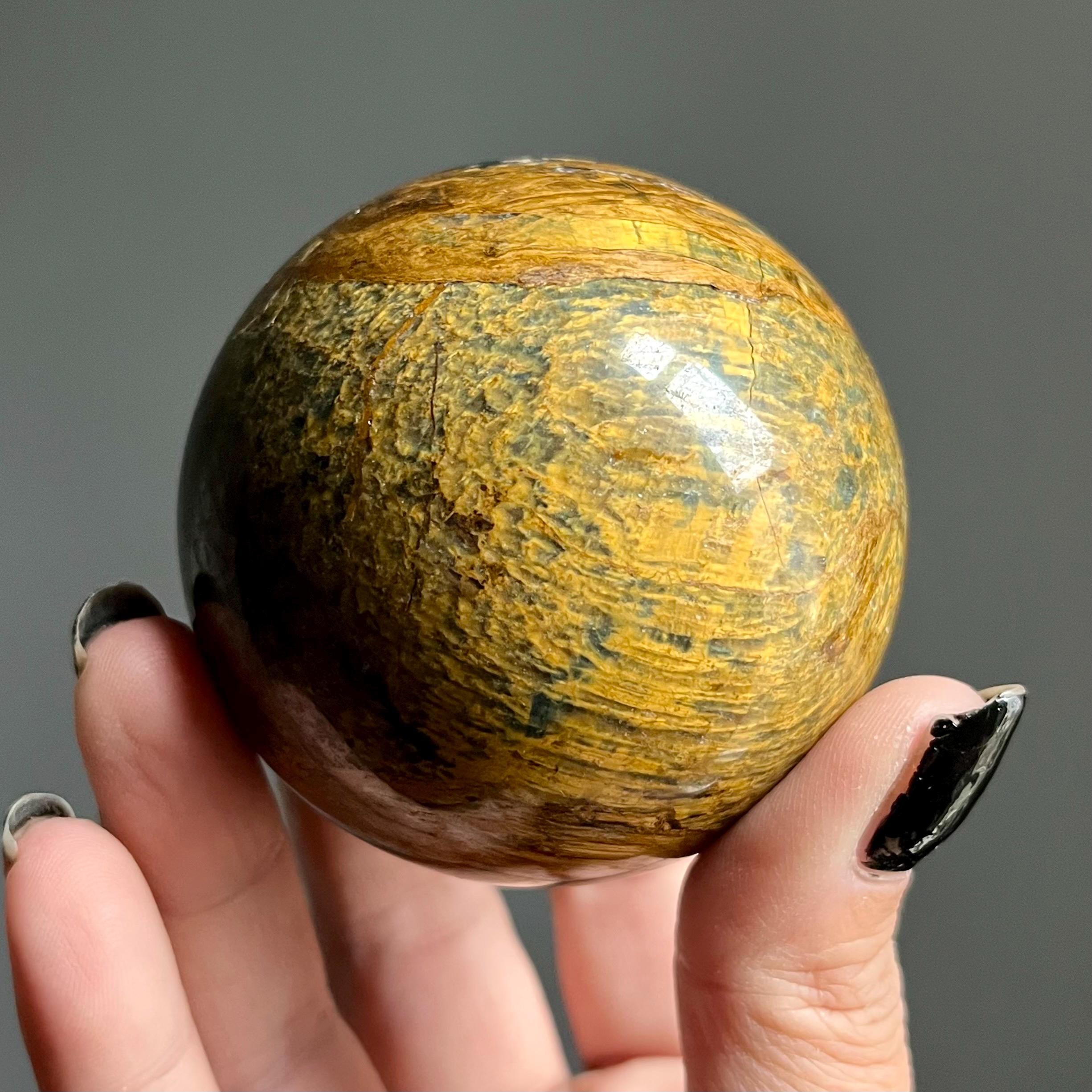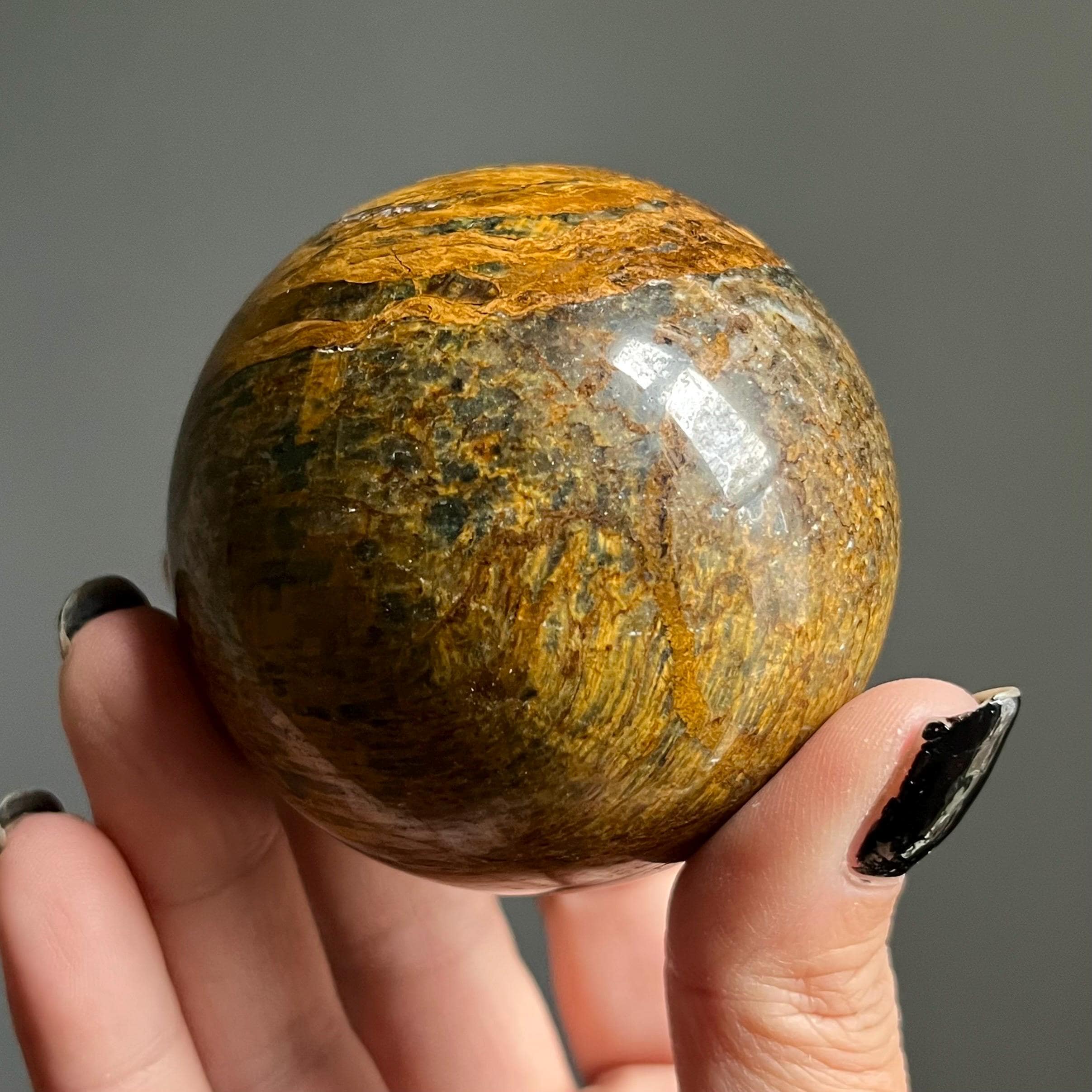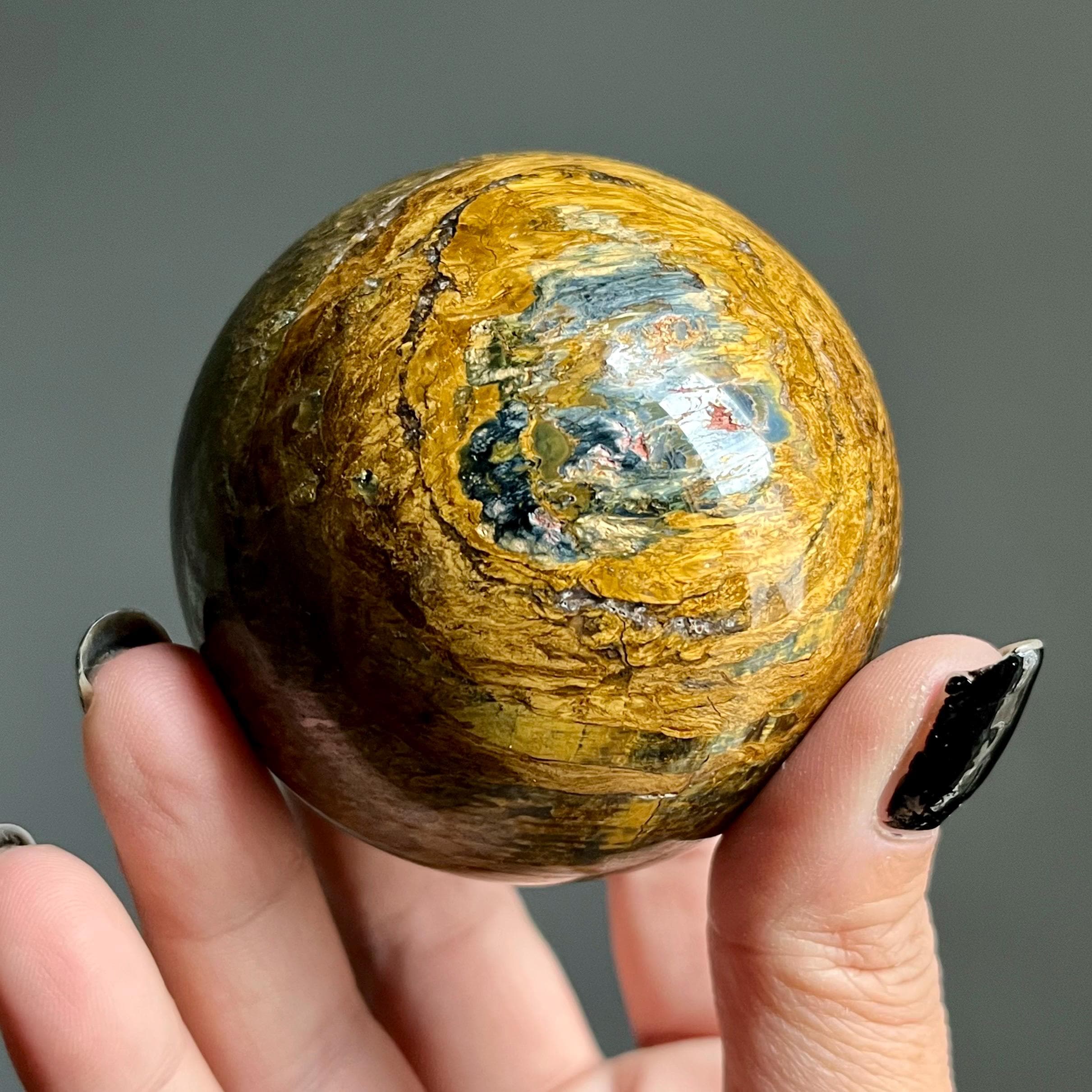 Weighing almost a pound, this large crystal sphere steps forward with brilliant chatoyant blue pietersite inclusions, the rarest manifestation of this extraordinary crystal being.