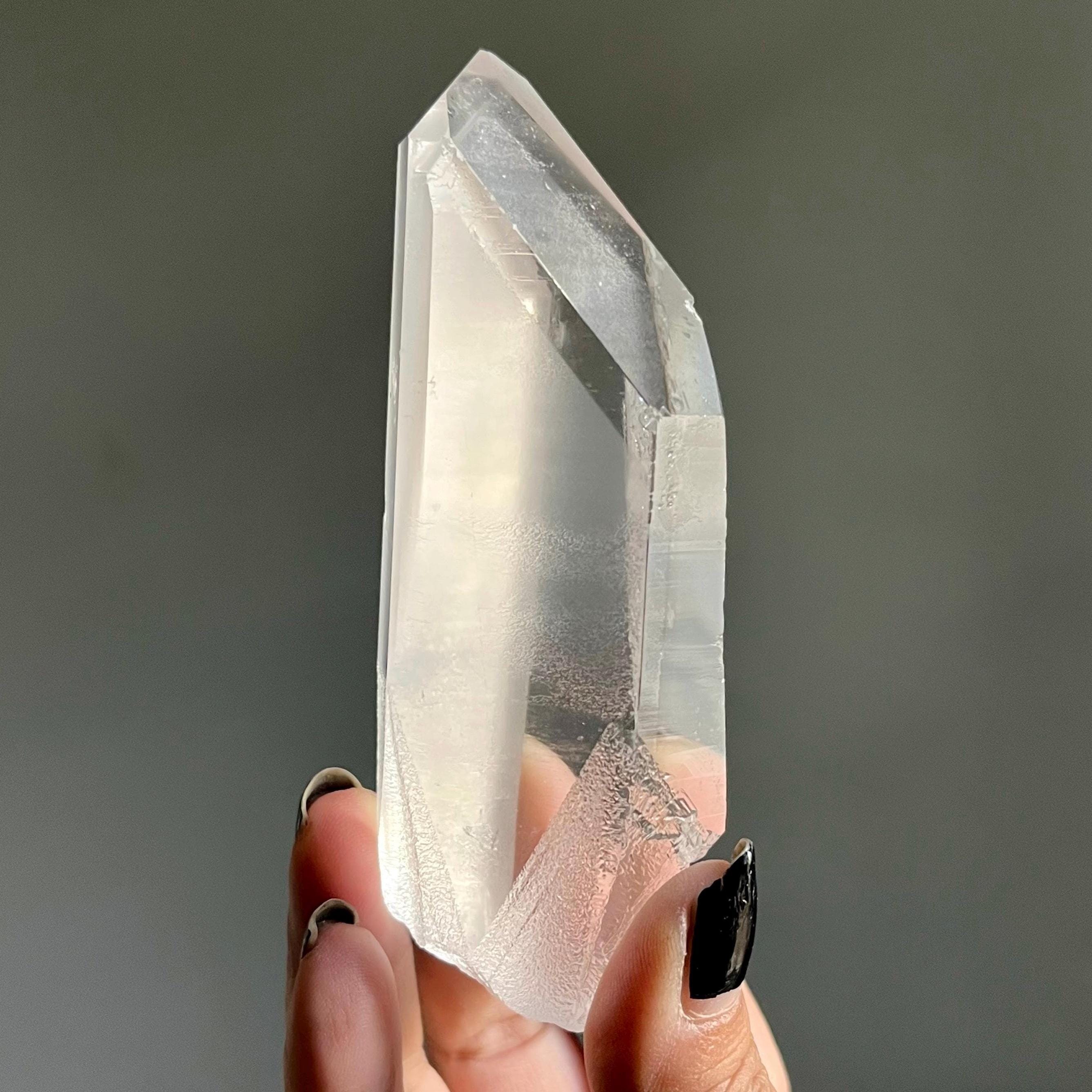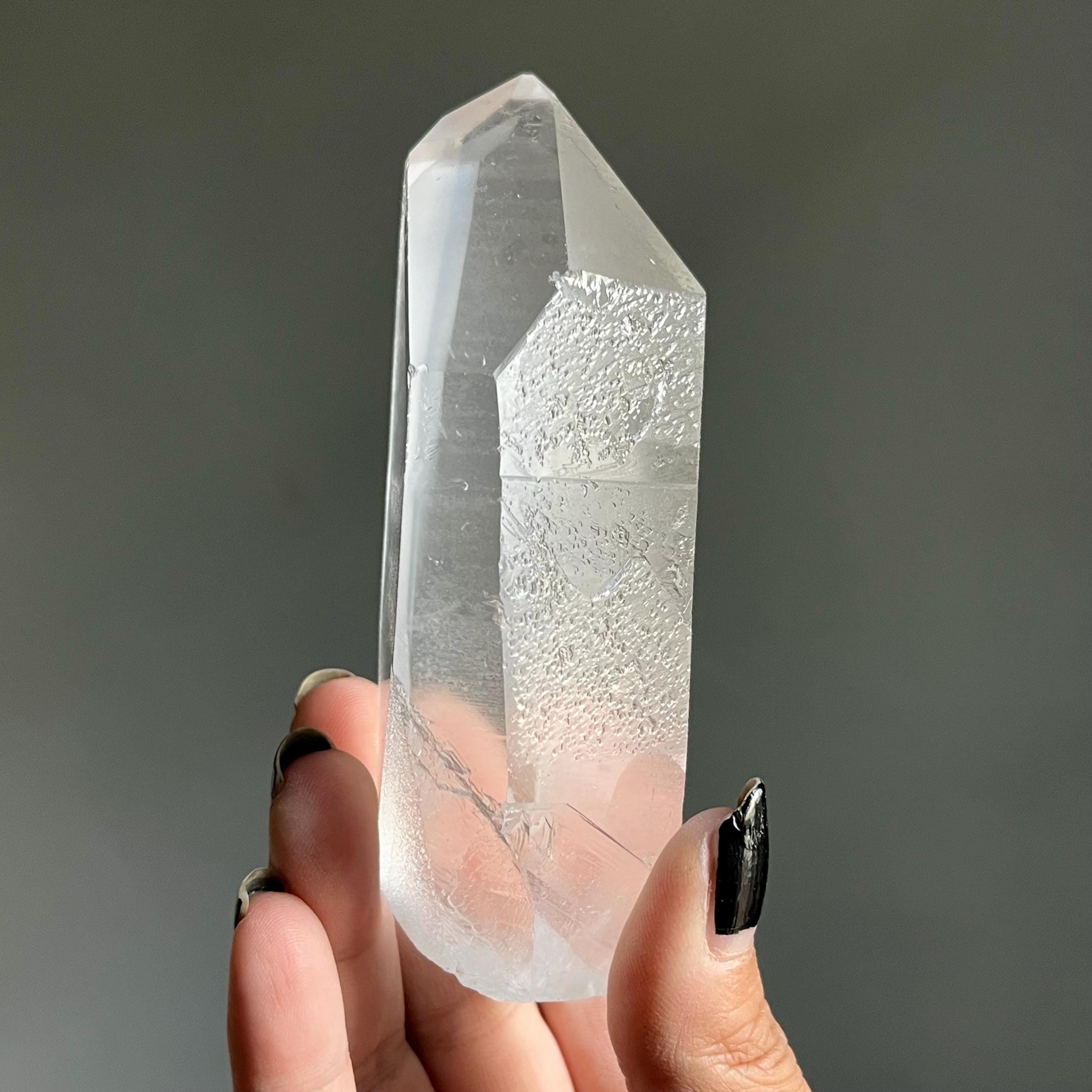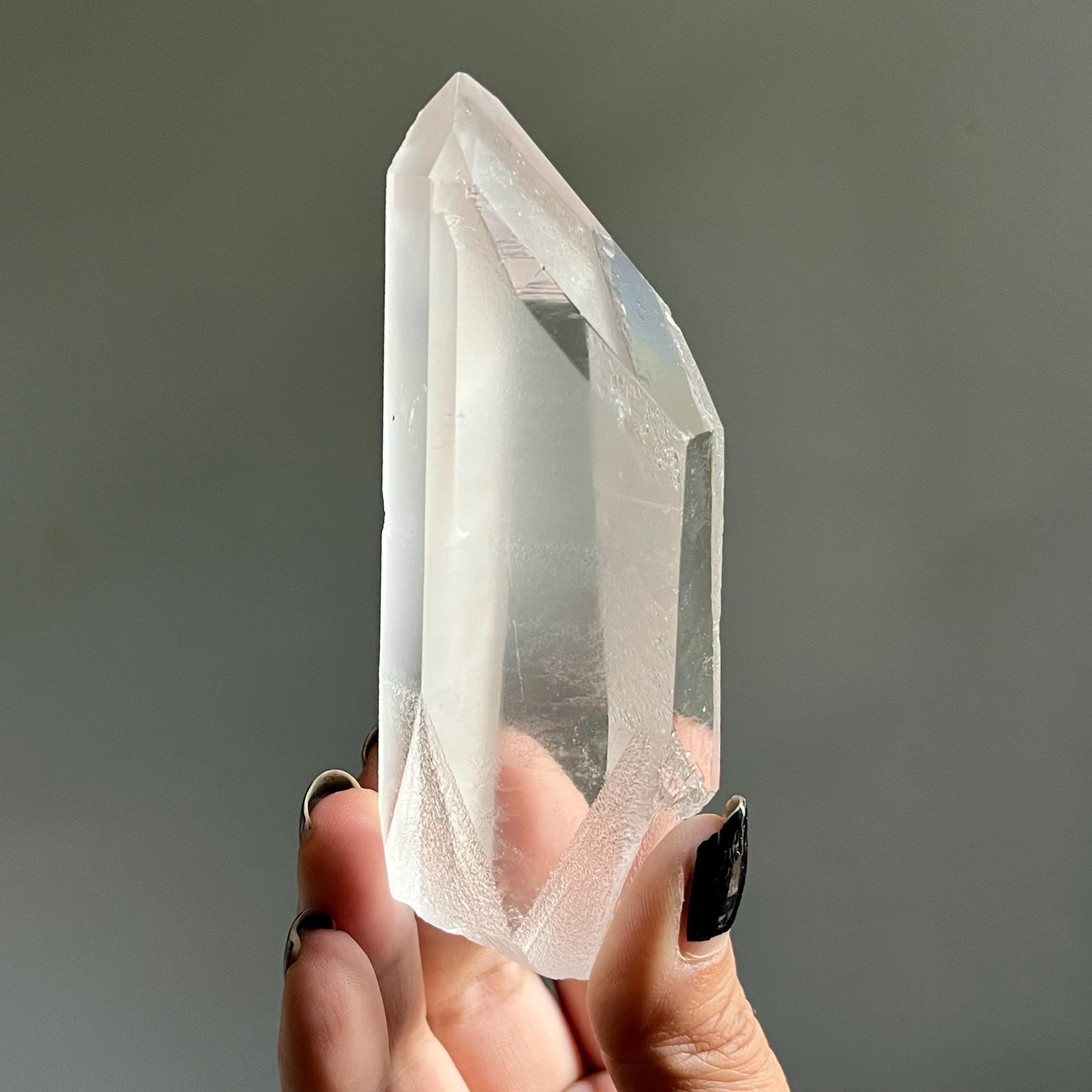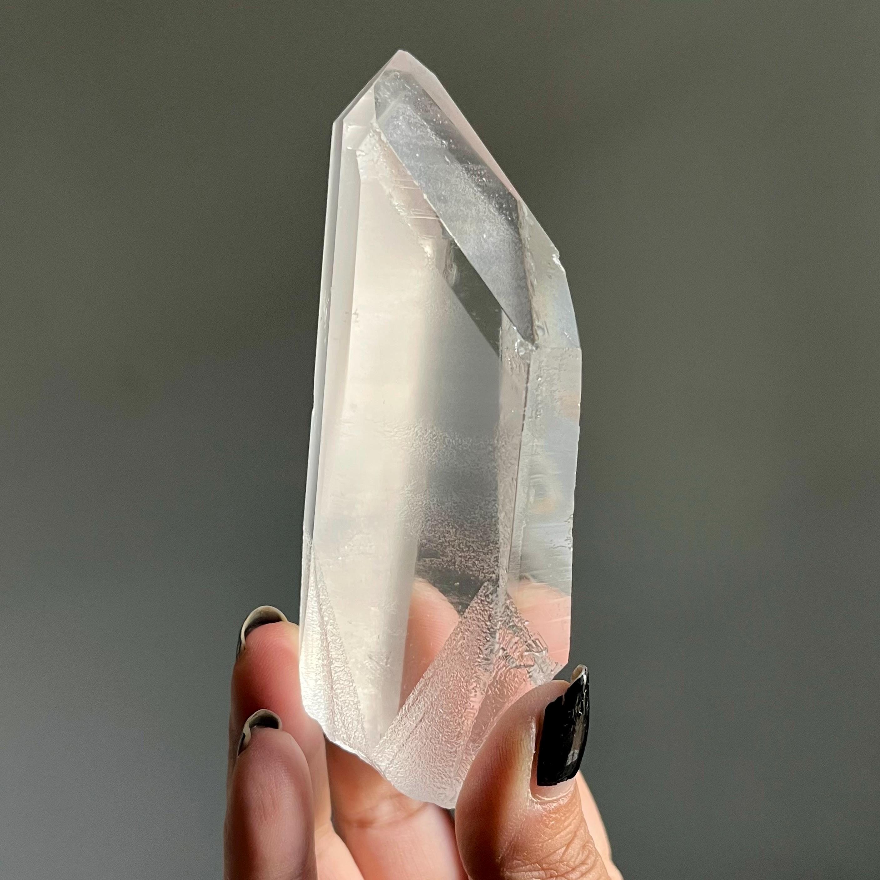 A ghost phantom traces the outline of this brilliant lemurian light crystal, the distinct star mark etchings casting shadows through water clear stone.