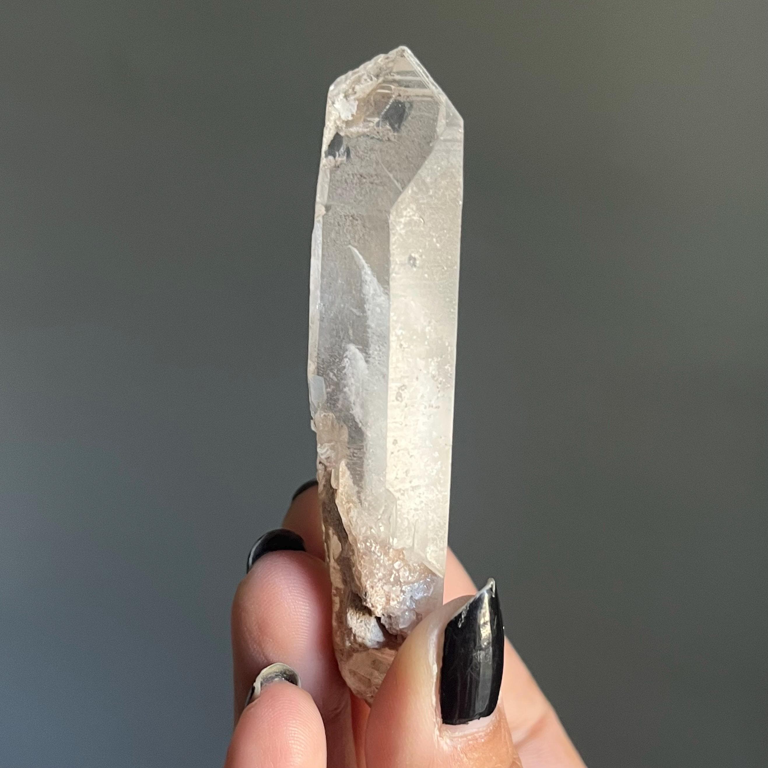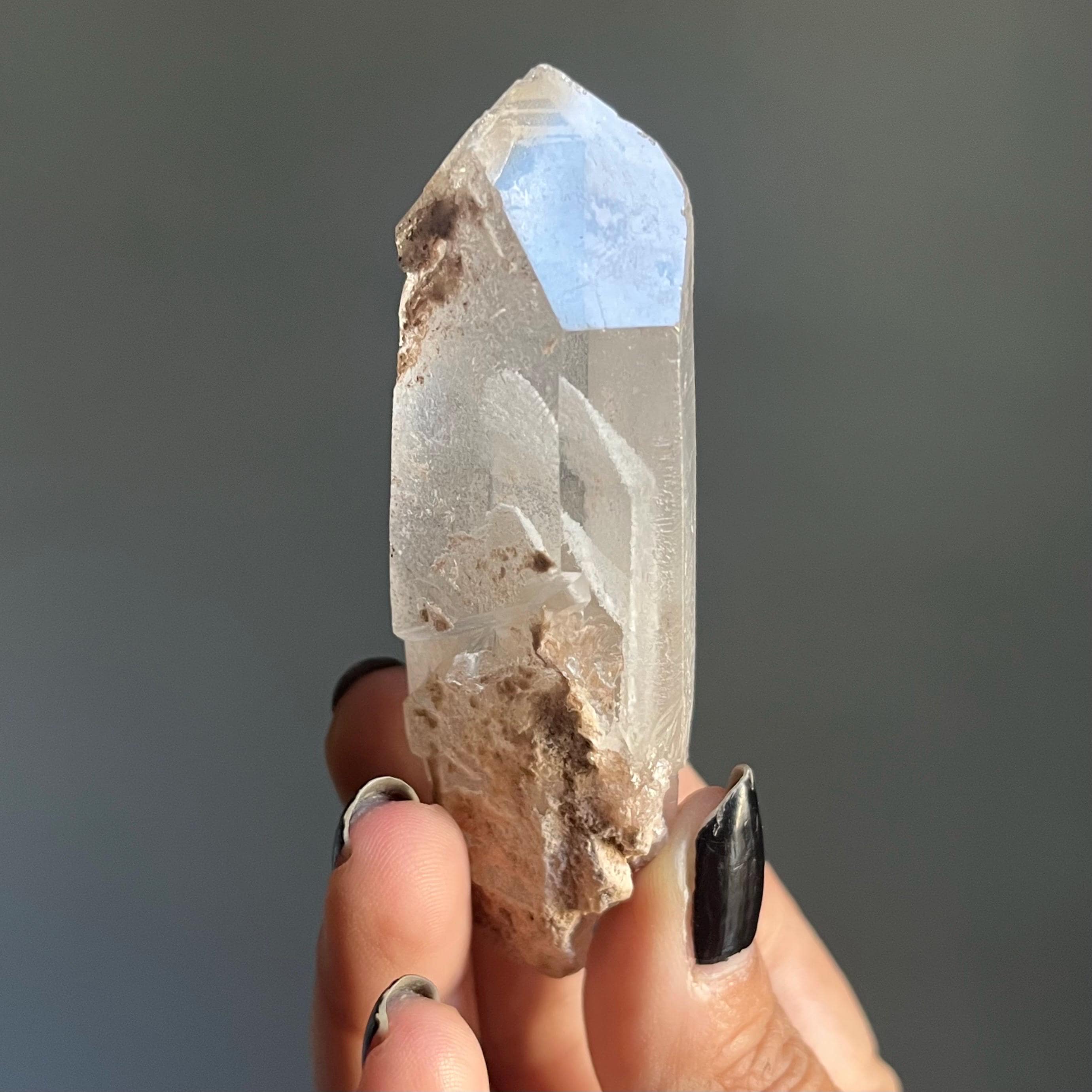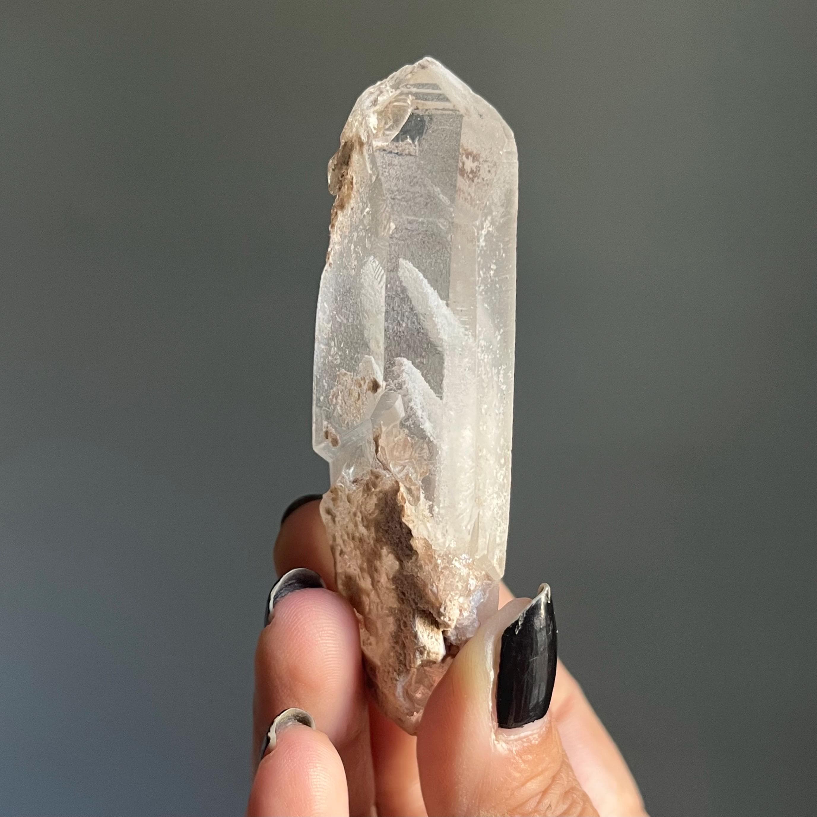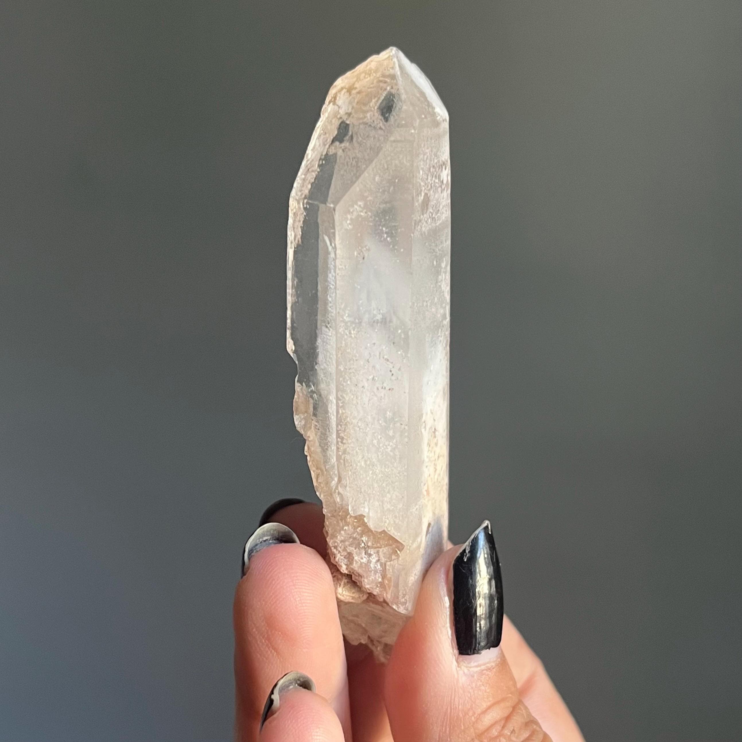 Serra do Cabral in Brazil is known for its exquisite manifestations of water clear lemurian quartz. This raw crystal point is presented exactly as it was unearthed.