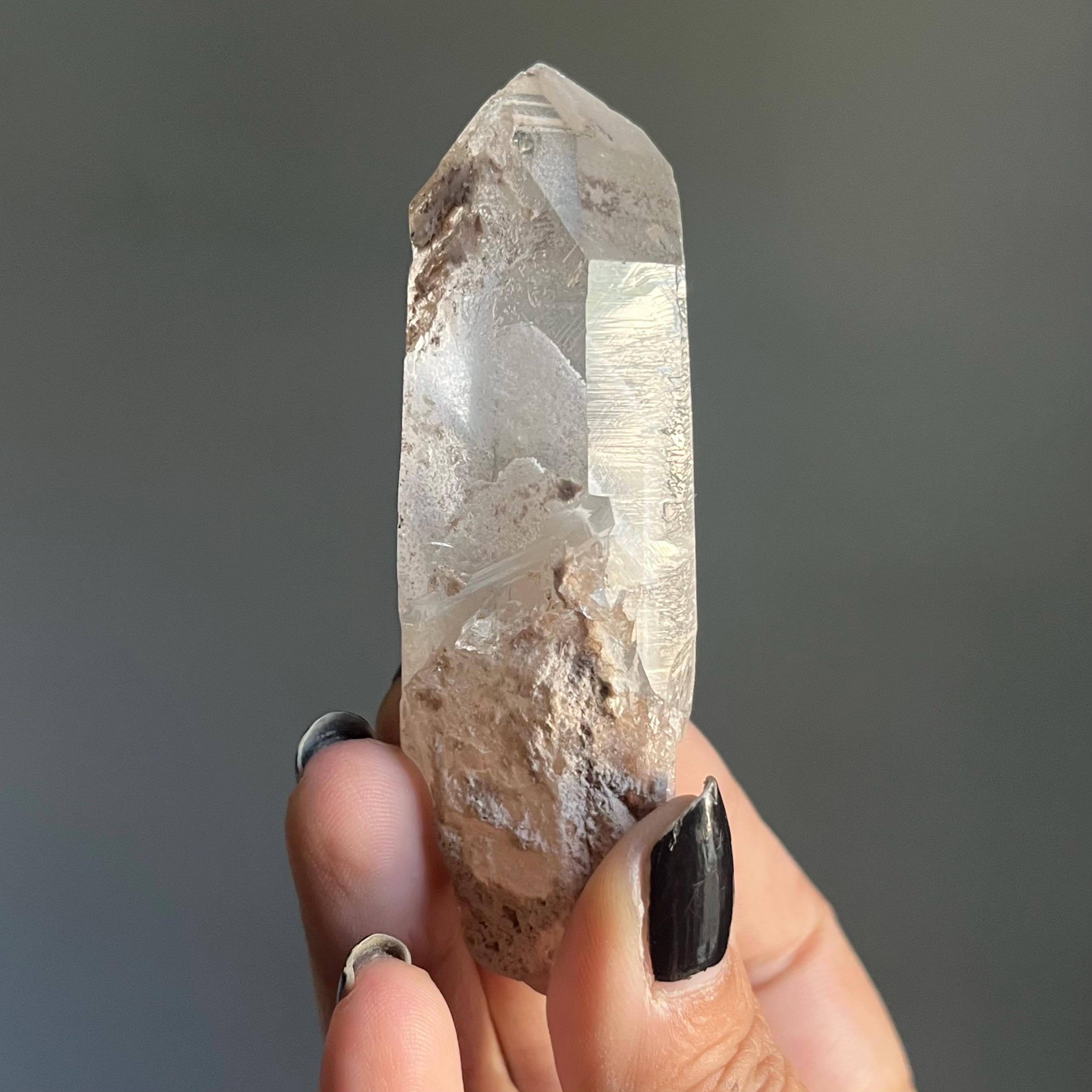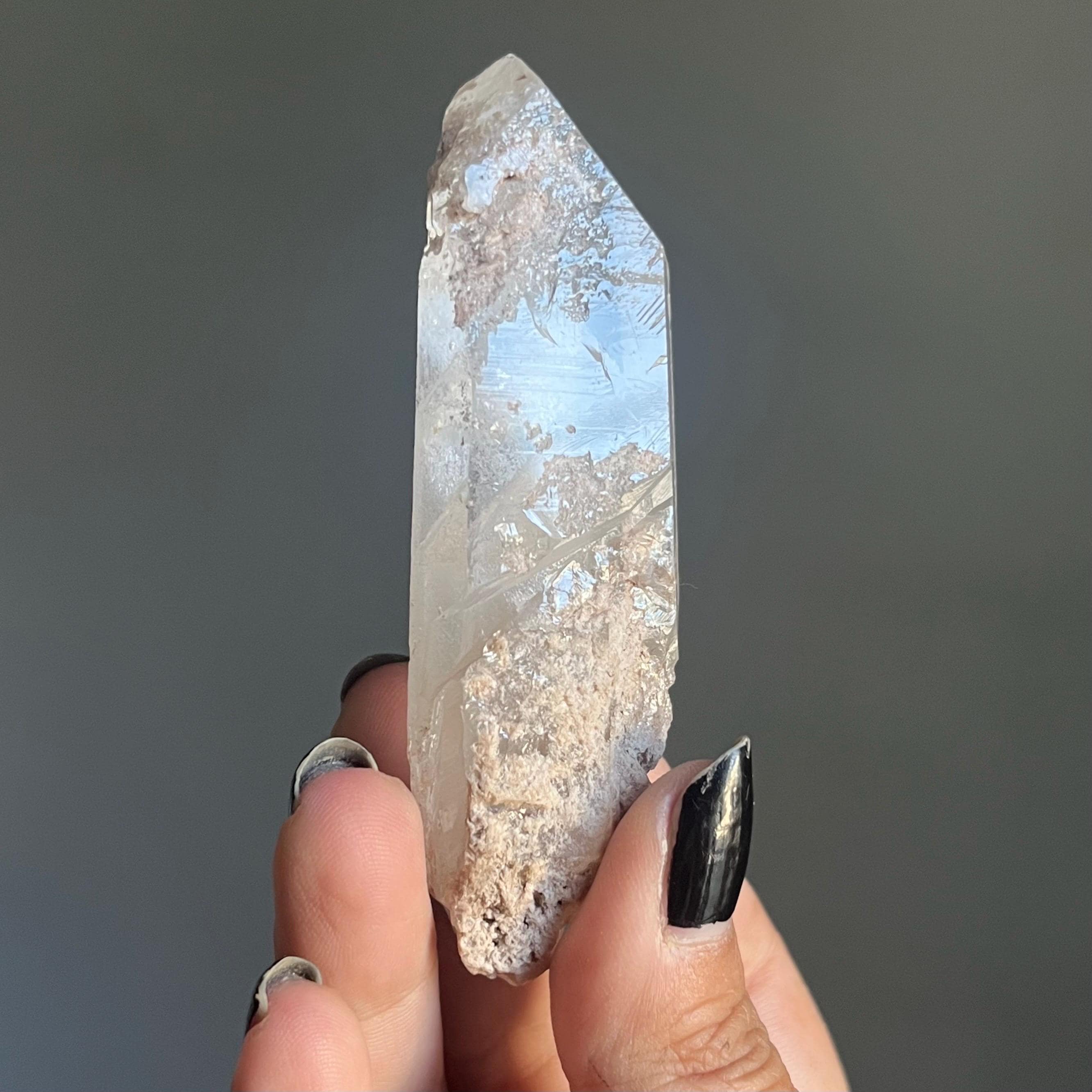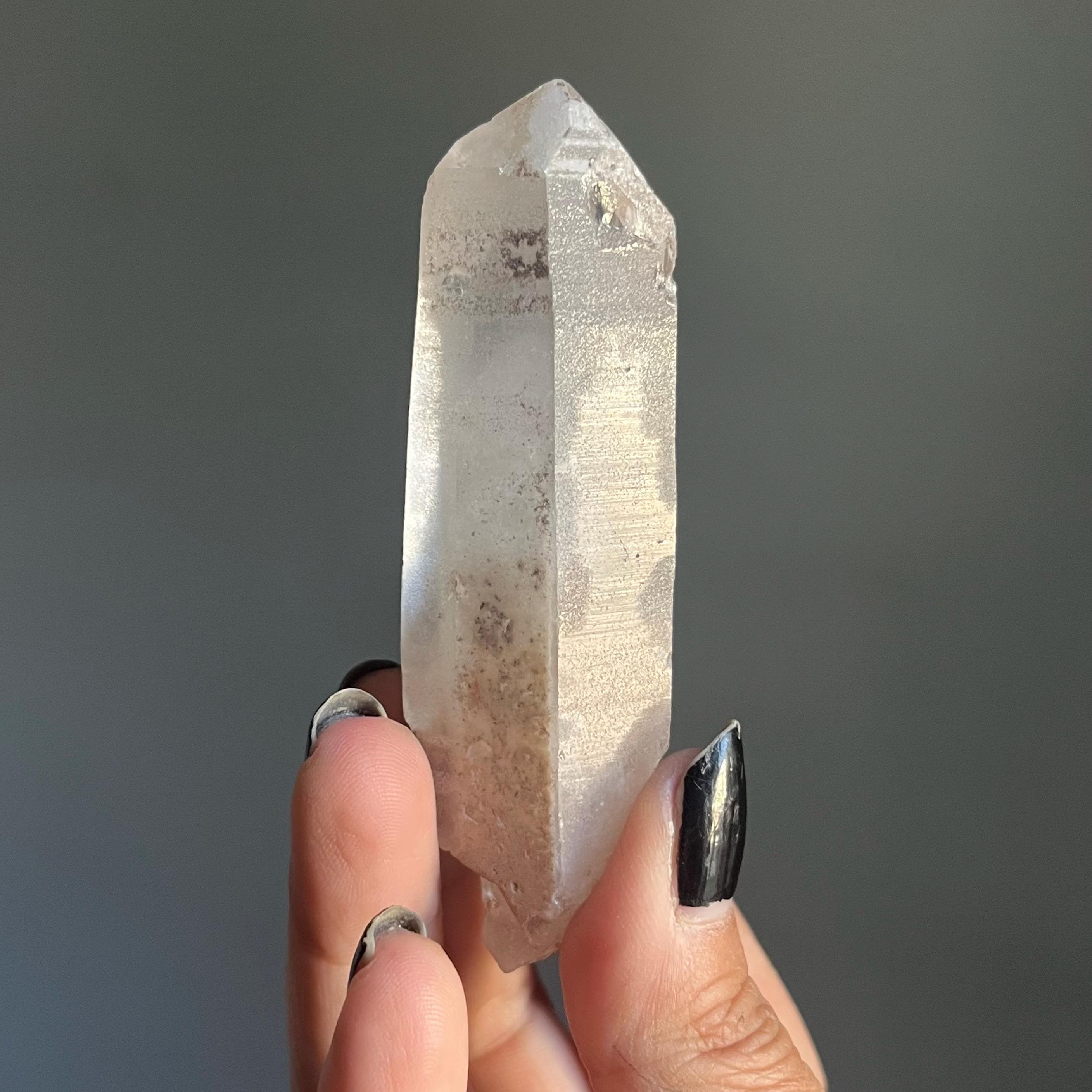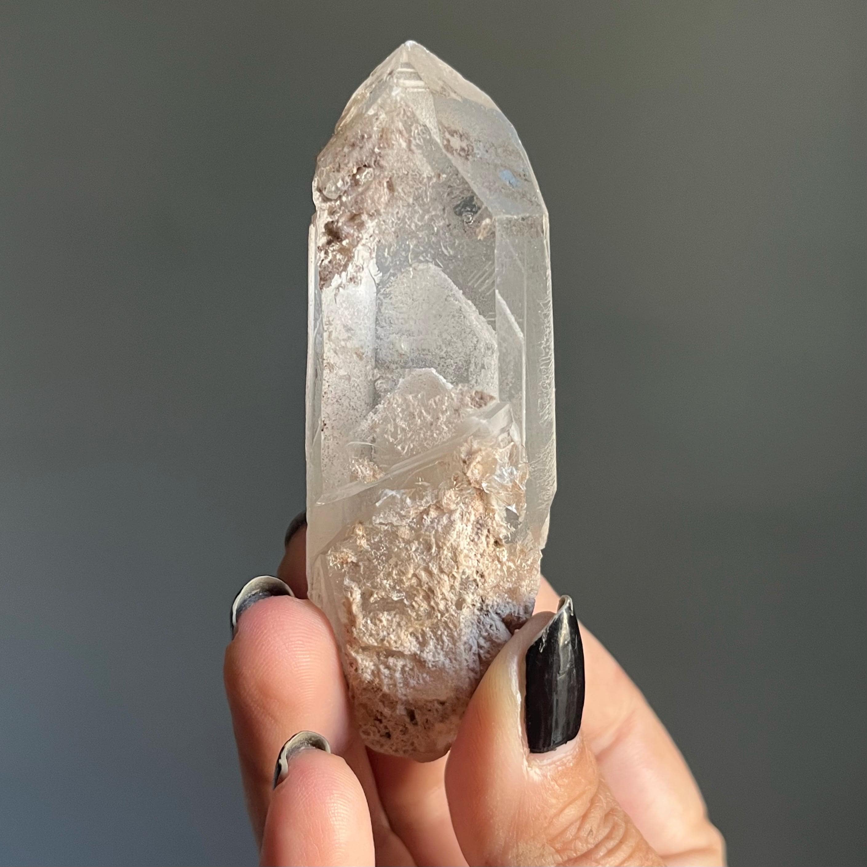 Manifesting with a rare, natural dow quartz master crystal termination, pink lithium inclusions weave throughout this raw lemurian.