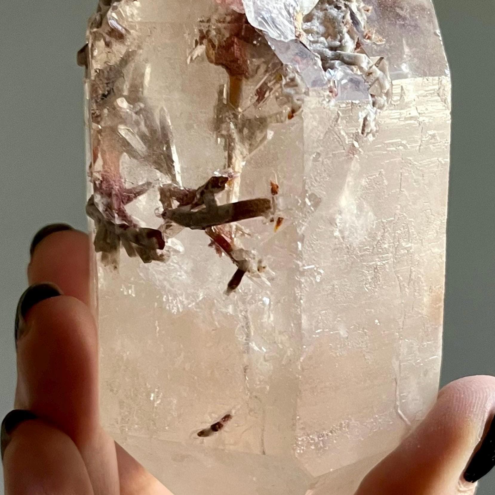 Gray lithium and red phantoms move up this wild expression of lemurian quartz, the quartz itself illuminating in soft smoky citrine hues.