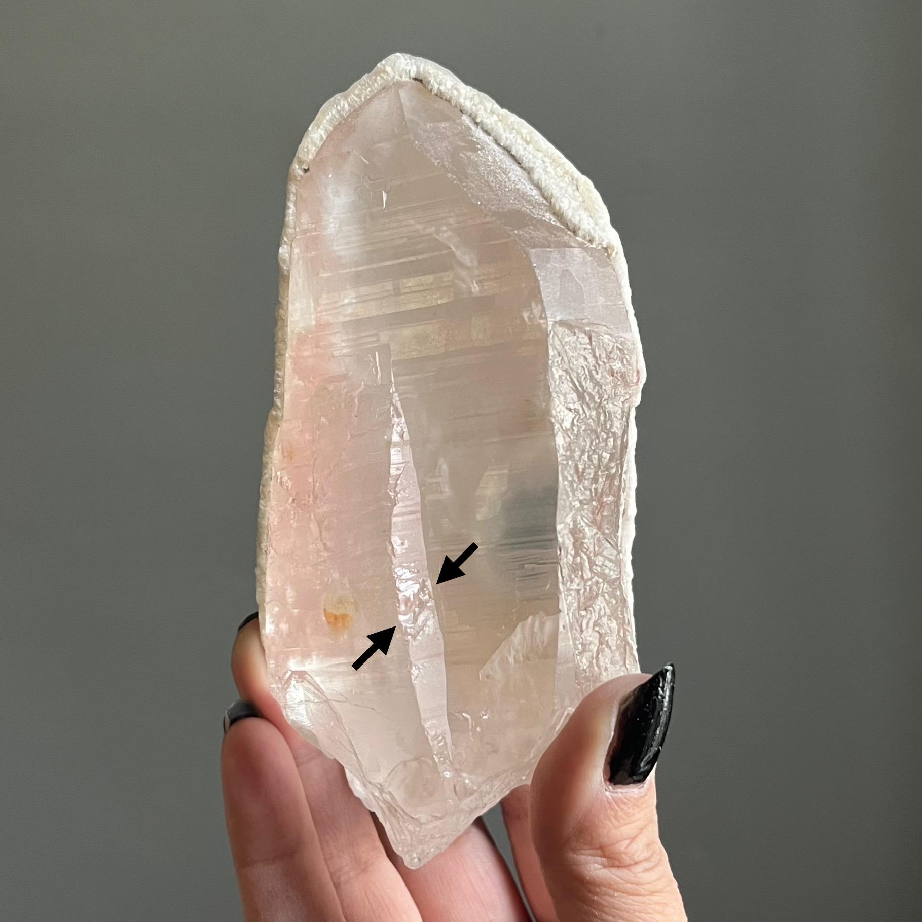 This large, rare pink dreamsicle lemurian quartz crystal manifests with a wild lightning strike inclusion and a natural, partially exposed channeling quartz termination.