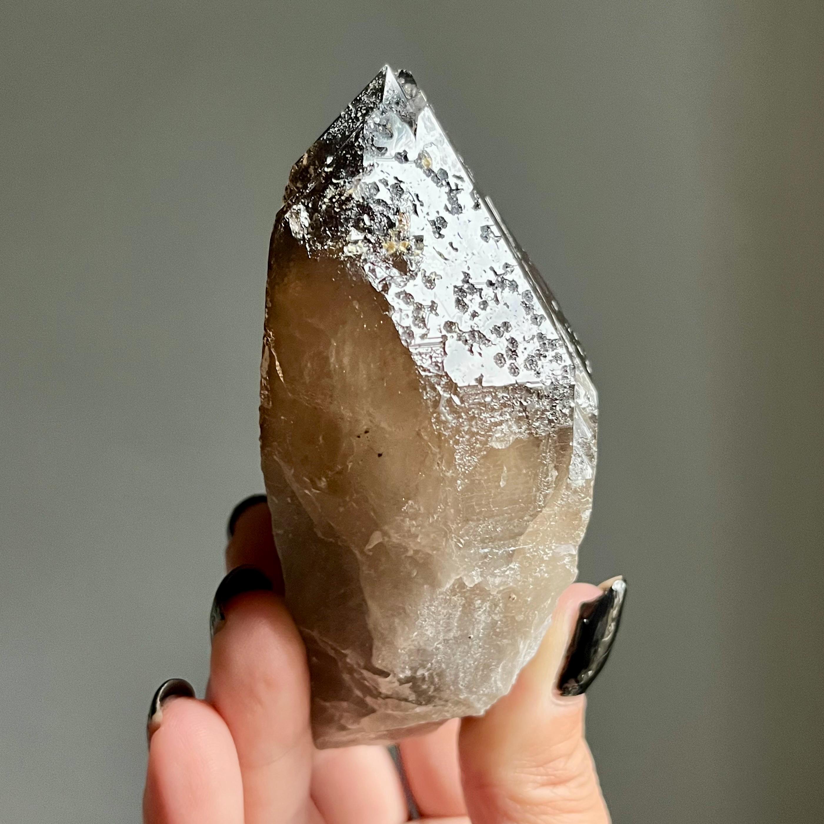 This large, wild natural smoky citrine lemurian quartz crystal point manifests with an extraordinary web of white amphibole phantoms woven throughout.