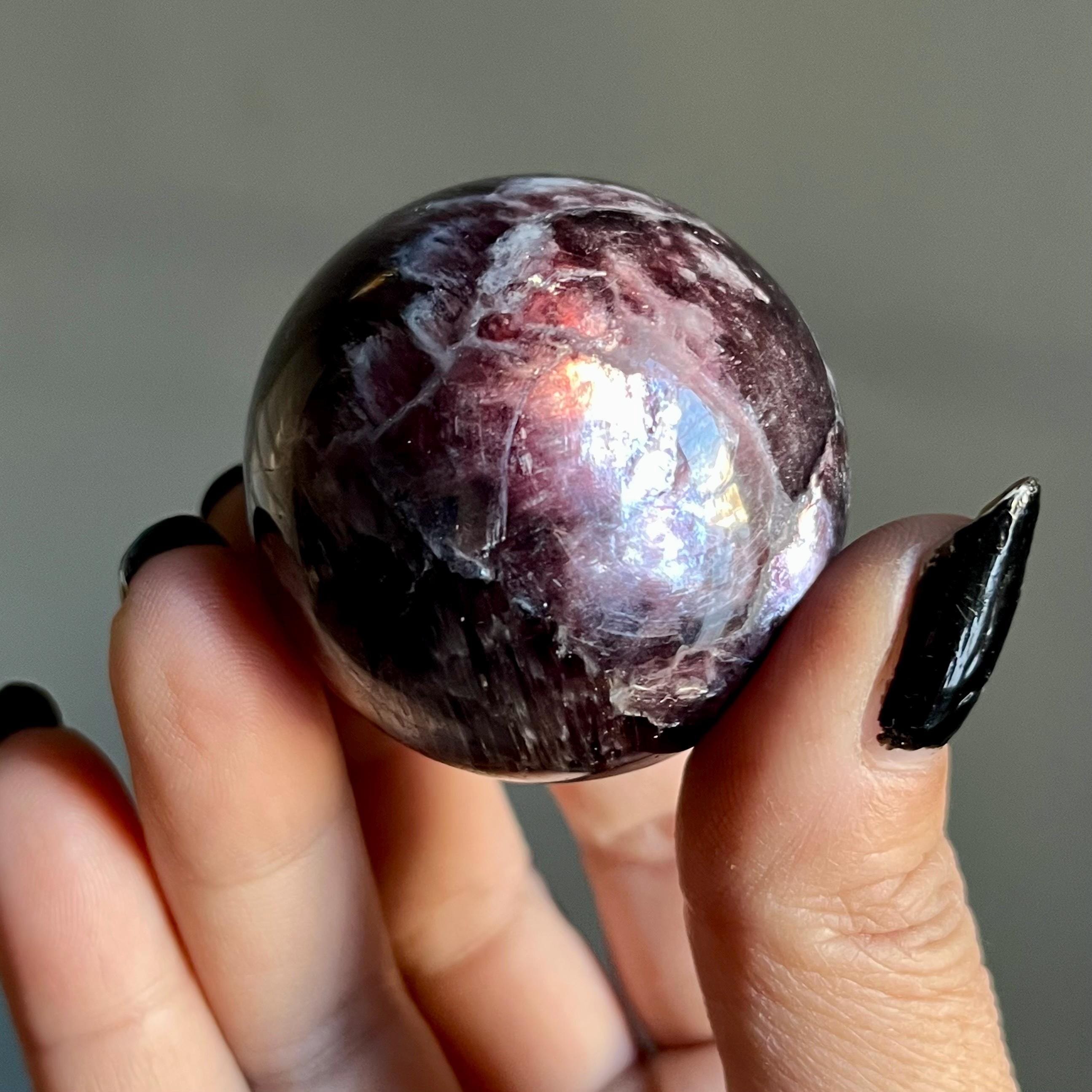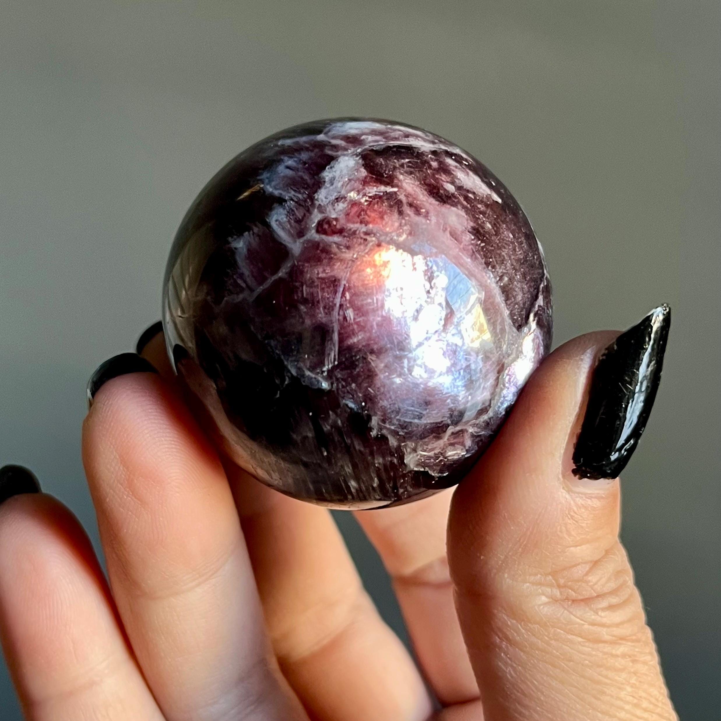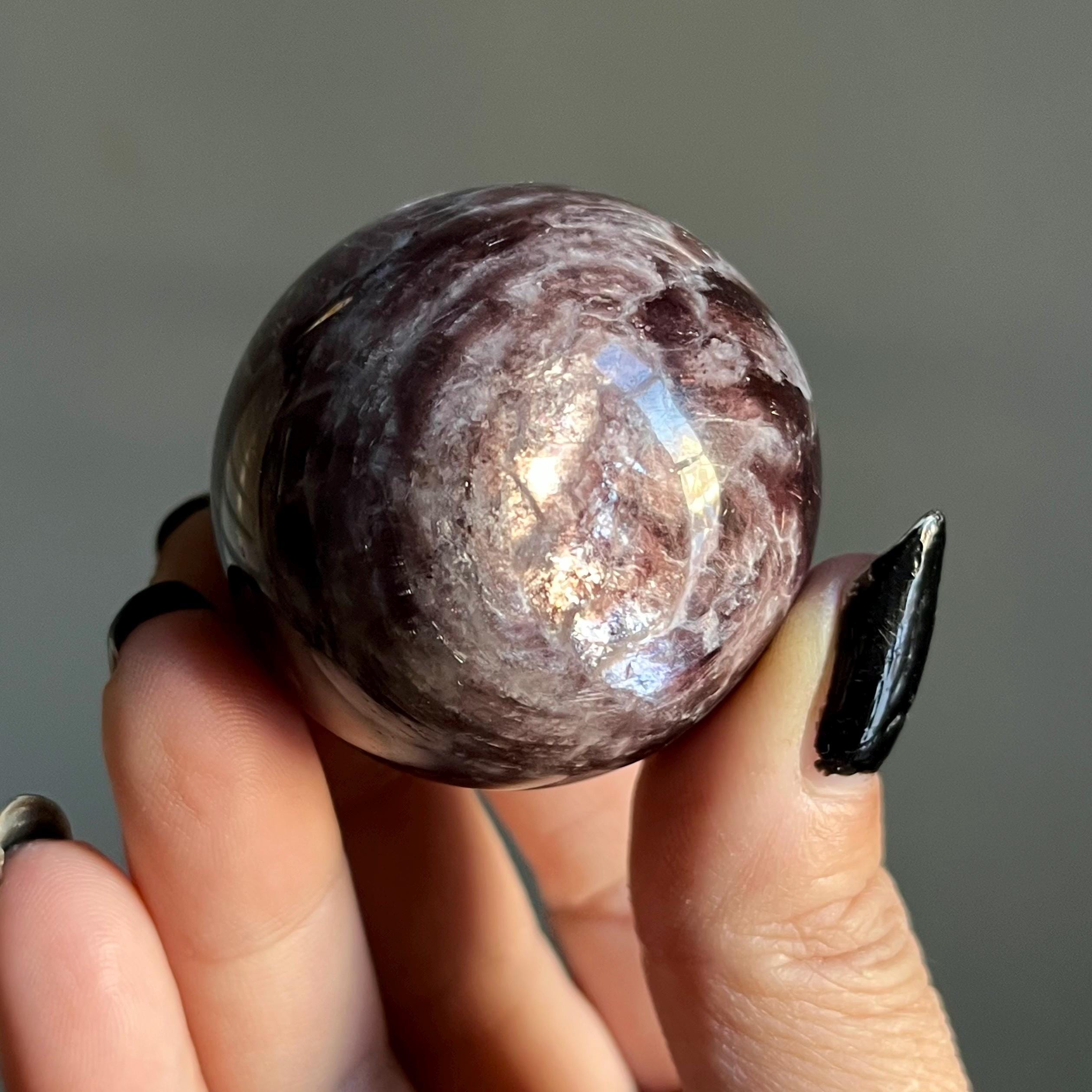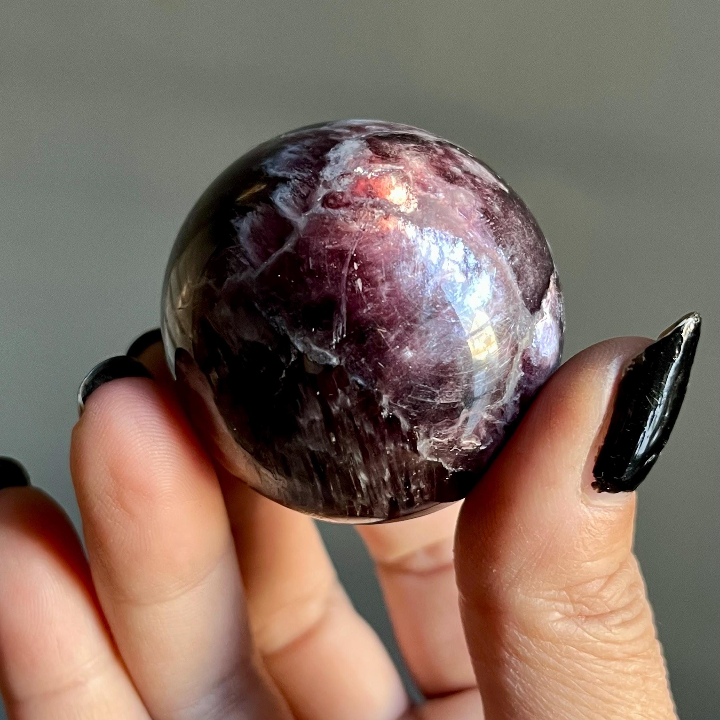 This high quality gem lepidolite mica crystal sphere manifests in rare form, the fire of rich purple mica flashes in a cacophony of colored flames, rare ruby red lepidolite shimmer, radiating from the center of this wild stone.