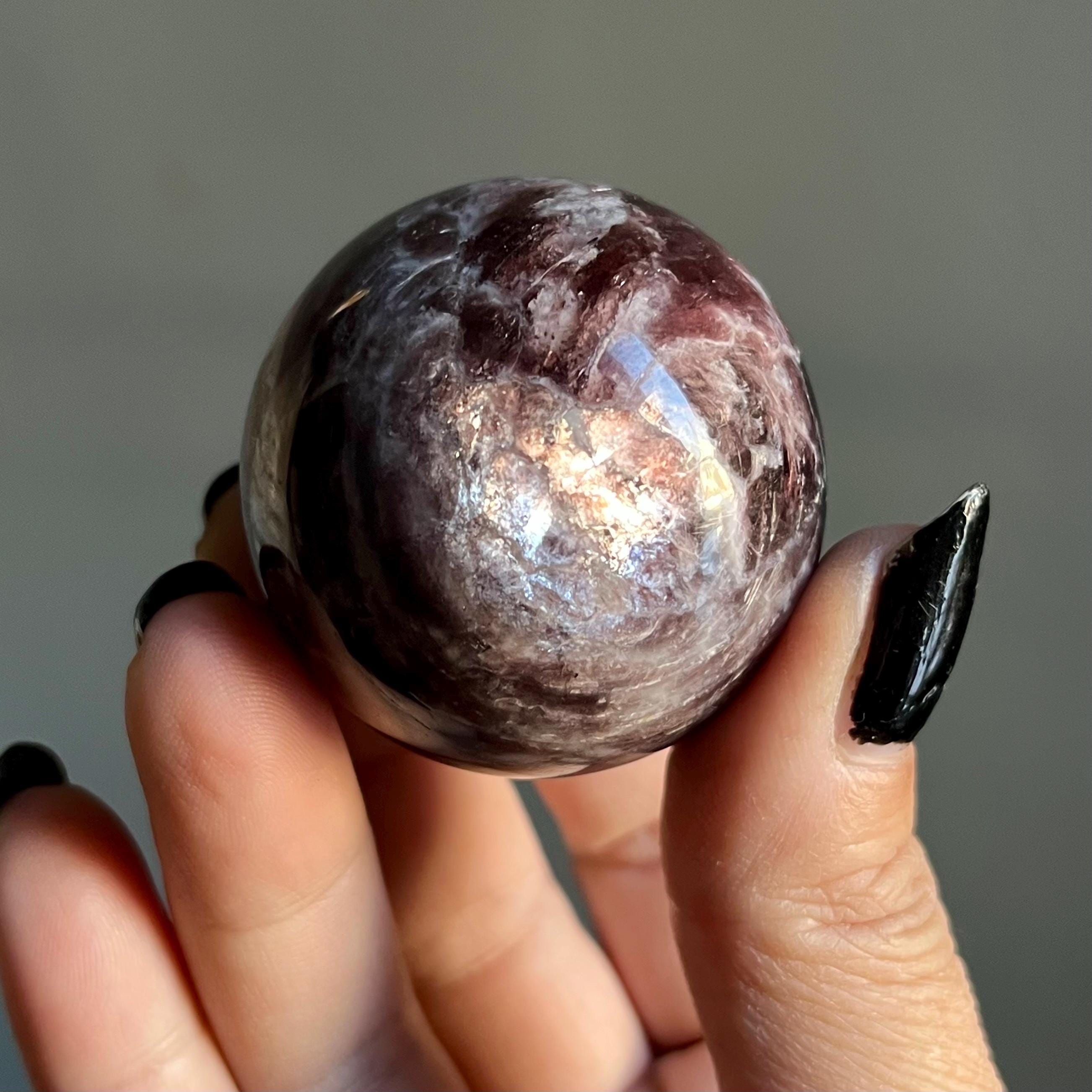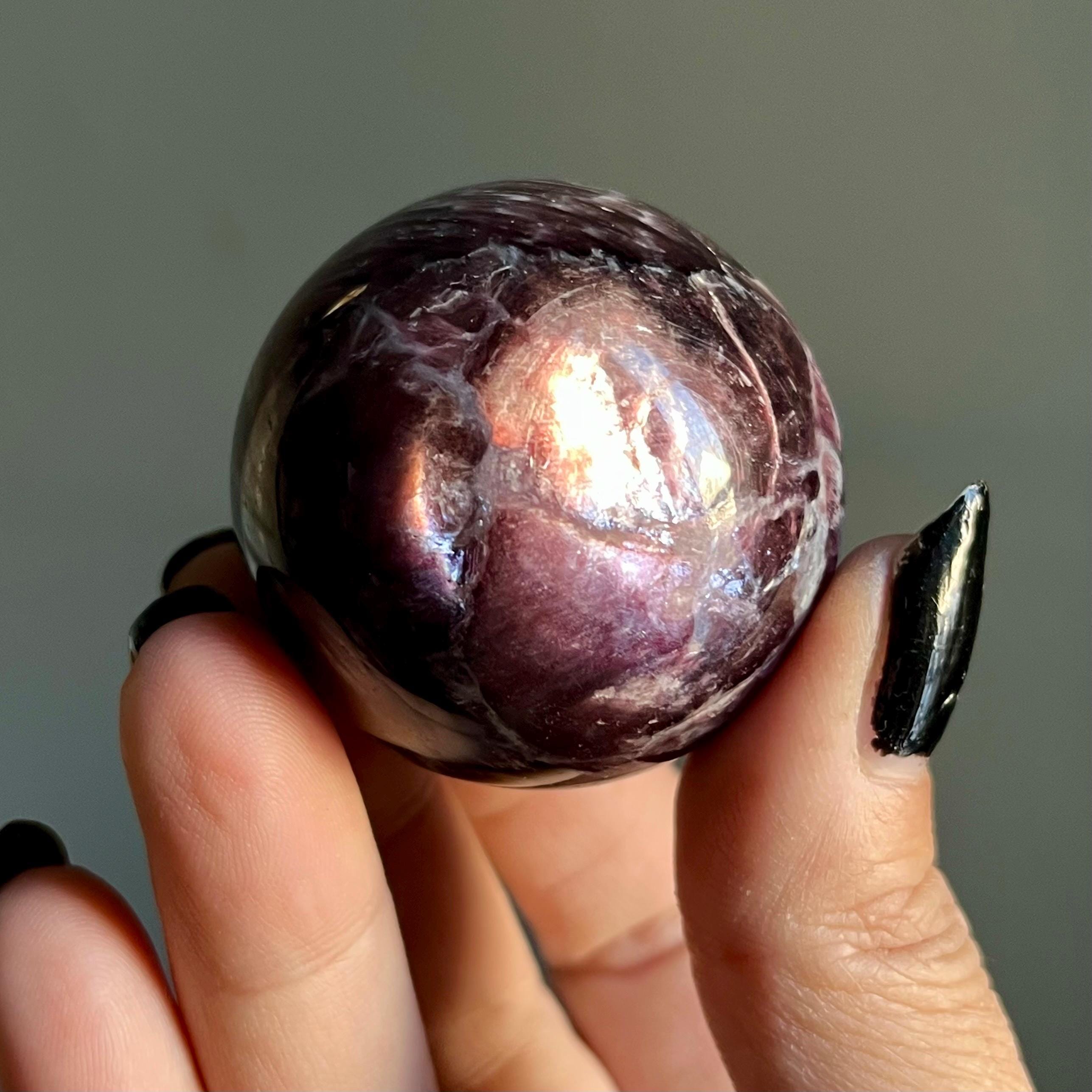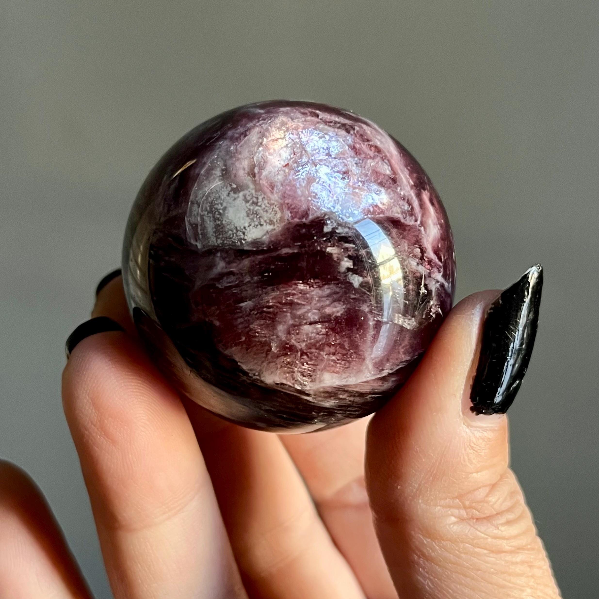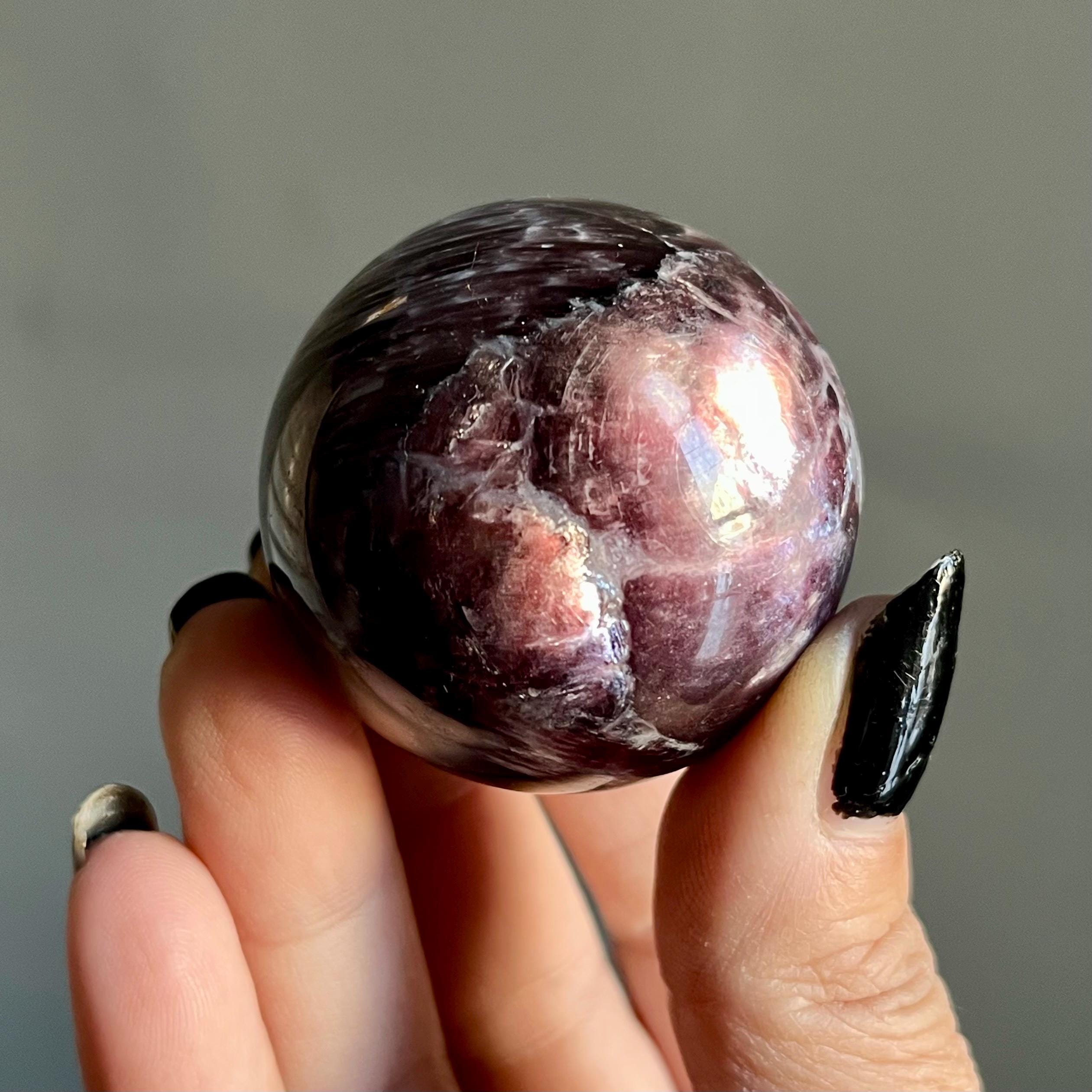 This high quality gem lepidolite mica crystal sphere manifests in rare form, the fire of rich purple mica flashes in a cacophony of colored flames, rare ruby red lepidolite shimmer, radiating from the center of this wild stone.