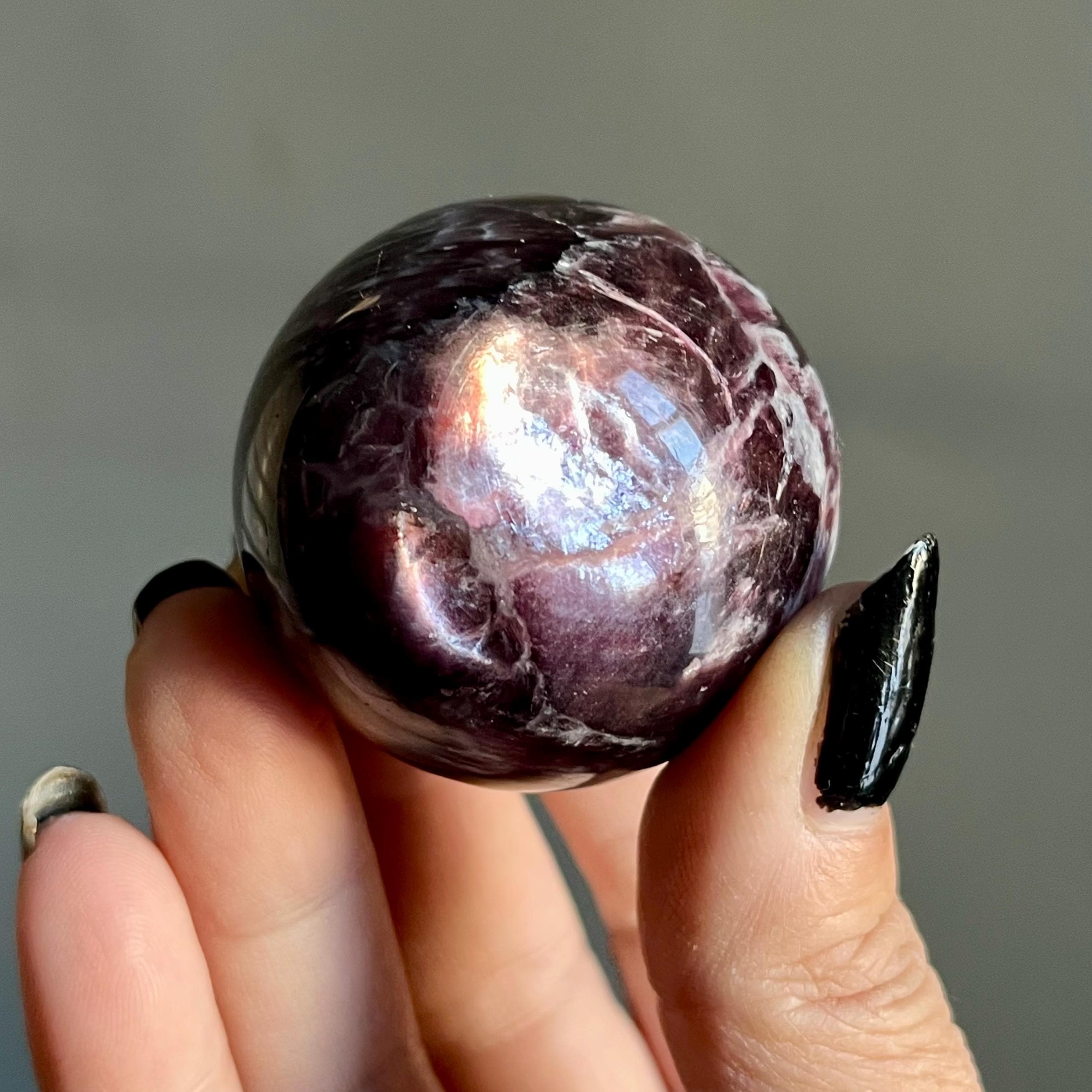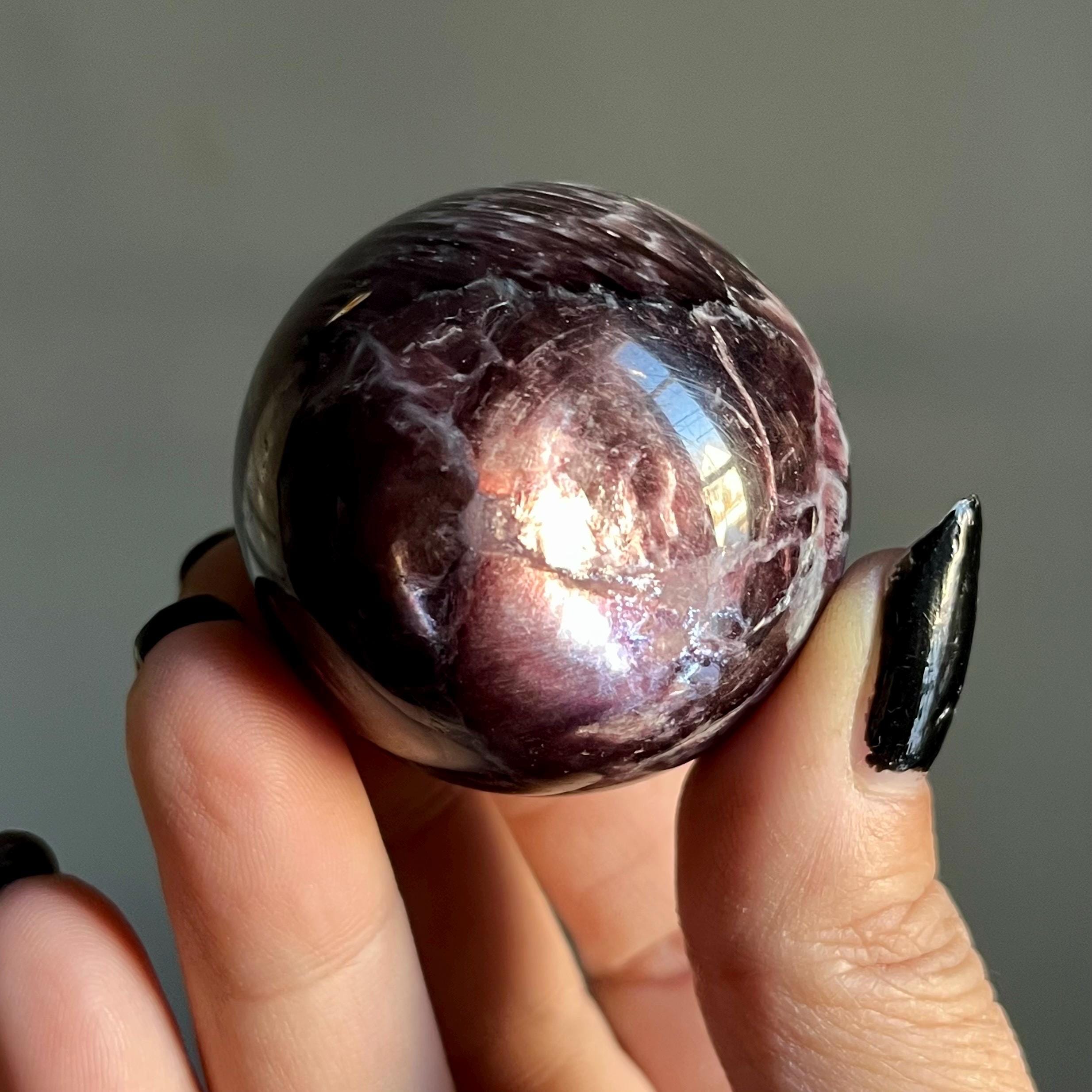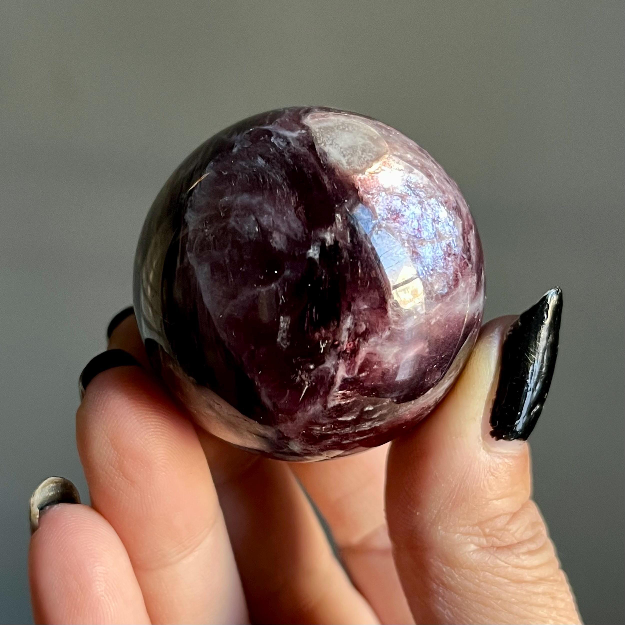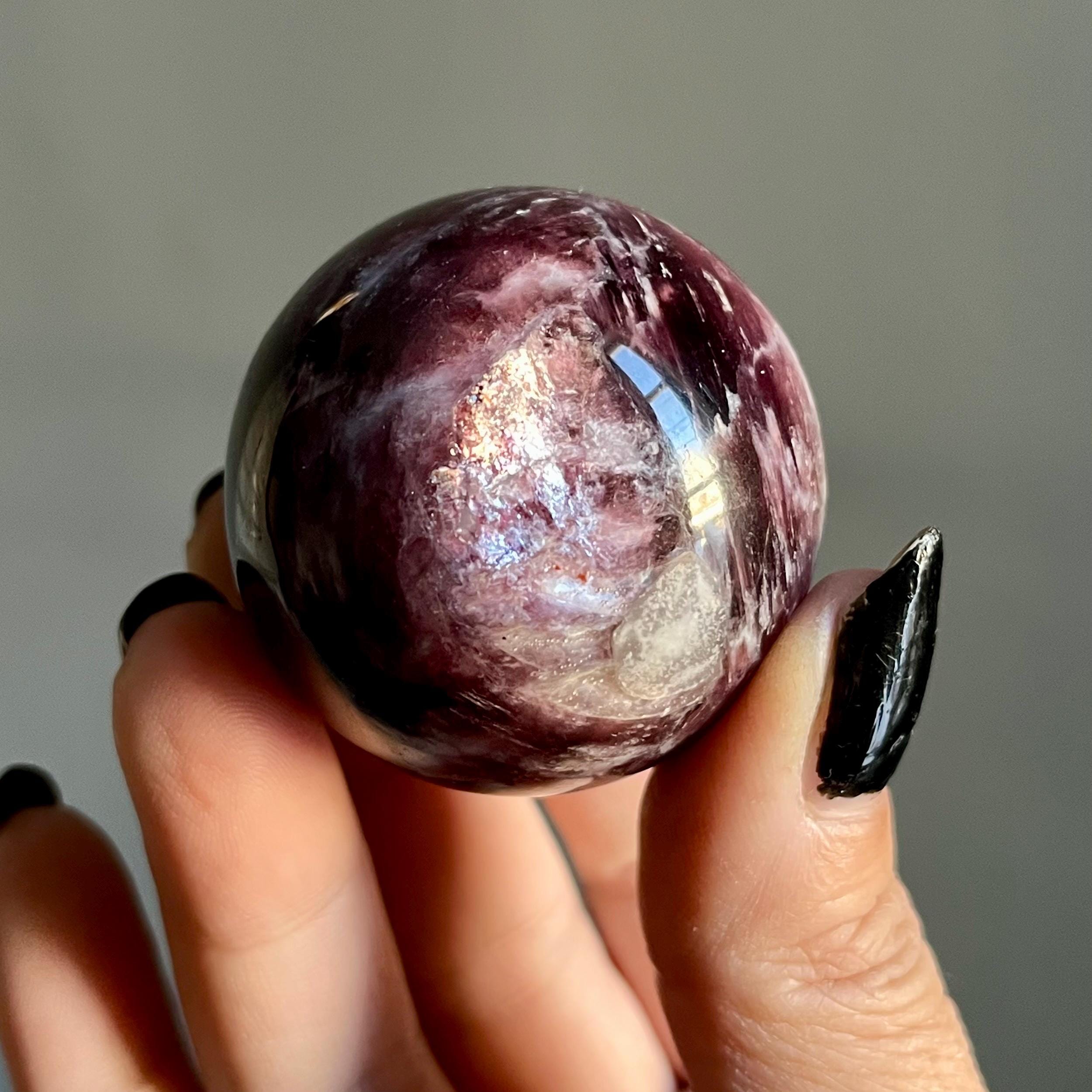 This high quality gem lepidolite mica crystal sphere manifests in rare form, the fire of rich purple mica flashes in a cacophony of colored flames, rare ruby red lepidolite shimmer, radiating from the center of this wild stone.