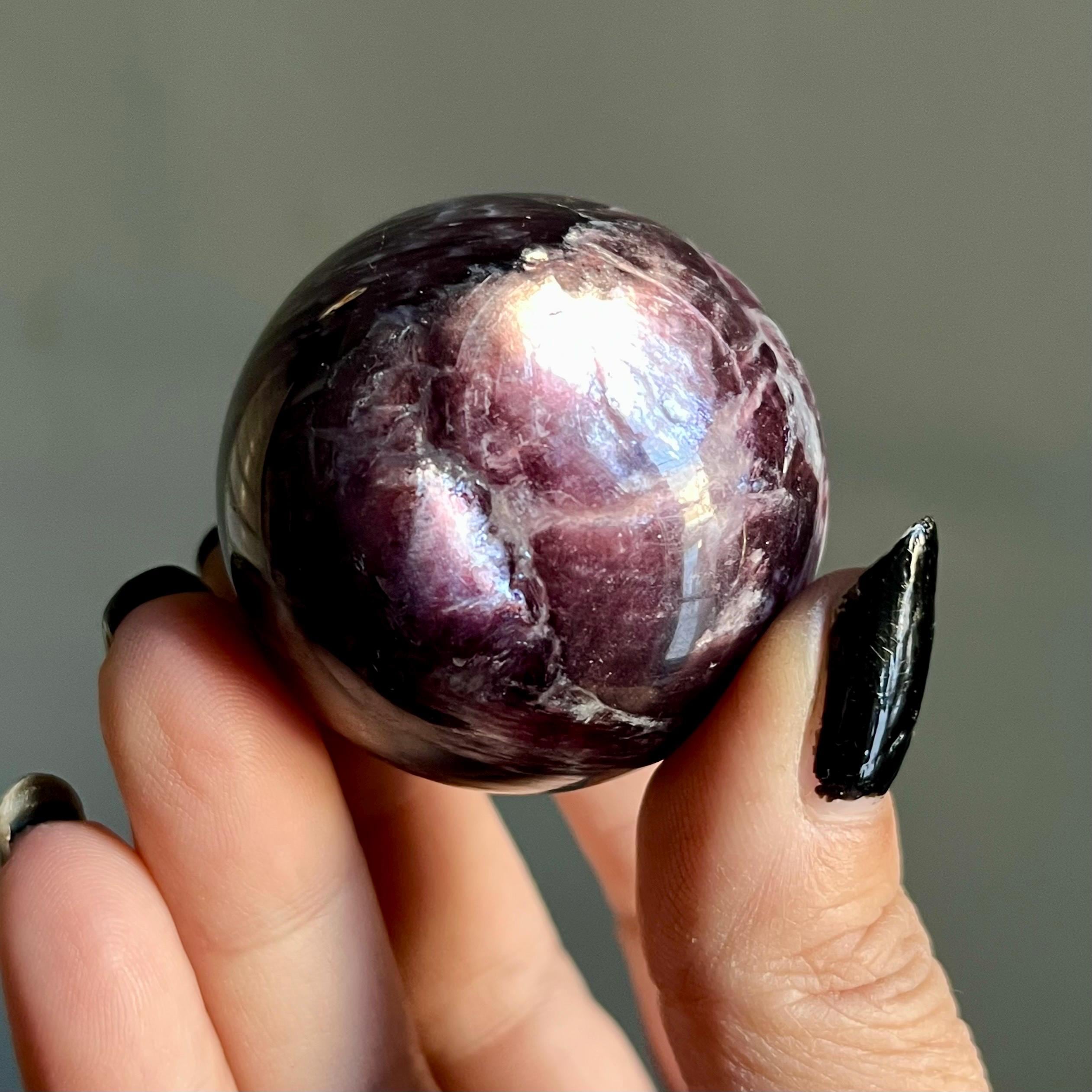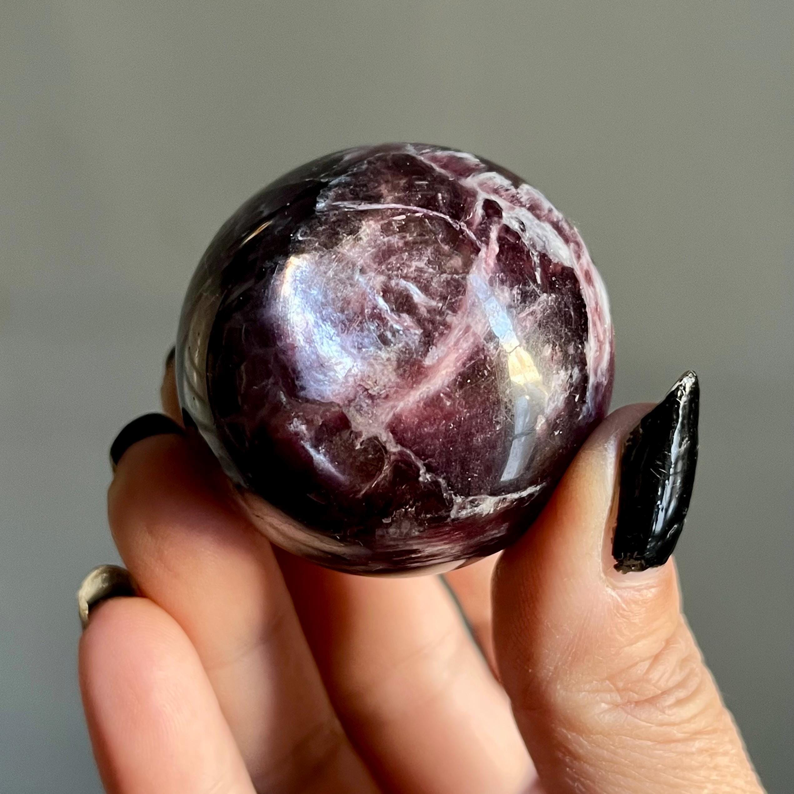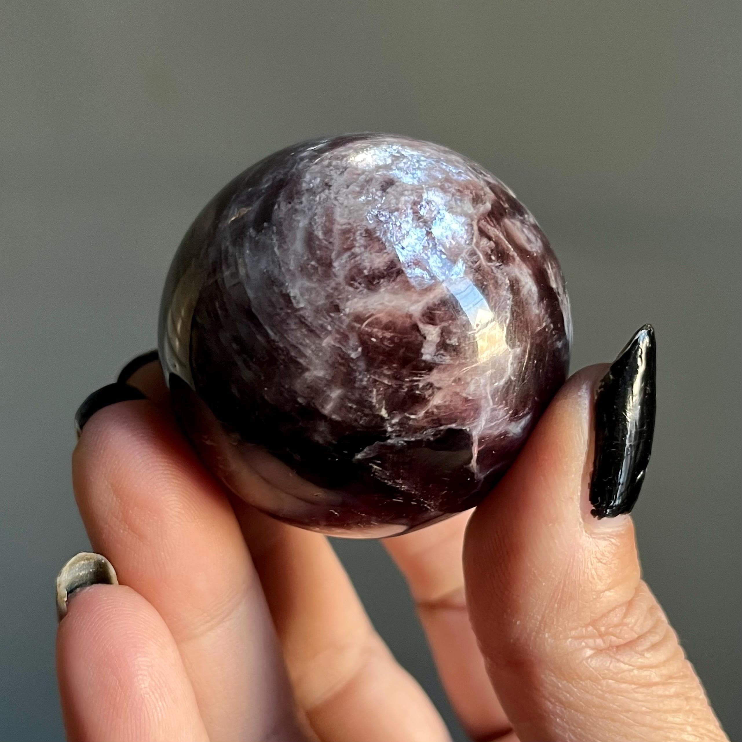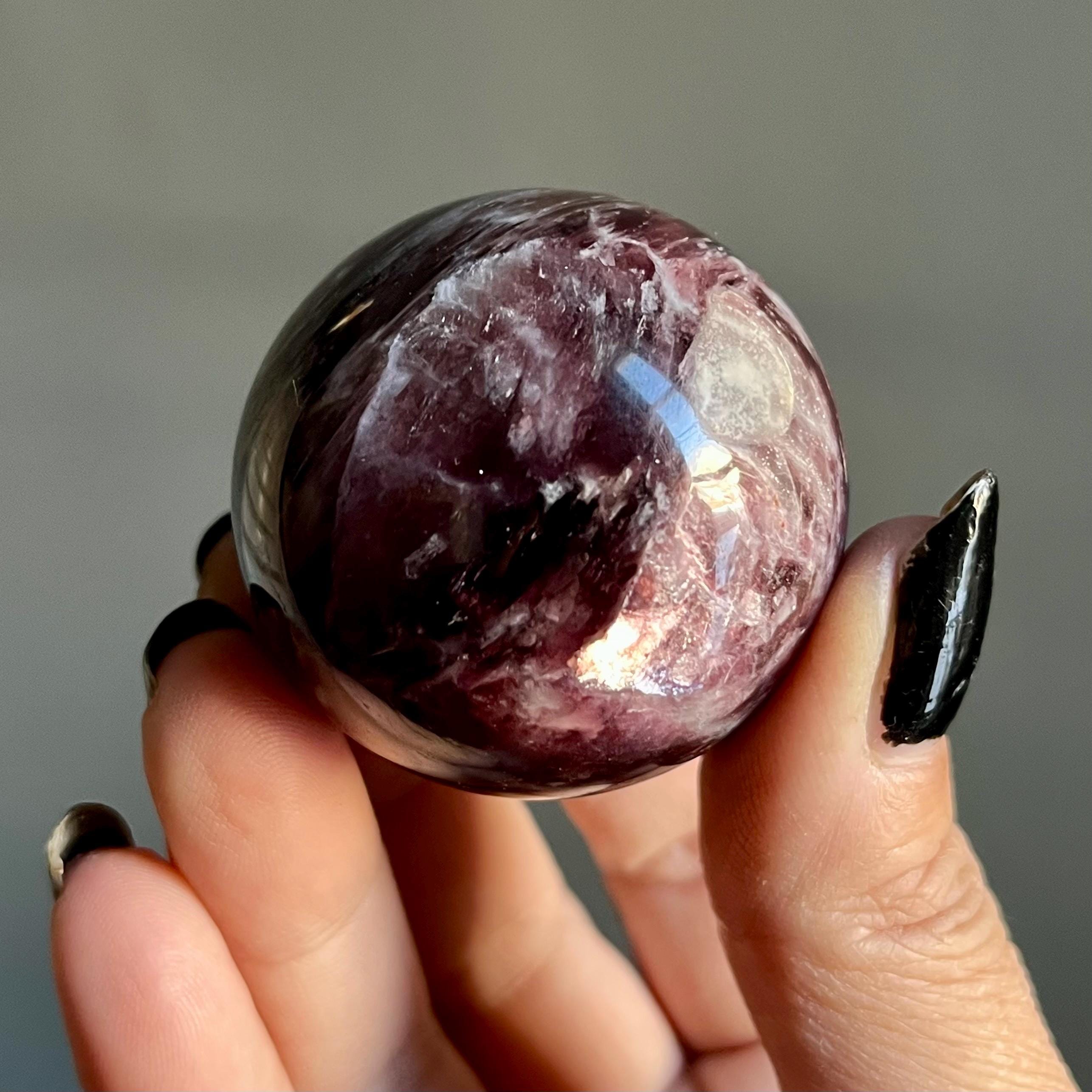This high quality gem lepidolite mica crystal sphere manifests in rare form, the fire of rich purple mica flashes in a cacophony of colored flames, rare ruby red lepidolite shimmer, radiating from the center of this wild stone.
