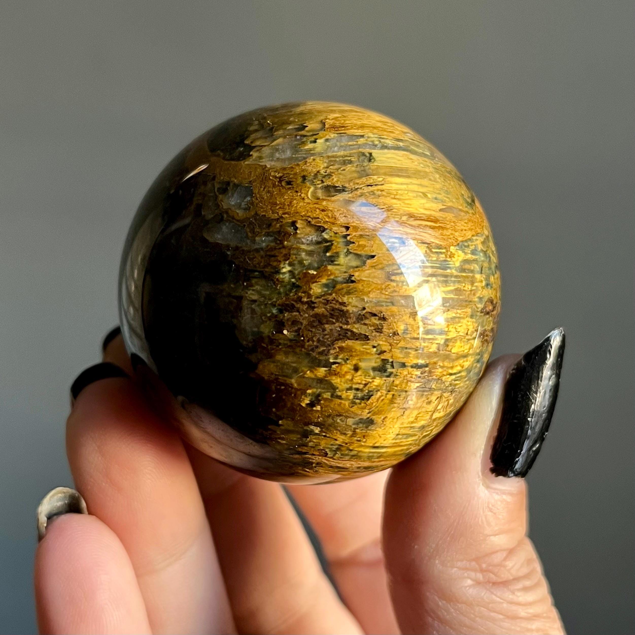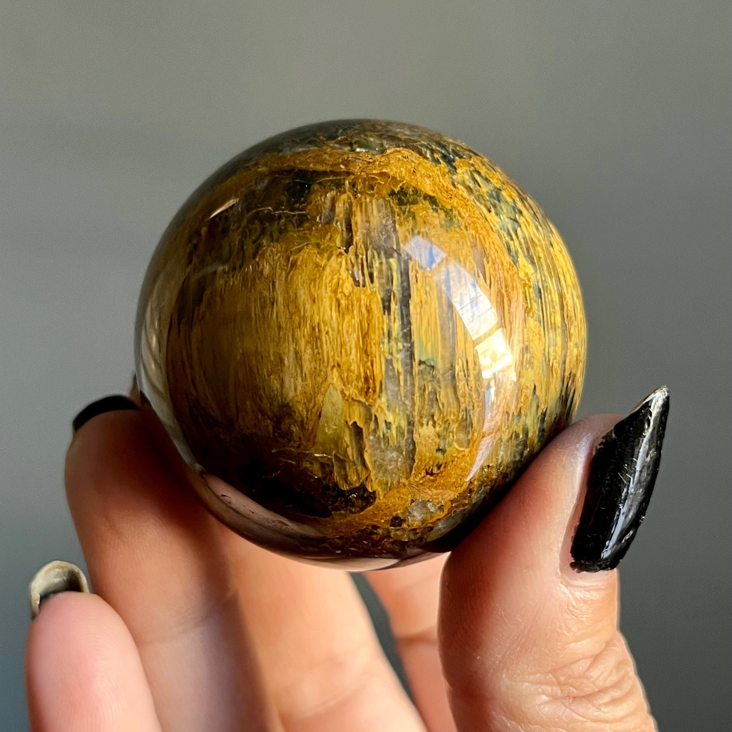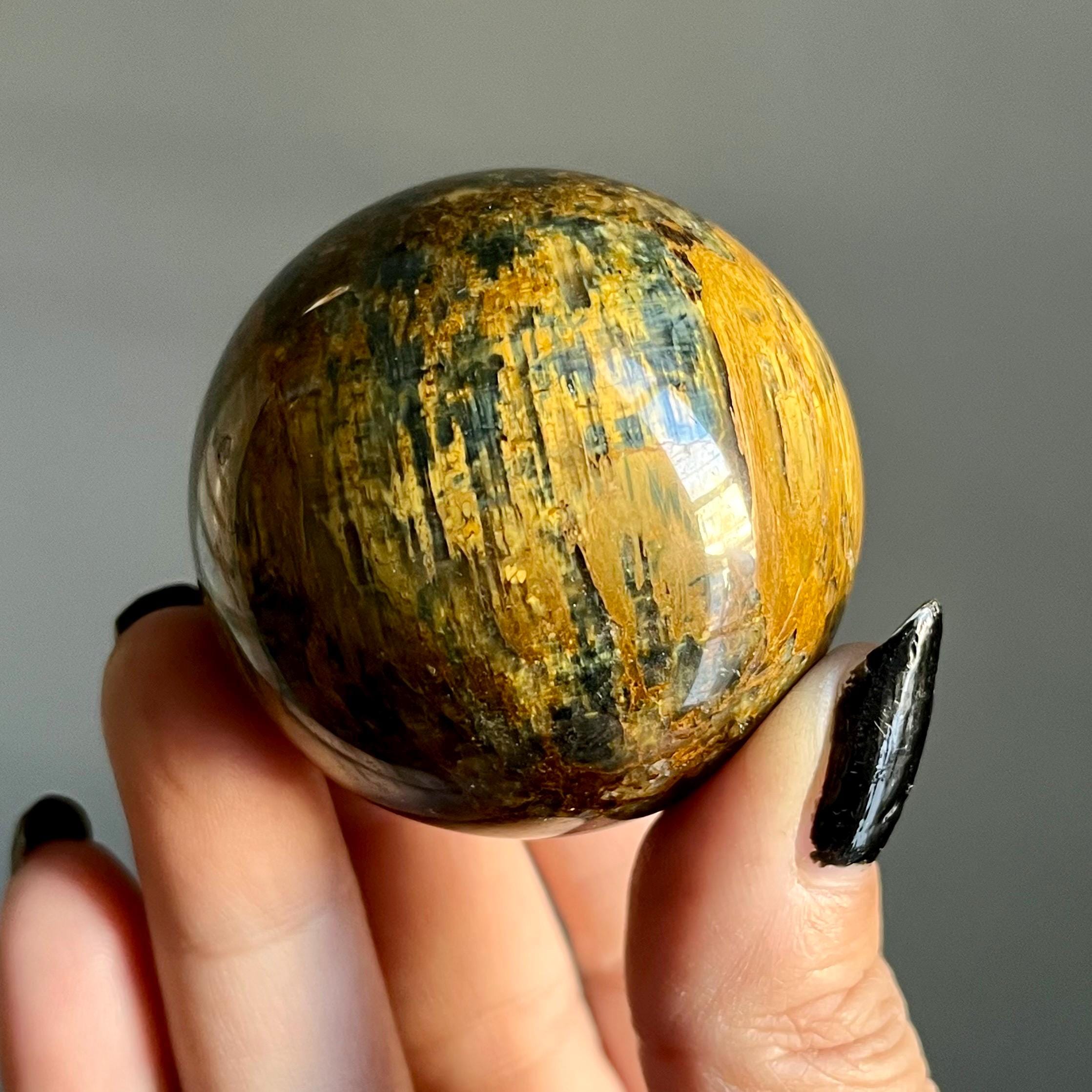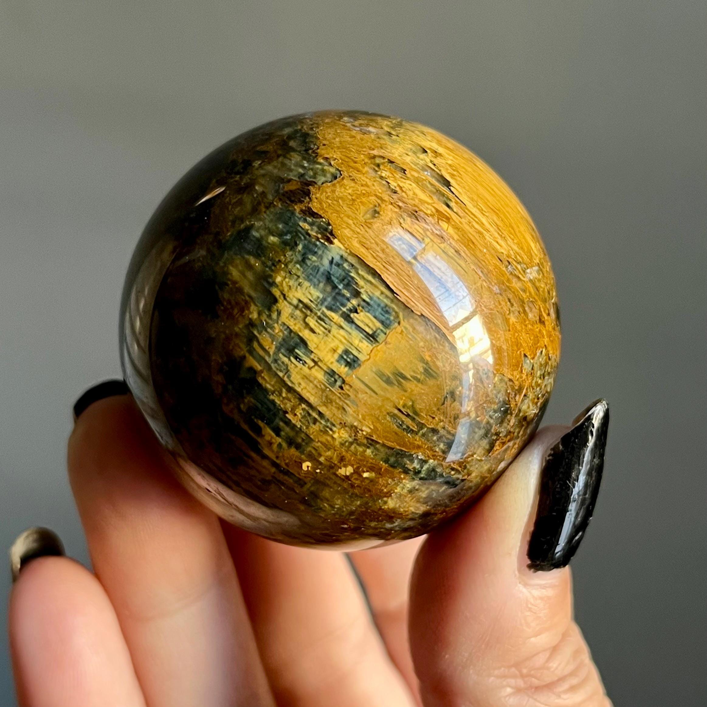 Found in the deserts of Namibia, this extraordinary, multicolored amphibole sphere is a pseudomorph of crocidolite (a member of the riebeckite family).
